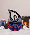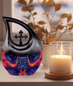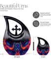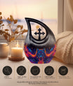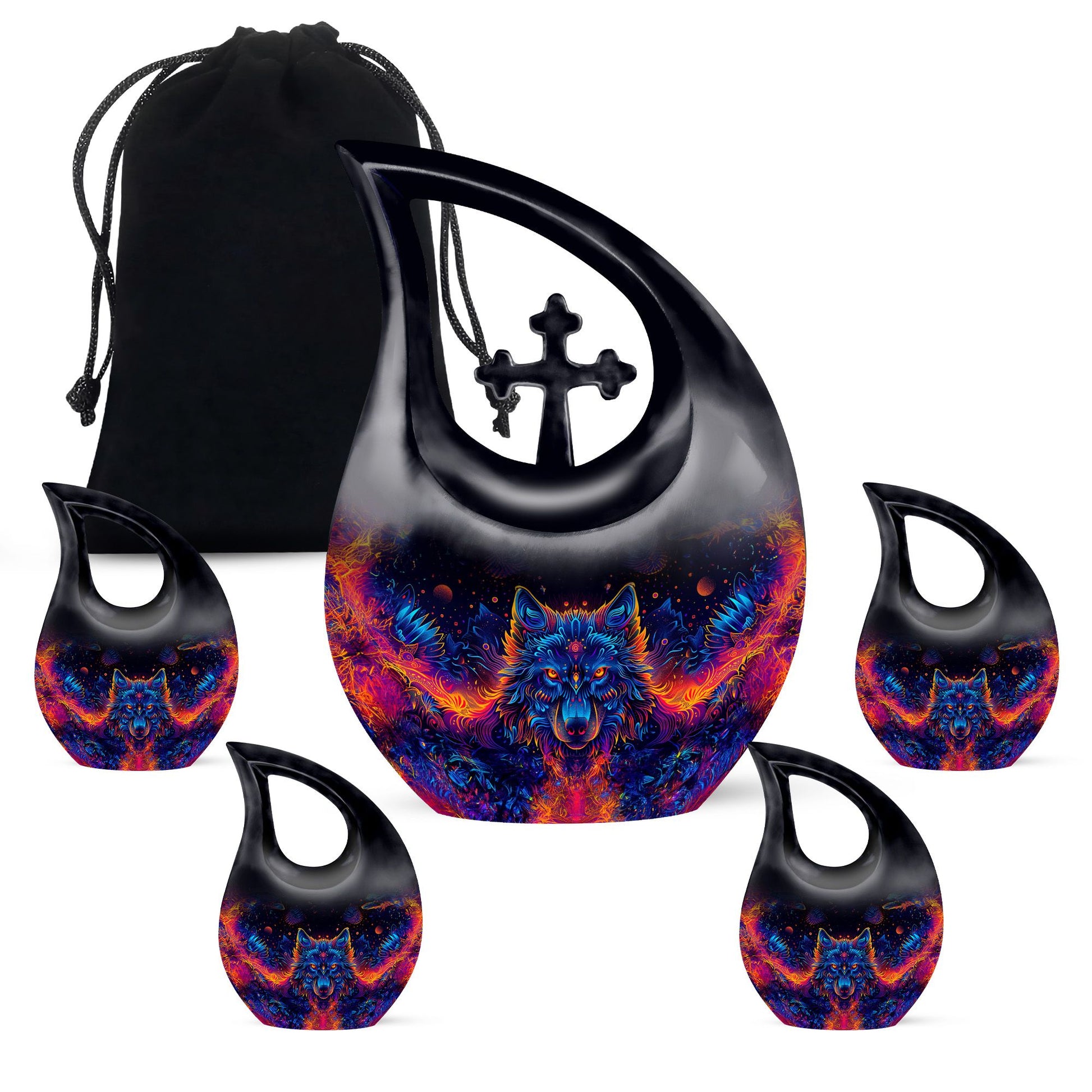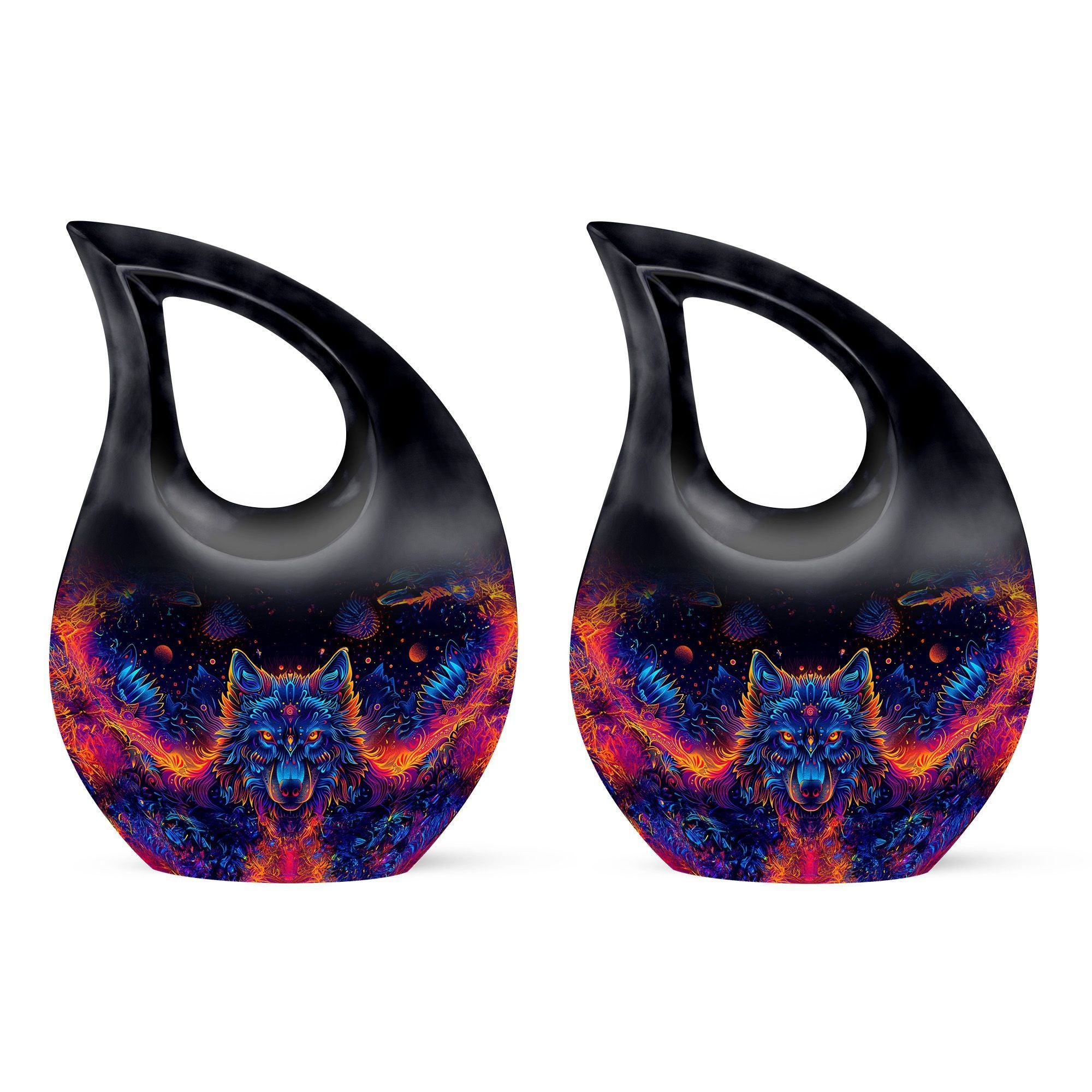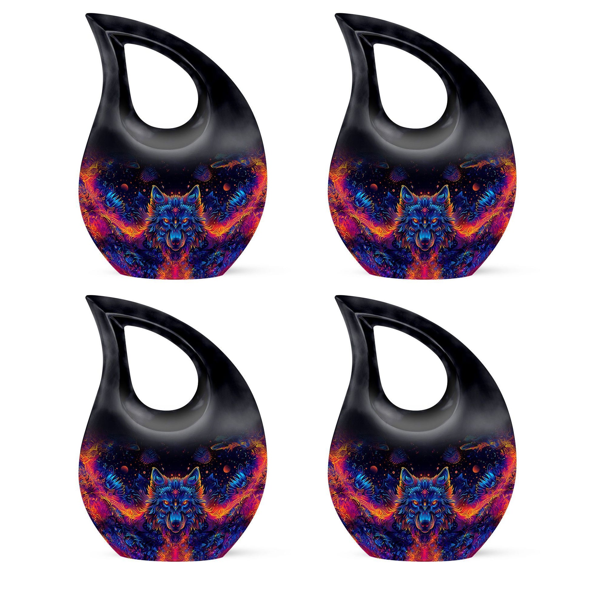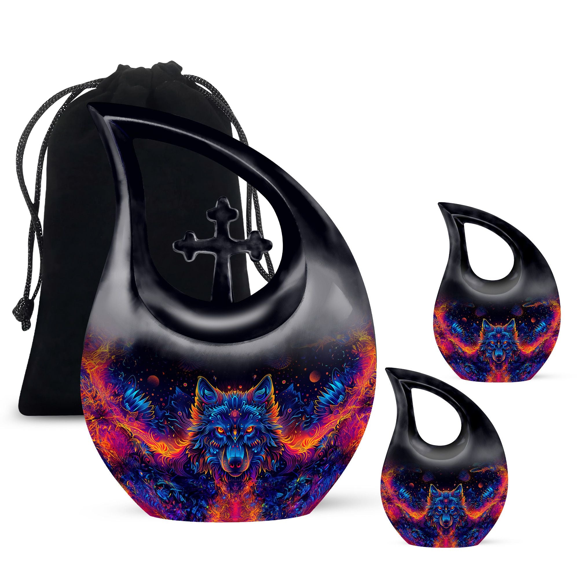 Preserve the memory of your loved one with our Wolf Urn, an exquisite piece of memorial craftsmanship. This Large Urn, sized at a commodious 10 inches, proudly displays a captivating Wolf theme which symbolizes courage, strength, and independence. Made from high-grade Aluminium, it's robust yet lightweight, weighing just 3.3 pounds. Our urns for human ashes offer an impressive capacity of 200 cubic inches to securely house the ashes. This model showcases a unique 'Cross Drop' architecture not commonly found in average urns, providing a special touch to this memorial item. The package contains a velvet pouch for containment of ashes, adding an extra layer of protection. Personalize it with engraved names to make this not just an urn, but a meaningful keepsake. With its affordable price tag, it stands as a significant player in the market of cheap cremation urns and cremation containers. Whether you search for memorial urns, urns for ashes, or cremation urns, our Wolf Urn brings a unique blend of emotional value and practical function.