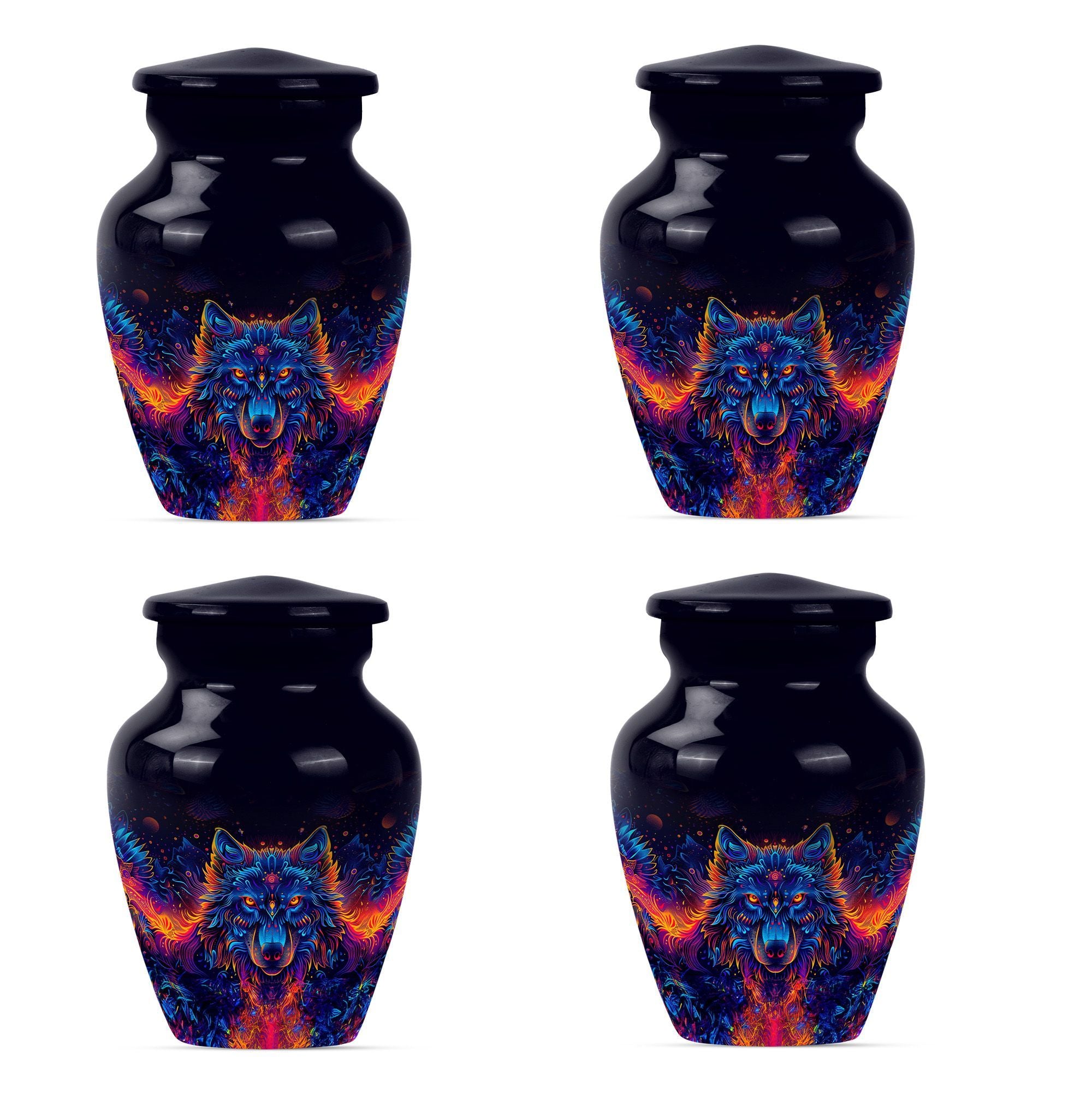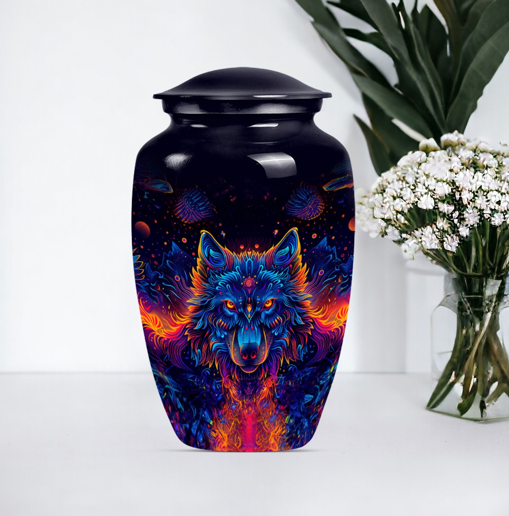 This beautiful 'Wolf Urn' is a comforting and respectful way to say goodbye to a loved one. It is a large urn that carries a meaningful 200 cubic inches of capacity, perfect for memorial ceremonies. Crafted from durable Aluminium, this cremation urn stands 10 inches in height and weighs 3.3 pounds, ensuring stability and longevity. Carefully designed with a classic, abstract theme, this urn provides a respectful tribute to a profound life lived. The urn comes with the thoughtful addition of a velvet pouch for containment of ashes, ensuring your loved ones' legacy is considered with the utmost care. Furthermore, this cremation urn for men comes with personalization options for you to engrave names, making each urn unique and personal. Keywords such as 'burial urns for cremation ashes mother', 'urn ash funeral urn', and 'shaped urn box,' are commonly searched in this category highlighting the need and interest for such a product.