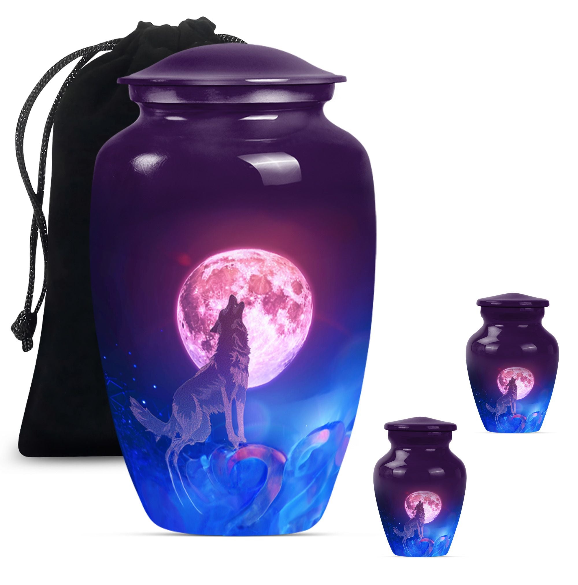 Expertly handcrafted, this adult urn for human ashes men combines artistic design with lasting durability. Made from premium materials, it serves as both a functional memorial and a decorative centerpiece. The stunning wolf motif beneath a pink moon adds depth and symbolism, while the smooth metallic finish enhances its presence as a large decorative urn. Ideal as an urn for ashes for men, it offers both style and solace for your home or memorial display.