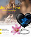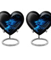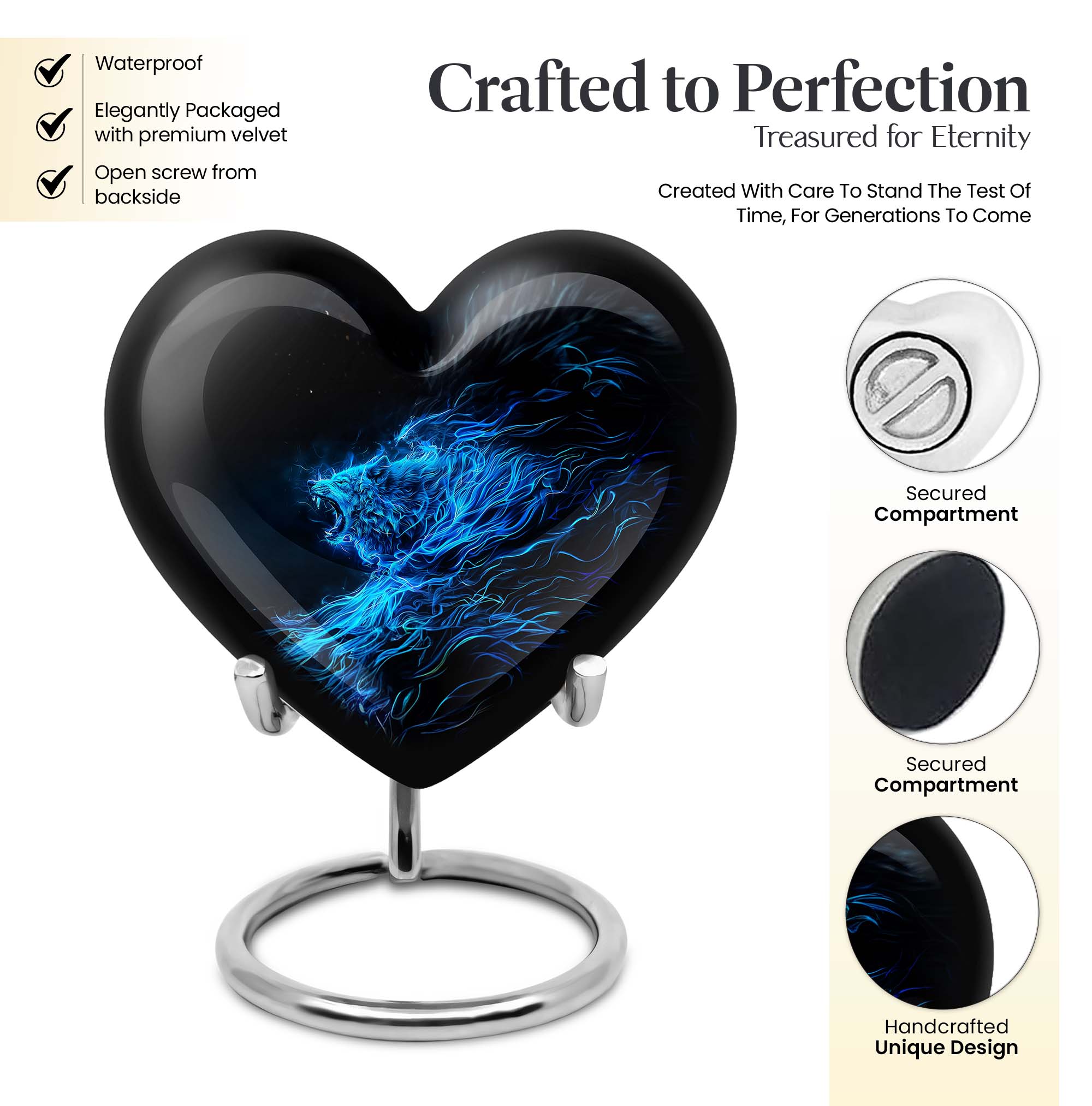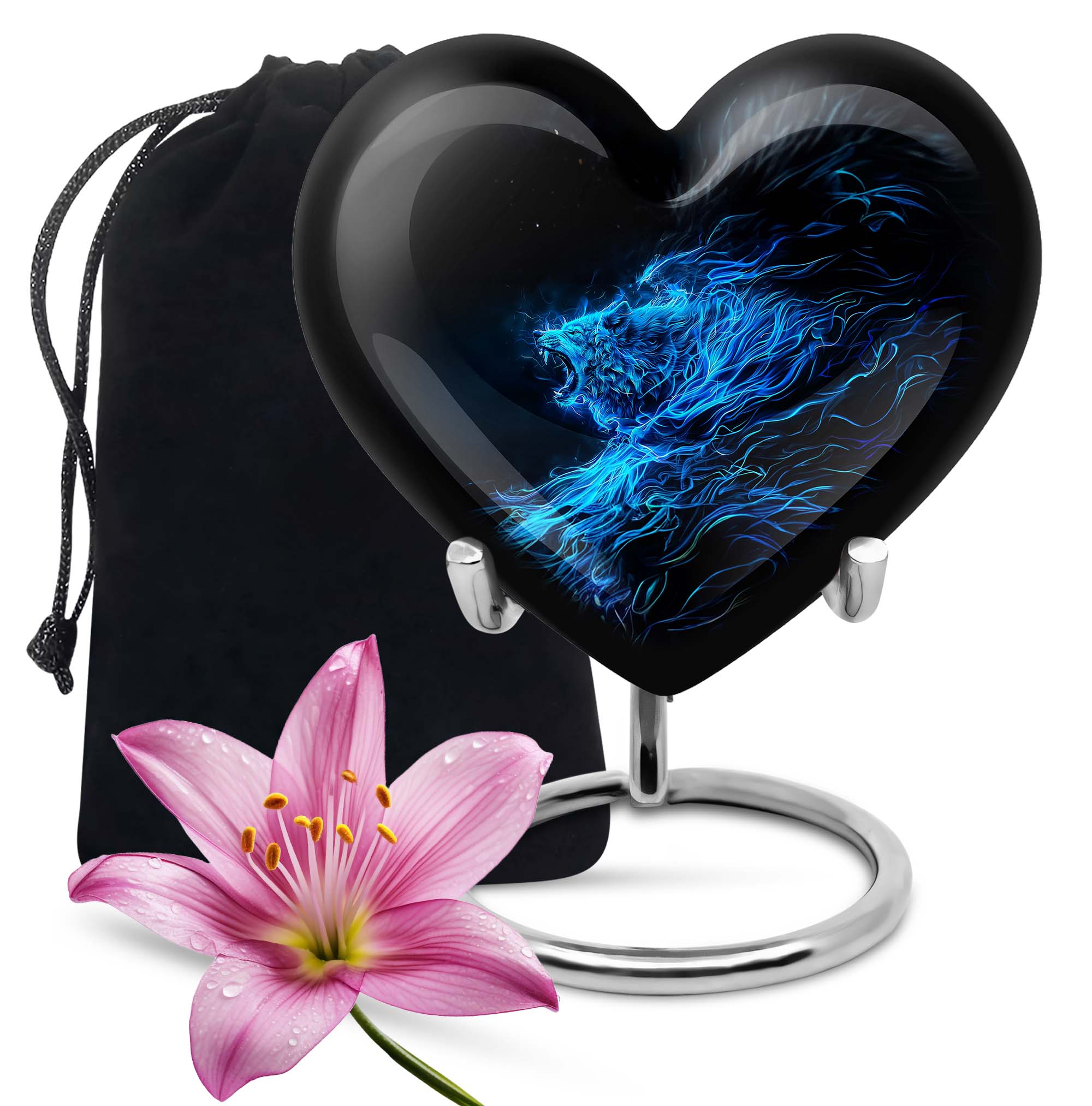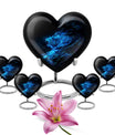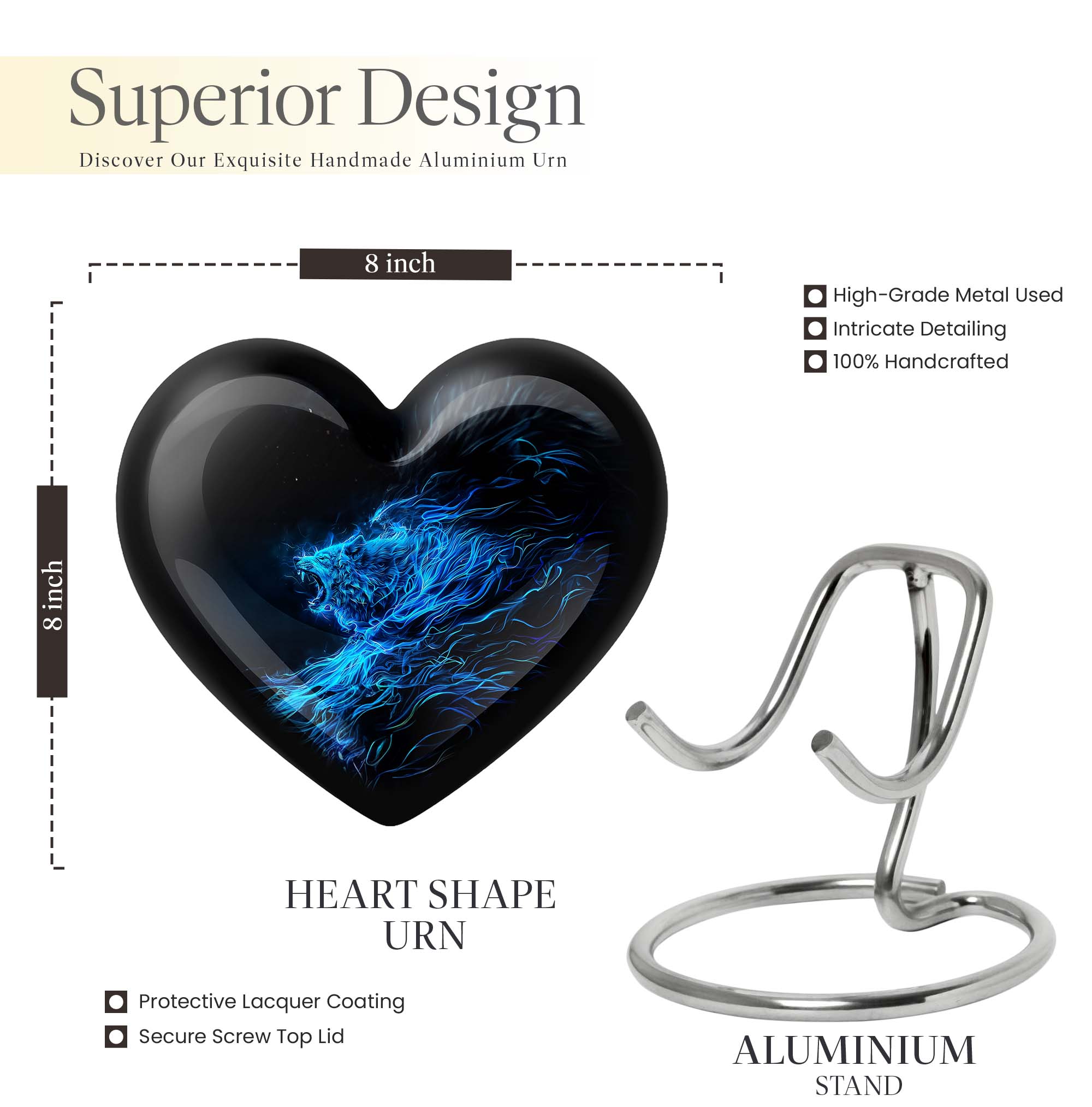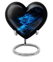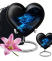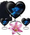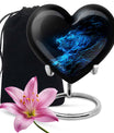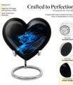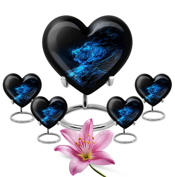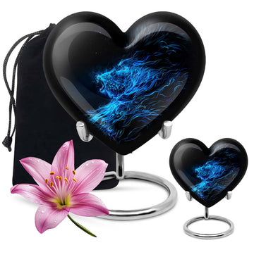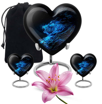 Celebrate and remember the enduring love of your departed one with our 10-inch, Heart-themed large 'Wolf Urn'. Made of lasting aluminium, our funeral urns for human ashes are intricately designed with an abstract theme, resonating with the everlasting bond between you and your loved one. This cremation urn has a capacity of 200 cubic inches, ample space to respectfully contain the ashes of the departed. We incorporate a velvet pouch with our product, ensuring a dignified containment for your treasured memento. Our urns are not simply for containment; we offer personalization options, allowing you to engrave names, adding a deeply personal touch to the artifact. Despite the substantial size of 10 inches, the urn maintains a manageable weight of 3.3 pounds. Cast in a unique heart shape, our funeral urns for ashes offer a timeless stone urn for lasting memories. Our Memorial urns for ashes are a testament to your love; they carry your precious memories in dignity and style.