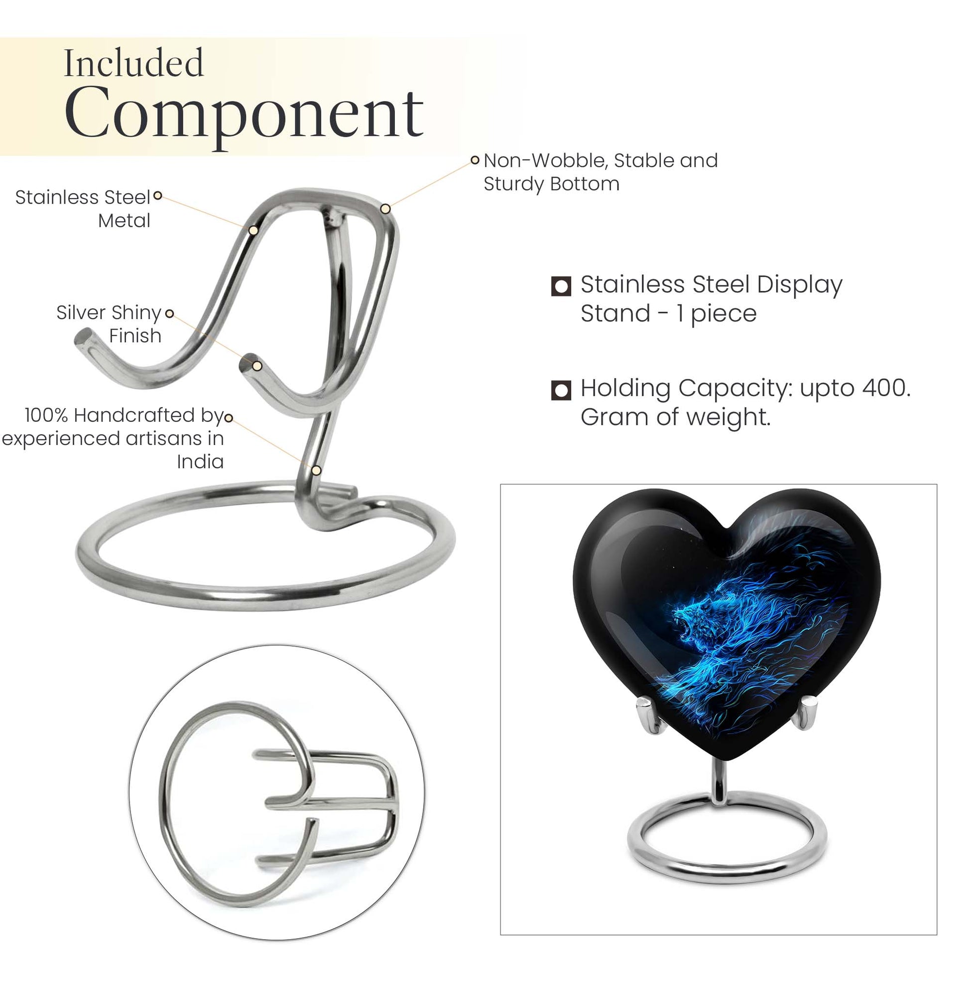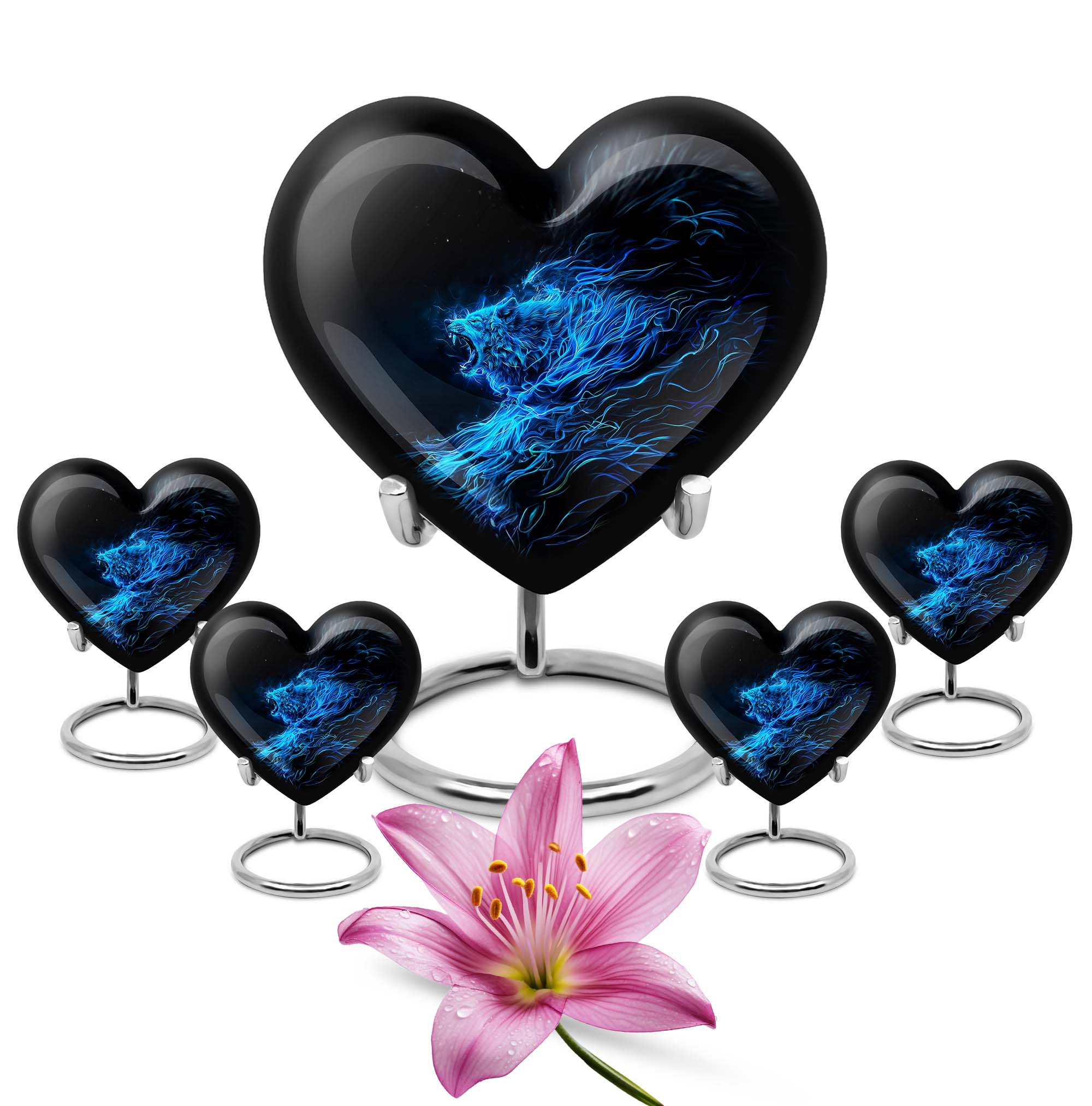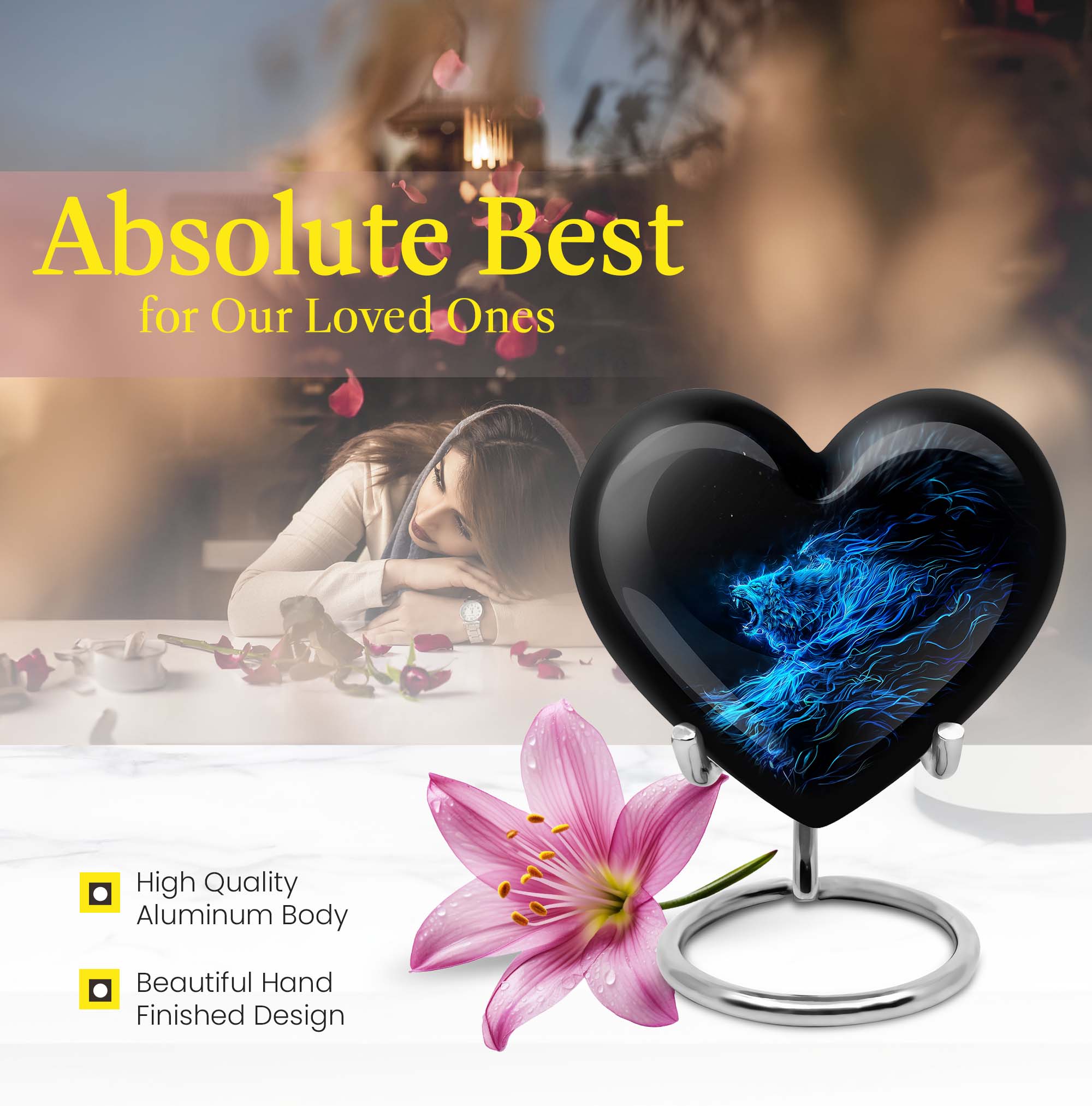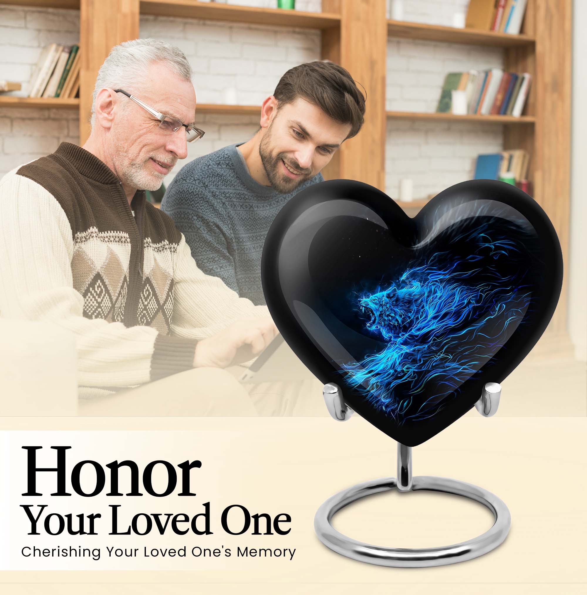 Celebrate and remember the enduring love of your departed one with our 10-inch, Heart-themed large 'Wolf Urn'. Made of lasting aluminium, our funeral urns for human ashes are intricately designed with an abstract theme, resonating with the everlasting bond between you and your loved one. This cremation urn has a capacity of 200 cubic inches, ample space to respectfully contain the ashes of the departed. We incorporate a velvet pouch with our product, ensuring a dignified containment for your treasured memento. Our urns are not simply for containment; we offer personalization options, allowing you to engrave names, adding a deeply personal touch to the artifact. Despite the substantial size of 10 inches, the urn maintains a manageable weight of 3.3 pounds. Cast in a unique heart shape, our funeral urns for ashes offer a timeless stone urn for lasting memories. Our Memorial urns for ashes are a testament to your love; they carry your precious memories in dignity and style.