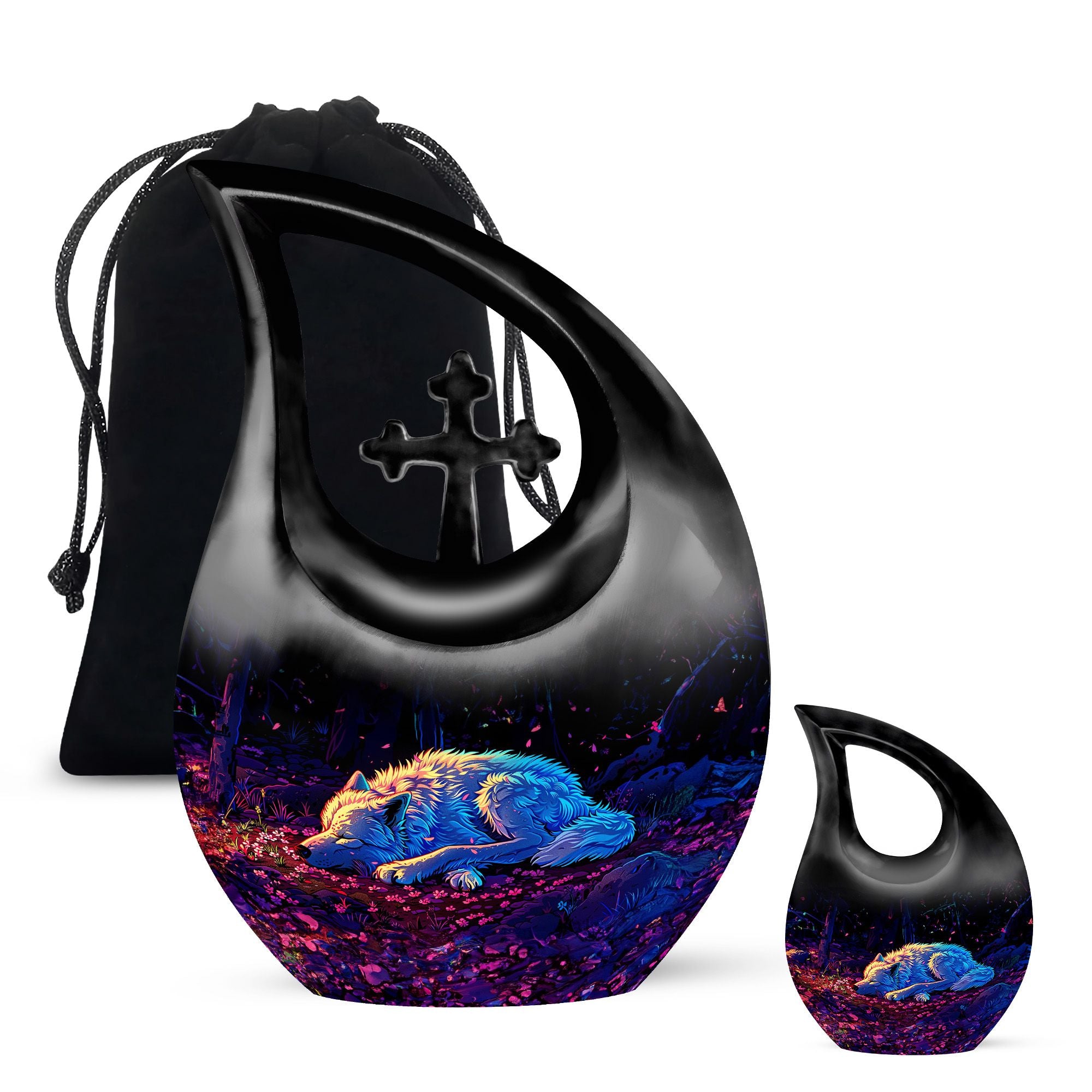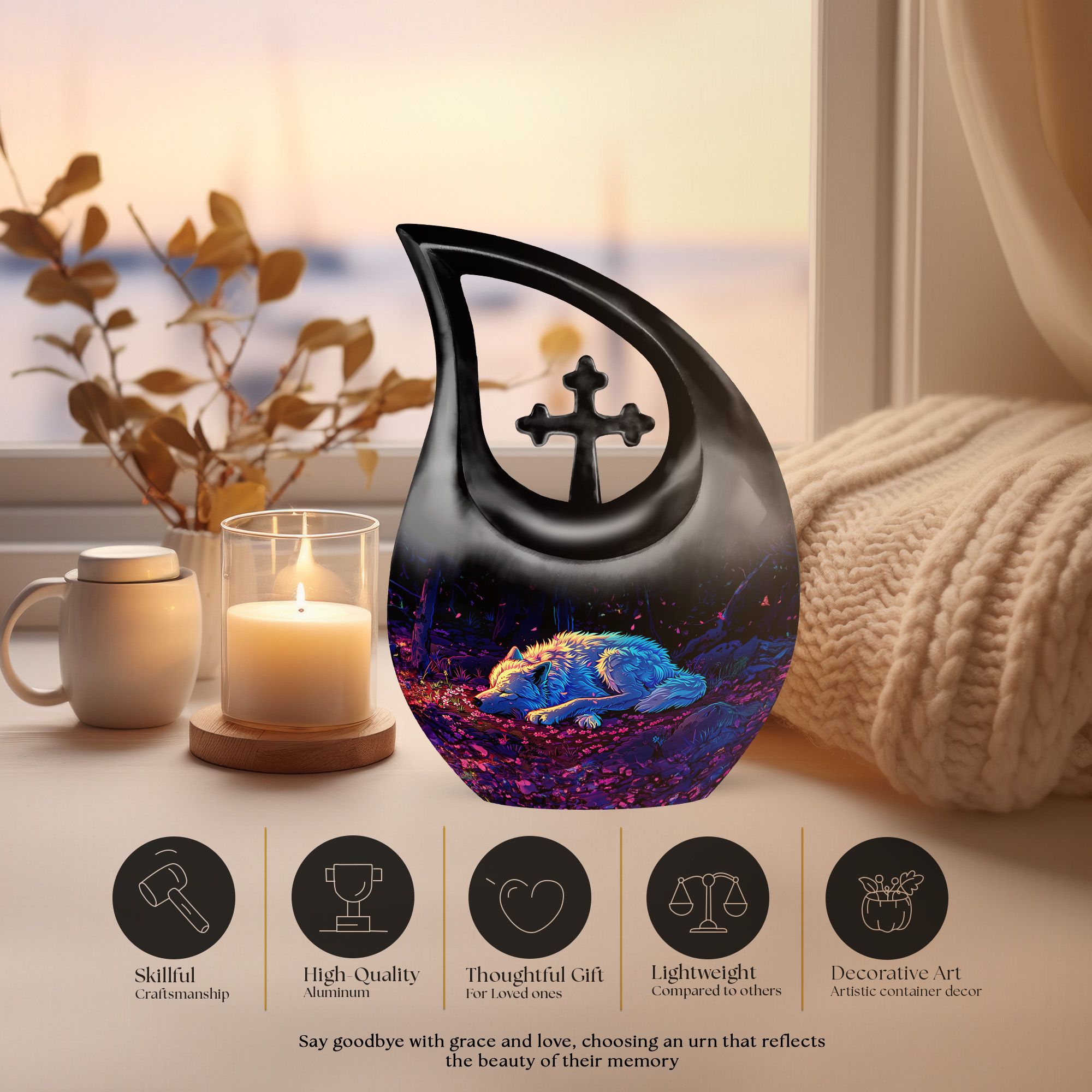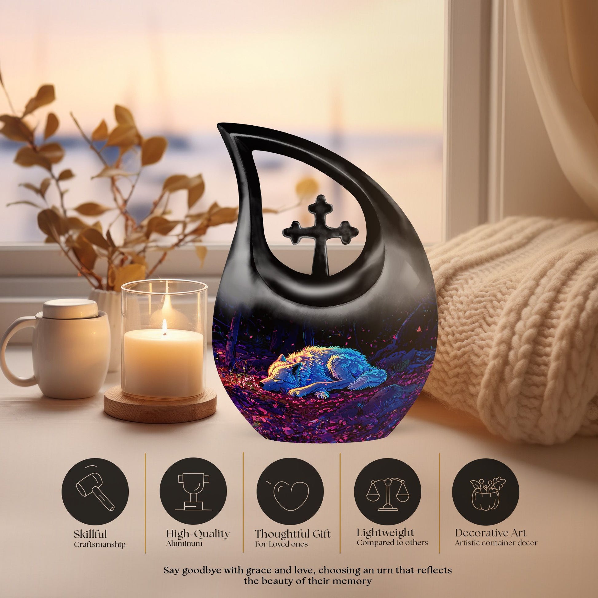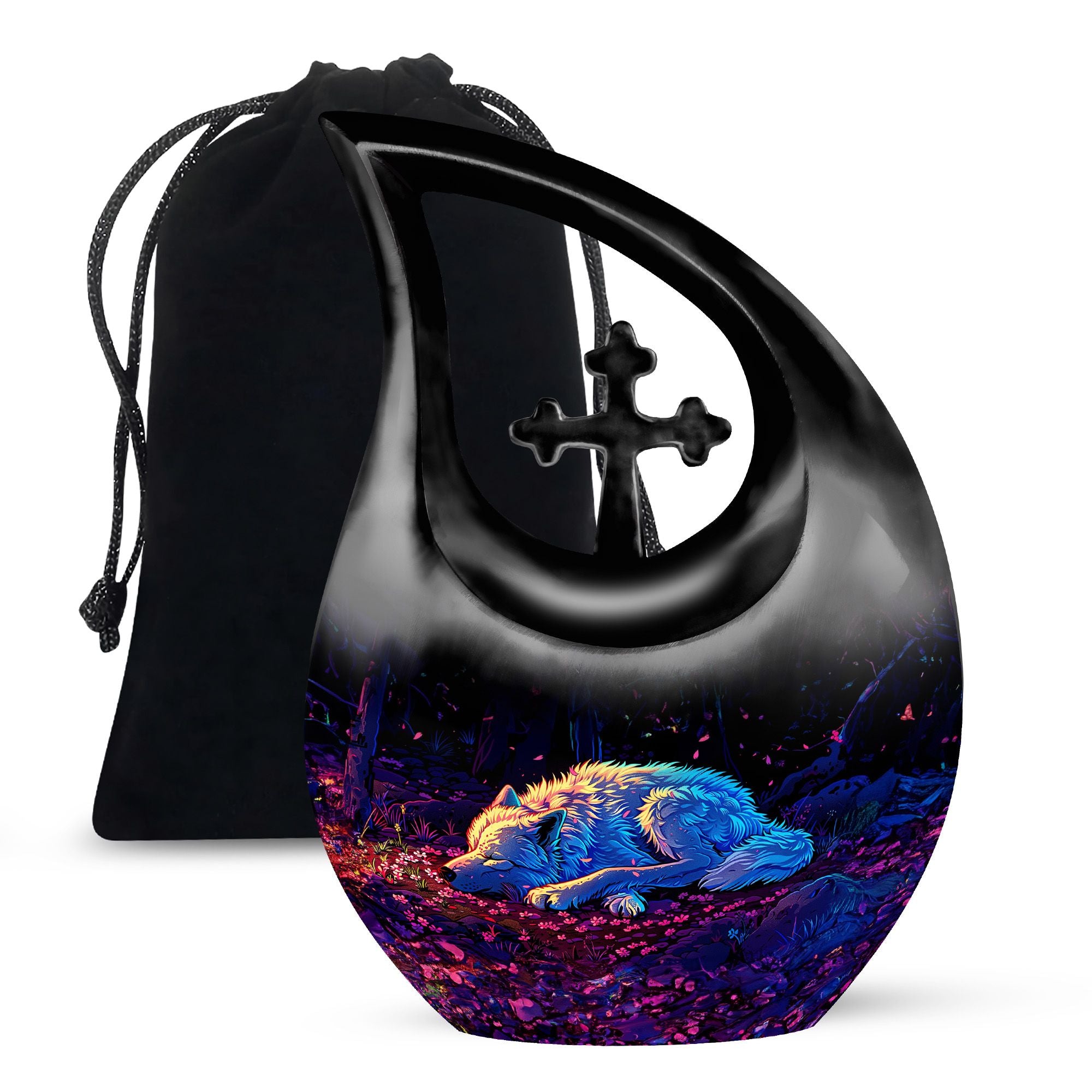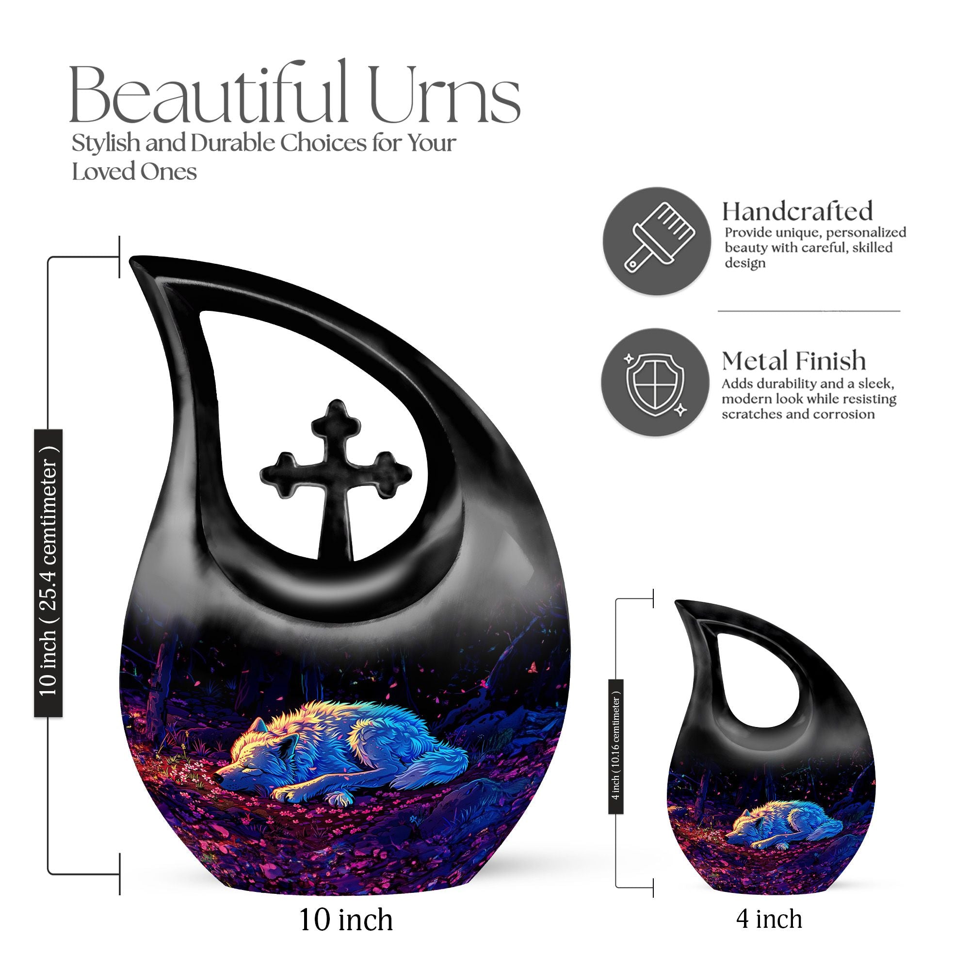 Cherish the memory of your loved one with our carefully crafted 10-Inch Wolf Urn, meticulously made from high-quality aluminum material. Weighing 3.3 pounds and standing 10 inches in height, this impressive yet delicate memorial piece offers a capacity of 200 cubic inches, providing ample space for the containment of ashes. This lovingly created Large Urn captures a poignant 'Cross Drop' theme, beautifully accentuating an image of a Wolf—one of the best urns for ashes. To add an intimate touch, personalize the urn by engraving names of your choice. In company with the urn comes a tasteful velvet pouch offering additional containment and preservation of the ashes. A unique blend of elegance and solemnity, this urn is an ideal choice for memorial urns catering to people yearning for an uncommon touch to traditional cremation containers, cremation boxes, burials urns, etc. A fitting tribute and a serene reminder - a resting place well deserved.