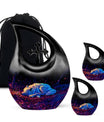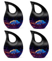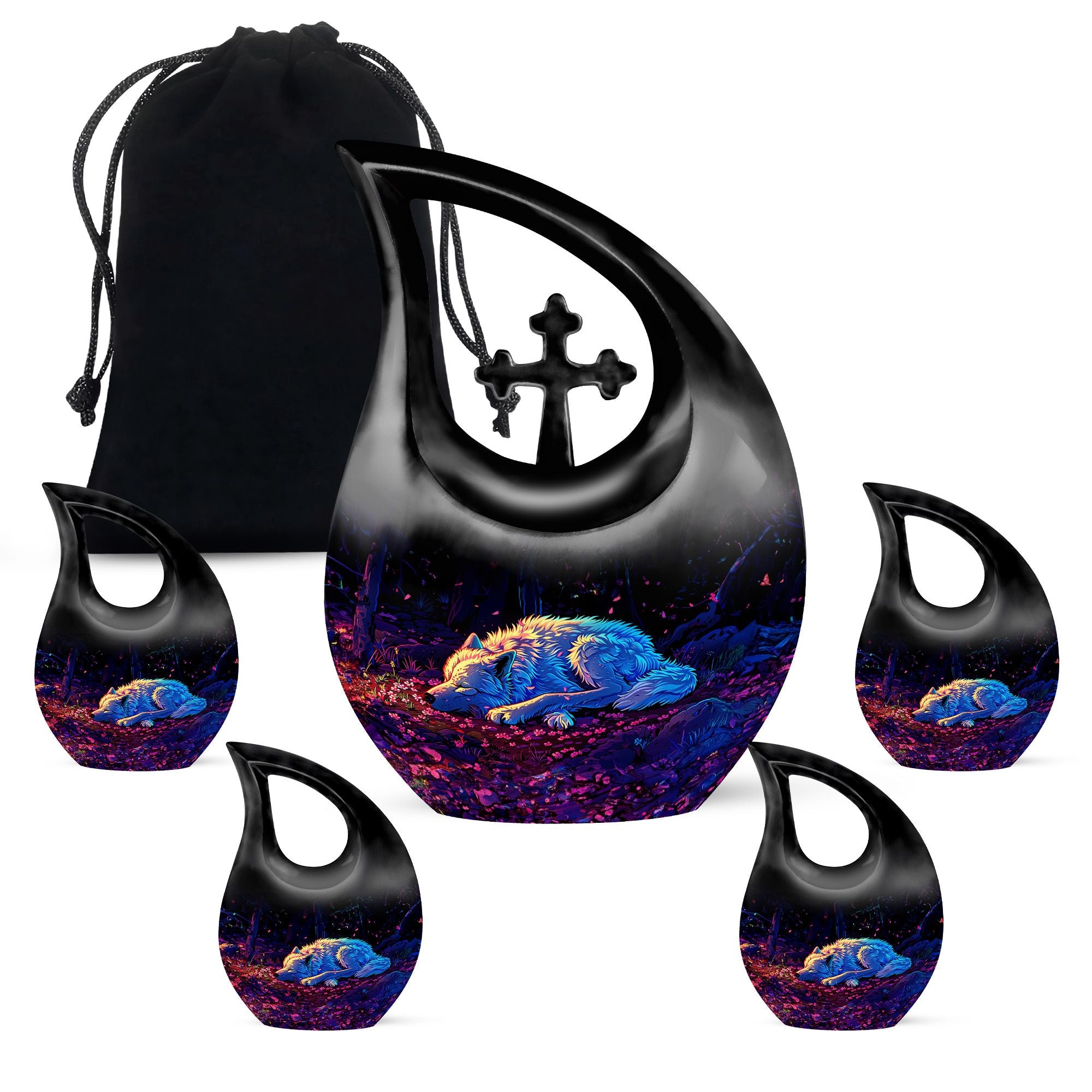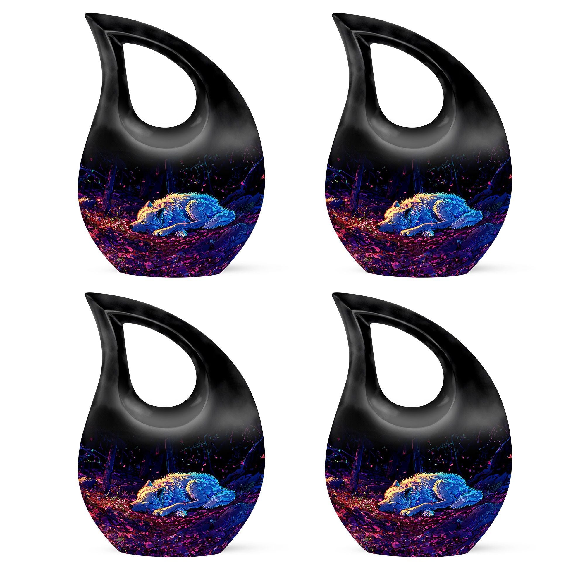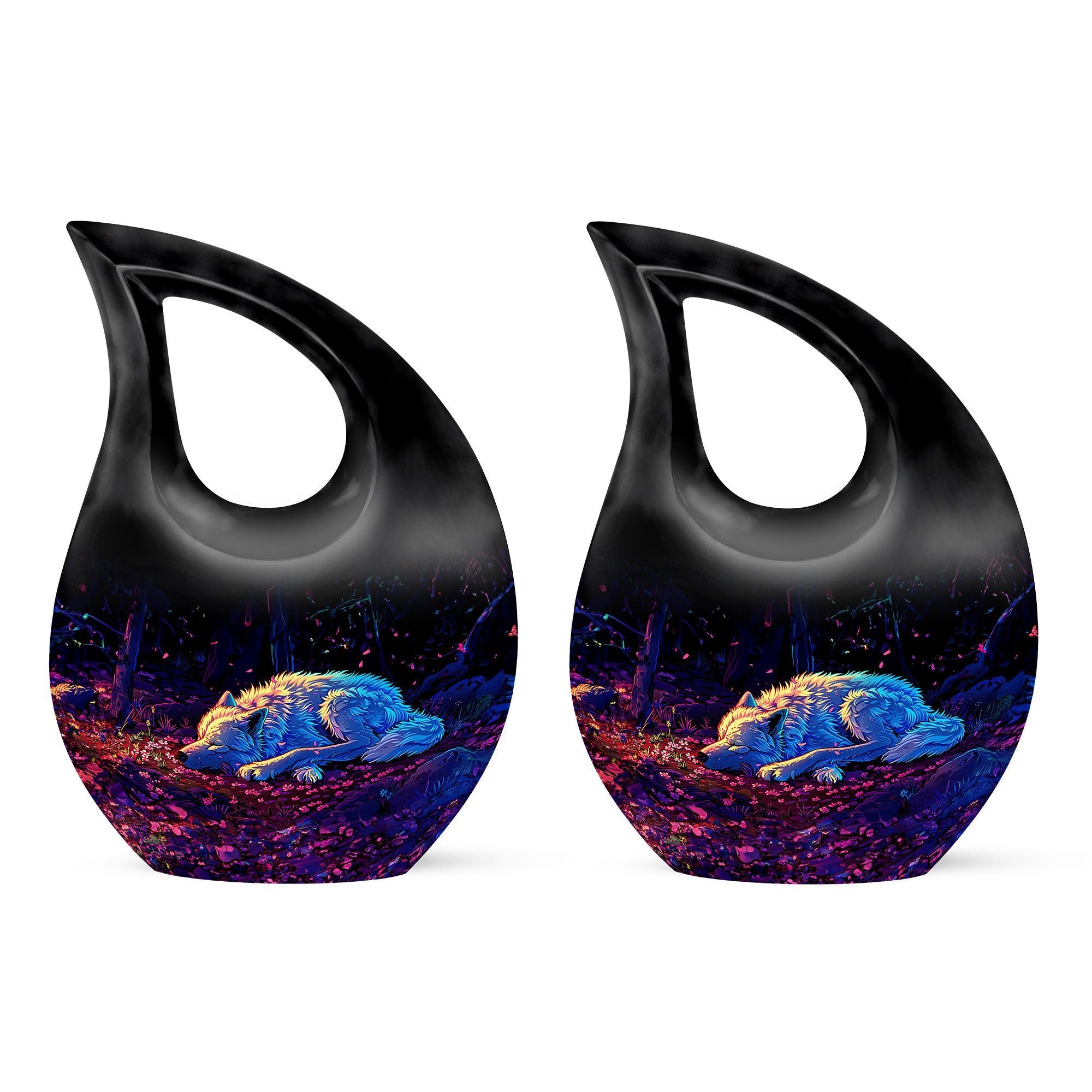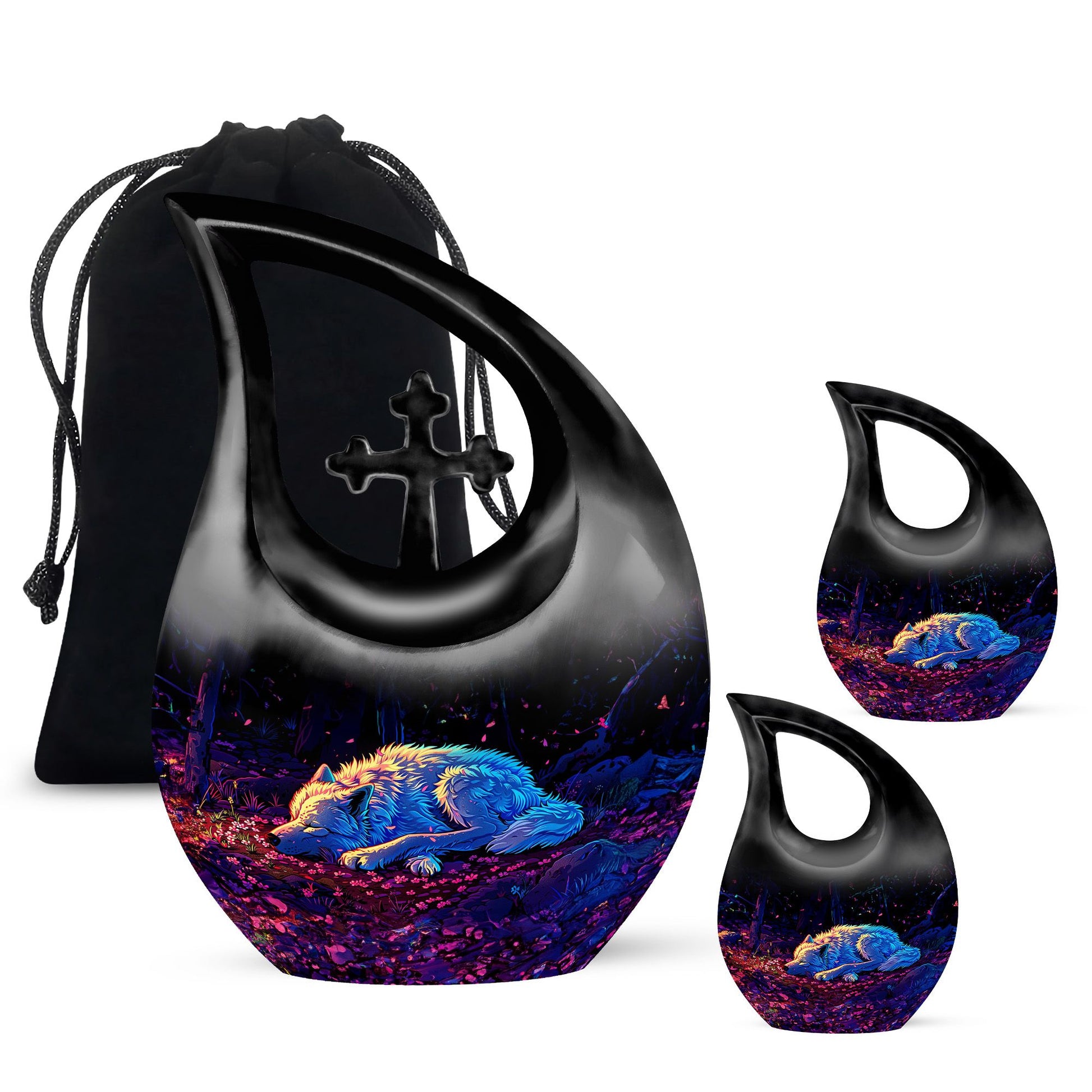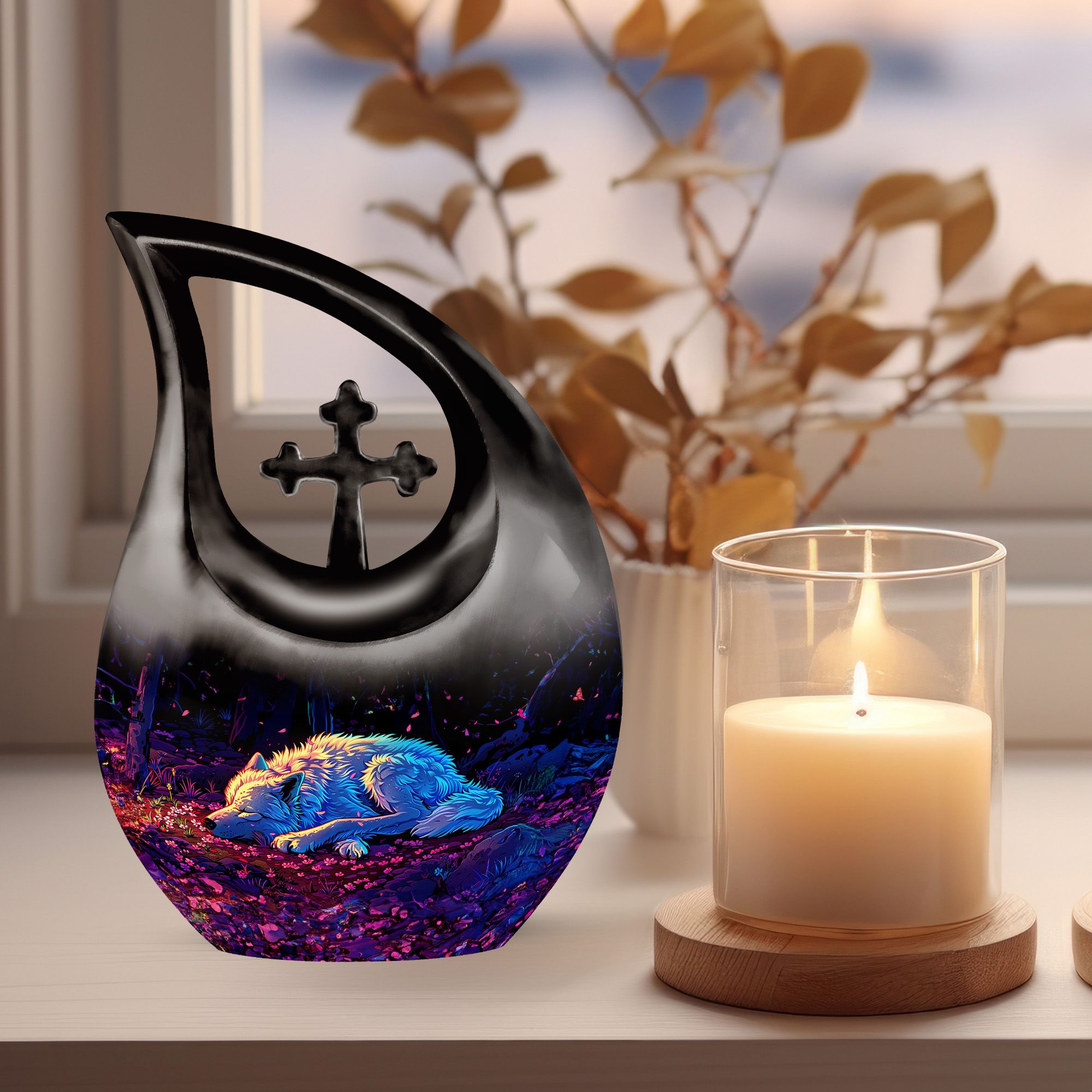 Cherish the memory of your loved one with our carefully crafted 10-Inch Wolf Urn, meticulously made from high-quality aluminum material. Weighing 3.3 pounds and standing 10 inches in height, this impressive yet delicate memorial piece offers a capacity of 200 cubic inches, providing ample space for the containment of ashes. This lovingly created Large Urn captures a poignant 'Cross Drop' theme, beautifully accentuating an image of a Wolf—one of the best urns for ashes. To add an intimate touch, personalize the urn by engraving names of your choice. In company with the urn comes a tasteful velvet pouch offering additional containment and preservation of the ashes. A unique blend of elegance and solemnity, this urn is an ideal choice for memorial urns catering to people yearning for an uncommon touch to traditional cremation containers, cremation boxes, burials urns, etc. A fitting tribute and a serene reminder - a resting place well deserved.