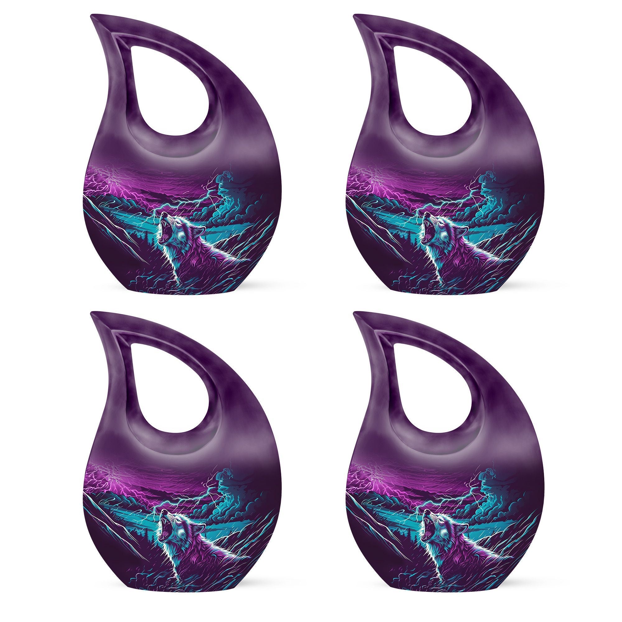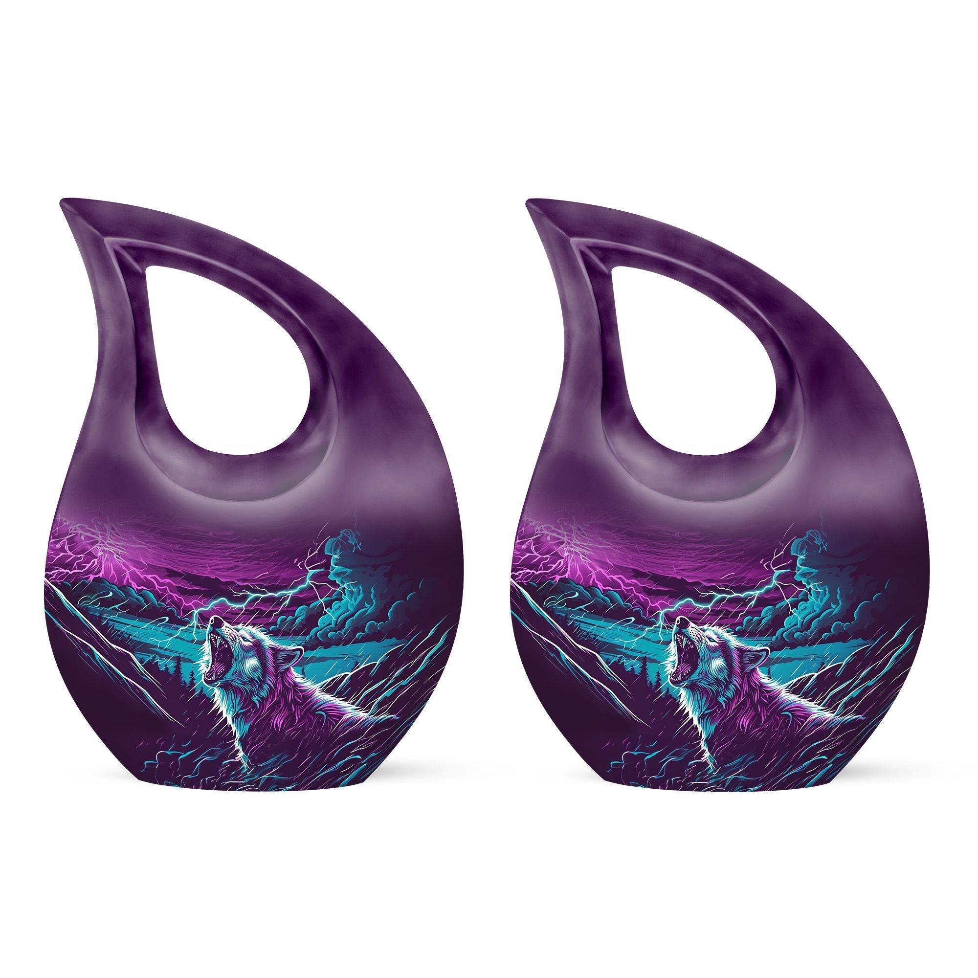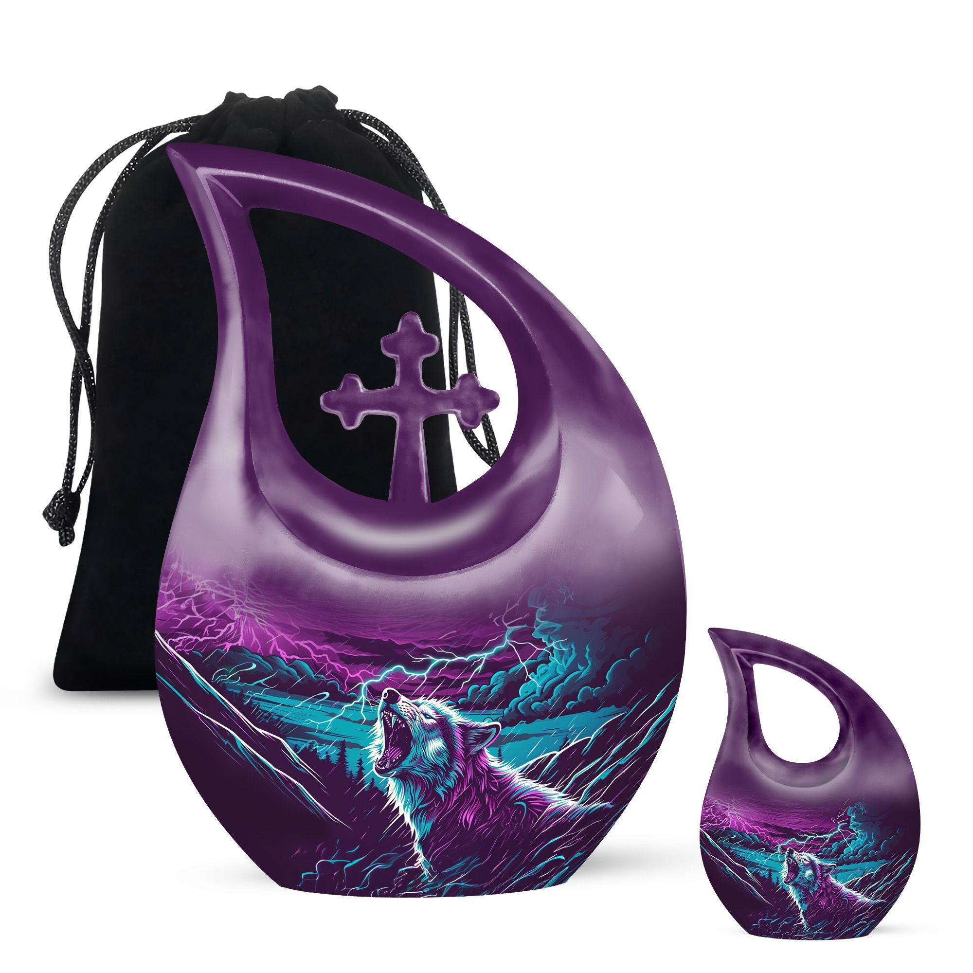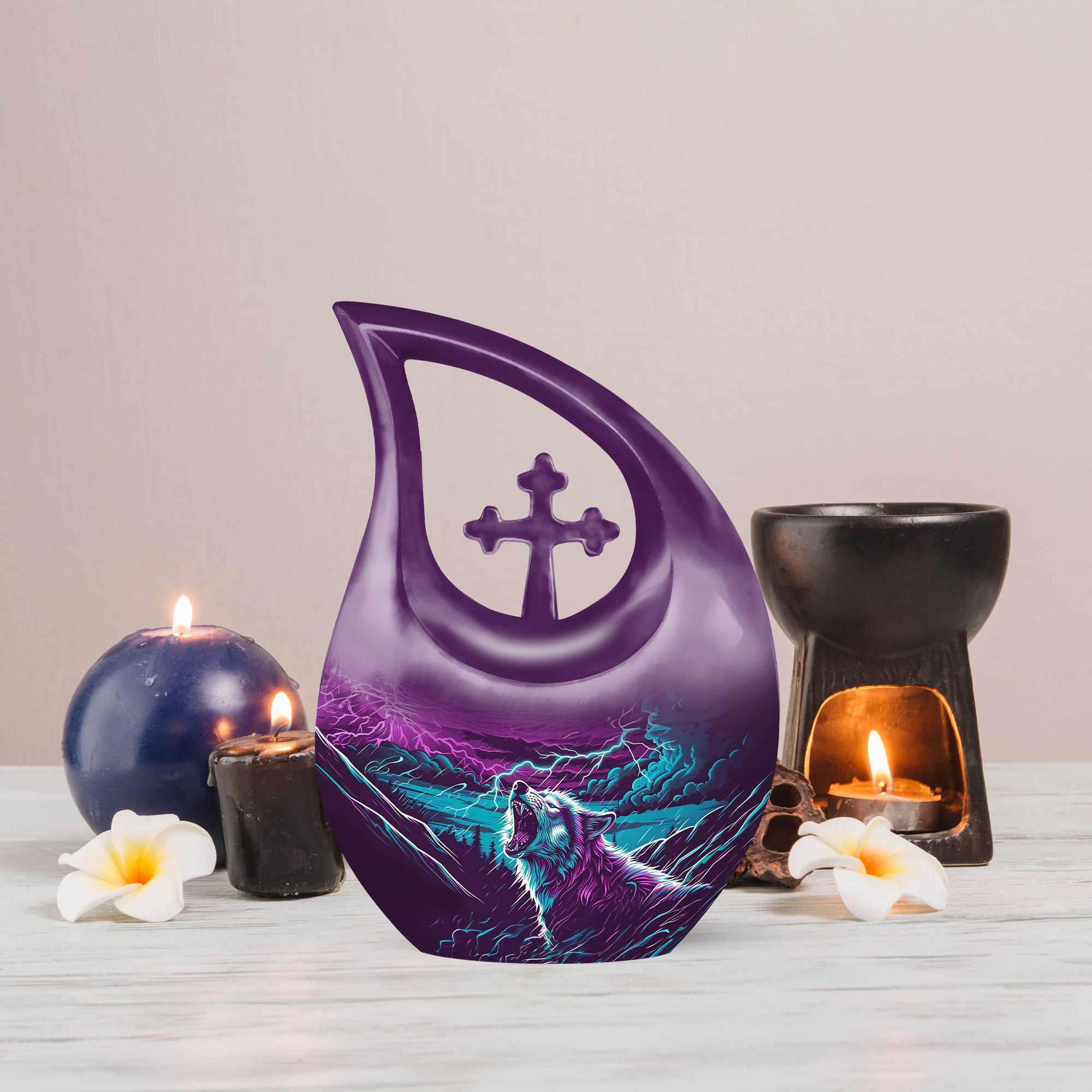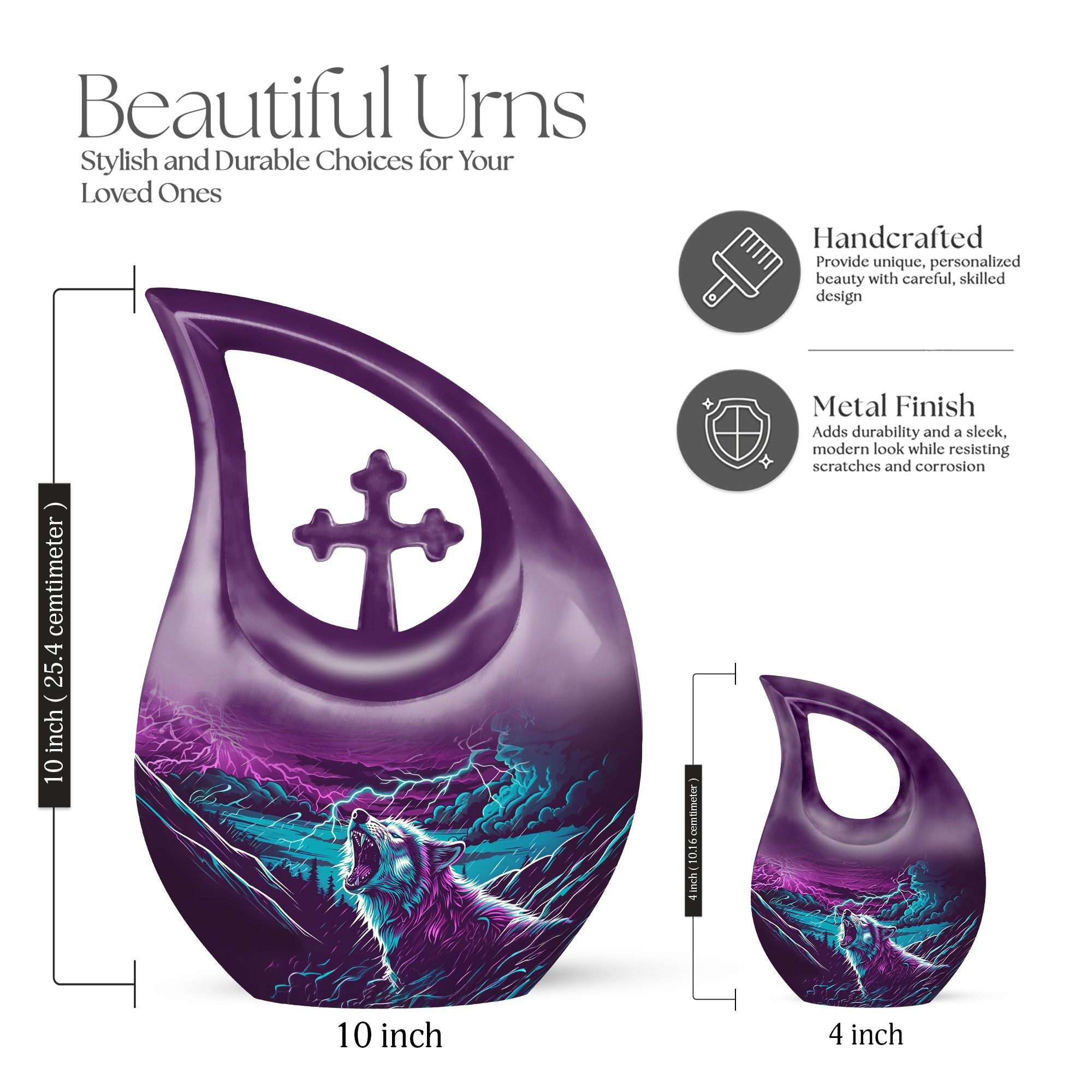 Honor your beloved with our beautifully designed Wolf Urn. Within the religious and ceremonial sector, this urn excels with its distinct cross drop layout showcasing an evocative wolf theme. Standing at a notable 10 inches and a weight of 3.3 pounds, this urn has the profound capacity to contain 200 cubic inches, making it categorically ideal as a large urn. Crafted meticulously from durable Aluminium, our urn stands as a testament to the talent of our artisans and your lasting love. Each urn is accompanied by a velvet pouch, excellent for the safeguarding of ash remnants. The Wolf Urn also offers enhancement through personalization, allowing you to etch names into its surface for a more intimate touch. Renowned as one of the most affordable urns in our collection, it brings together practicality and sentimental value. Though it effectively functions as an urn for human ashes, its unique design also makes it highly covetable as a miniature urn for ashes. Discover harmony in remembrance with our Wolf Urn.