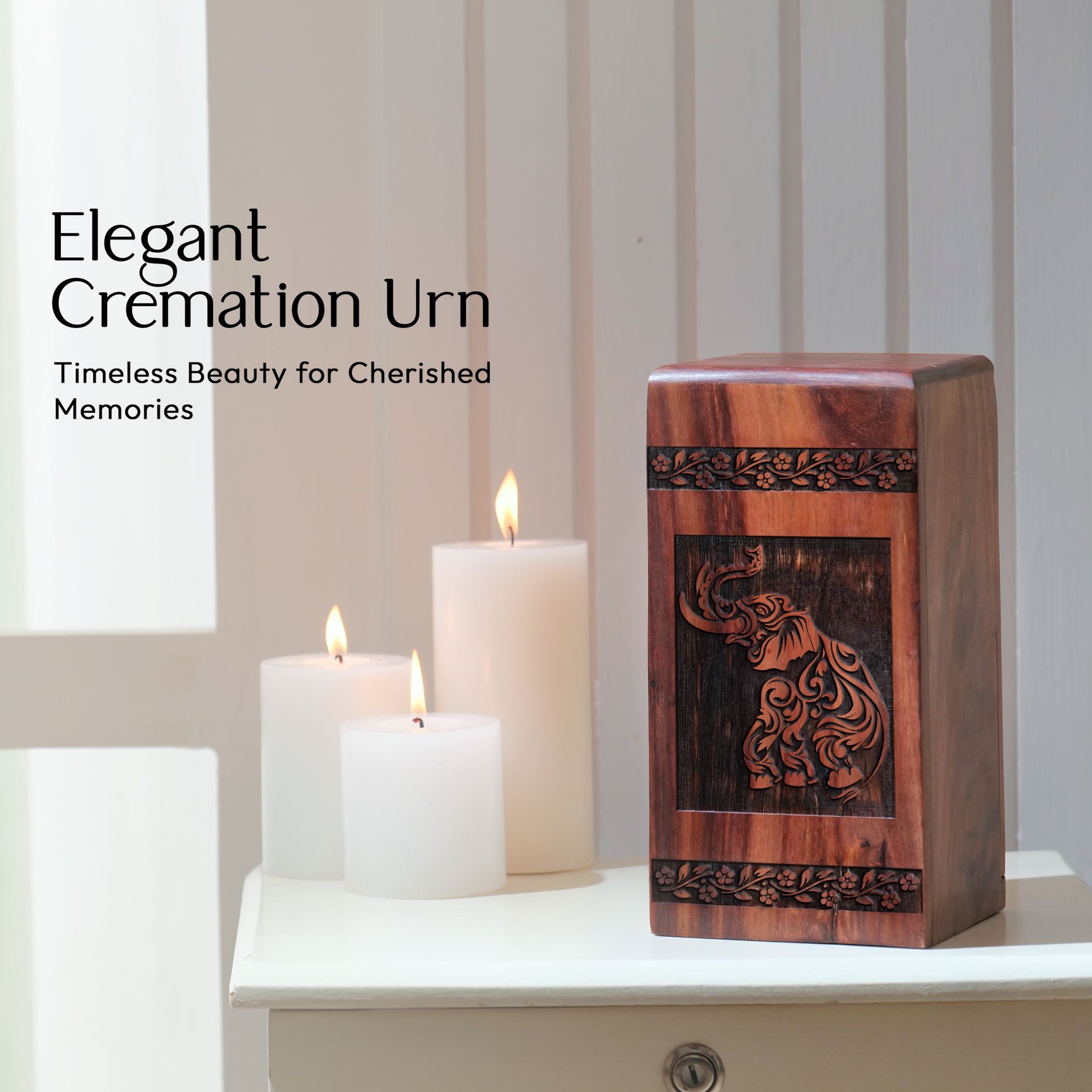 Experience an exquisite memorial avenue with our stunning Elephant Urn. Constructed with premium quality wood, these large urns embody tranquility and respect, exuding a sense of reverence. These cremation urns for human ashes are not only a symbol of love and respect for your cherished ones, but they also serve as a remembrance of their noble life. Delicately carved, the detailed elephant design adds an element of serene dignity. Our adult cremation urns are apt for burial needs as well as for keeping at your house as a memento. With our wood urns, bid farewell to your dear ones in a memorable way. When it comes to cremation, burial, or storing ashes, this urn achieves a balance of serenity and honor. Let each sight of these urns remind you of the firm, unwavering love that you shared, even as the winds of time blow. Unearth an unmatched memory preservation method through our tastefully designed cremation urns for ashes.
