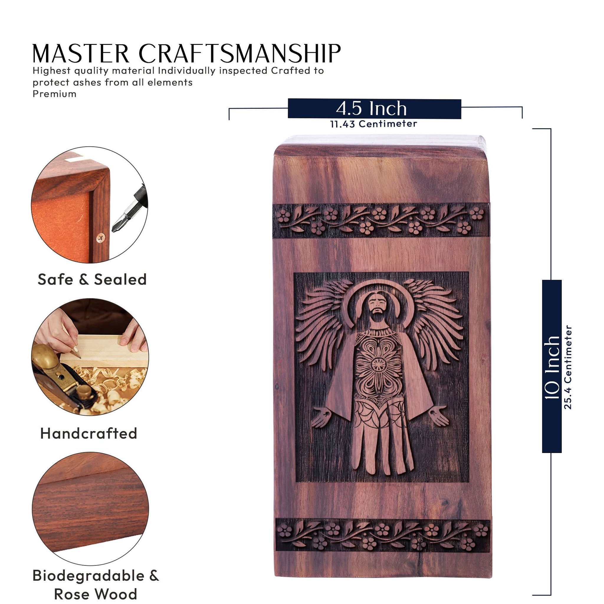 Discover our ethereal collection of Jesus Urns, meticulously crafted to serve as a peaceful resting place for your loved ones. Constructed from high-class wood, these urns are not just containers for ashes, but stunning pieces of art, radiating serene warmth and elegance. These sizeable containers can comfortably accommodate adult cremation remains. The wooden urns are not just objects, but symbols of enduring love, devotion, and respect, a tangible connection of ongoing compassion. If you're searching for urns for human ashes or adult cremation urns, our collection won't just meet your expectations, it will exceed them. Ideal for a dignified home display or as burial urns for ashes, their timeless grace transcends the norm, offering a comforting solace in times of grief. Own a tribute as unique as the loved one it represents. Browse our unique range of urns and prepare to be inspired.
