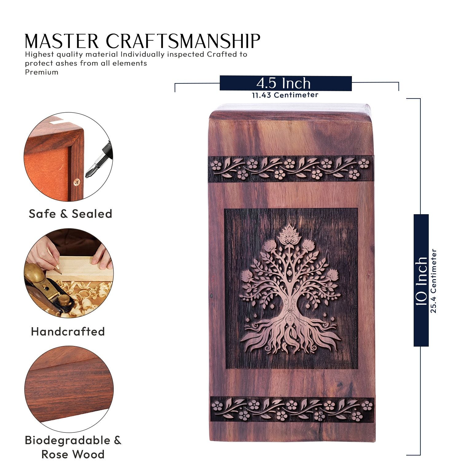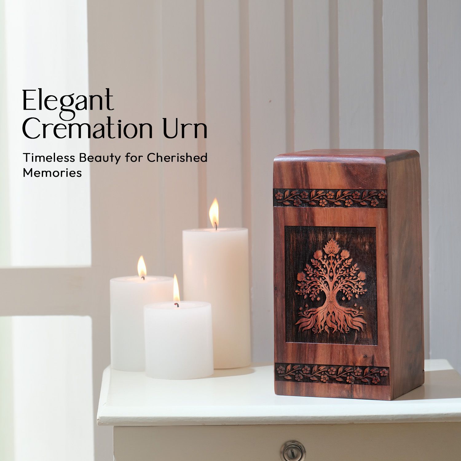 Bestow tribute to the departed soul with our uniquely crafted Tree of Life Urns. Designed intricately, these Wooden Urns are perfect resting vessels for Human Ashes, embodying the essence of the circle of life. Besides making a poignant statement, these Urns are an enduring homage for your loved ones. Ideal for both gender, our collection includes specially crafted Urns for Ashes Adult Female Mom and Urns for Ashes Adult Male. Impeccably designed, these Urns offer solace, symbolizing the soul's reunion with nature. Their sturdy construction ensures they stand the test of time, making them a fitting tribute for your lost loved one. Our range also includes options specifically designed for Cremation Ashes Mother. With their elaborate design and quality craftsmanship, these Urns offer a unique way of expressing love and remembrance. Suitable for religious and ceremonial practices, they remain an everlastingly beautiful touchstone of memories, cherished and loved.