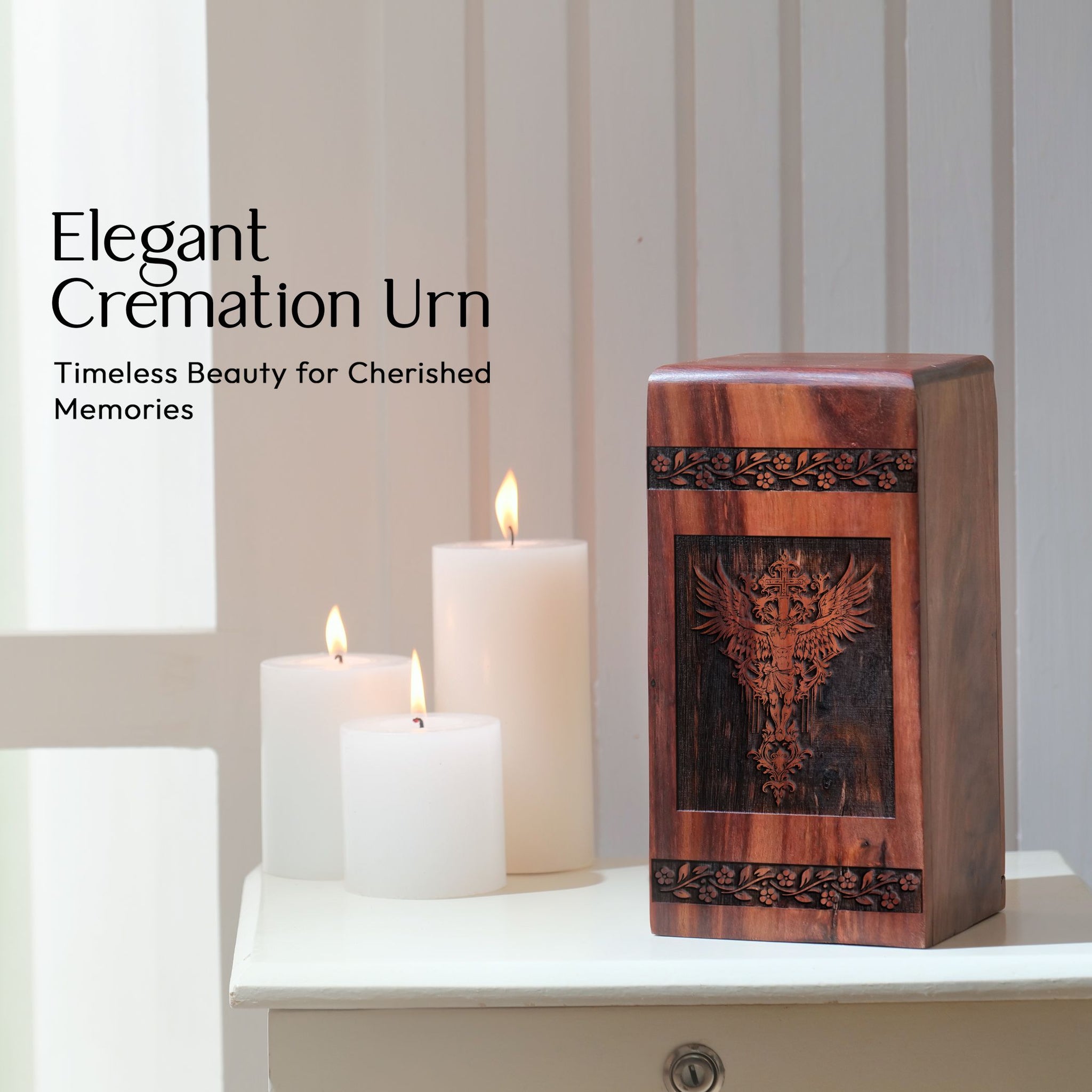 Safeguard your loved ones' last earthly remains with dignity and grace using our charming Jesus Urn. Enunciated for larger needs, this relic of reminiscence elegantly houses the ashes of an adult man or those precious mementos that remind you of mom. Constructed from cultivated wood and artisanally crafted with exceptional attention to detail, this piece presents itself as a unique memento mori. It seamlessly blends with any decor and acts as a comforting presence in your home. Our wood urns go beyond the traditional cremation containers, bringing not only utility but also significance to the grieving process. This thoughtfully-designed urn reverently exudes a timeless dedication to love and faith, making it an exquisite addition to your memorial ceremony supplies. Show your devotion to your lost one with this enduring symbol of respect and remembrance.