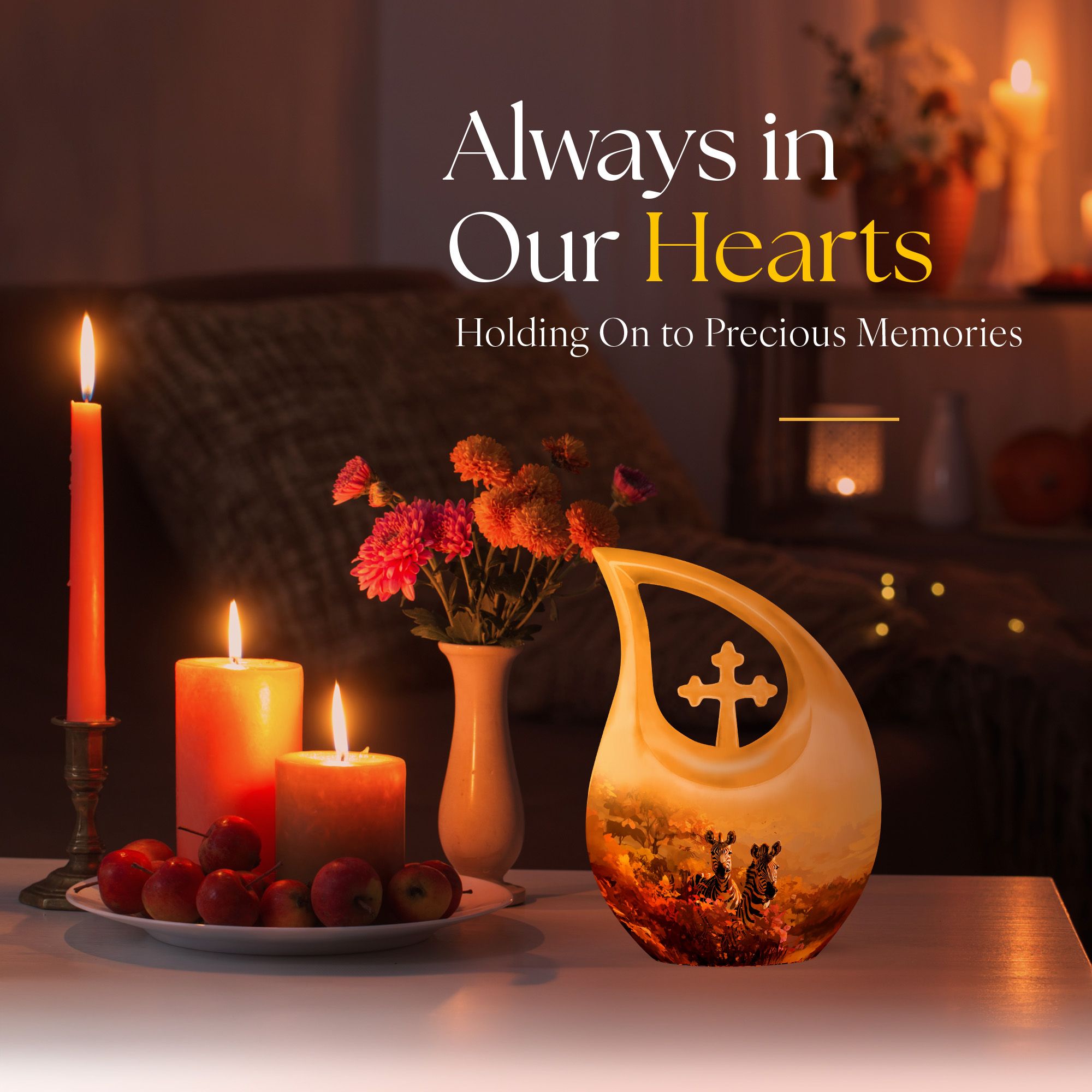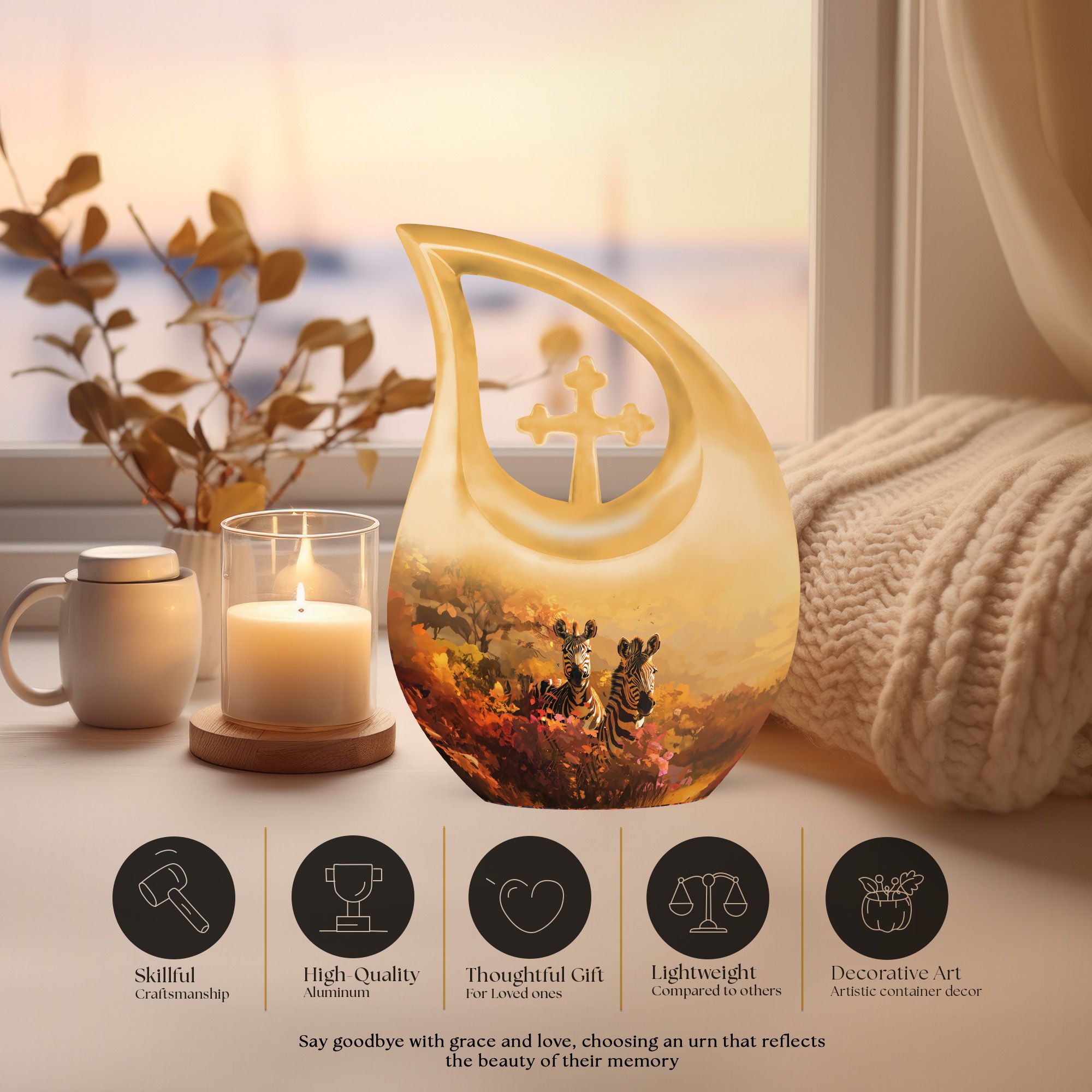 Preserve the cherished memories of your beloved with our striking Zebra Urn, an artistic fusion of symbolism and practicality. Crafted from resilient aluminium, this 10 Inch urn is coated with an endearing 'Cross Drop' design that highlights its exquisite aesthetics, all while ensuring a sturdy resting place for the departed. Accommodating up to 200 cubic inches, this urn is suitable for both adults and seniors, providing room for personalized engraving. Each Zebra Urn weighs a moderate 3.3 pounds and comes with a velvet pouch, safeguarding the containment of ashes in a dignified manner. While its size fits as a large urn, its stylish theme also collaborates with the category of affordable urns, echoing the universal pain of loss and the beauty of fond memories. Popularly searched terms include Memorial Urns, Large Cremation Urns, Miniature Urns For Ashes, Large Urns For Human Ashes making it a top choice for those seeking extraordinary and meaningful memorial ceremony supplies.