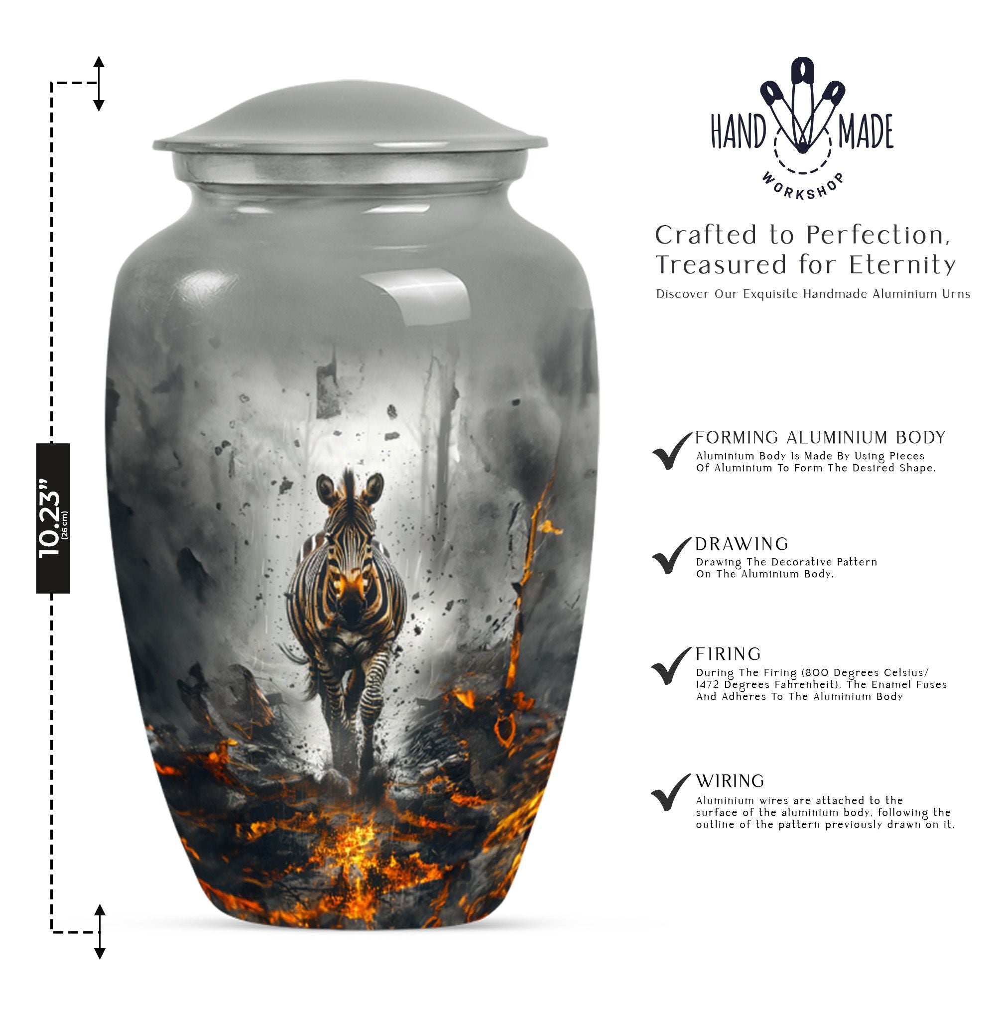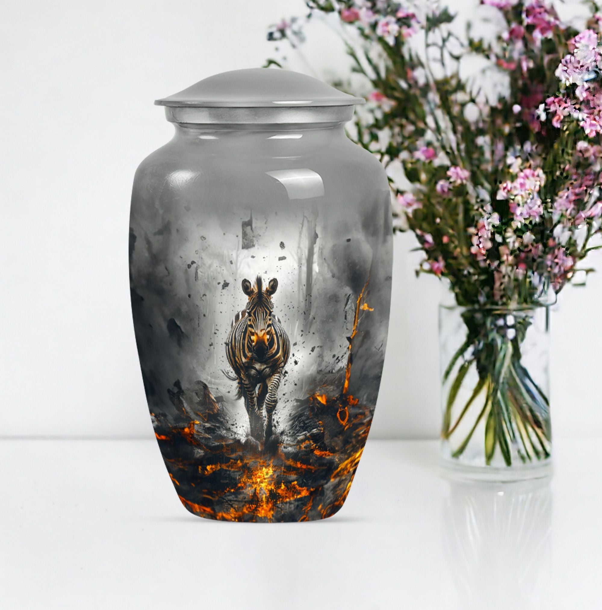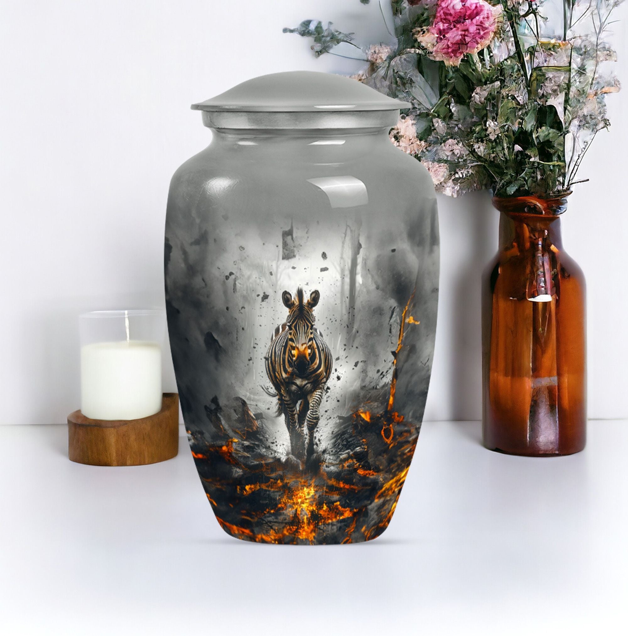 Highlight your love for your departed loved ones with our large abstract Zebra Memorial Urn. Beautifully crafted from top-of-the-line aluminium, this abstract-themed urn provides a dignified tribute to the adult female and offers a thoughtful way to remember the memories shared. With a standing height of 10 inches and capacity of 200 cubic inches, this urn comfortably contains the ashes. The urn weighs a sturdy 3.3 pounds and ensures long-term preservation. Personalize this classic urn with engraved names to give a unique touch to your memento. The package comes with a velvet pouch for secure containment of ashes. Besides memorial urns for human ashes adult female, this product also suits needs for funeral urns for human ashes adult man, providing a sacred option among cremation urns for funerals. Embrace your affection for your loved one with this valuable keepsake. Remember, caring is the greatest act of love.