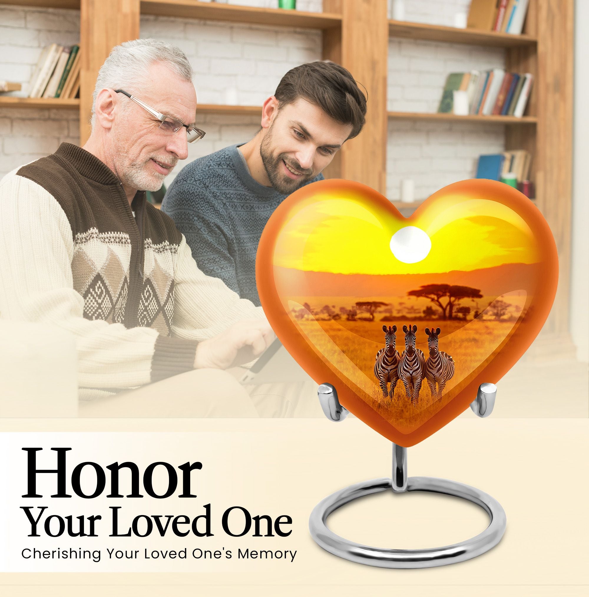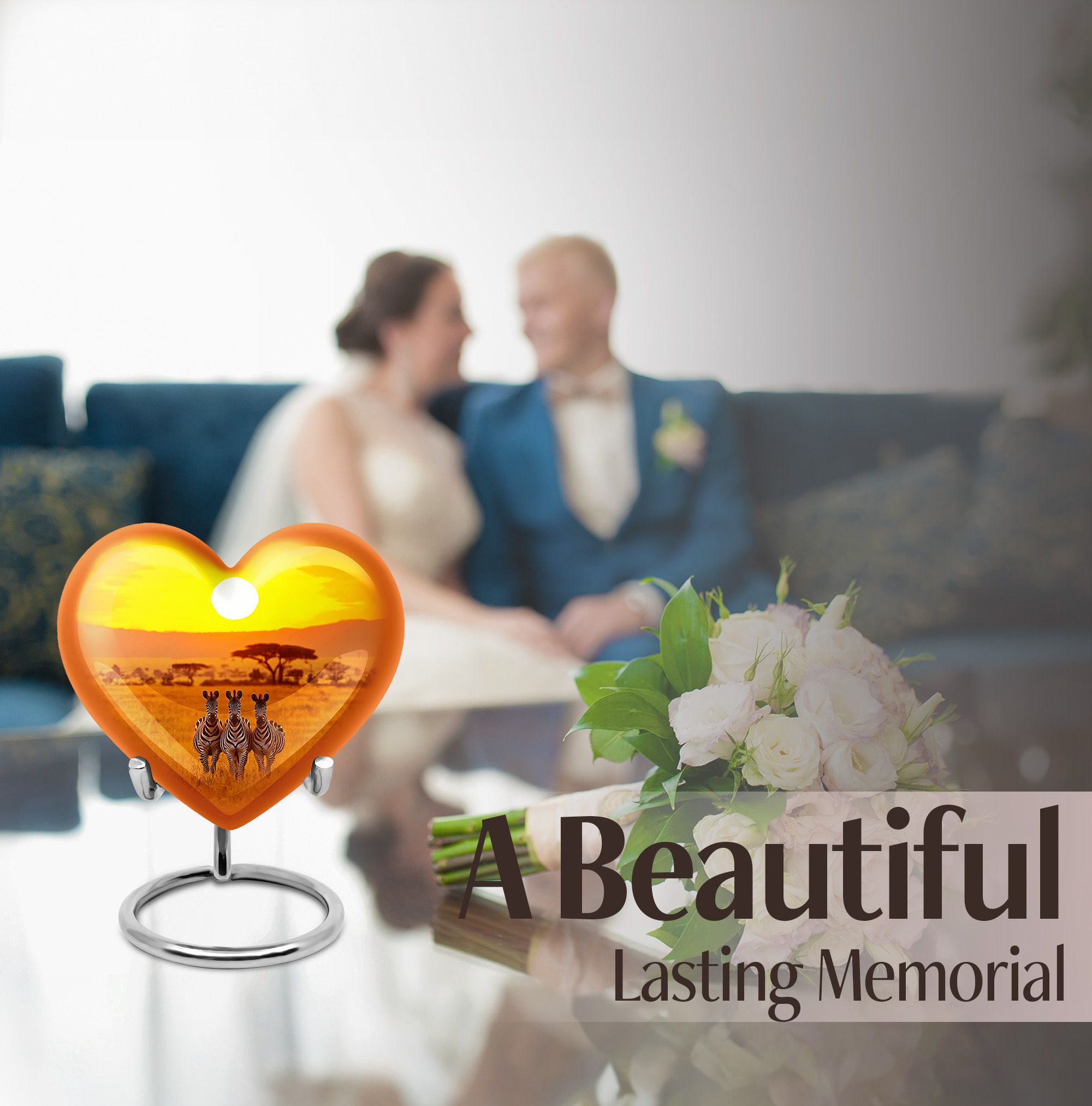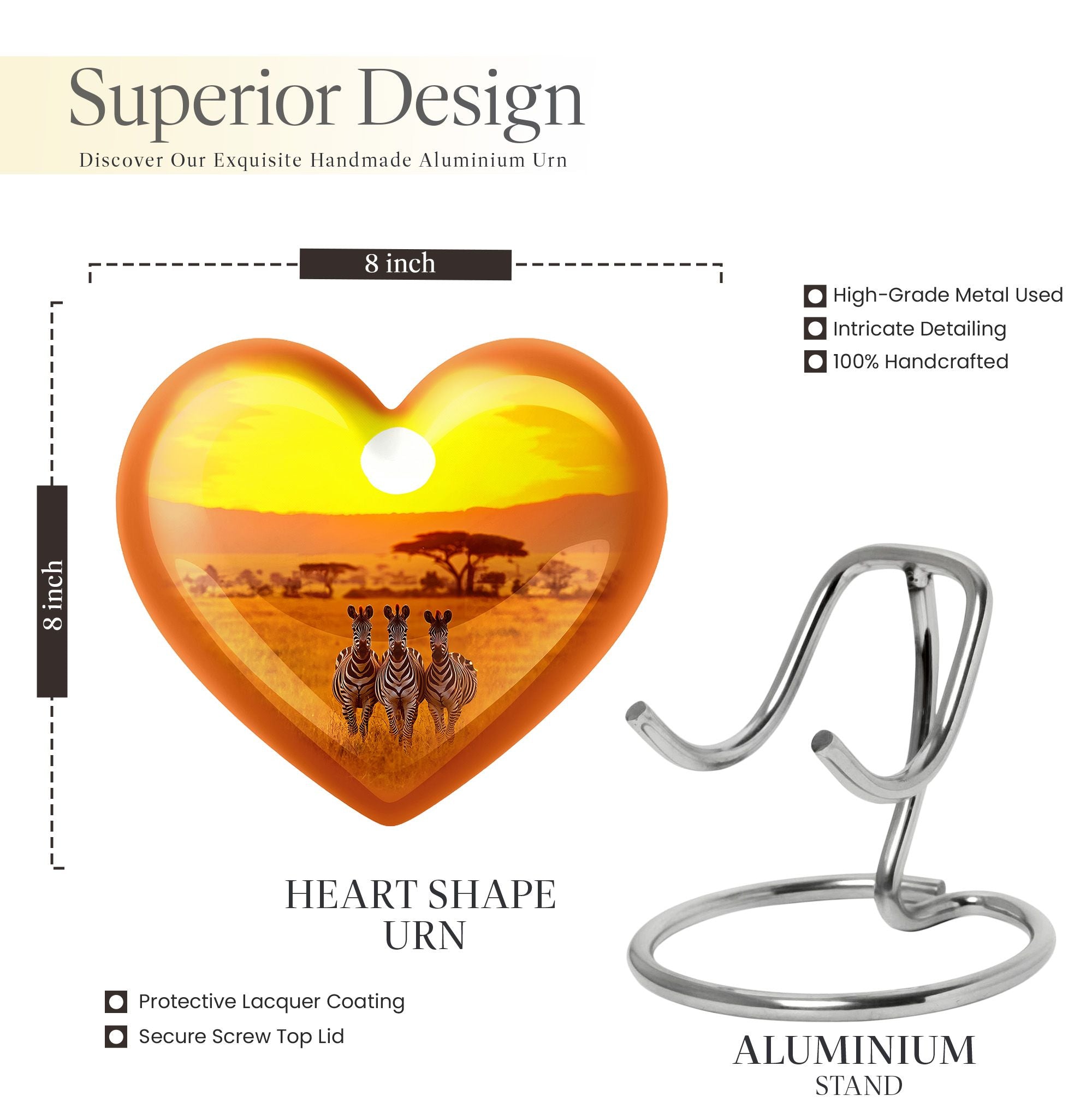 An enchanting tribute to your departed loved one, this 'Zebra Urn' is a unique choice among funeral decorative urns. Balancing poignancy and elegance, this 10-inch urn brings an abstract theme overlayed onto an aluminium body, creating a visually engaging memorial urn that reflects the boundless love shared. A lightweight piece, it weighs in at a mere 3.3 pounds yet can encapsulate up to 200 cubic inches of a cherished individual's ashes. This uniquely large urn is enveloped in a velvet pouch, assuring utmost respect and dignity in containment. Enhancing its distinction, personalize it with the engraved names of those held dear. Let this urn human adult male or urns for cremation ashes mother encapsulates the essence of your adoration in its majestically sculpted form. An abstract tribute that respects the life lived and love shared, the zebra urn serves as a beacon of fond memories and undying affection.