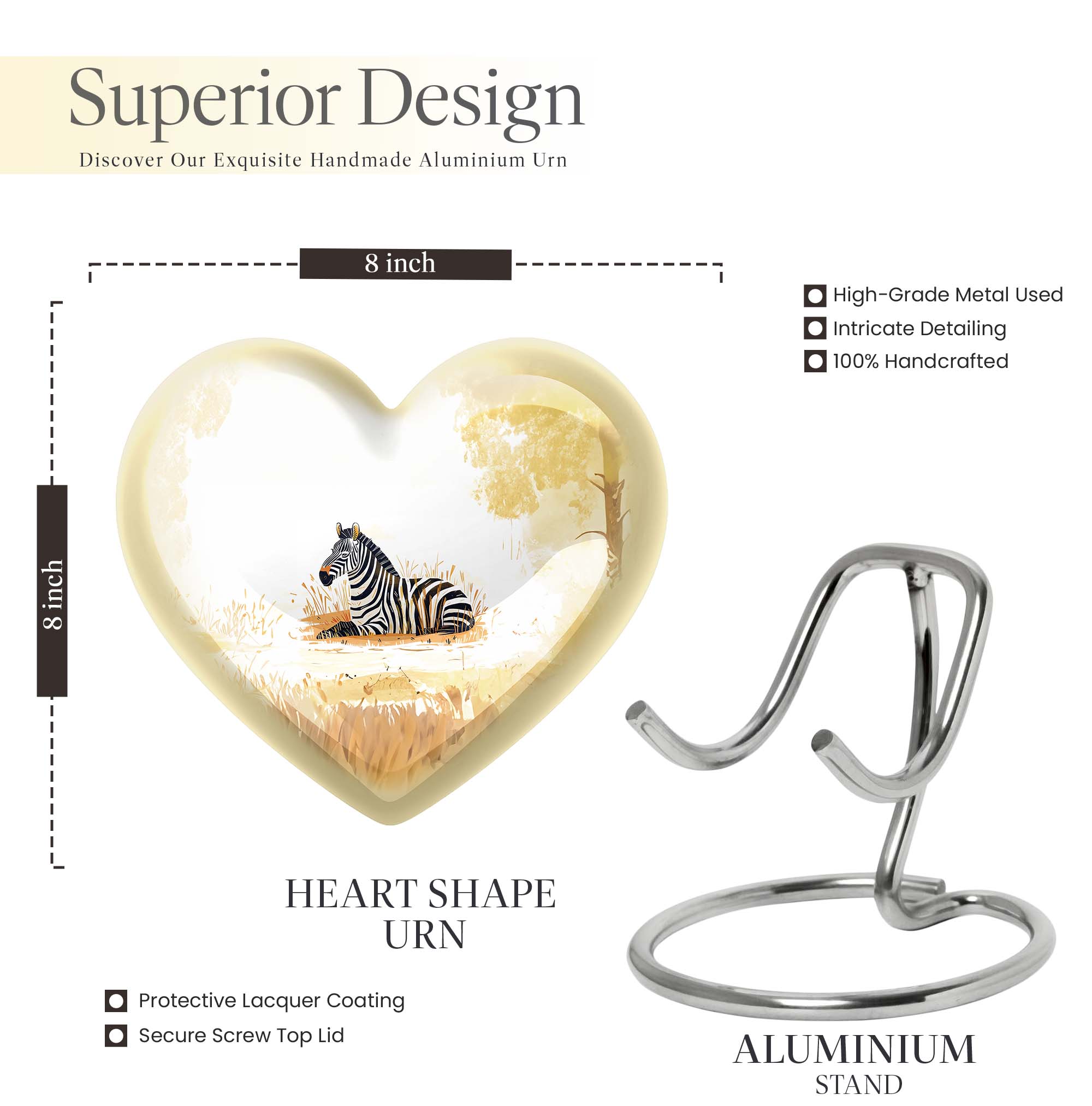 Honor your loved ones with a lasting symbol of their life and love, utilizing our Zebra Urn for adult ashes. This dignified Large Urn is meticulously crafted from durable Aluminium material and exhibits a heart urn appeal wrapped in an abstract theme, reflecting endless affection and an eternal bond. With a size of 10 inches and a weight of 3.3 pounds, this cremation urn offers a substantial capacity of 200 cubic inches, suitable for preserving human ashes securely. The package also includes a velvet pouch for gentle containment and discreet transportation of ashes. Additionally, our cremation urn allows you to personalize with engraved names, adding a thoughtful touch to your commemorative act. Ideal for serving as funeral urns for both men and women, this product brings a blend of elegance and tranquility to your memorial ceremonies. Note: Design not detailed.