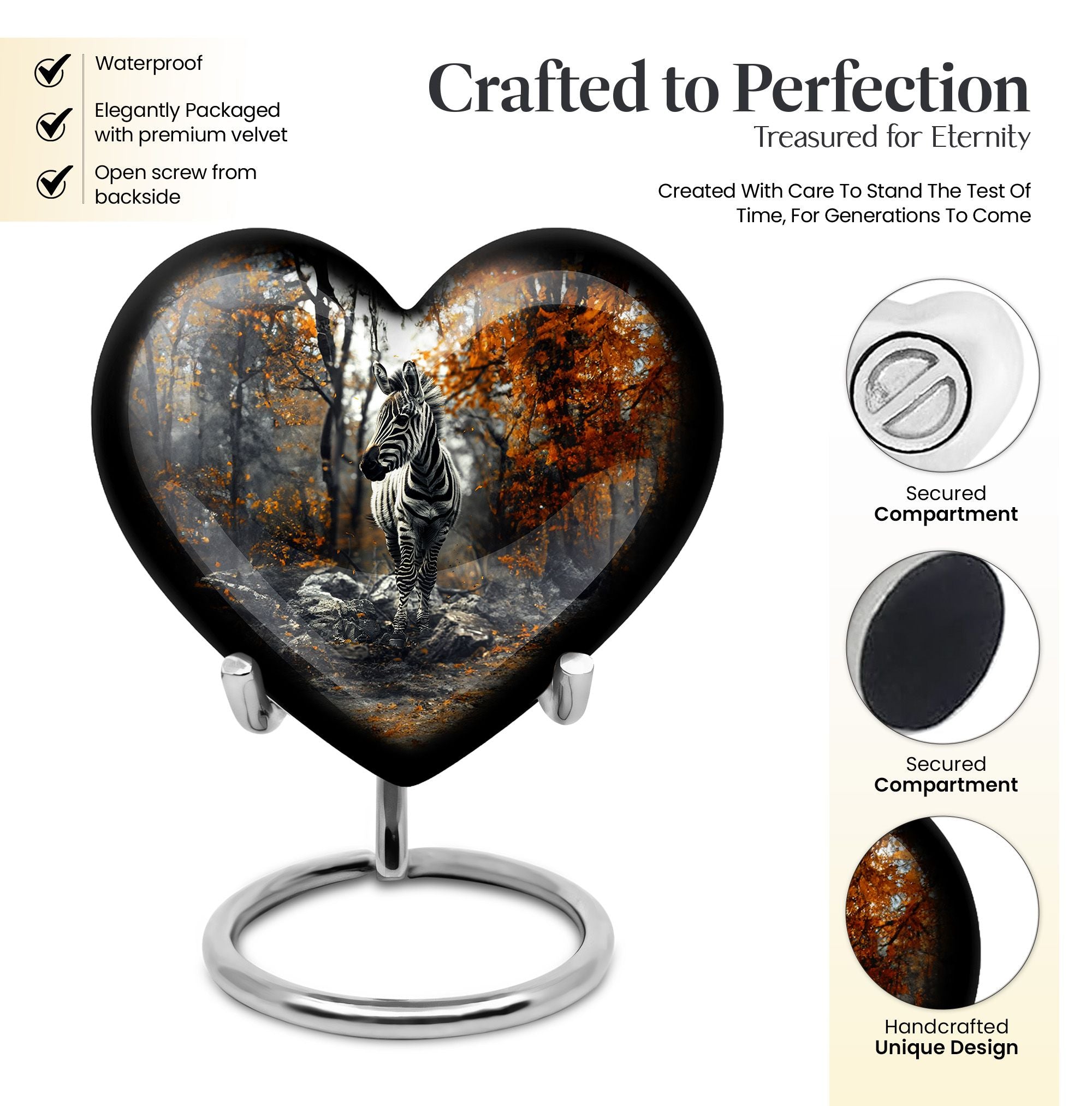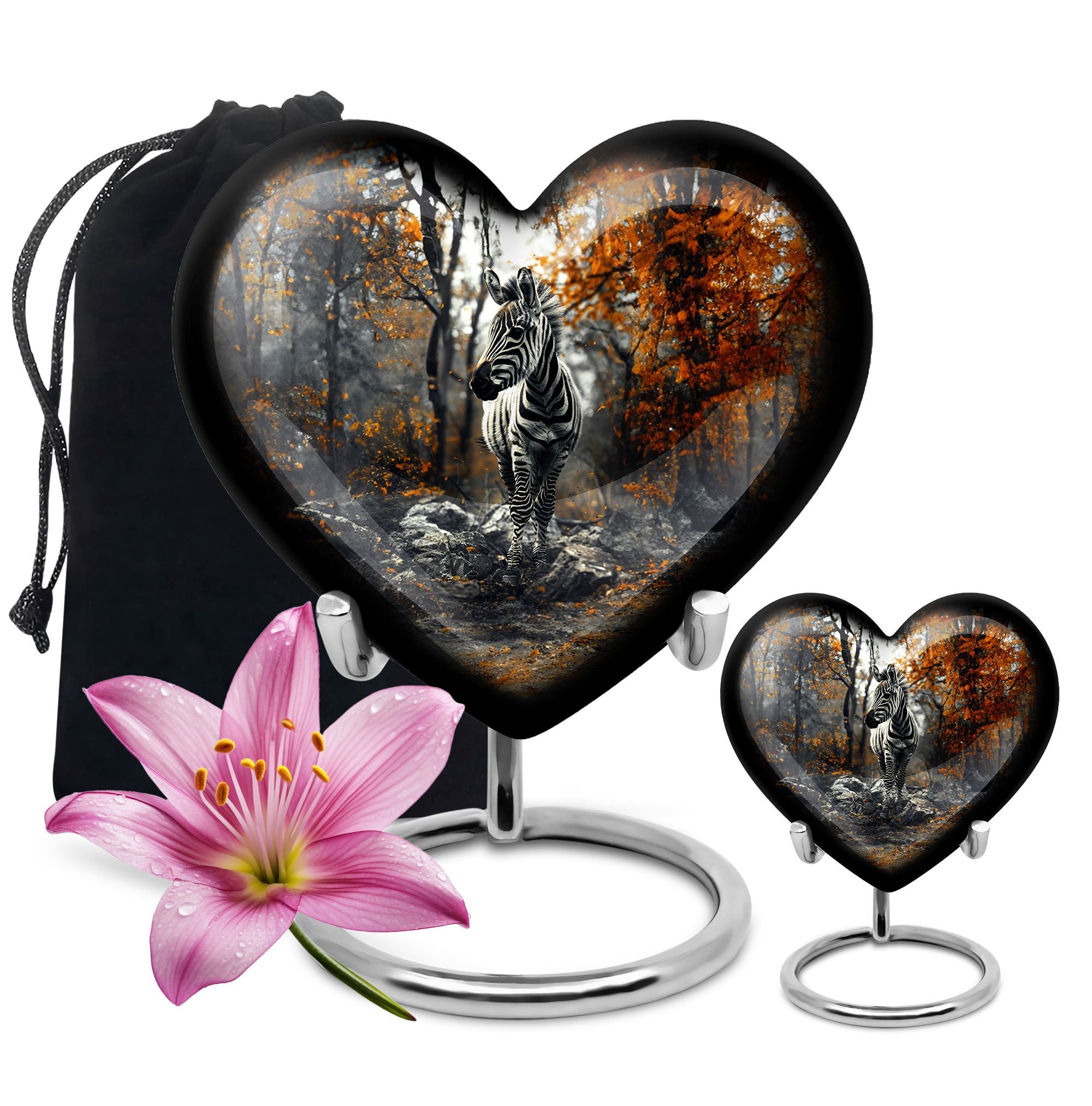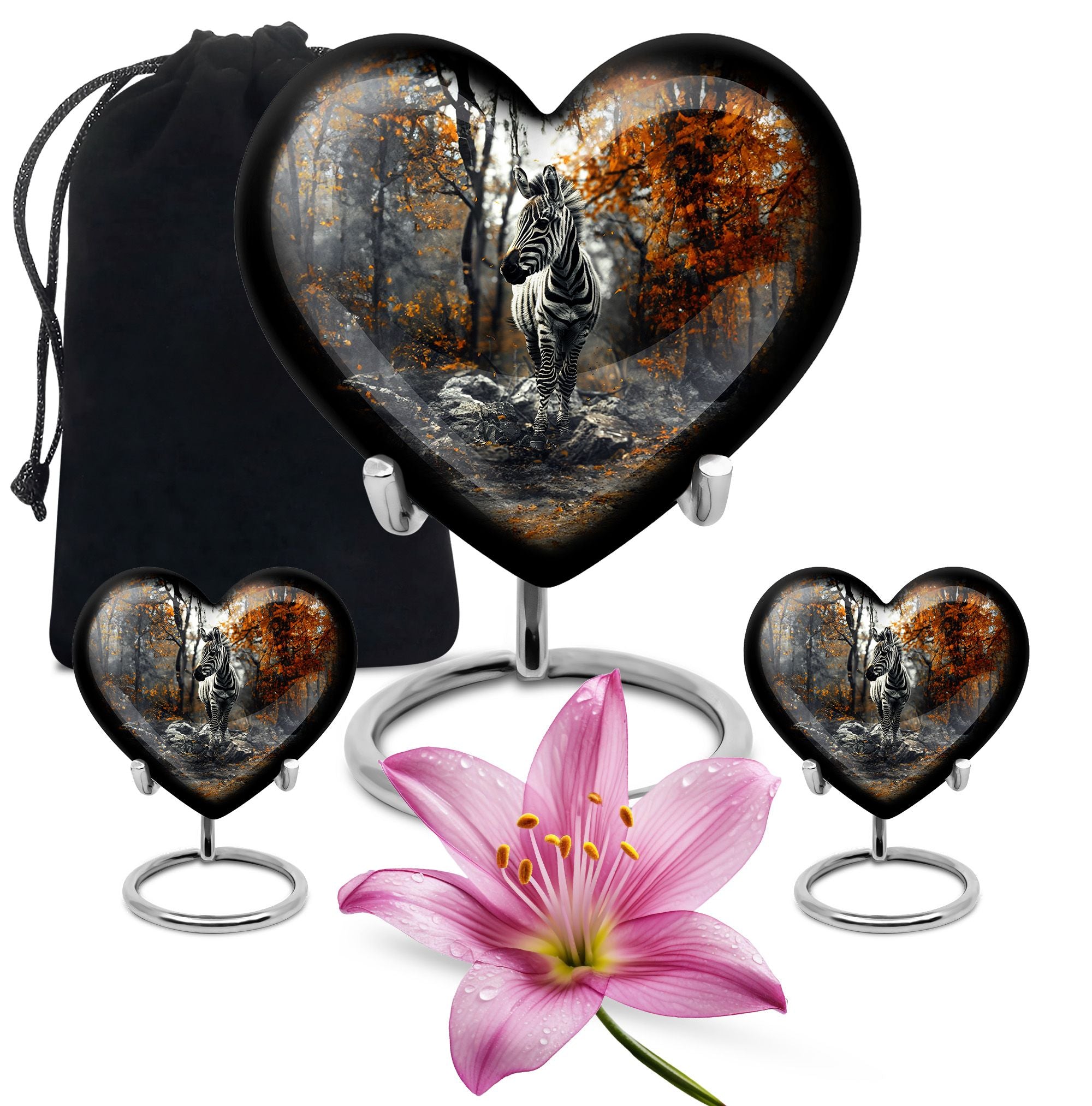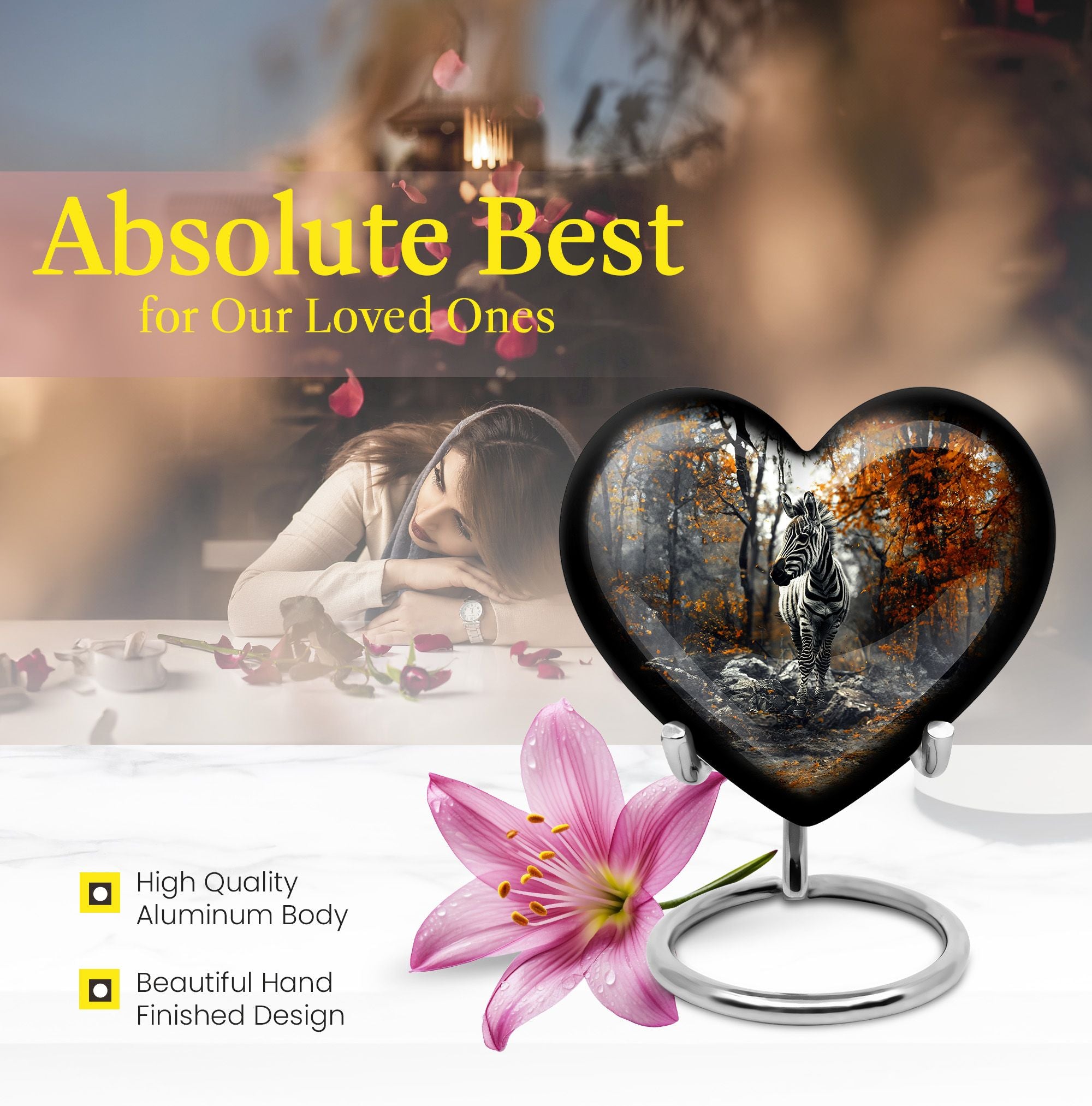 Express your tribute in a truly sublime manner with this onotable 10 Inch 'Heart Urn' for a cremation ceremony. Specifically tailored for adults and seniors, this cremation urn, cast in long-lasting Aluminium is a prime epitome of elegance. With the capacity to accommodate up to 200 cubic inches, this urn exhibits an abstract theme that is bypasser of the standard designs, offering a large urn that stands 10 inches in height and weighs just about 3.3 pounds, making it manageable and transportable. This zebra urn stands alone in the market, an absolute jewel in cremation urns for men. A bonus addition is the velvet pouch provided for secure containment of ashes. For a more personal feel, there's an option of engraving names or a heartfelt message. This urn provides a touching memorial for your loved one and a beautiful focus for your memorial service. A strikingly artistic and meaningful storage like the 'Heart Urn' is a prime choice for those on a quest for burial urns for cremation ashes. Disclaimer: Product does not include 'Urn Design'.