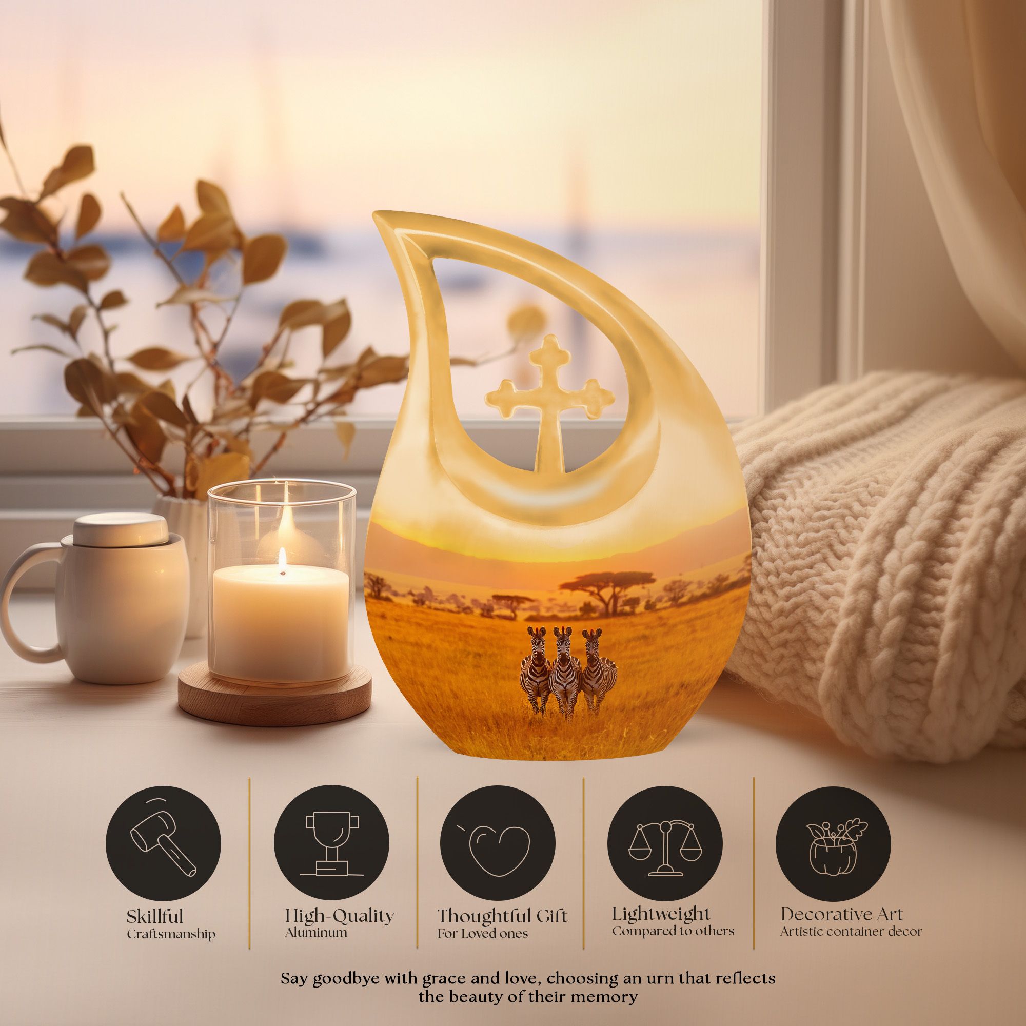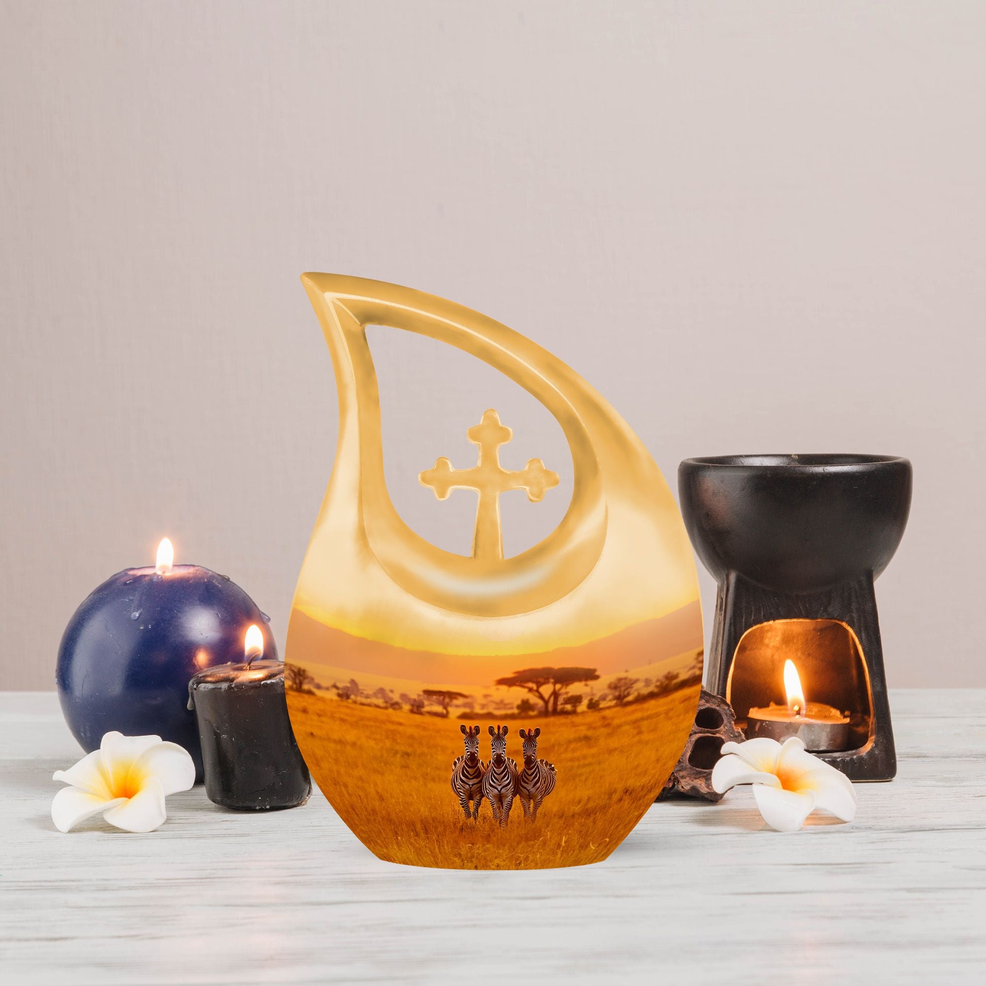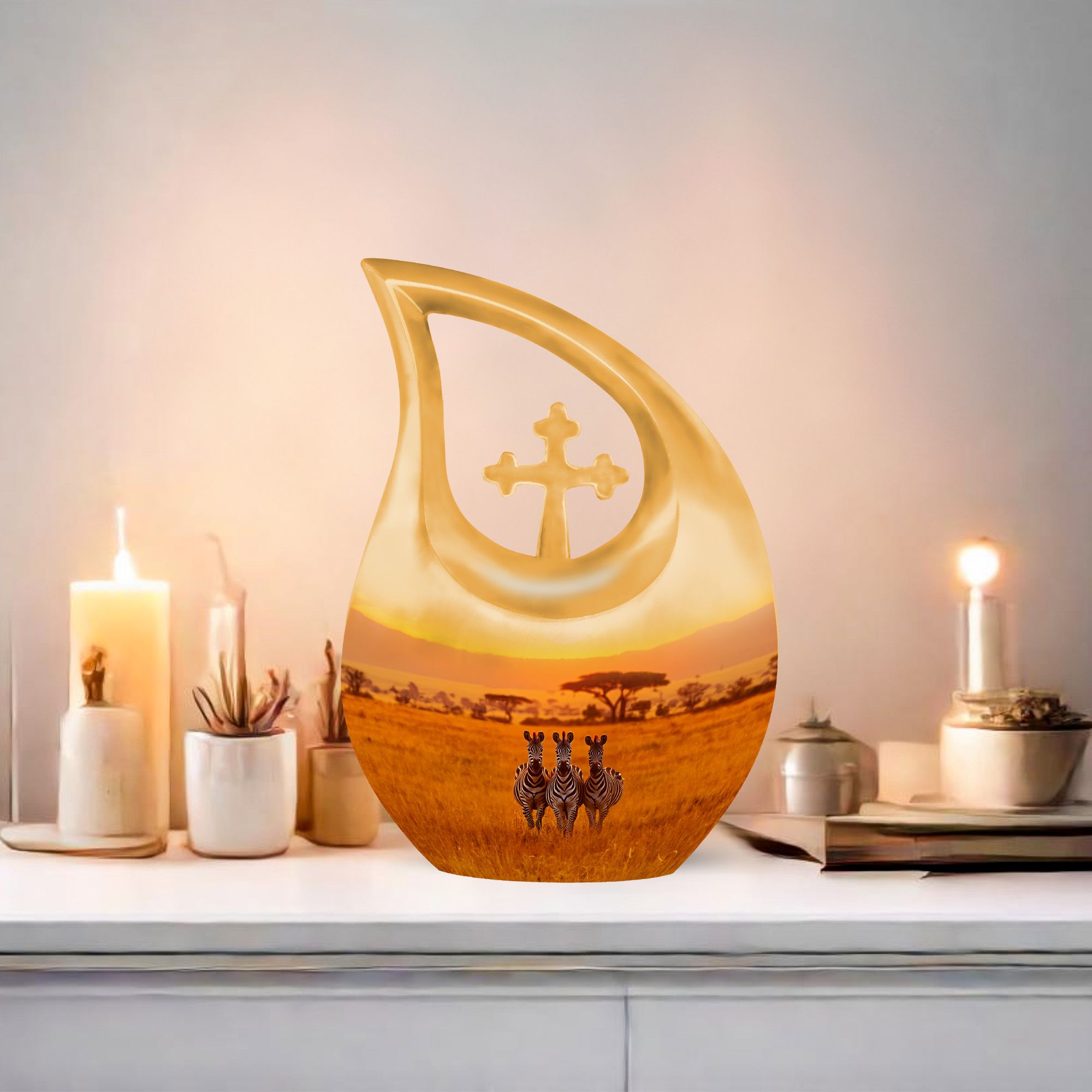 Immerse yourself in the tranquillity of faith with our Zebra urn, a tribute to your departed loved ones that keeps their memory alive. Exemplify the enduring love that transcends the physical realm with this premium-quality large cremation urn. This particular urn stands 10-inch tall, weighs 3.3 pounds, and has a capacity of 200 cubic inches, suitable for the ashes of adults and seniors. It offers a unique Cross Drop theme entwined with a mesmerizing zebra pattern. Made from sturdy aluminium, this urn ensures the containment of ashes for ages. Our package also includes a graceful velvet pouch for secure and respectful containment of ashes. The urn opens a door to customization - engrave the names as a mark of a lasting bond. Whether you need memorial urns, affordable urns, cremation boxes or ashes urns for sale, count on our top-tier Zebra urn to speak volumes of your undying love and respect for your dearly departed.