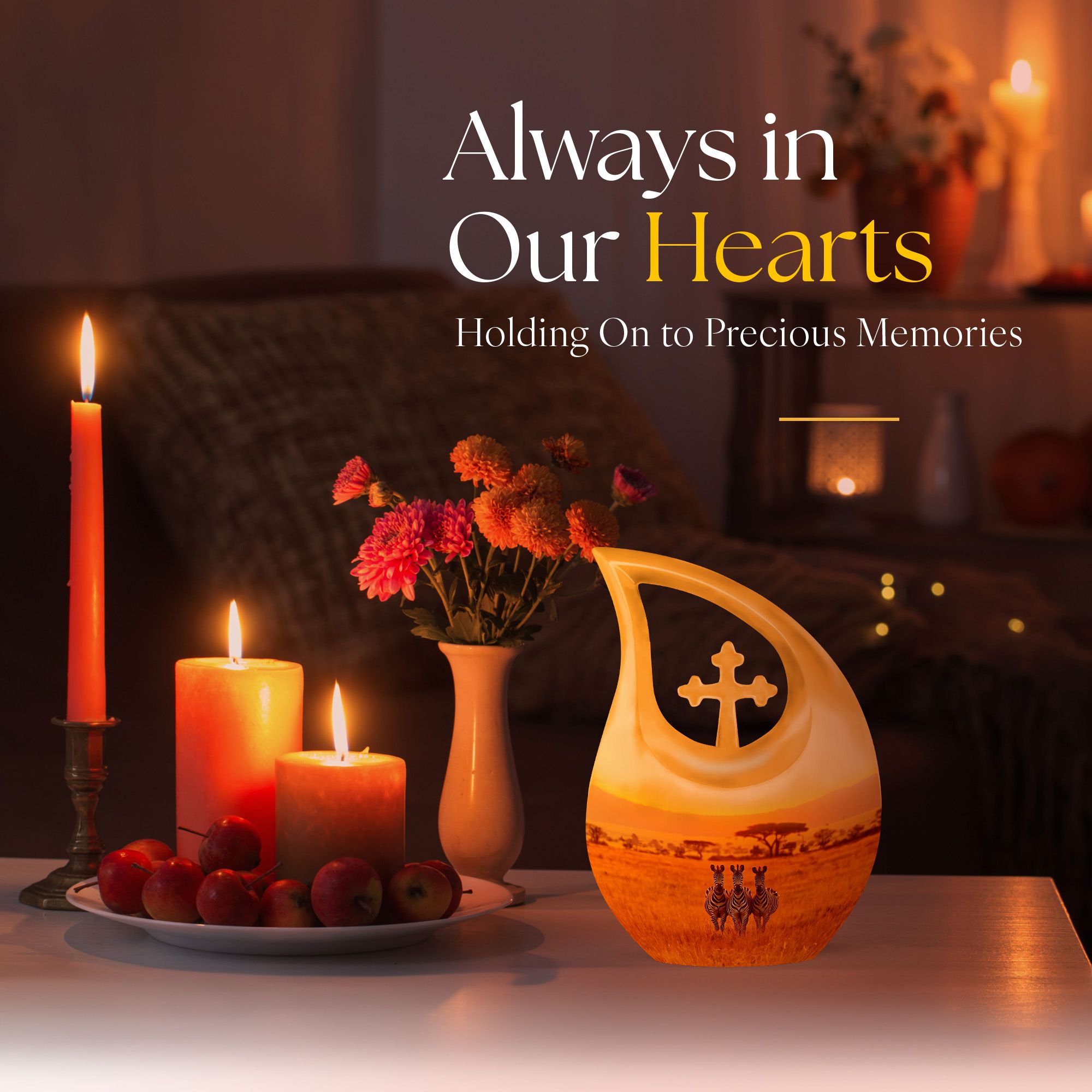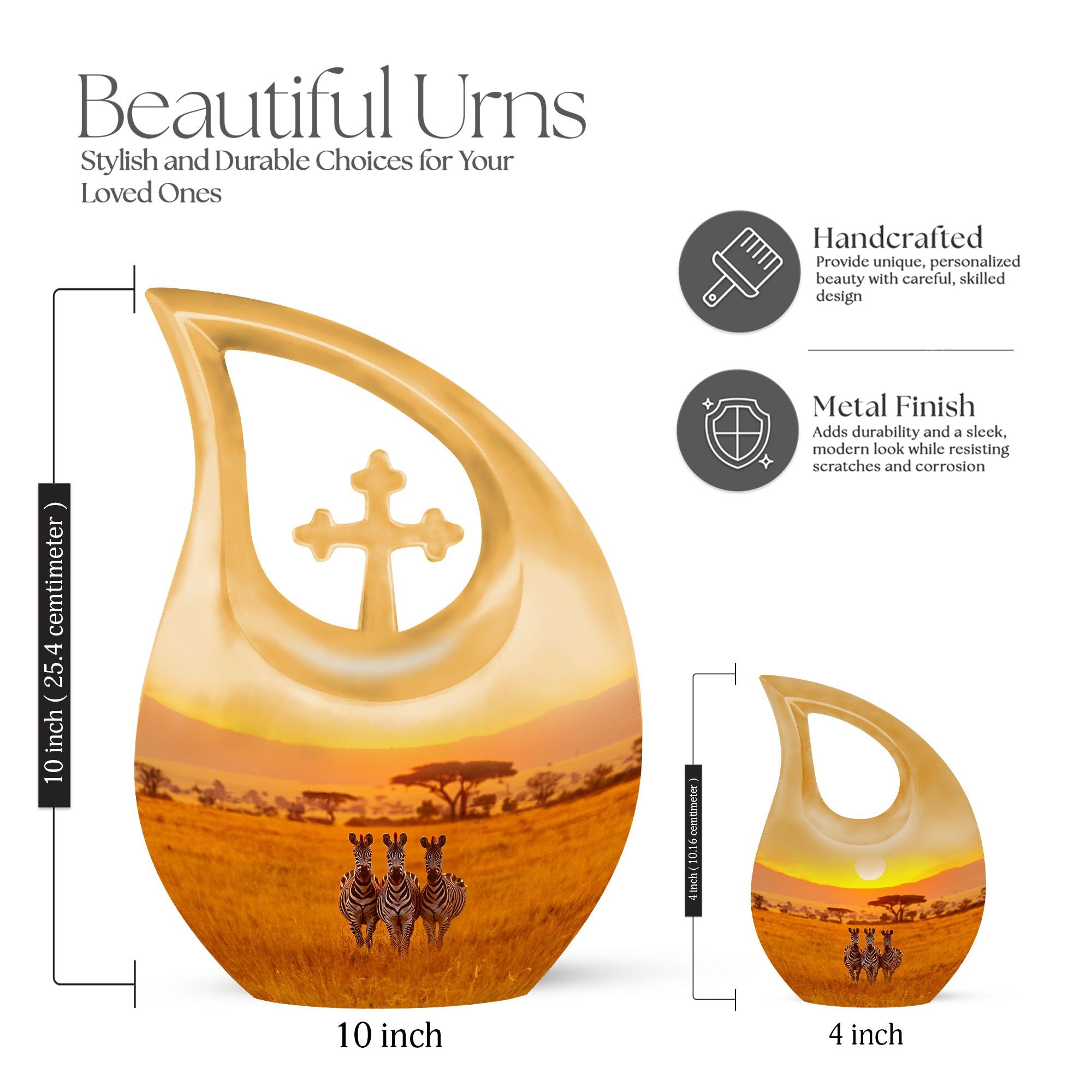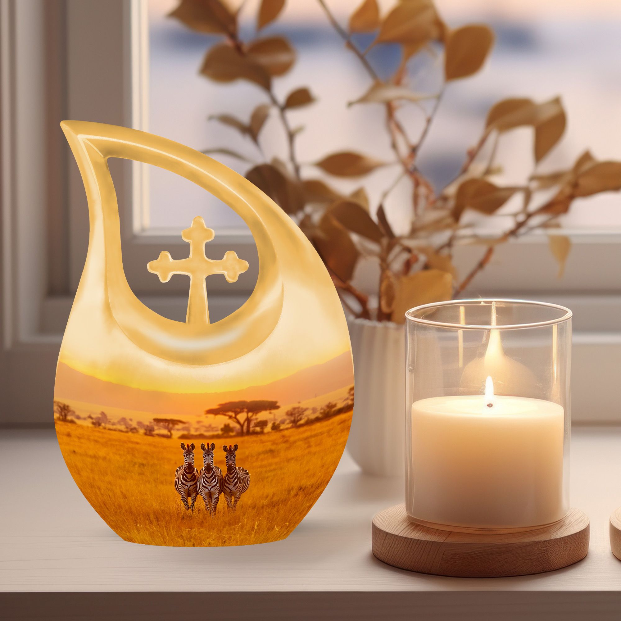 Immerse yourself in the tranquillity of faith with our Zebra urn, a tribute to your departed loved ones that keeps their memory alive. Exemplify the enduring love that transcends the physical realm with this premium-quality large cremation urn. This particular urn stands 10-inch tall, weighs 3.3 pounds, and has a capacity of 200 cubic inches, suitable for the ashes of adults and seniors. It offers a unique Cross Drop theme entwined with a mesmerizing zebra pattern. Made from sturdy aluminium, this urn ensures the containment of ashes for ages. Our package also includes a graceful velvet pouch for secure and respectful containment of ashes. The urn opens a door to customization - engrave the names as a mark of a lasting bond. Whether you need memorial urns, affordable urns, cremation boxes or ashes urns for sale, count on our top-tier Zebra urn to speak volumes of your undying love and respect for your dearly departed.