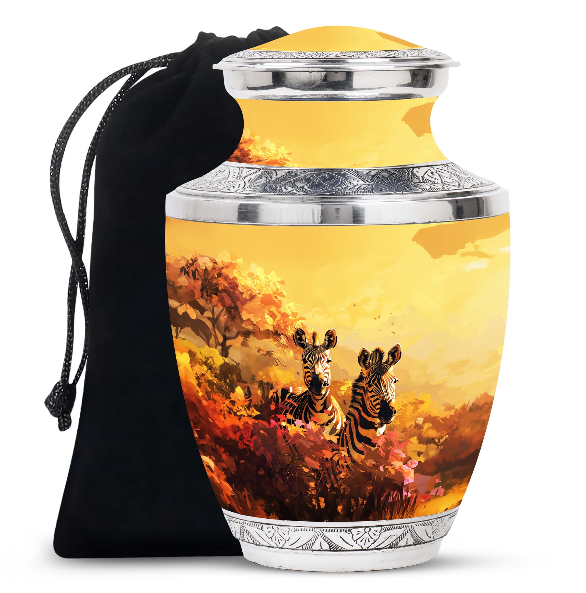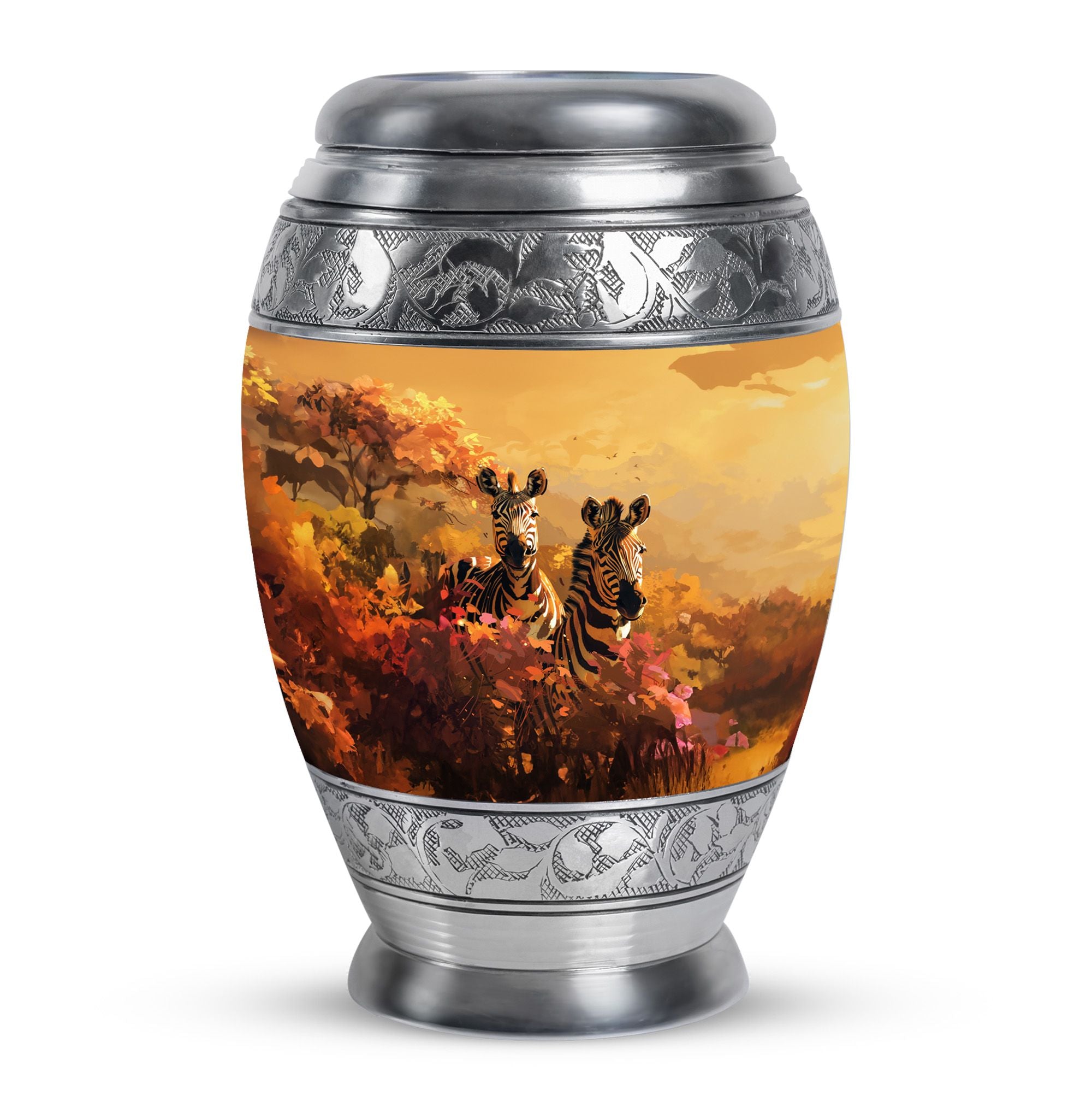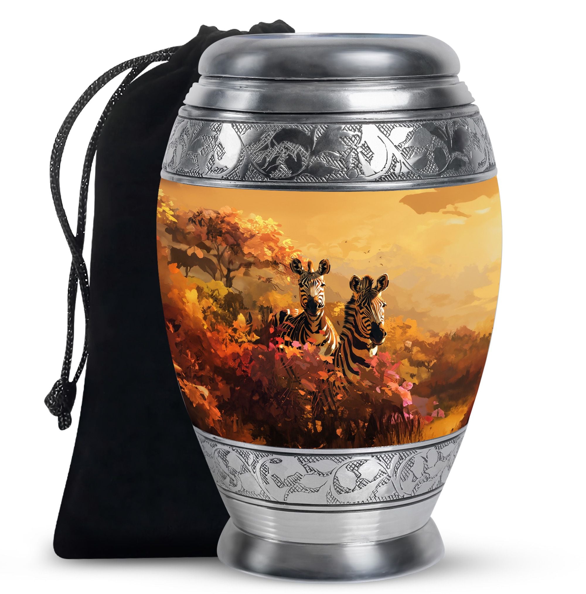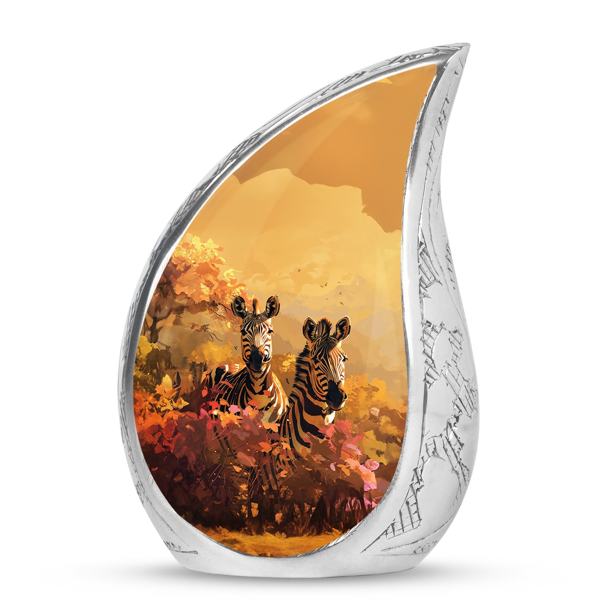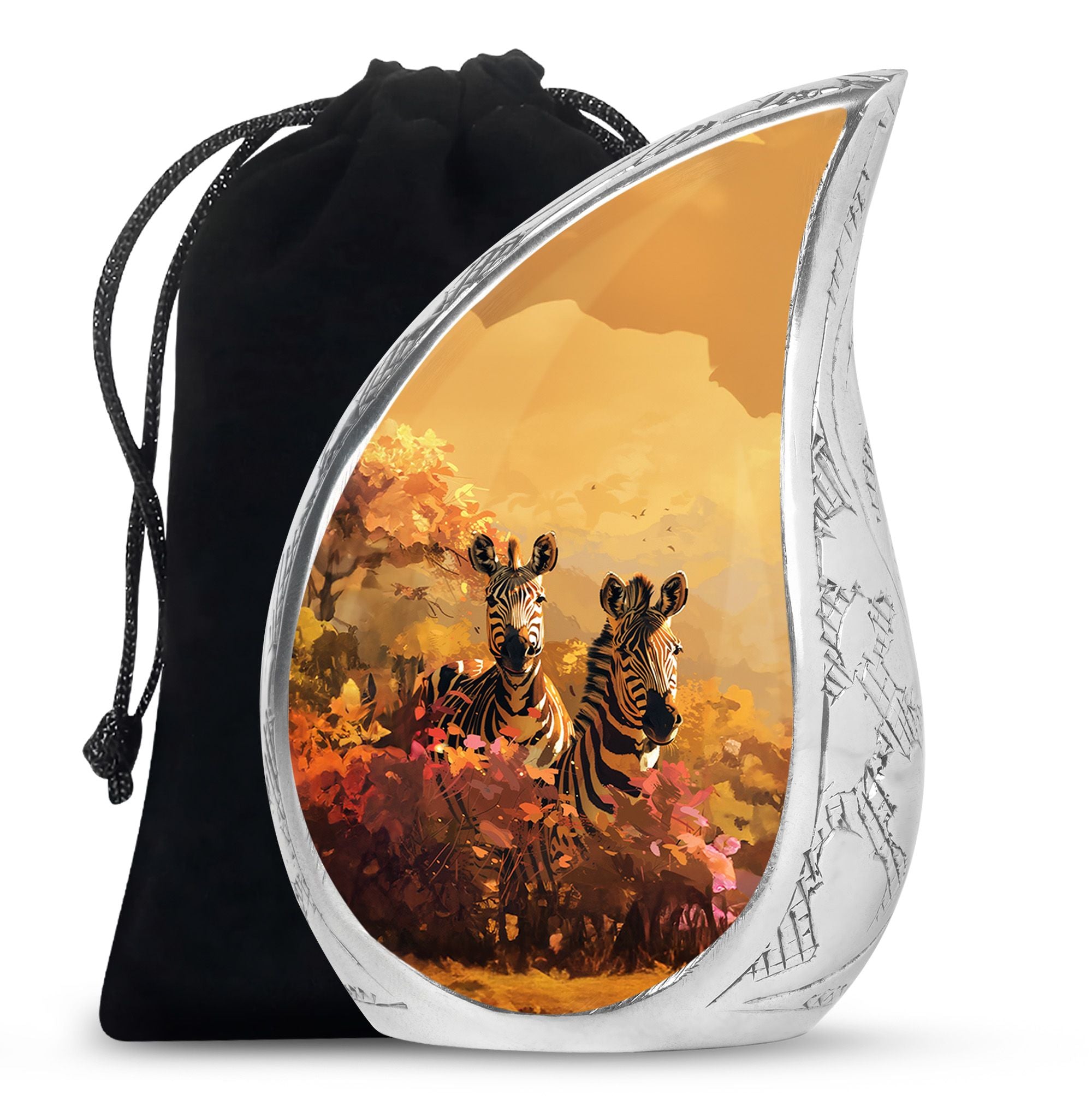 This **cremation urn for human ashes** is **designed with a symbolic zebra motif, representing leadership, individuality, and unwavering love**.