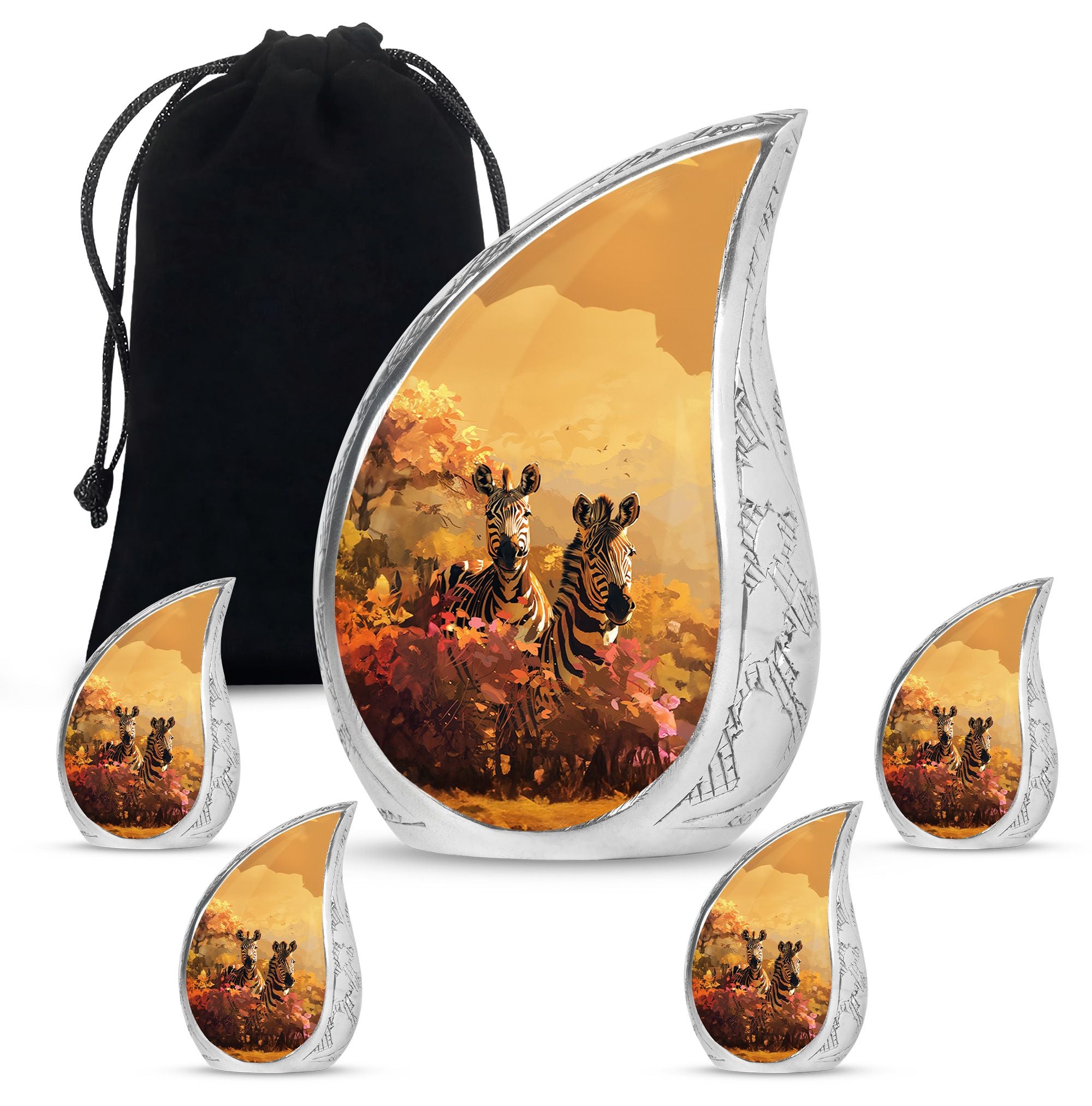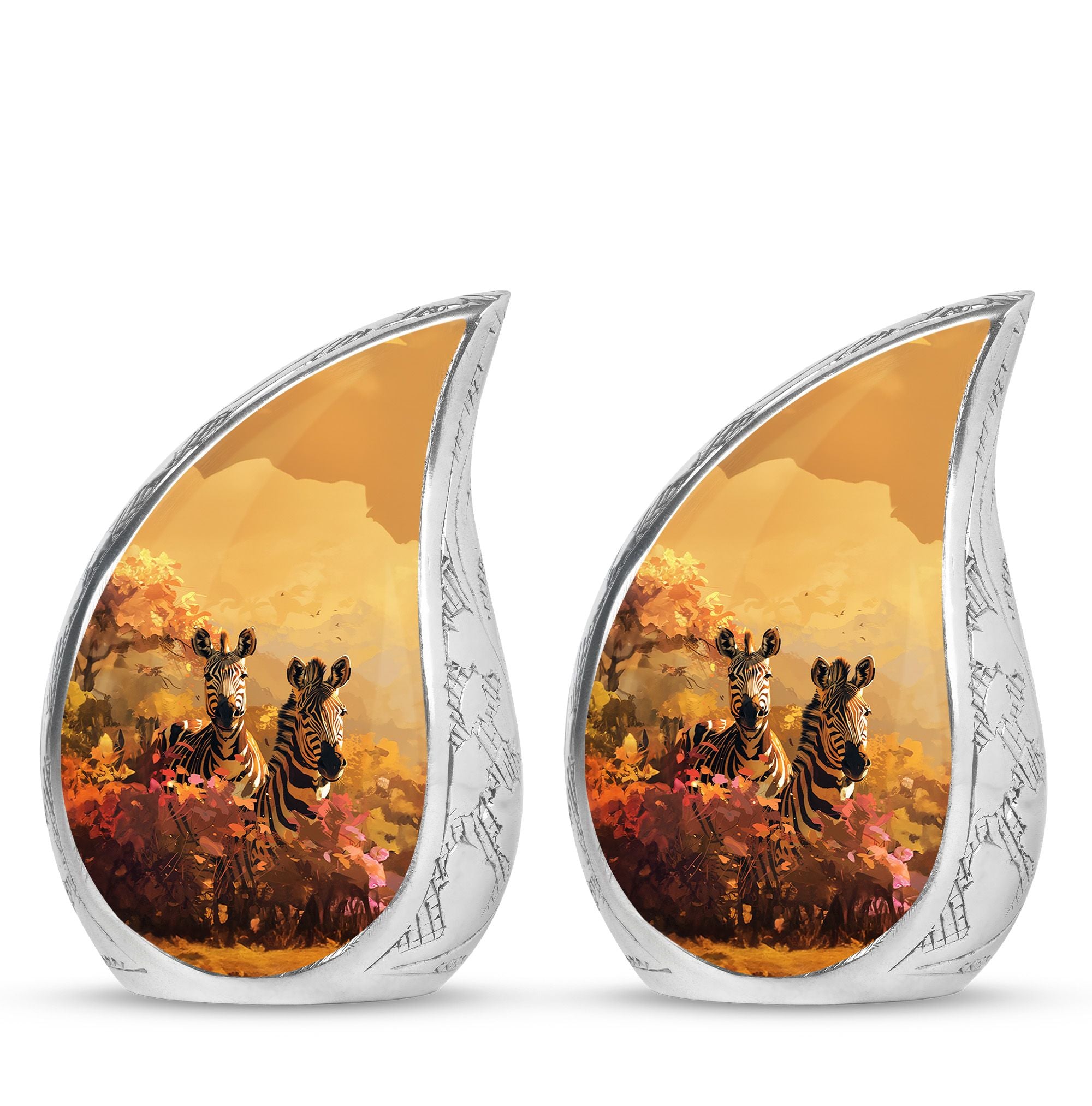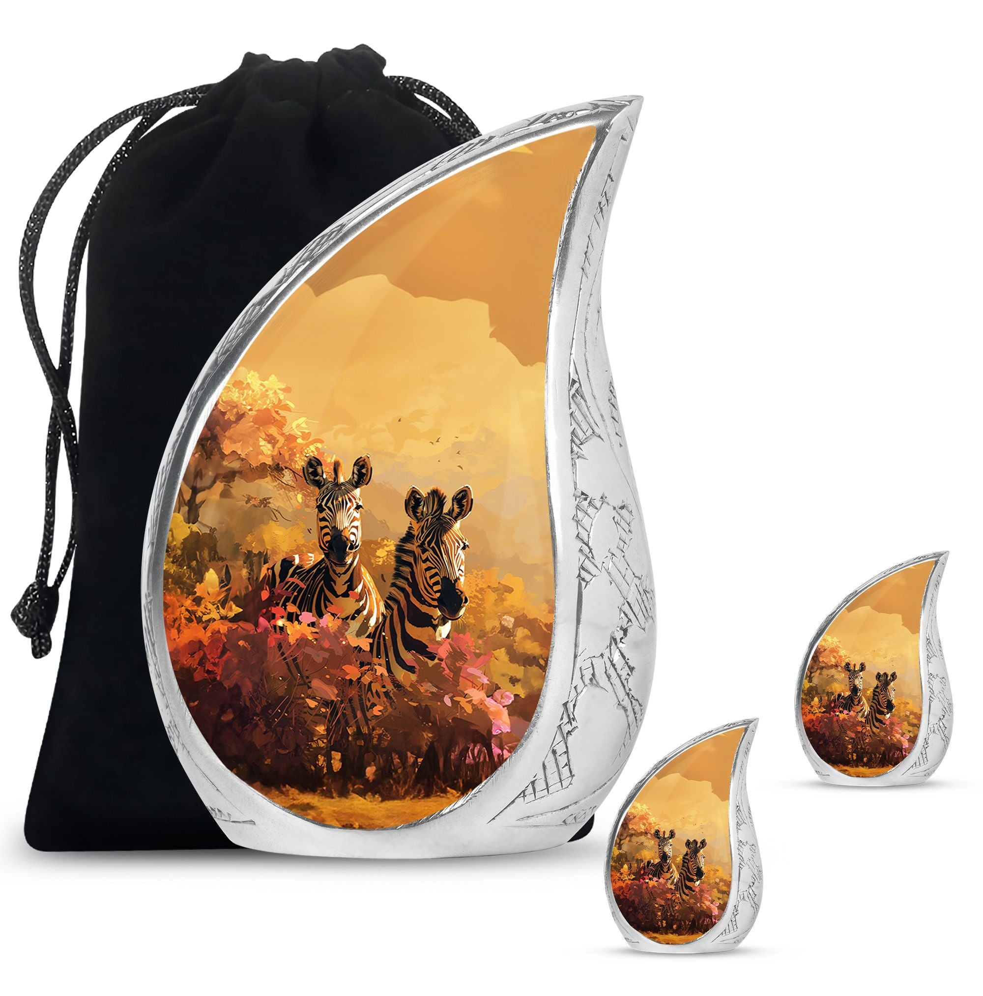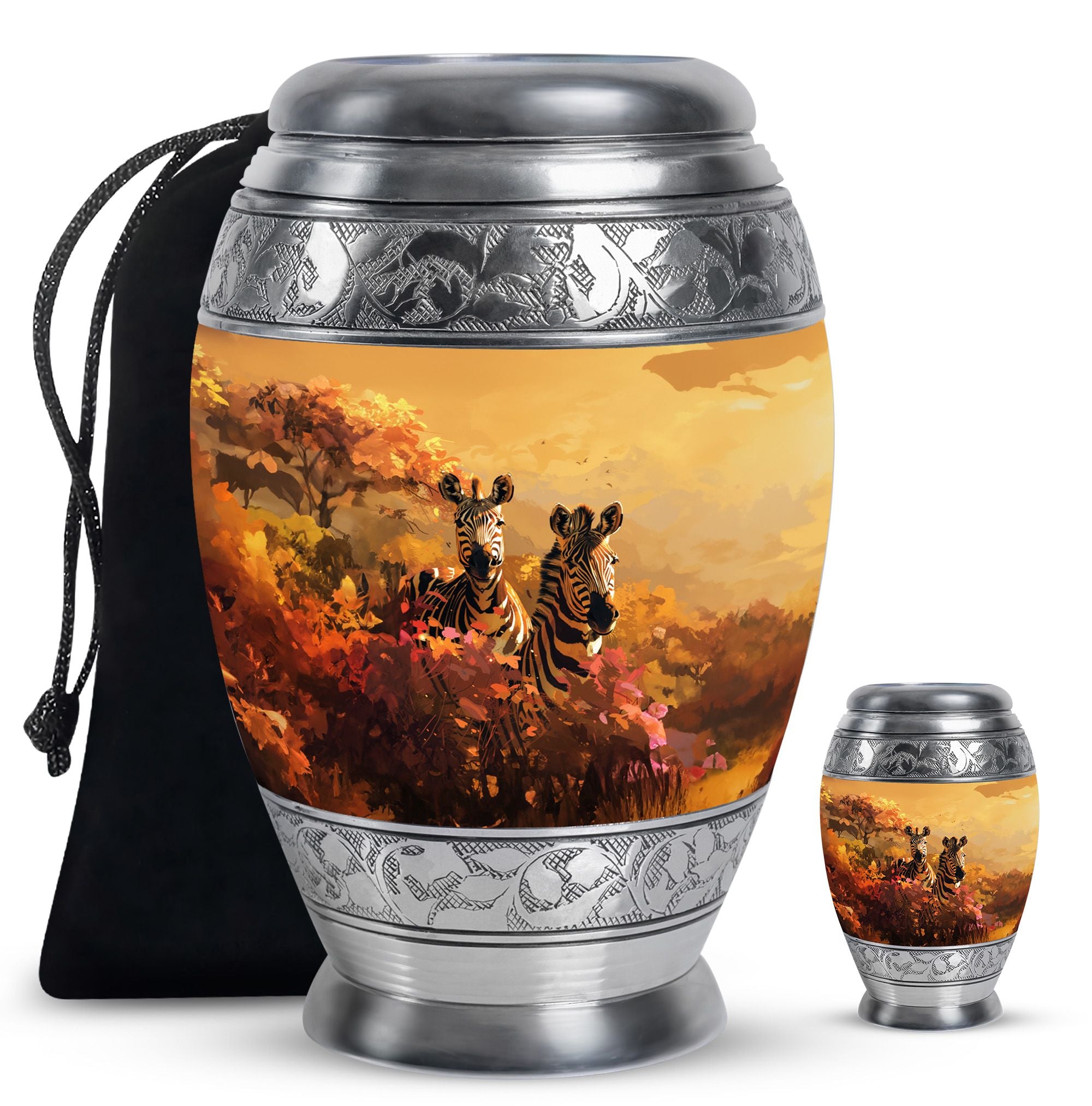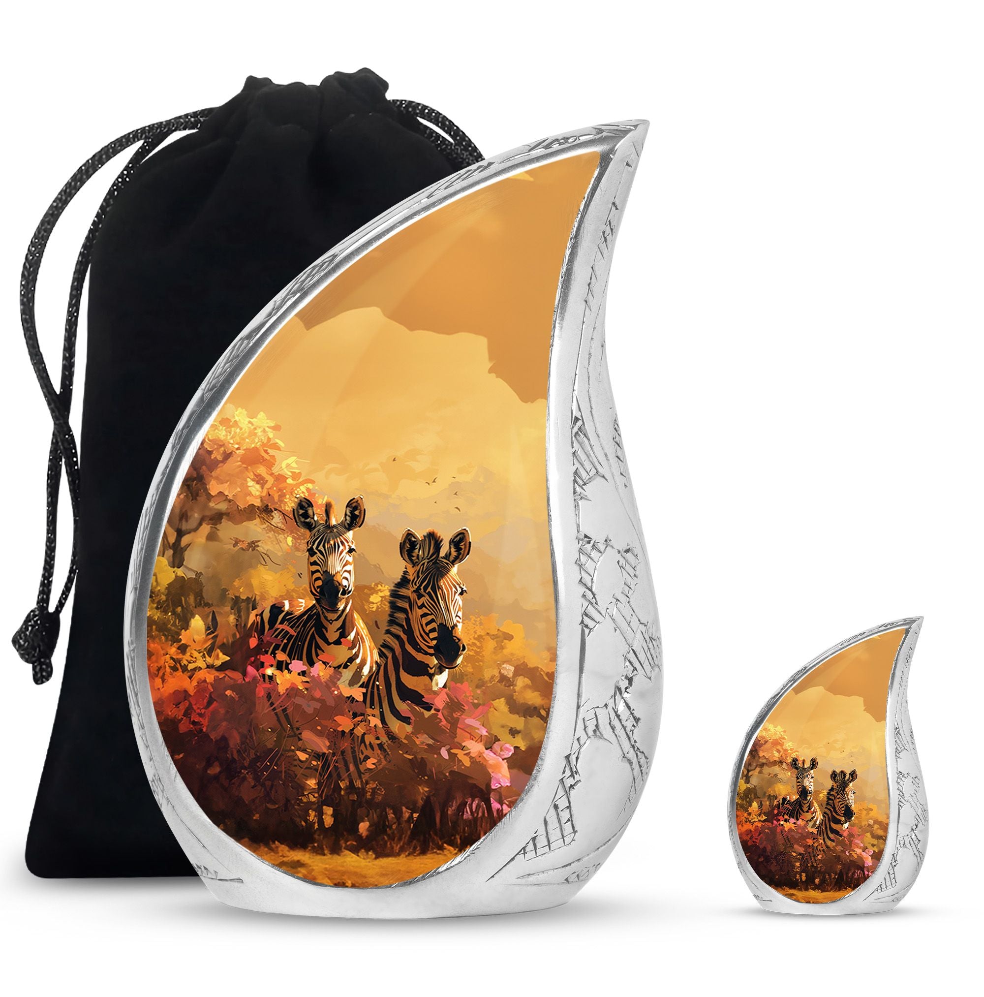 This **cremation urn for human ashes** is **designed with a symbolic zebra motif, representing leadership, individuality, and unwavering love**.