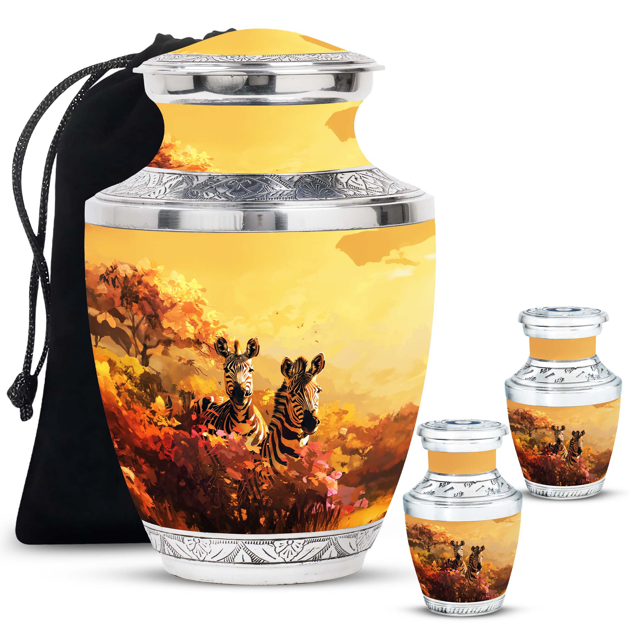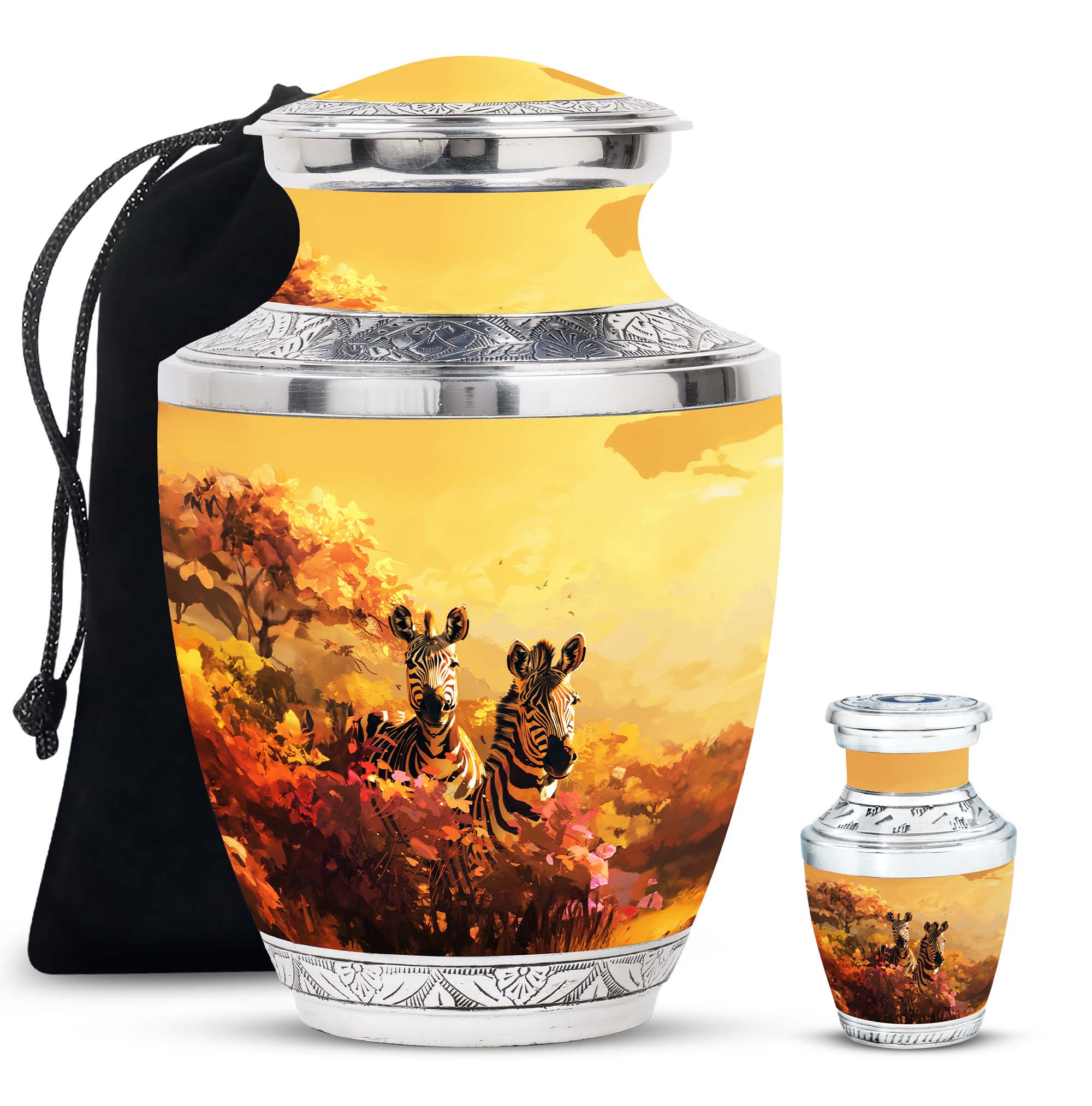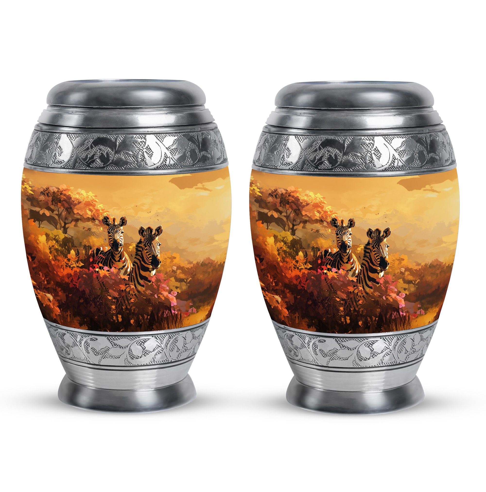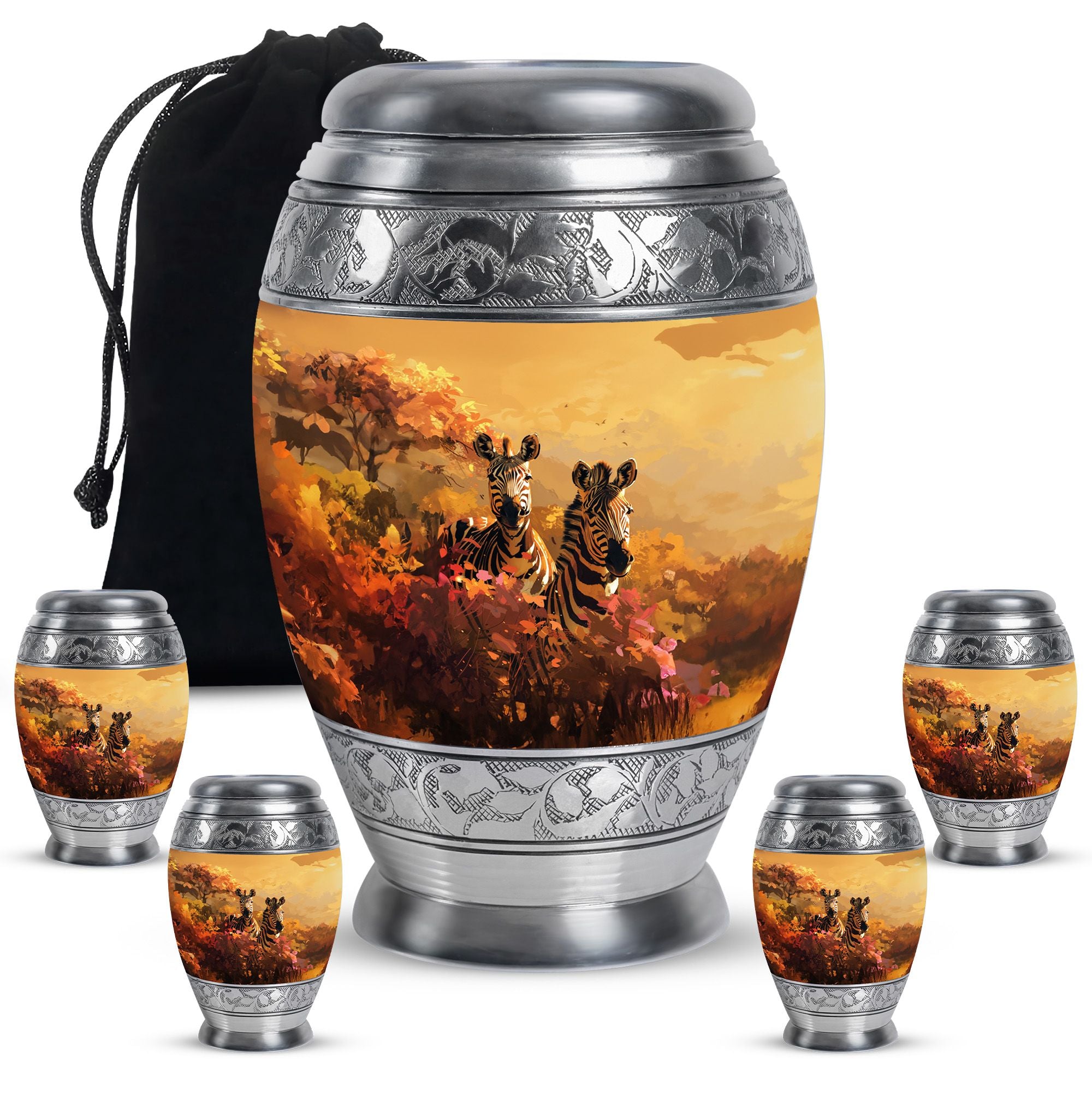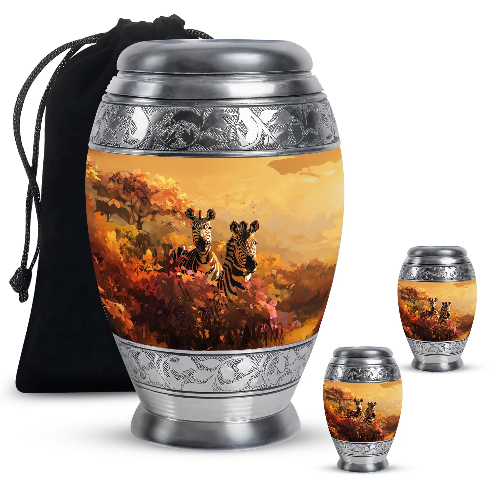This **cremation urn for human ashes** is **designed with a symbolic zebra motif, representing leadership, individuality, and unwavering love**.