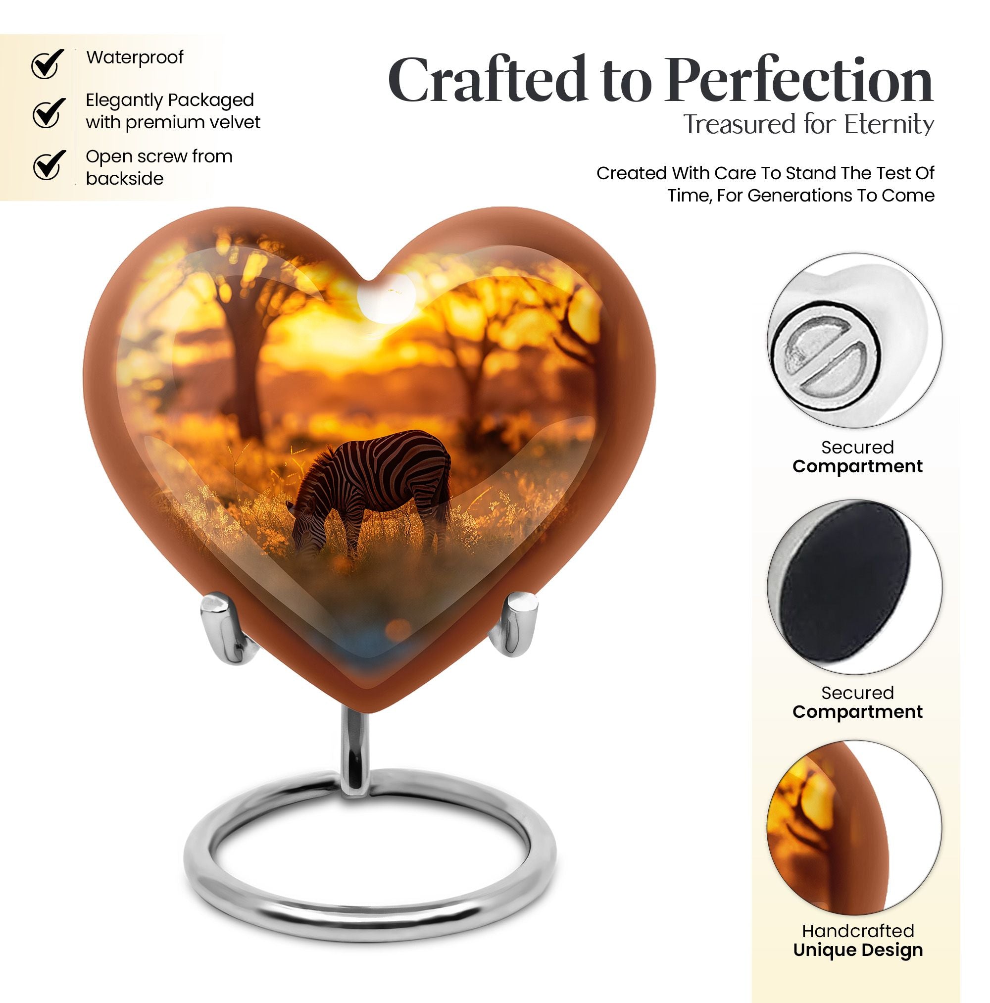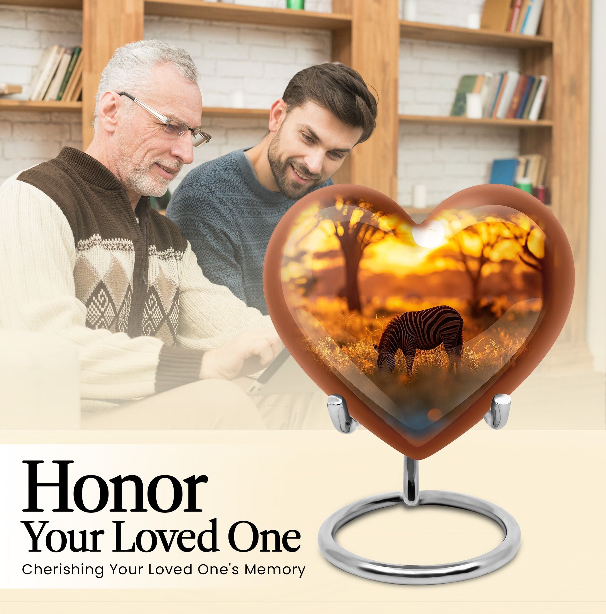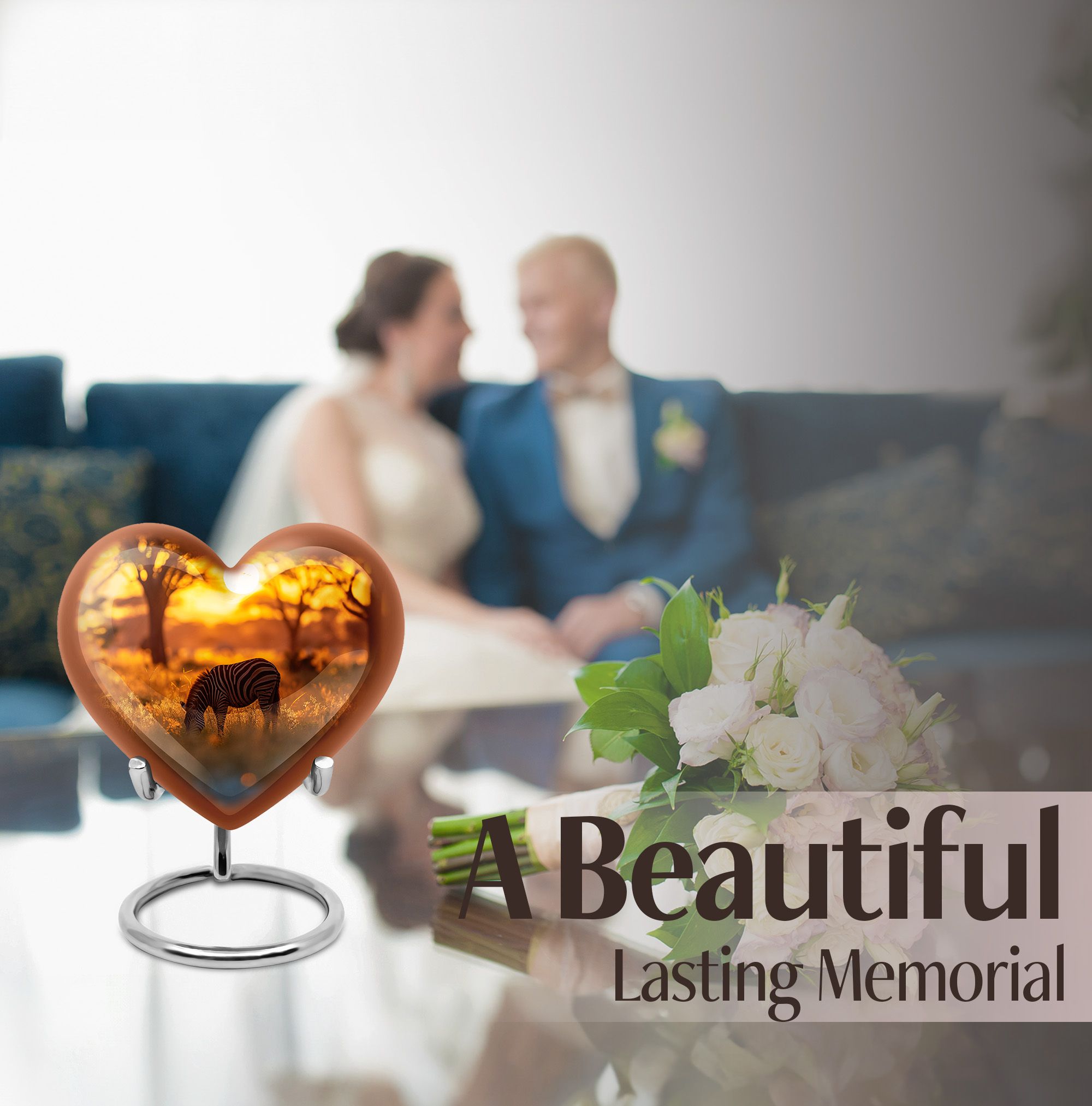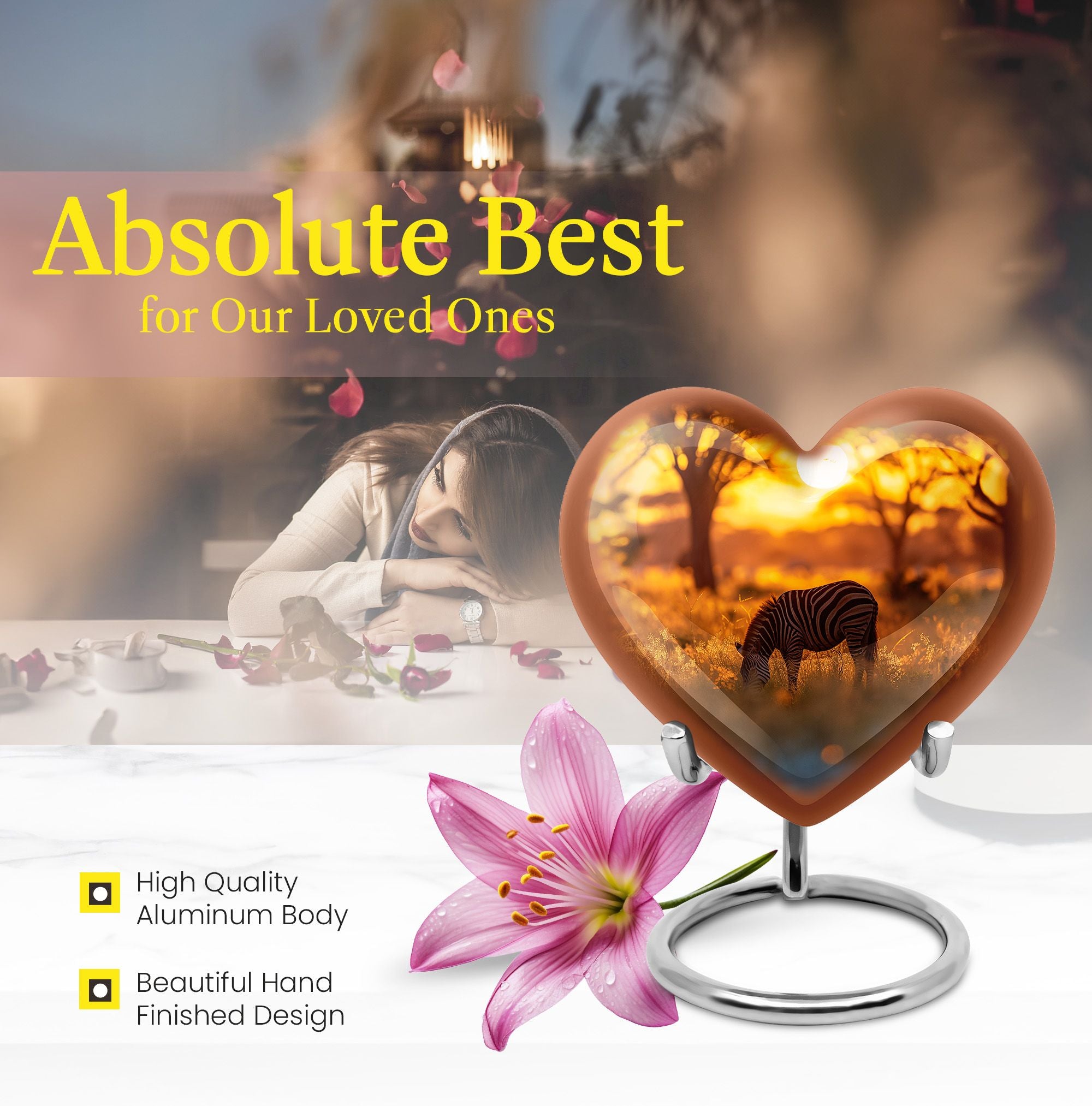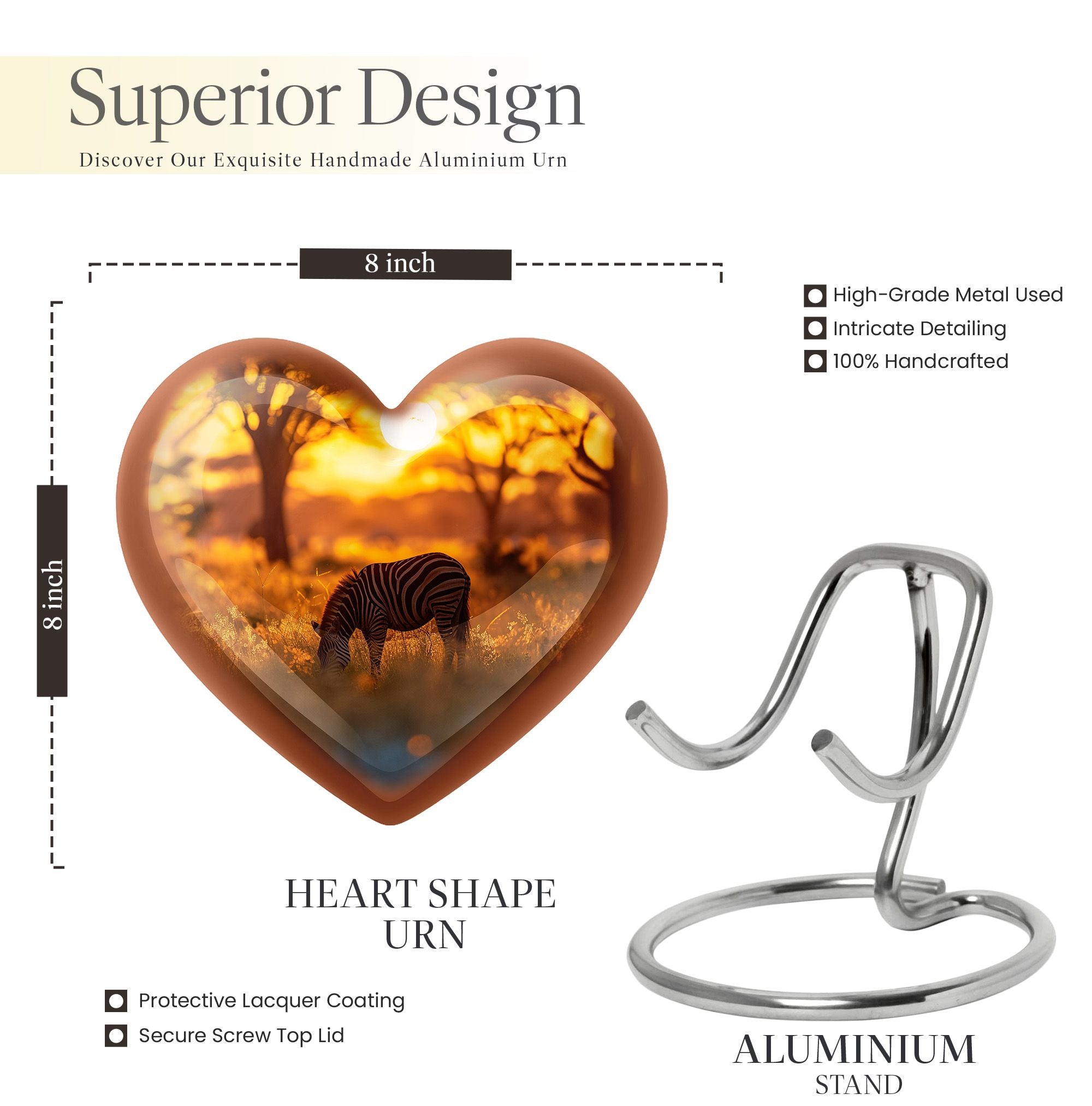 Pay tribute to your beloved and console your heart with our exquisitely crafted, large-sized Heart Urn. Masterly crafted with aluminium, this abstract themed zebra urn weighs a substantial 3.3 pounds and stands tall at 10 inches. Displaying a capacity to contain 200 cubic inches of memorial remnants, this burial, large urn offers solace and fondness in remembrance. The package accompanies a velvet pouch that provides a dignified containment for your cherished one's ashes. Exuding a personalized touch, engraving names on it is an available feature to instil the presence of your loved one. Our urn is an appropriate choice for funeral cremation, serving as a lasting tribute to mother or any other adult. Offering the tranquilizing essence of ceremonial memorial urns, it helps you hold onto those treasured memories. Preserving love and reminiscence, this urn for cremation ashes ensures a dignified rest for your loved one.