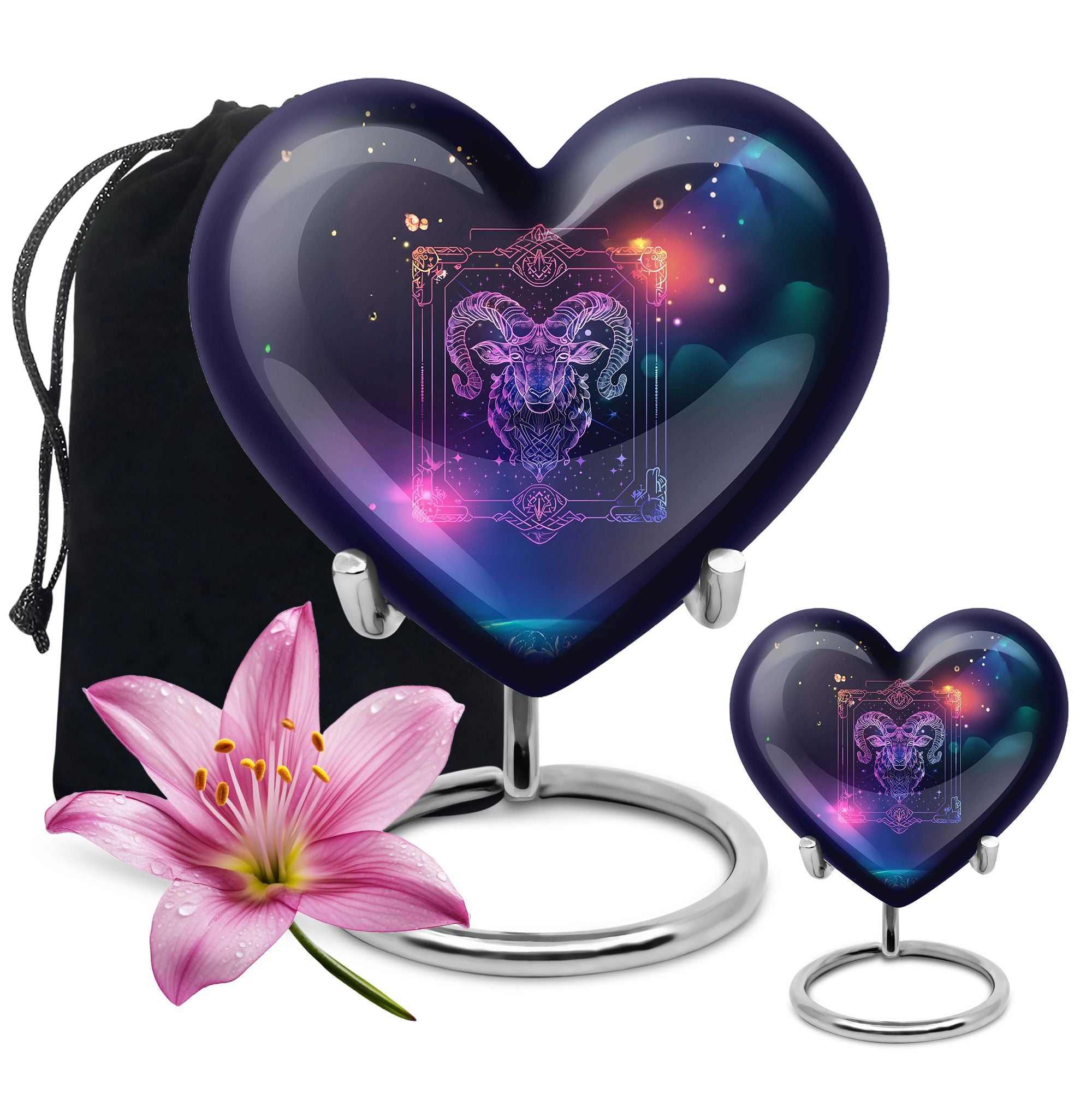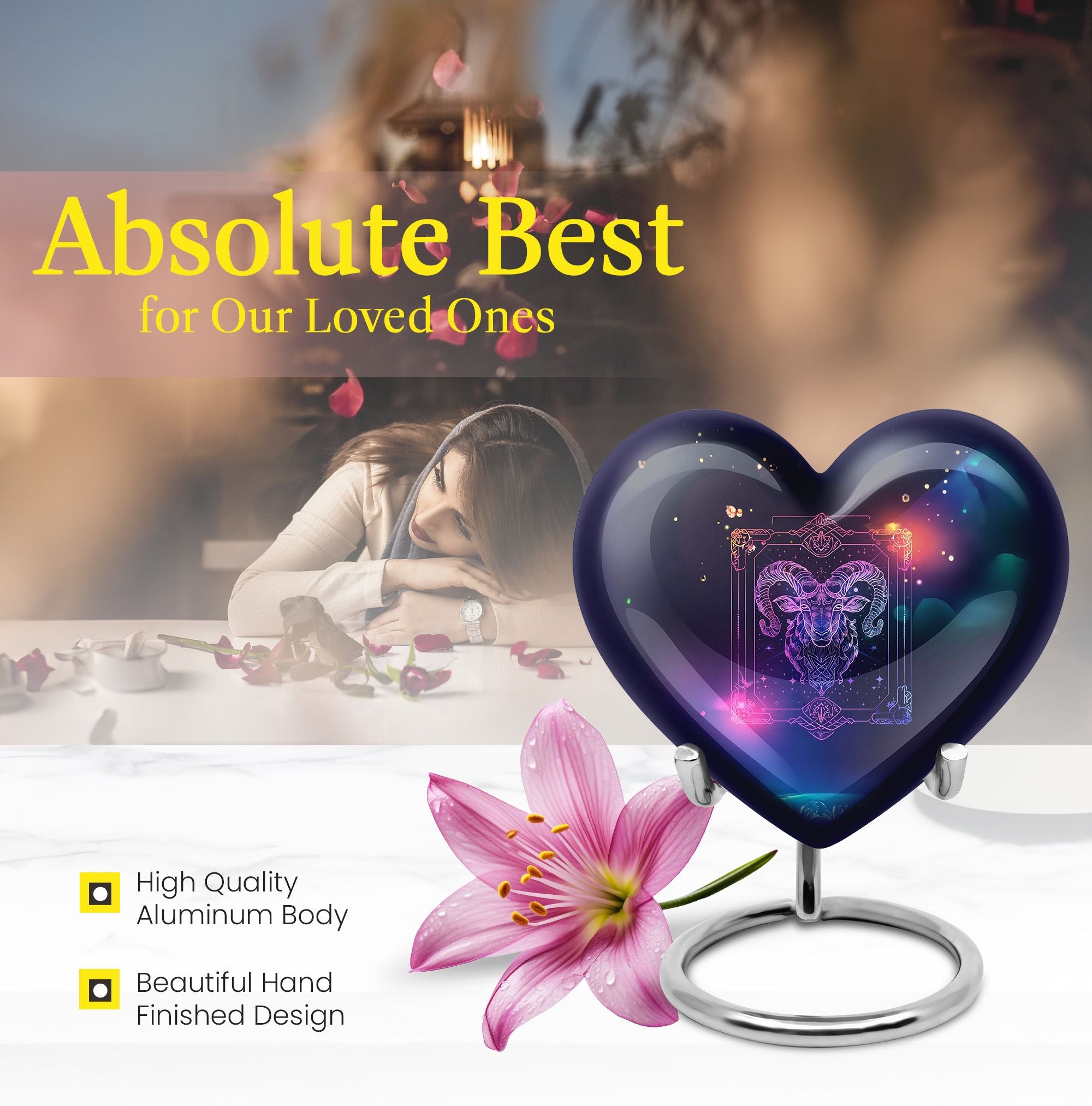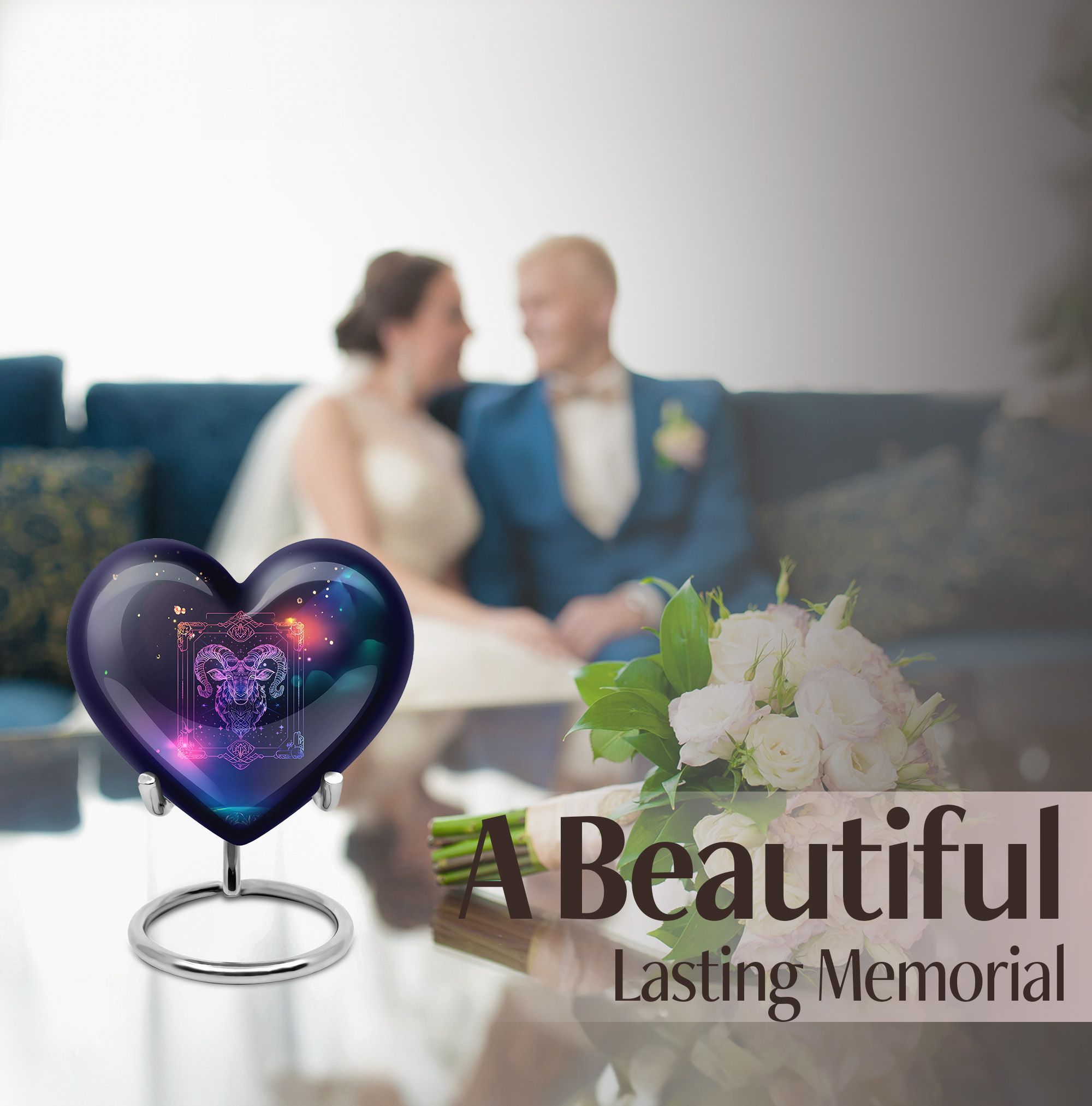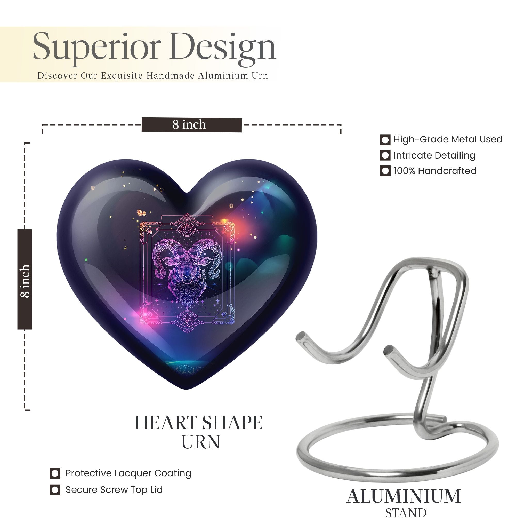 Indulge in the serene beauty of this 10-inch, heart-shaped zodiac urn. Crafted meticulously from high-grade aluminium, this cremation urn is the ideal tribute to your loved one's memory, boasting not only elegant refinement but also remarkable durability. Essential in every memorial ceremony, this 'Large Urn' furnishes a capacity of 200 cubic inches, making it ideal for holding all of an adult's ashes, while its compact dimensions make it an unobtrusive addition to any space. The product also includes a premium velvet pouch for tactful containment of ashes. With a thick weight of 3.3 pounds, you can rest assured in the urn's security and stability. Add a touch more individuality with our customization feature, letting you engrave the departed's name. Straying from the usual, its abstract theme adds an allure, making this cremation urn for ashes a unique yet respectful choice. Perfect as a burial urn or to grace your mantelpiece, our multi-purpose urn with photo frame elevates the conventional to the divine. Honour your dearly departed with this sublime artifact that fuses sentiment, aesthetics, and function.