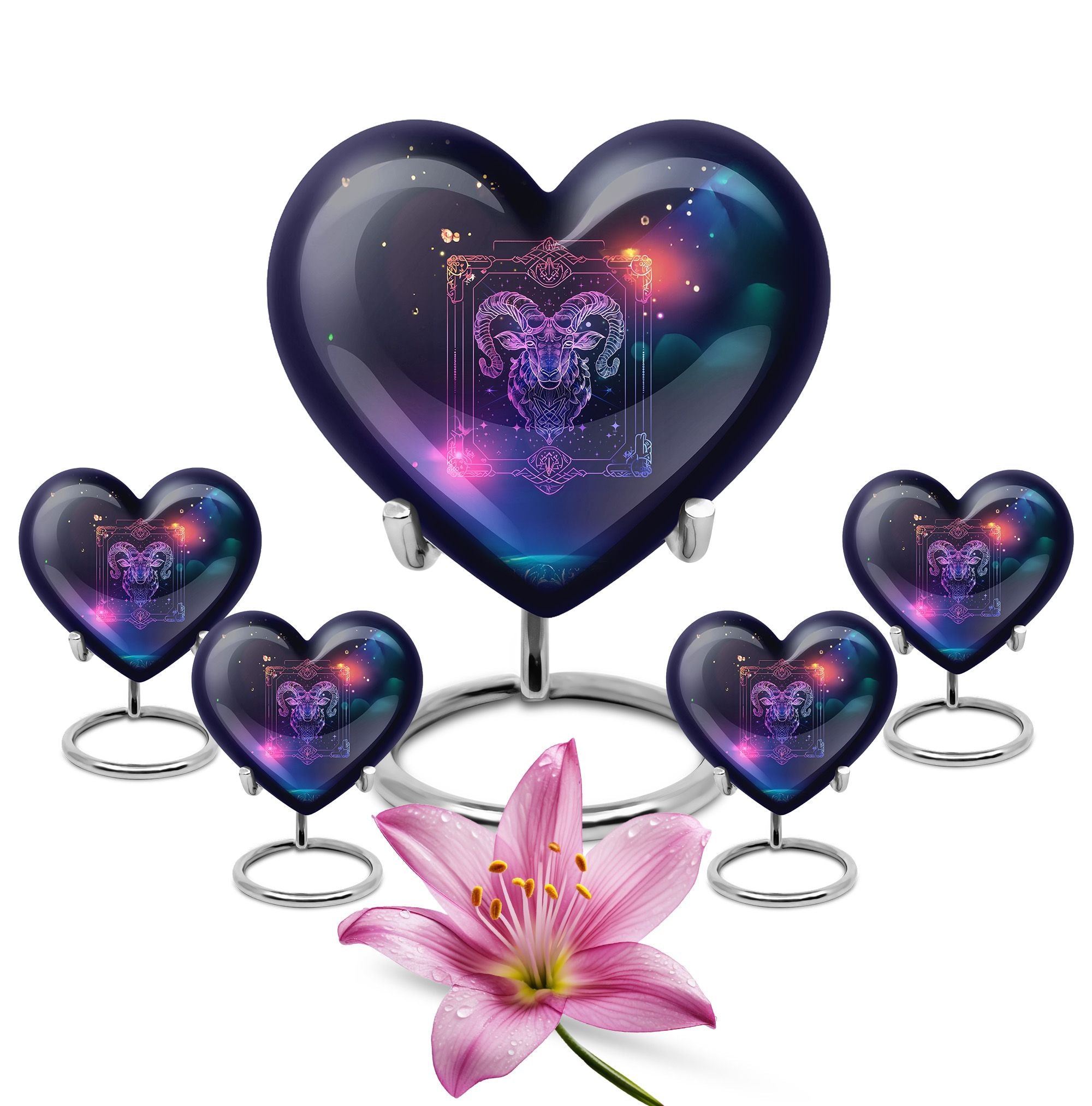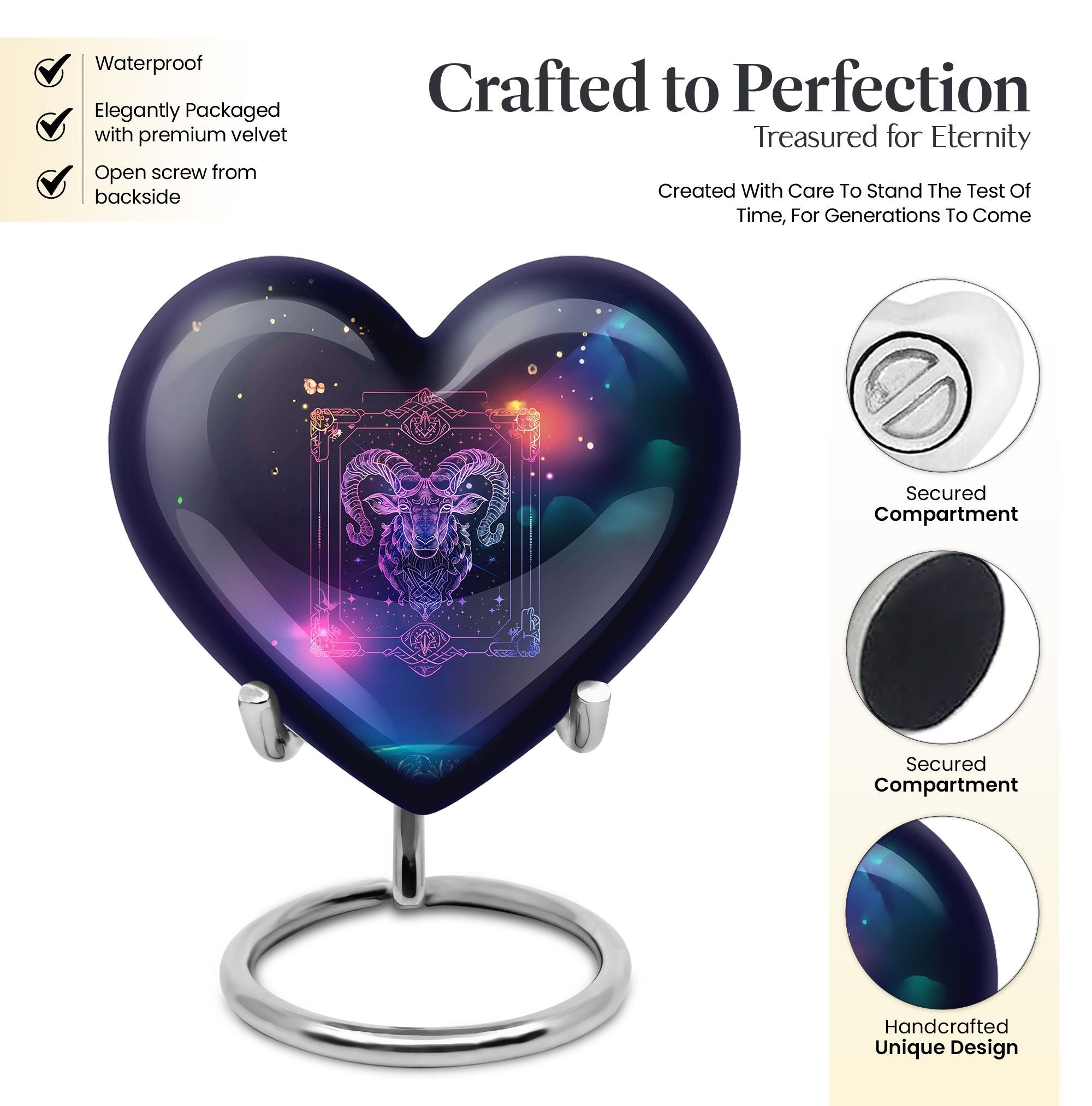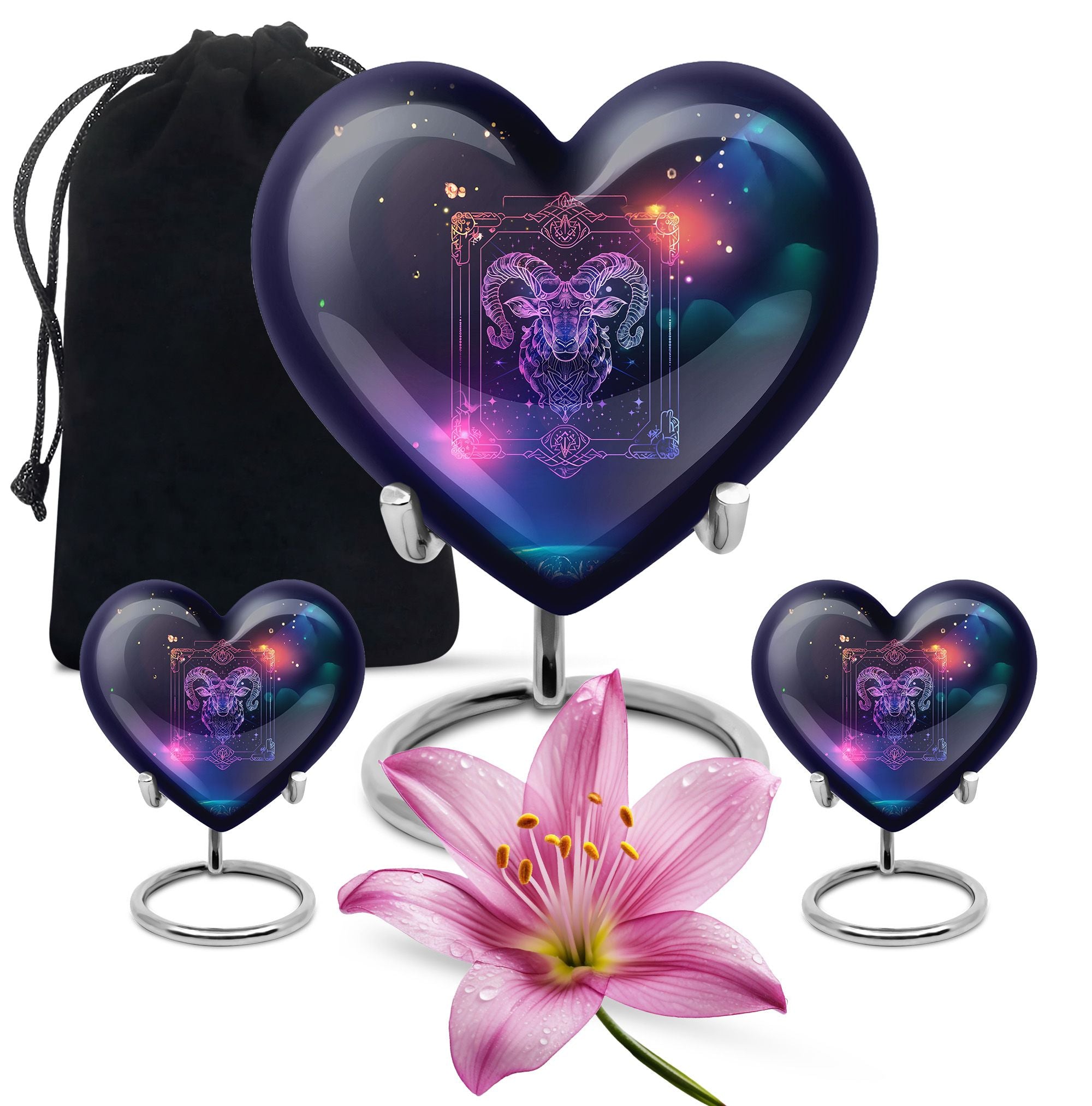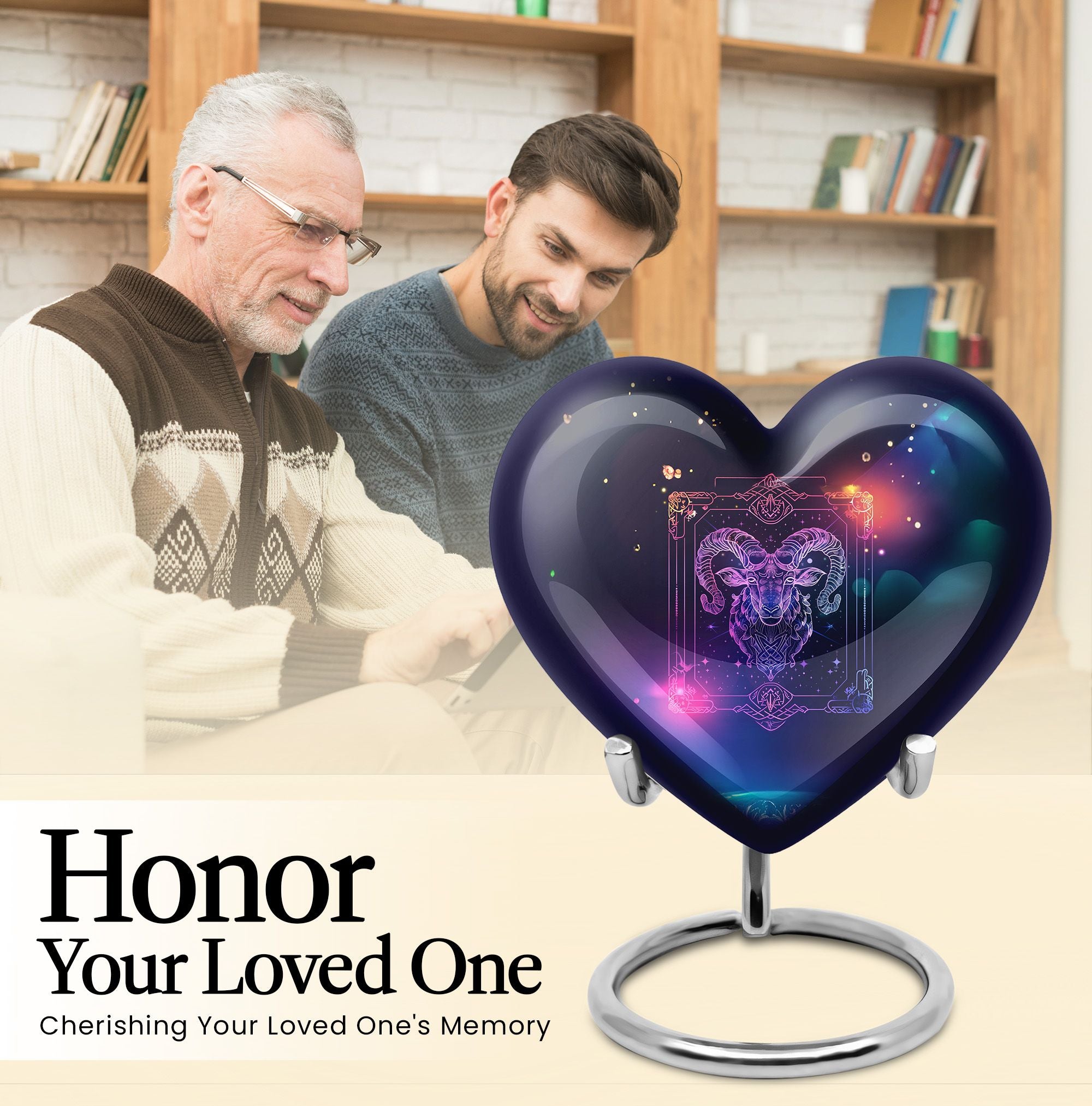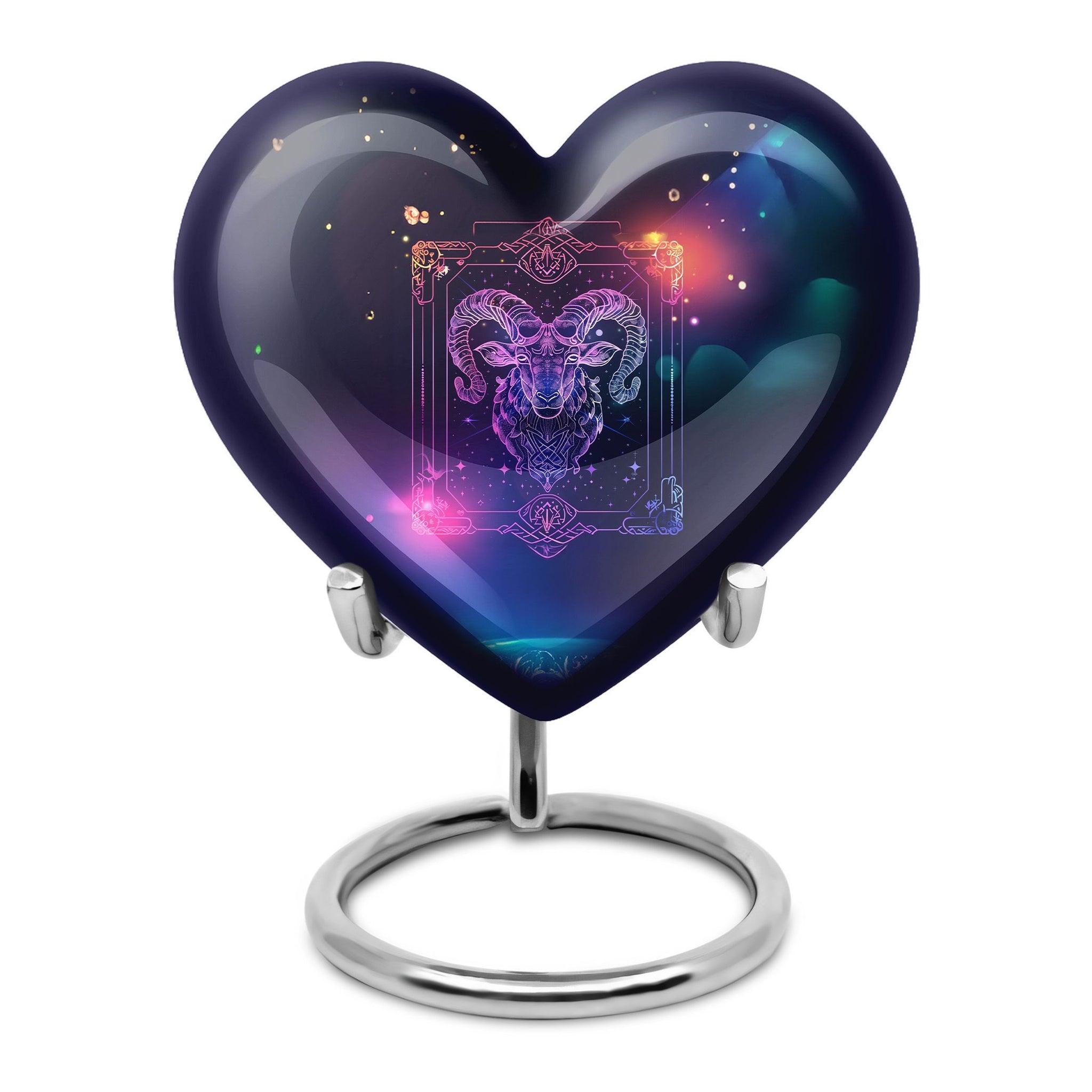 Indulge in the serene beauty of this 10-inch, heart-shaped zodiac urn. Crafted meticulously from high-grade aluminium, this cremation urn is the ideal tribute to your loved one's memory, boasting not only elegant refinement but also remarkable durability. Essential in every memorial ceremony, this 'Large Urn' furnishes a capacity of 200 cubic inches, making it ideal for holding all of an adult's ashes, while its compact dimensions make it an unobtrusive addition to any space. The product also includes a premium velvet pouch for tactful containment of ashes. With a thick weight of 3.3 pounds, you can rest assured in the urn's security and stability. Add a touch more individuality with our customization feature, letting you engrave the departed's name. Straying from the usual, its abstract theme adds an allure, making this cremation urn for ashes a unique yet respectful choice. Perfect as a burial urn or to grace your mantelpiece, our multi-purpose urn with photo frame elevates the conventional to the divine. Honour your dearly departed with this sublime artifact that fuses sentiment, aesthetics, and function.
