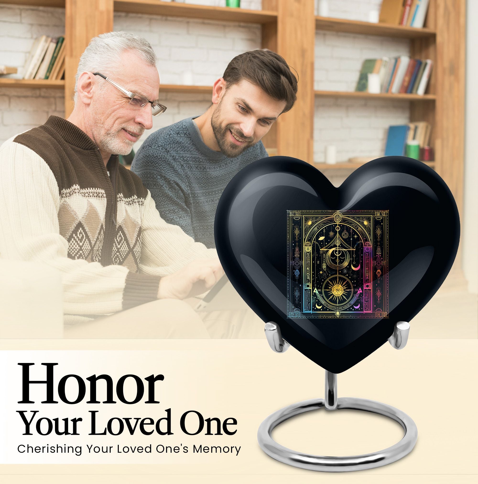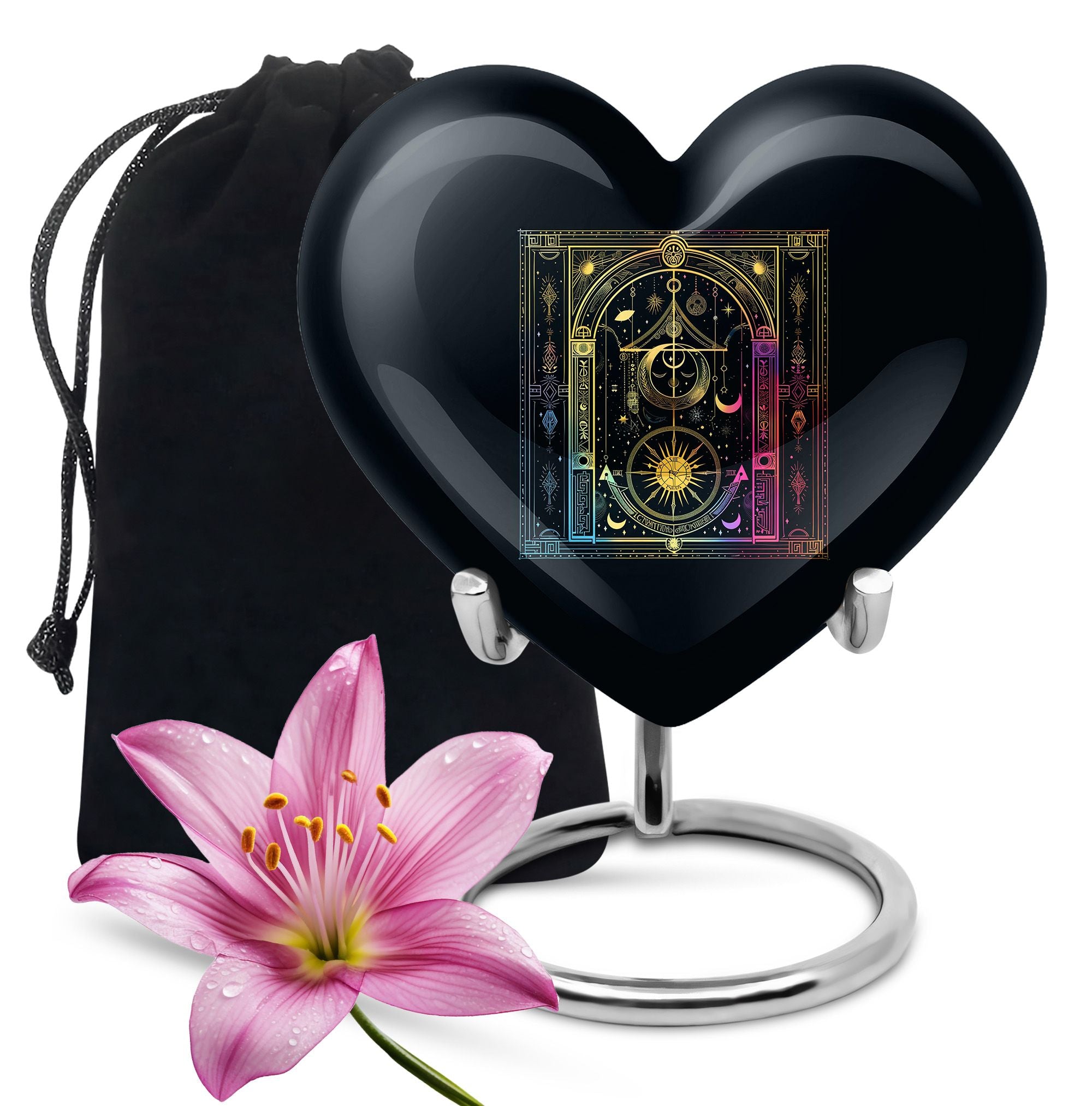 Our Zodiac Urn is a touching tribute, uniquely suited to honour the memory of your loved one. Crafted from high-quality Aluminium, this Large Urn weighs a substantial 3.3 pounds and stands 10 inches in height giving it the ability to house 200 cubic inches of ashes. Its sophisticated abstract theme and Heart Urn design evoke a sense of serenity and reverence. The customization option allows you to personalize the urn with engraved names, adding an intimate touch to the memorial. The urn comes with a velvet pouch for a dignified containment of ashes. This funeral decorative urn is suitable for both men and women, a classy yet poignant reminder of your dear one. Whether you're searching for 'memorial urns for human ashes adult female' or 'urns for cremation ashes mother' or 'urn human adult male', this 10inch Zodiac Urn will stand as an elegant symbol of cherished memories. Ideal for those mapping their faith and spirituality onto the celestial sphere.