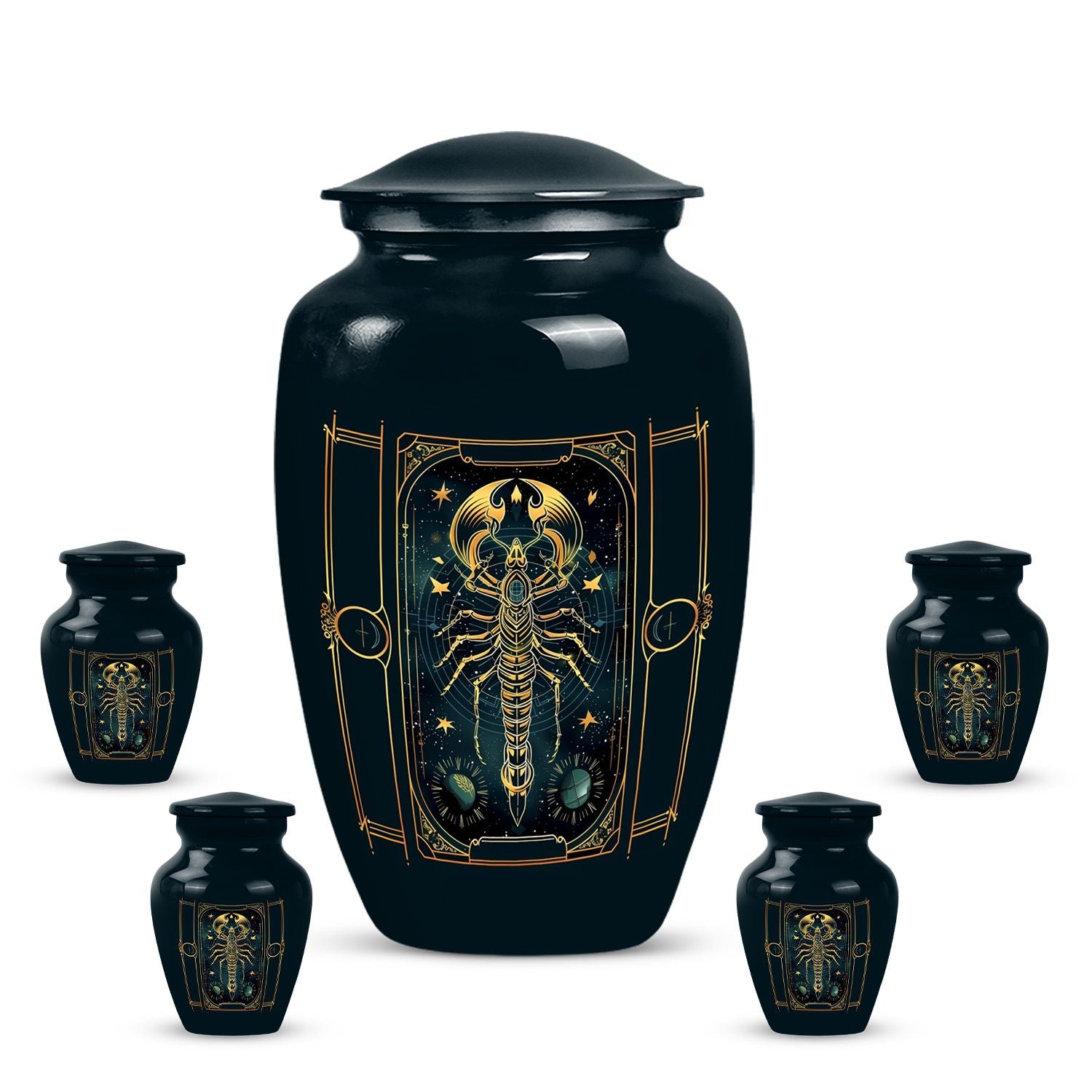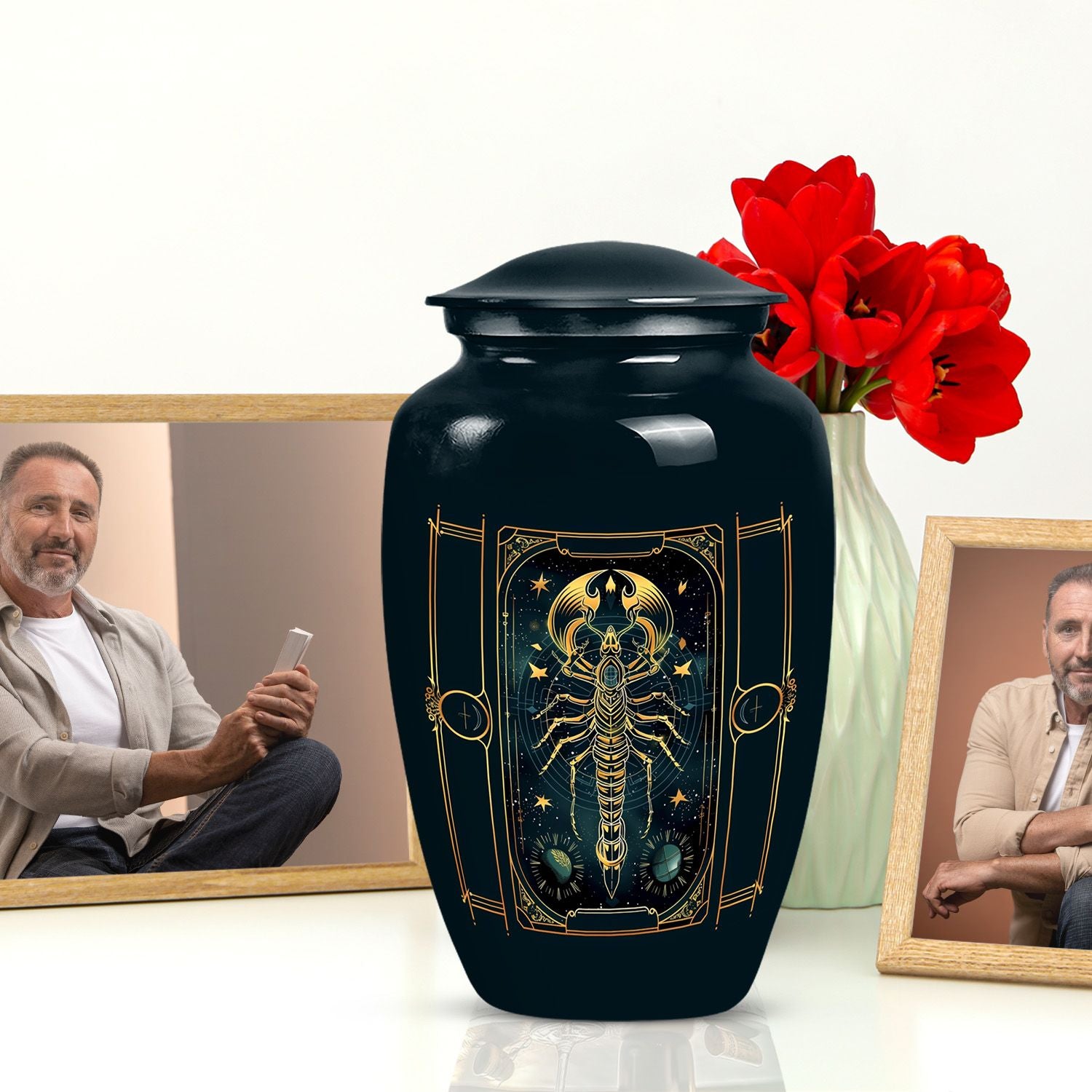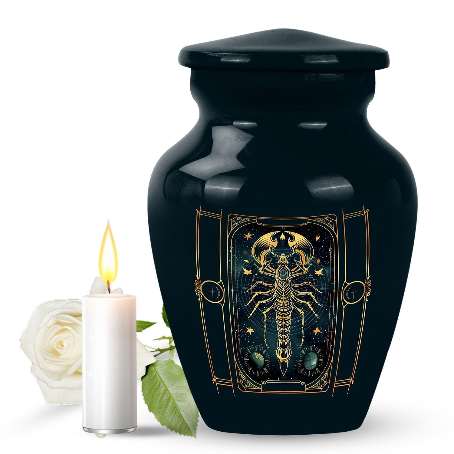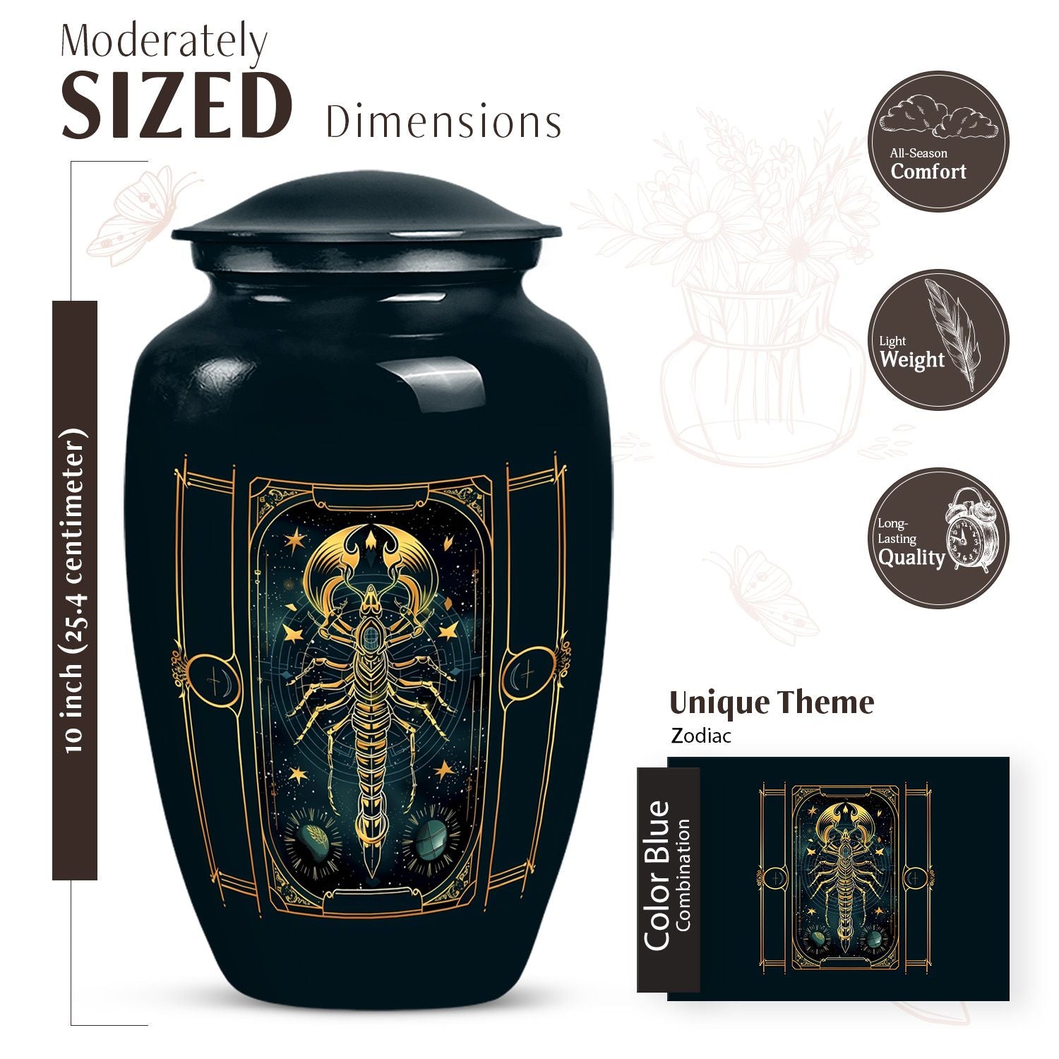 Honor the memory of your loved ones with our exquisite Zodiac Urn. Crafted from high-quality aluminium, this large-scale urn can hold up to 200 cubic inches of ashes, perfect for memorializing a beloved adult female. Resilient and subtly beautiful with an abstract theme, it bridges the gap between aesthetics and durability. The urn stands 10 inches tall, striking an imposing figure. Weighing in at just 3.3 pounds, its lightness is a testament to expert craftsmanship. The urn comes complete with a velvet pouch for the respectful containment and preservation of ashes. Extend the personal touch by customizing the urn with engraved names, making this not just a container for ashes but a personalized memento of the departed. Perfectly suited for cremation rites, this urn serves as a timely and timeless addition to any memorial ceremony supplies wish-list. Remember, this isn't just an urn - it's a lifelong keepsake.