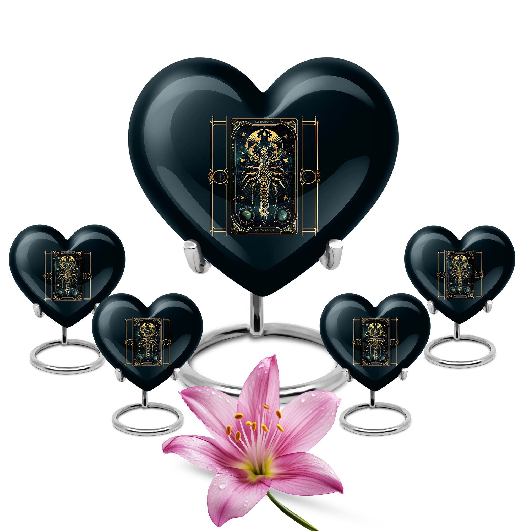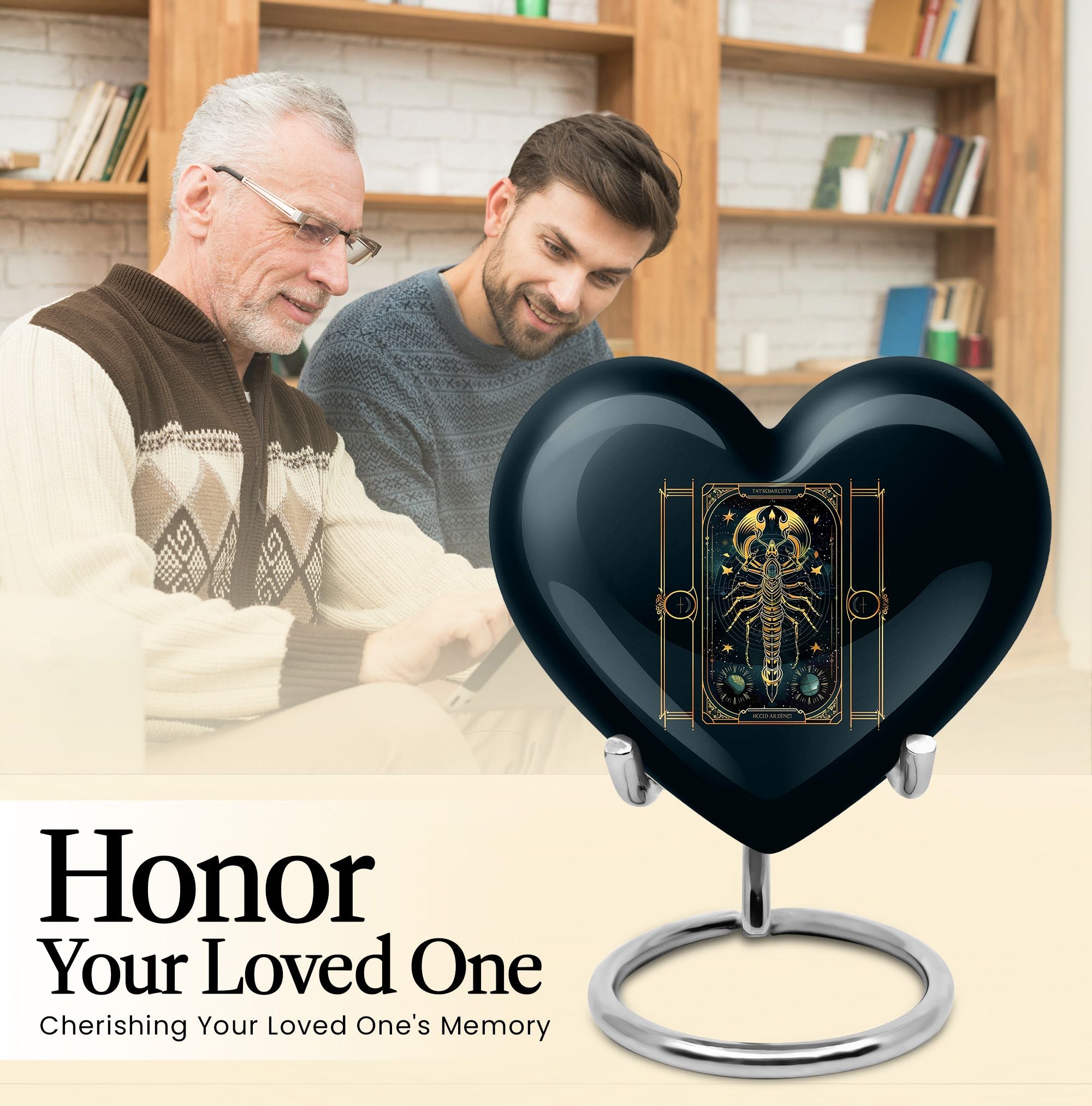 Experience the solace of paying tribute to your departed loved ones with our abstract-themed Zodiac Urn. Standing at a grand scale of 10 inches, this large urn is a serene yet stylish shrine to honor our adult female beings who've crossed over to the ethereal plane. Additionally, this cremation urn with a weight of 3.3 pounds and a magnitude of 200 cubic inches is fashioned to hold ashes securely, symbolizing an everlasting bond. This memorial urn composed of authentic Aluminium is durably constructed while showcasing an exquisite heart-shaped design. Delve into a meaningful memento by personalizing it with engraved names, adding a unique sentimentality to the grieving process. Each purchase comes with a velvet pouch designed for containment of ashes enhancing mobility, offering a soft embrace in your time of need. Ideal for those in search of cremation medium urns for human ashes, funeral cremation urns, or unique shape boxes for gifts. Honor the life of your loved one with our premium Zodiac Urn.