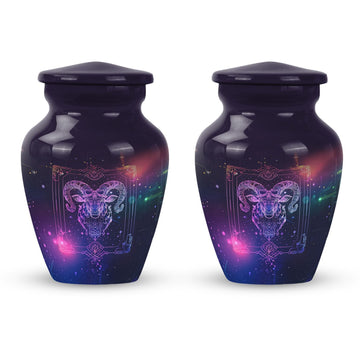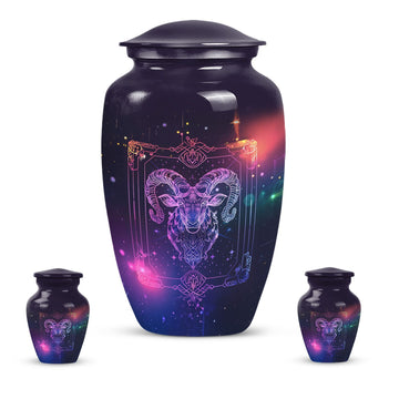 Experience the elegance and spirituality of this 10-inch zodiac urn, a remarkable piece of memorial ceremony supplies that artfully mates tradition with style. Crafted from durable aluminium, this large urn embodies an abstract theme, thus allowing it to serve as a sophisticated, symbolic tribute. Internally commodious, it offers a generous capacity of 200 cubic inches for cremation ashes and is delivered to you with a velvet pouch for secure containment. Apart from weighing a modest 3.3 pounds, its dimensions smartly fix at a height of 10 inches. More so, the distinctiveness is further amplified with the option to personalize with engraved names, expressing remembrance in a unique manner. This cremation urn reflects a blend of exquisite workmanship and compassionate intent, mainstreaming it as a multipurpose urn with a twist. This burial urn not just secures the ashes, but also peace for the dear departed. Please note that despite being known as a cremation urn for adult ashes, it is equally appropriate for anyone, transcending the confines of age and gender. A timeless classic, it graces every memorial event with dignity and reverence.