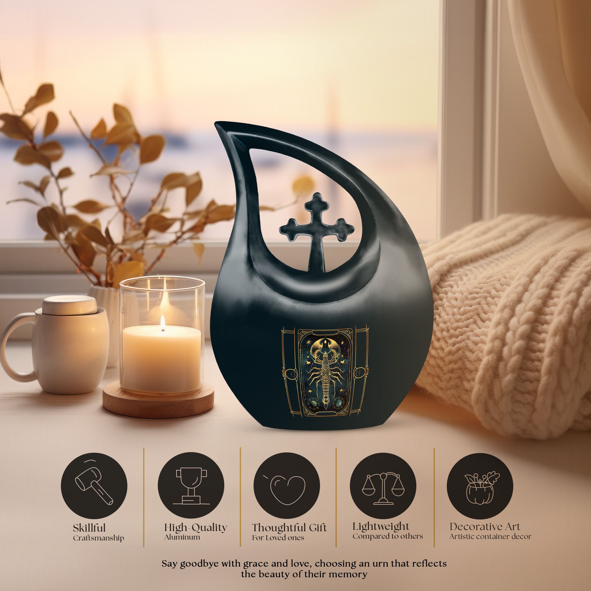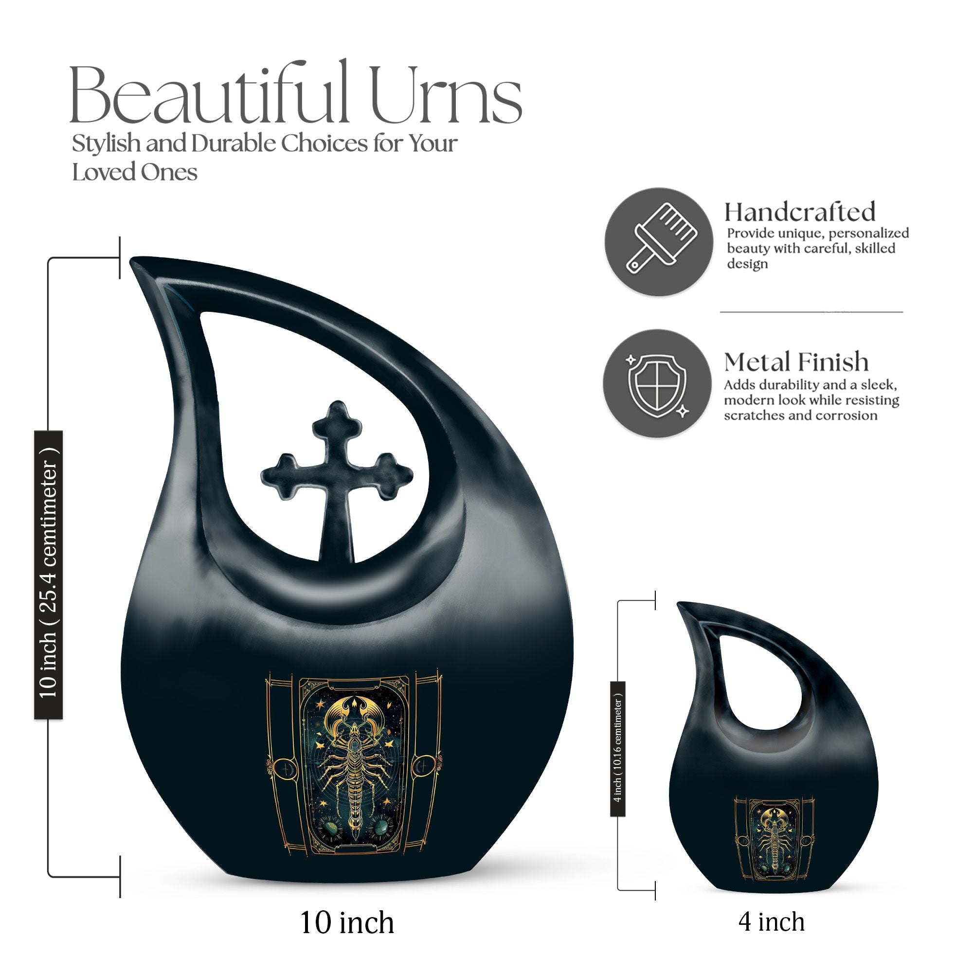Cherish the memory of a loved one with our exquisite 10-inch Zodiac Urn. This profound Memorial Urn for Ashes showcases a sublime Cross Drop theme that glows against its Aluminium build. Impressively robust at 3.3 pounds, every inch of this large urn is purposefully built for endurance. Its sizable 200 cubic inches of holding capacity makes this one of the more spacious memorial urns available. Customization is offered to add a personal touch with engraved names. Each urn comes with a soft velvet pouch, ensuring secure containment of the ashes. Traditional yet intricate, our 10-inch Zodiac Urn assures you a reverent and personal memorial. Highly searchable under key phrases like 'Urns For Ashes For Adults', 'Cheap Cremation Urns', 'Urns For Sale', and 'Small Urns For Ashes', this urn will fit your earnest search for a befitting resting place for your loved one.