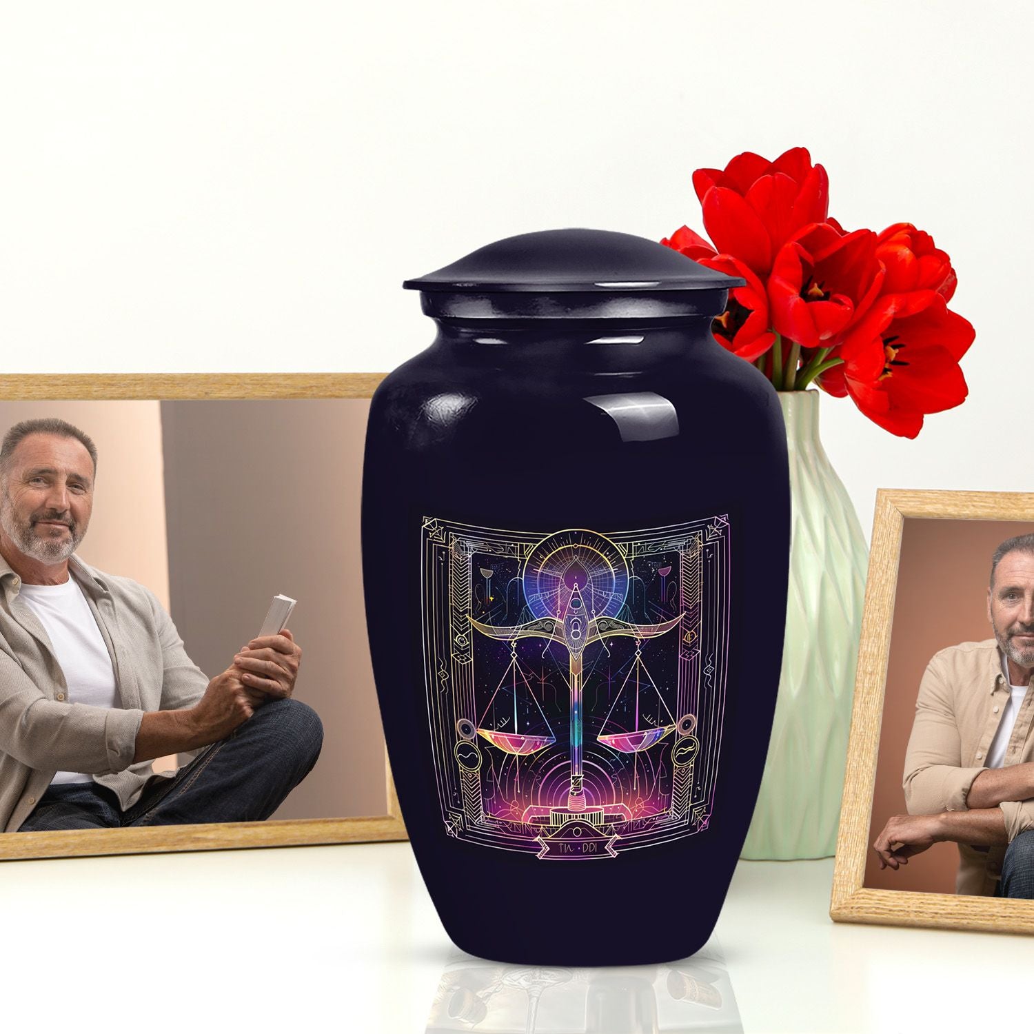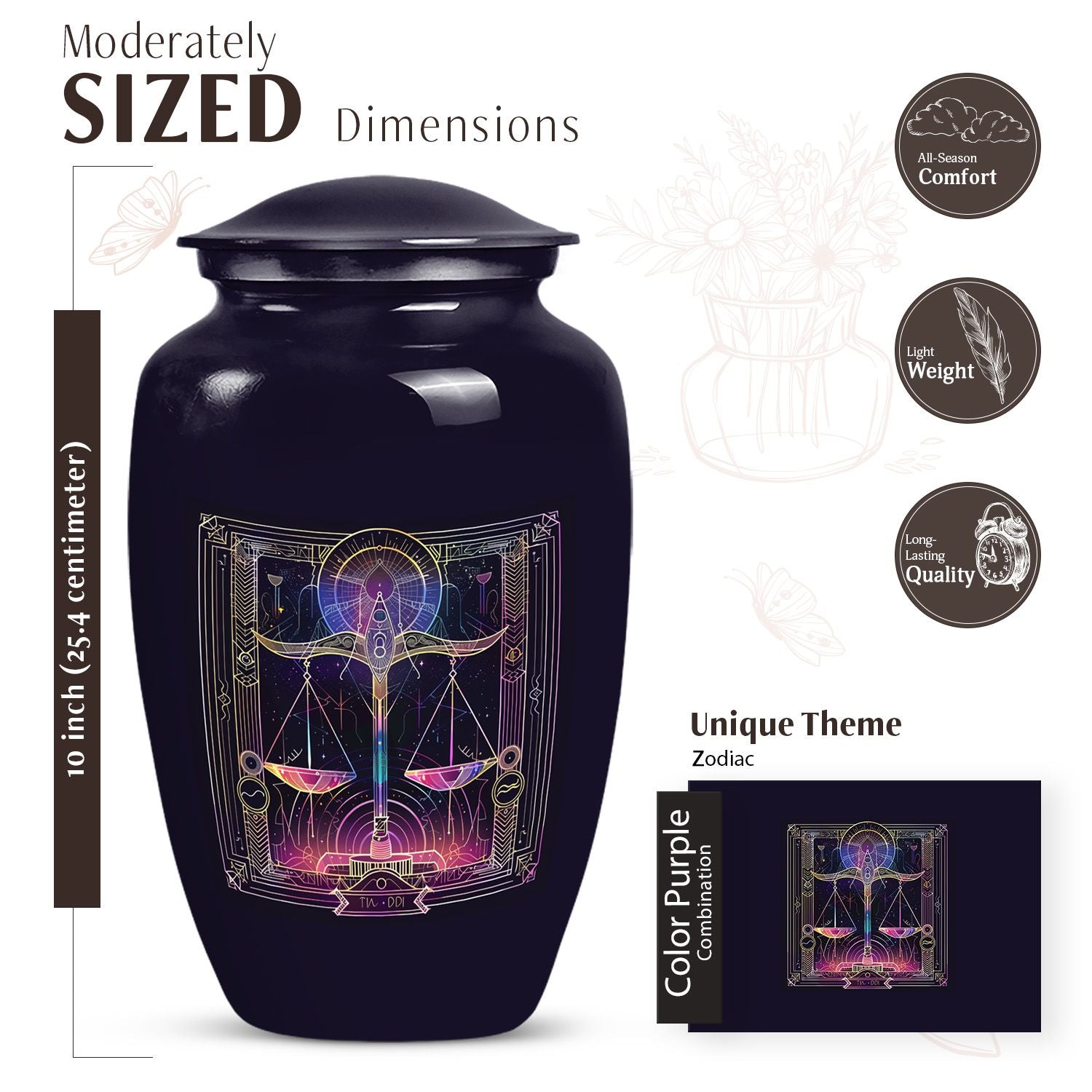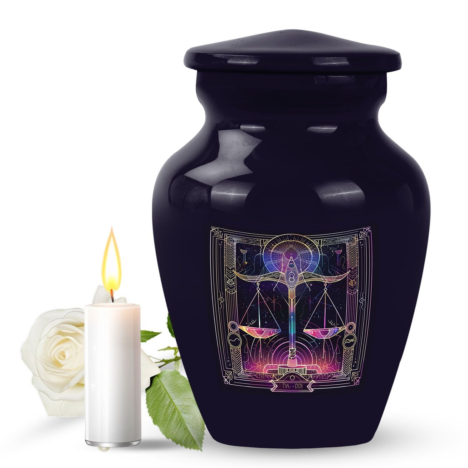 Immerse yourself in the celestial charm of our Zodiac Urn. Its abstract theme beautifully communicates an enduring connection with loved ones. This large Urn, handcrafted from premium aluminium, stands 10 inches in height. Its substantial weight, about 3.3 pounds, attests to its robust and enduring quality. The 200-cubic-inches capacity securely holds human ash remains, making it a poignant choice as cremation medium urns for human ashes. Personalize it with engraved names to create a truly unique memorial for your loved one. Nestled within is a lush velvet pouch, a thoughtful element ensuring secure containment of ashes. Let this classic urn become your timeless testament of love. From burial cremation urns to human cremation, we've infused importance to every detail in the creation of this memorial urn. Unique yet respectfully traditional, these funeral urns for human ashes adult are not mere shaped-to-go containers, they are lovingly crafted memorabilia.