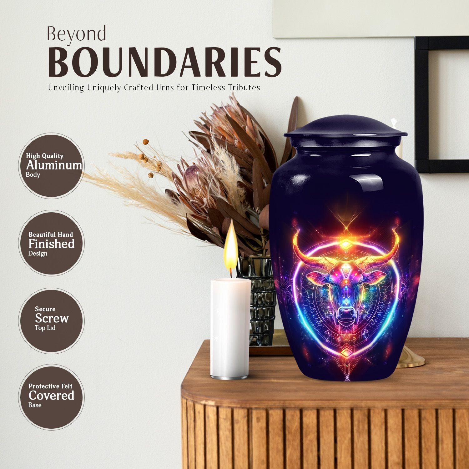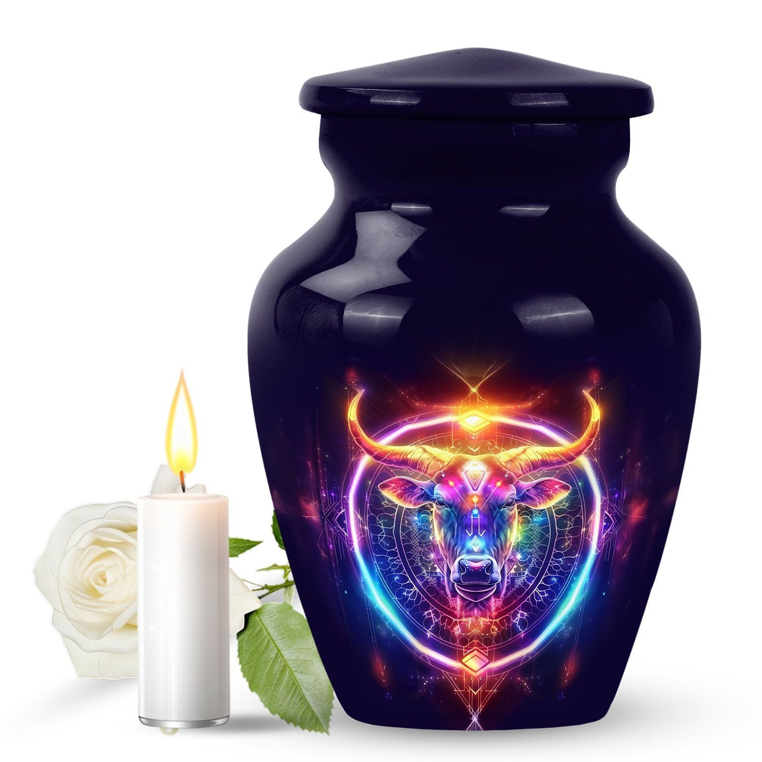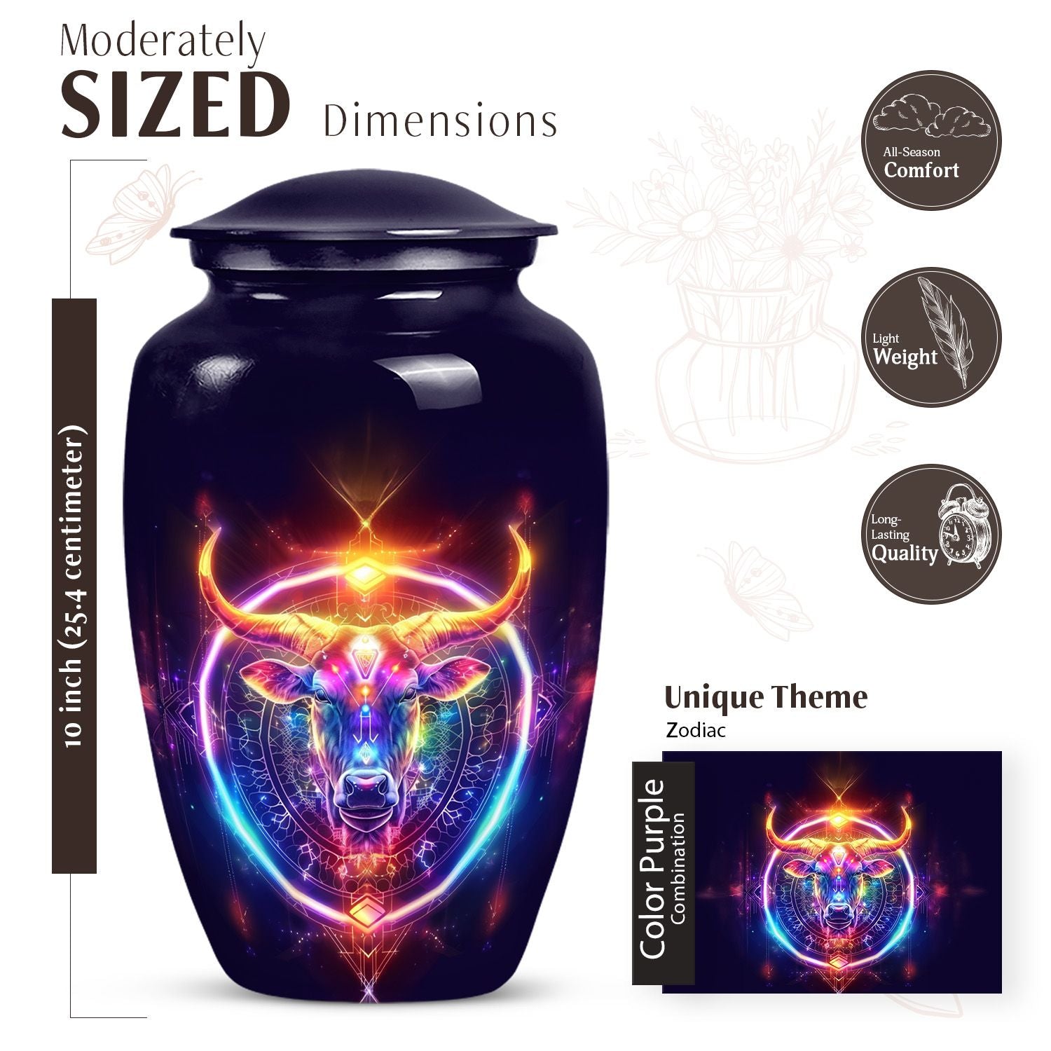 Embrace a profound global tradition and honor your loved one with our exquisite Zodiac Urn. This sizeable 10-inch memorial adult urn, made of fine Aluminium, provides a respectful and high-quality receptacle for your loved one's ashes. Carefully weighed at 3.3 pounds and offering a capacity of 200 cubic inches, it gently houses the remains within its respectfully crafted confines. This large urn comes with a velvet pouch, providing an added layer of protection and containment. As a centrepiece or personal memorial, it radiates a refined abstract theme symbolic of celestial harmony. With an option for customization, engrave names to instill a personal touch, further enhancing its value as a keepsake. Examples of the intended searches include 'zodiac urn', 'funeral burial urns' or 'cremation containers for human ashes', to name a few. Our memorial urns serve to be a timeless tribute to your loved one’s life, cherishing their memory with unending respect and love.