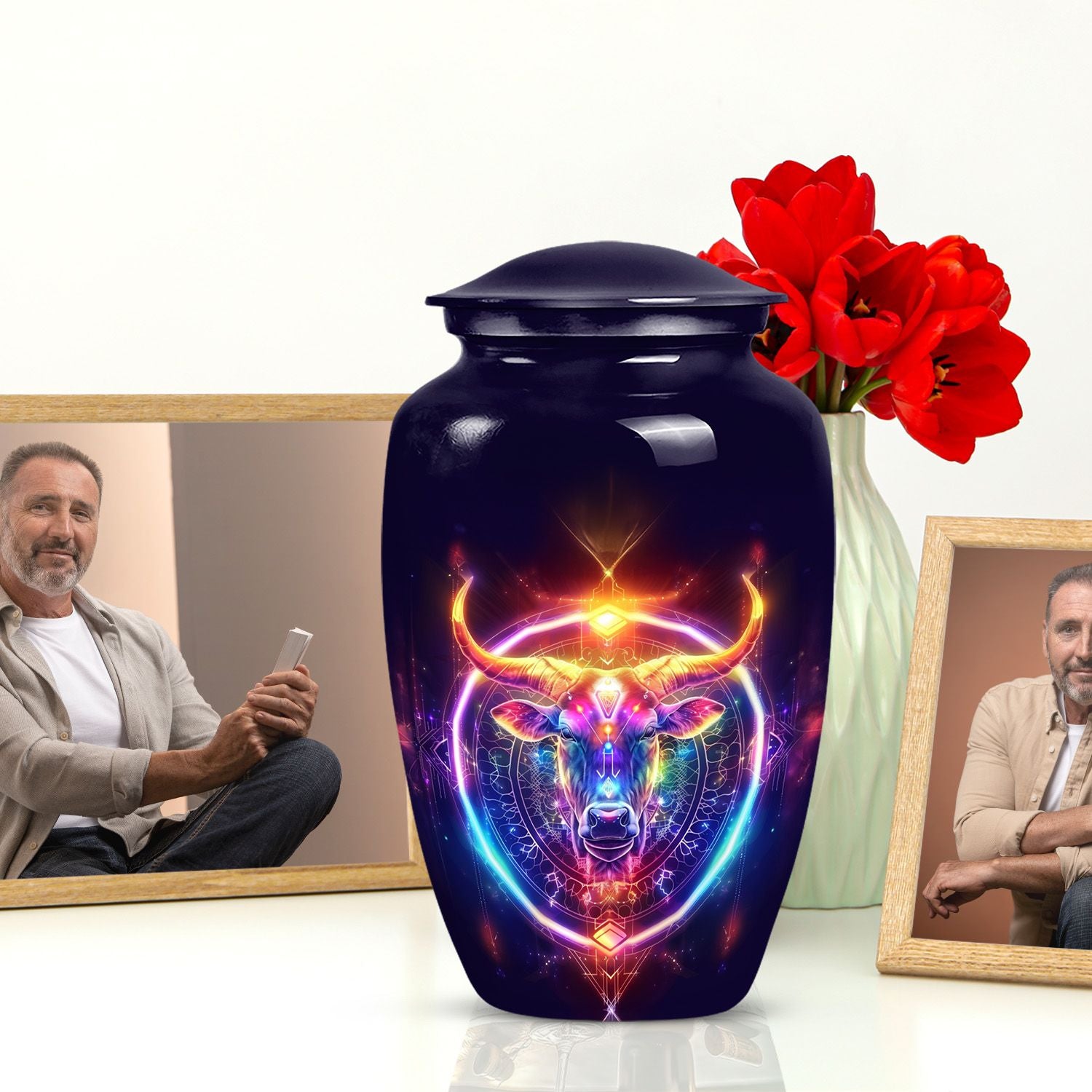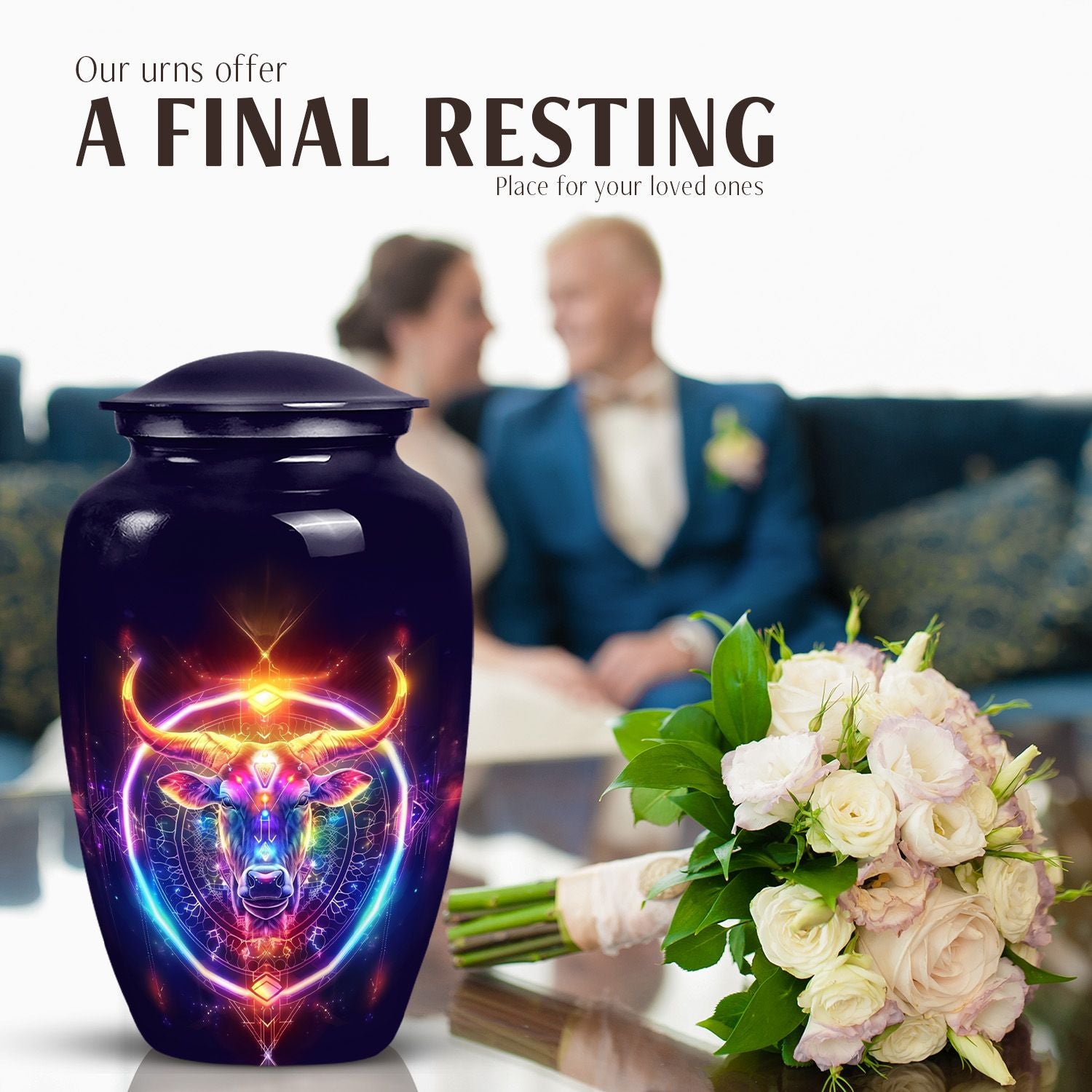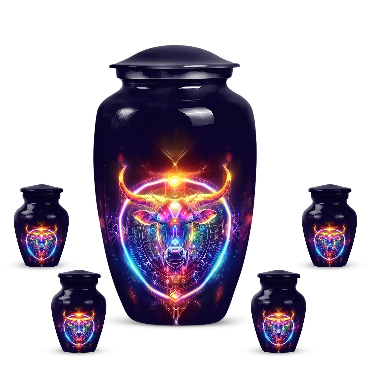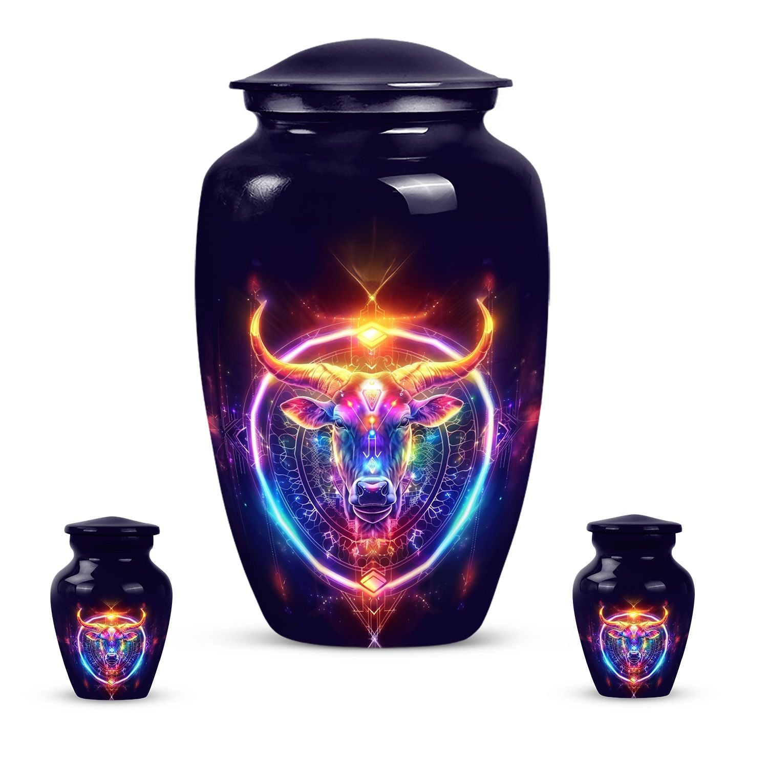 Embrace a profound global tradition and honor your loved one with our exquisite Zodiac Urn. This sizeable 10-inch memorial adult urn, made of fine Aluminium, provides a respectful and high-quality receptacle for your loved one's ashes. Carefully weighed at 3.3 pounds and offering a capacity of 200 cubic inches, it gently houses the remains within its respectfully crafted confines. This large urn comes with a velvet pouch, providing an added layer of protection and containment. As a centrepiece or personal memorial, it radiates a refined abstract theme symbolic of celestial harmony. With an option for customization, engrave names to instill a personal touch, further enhancing its value as a keepsake. Examples of the intended searches include 'zodiac urn', 'funeral burial urns' or 'cremation containers for human ashes', to name a few. Our memorial urns serve to be a timeless tribute to your loved one’s life, cherishing their memory with unending respect and love.