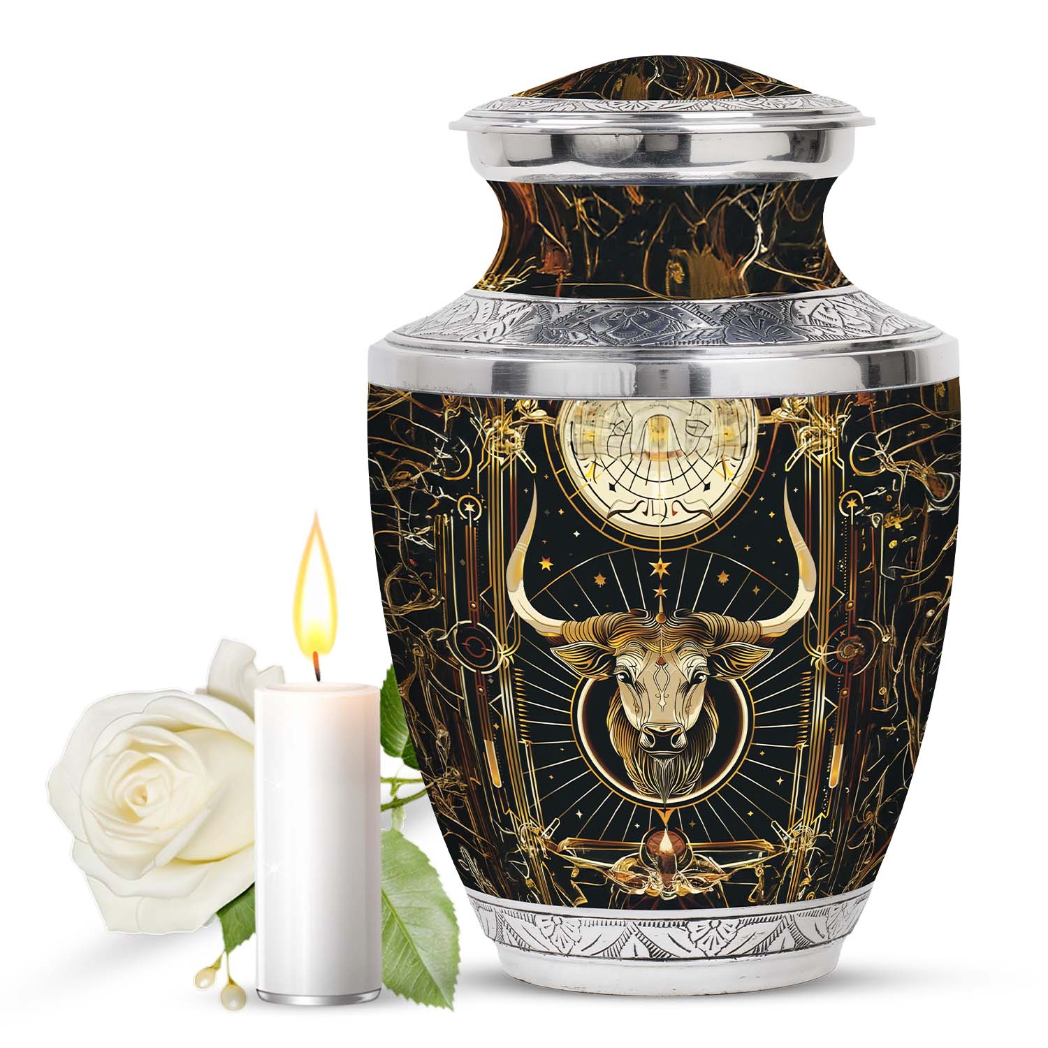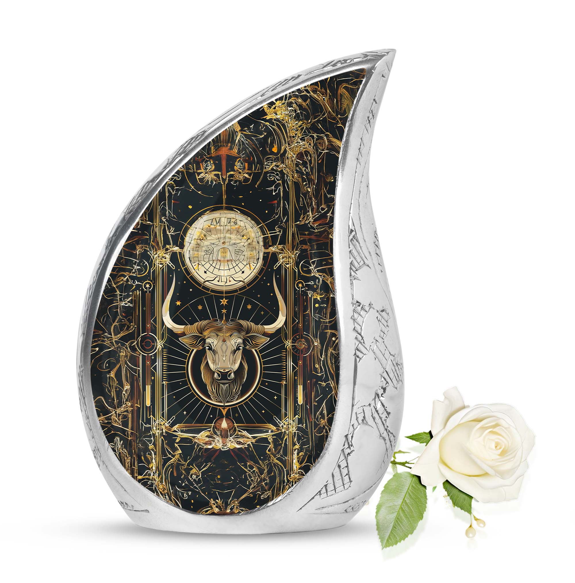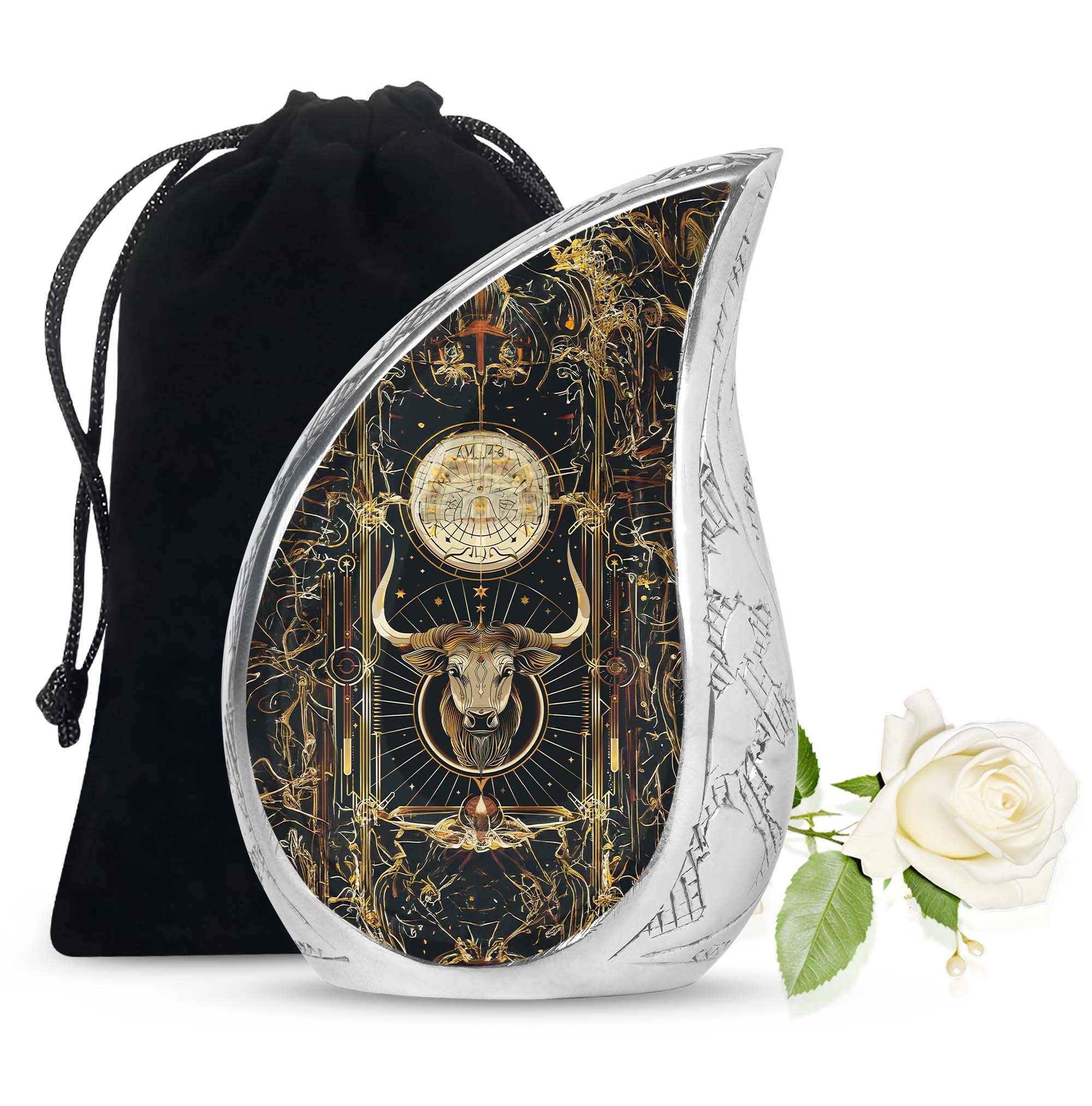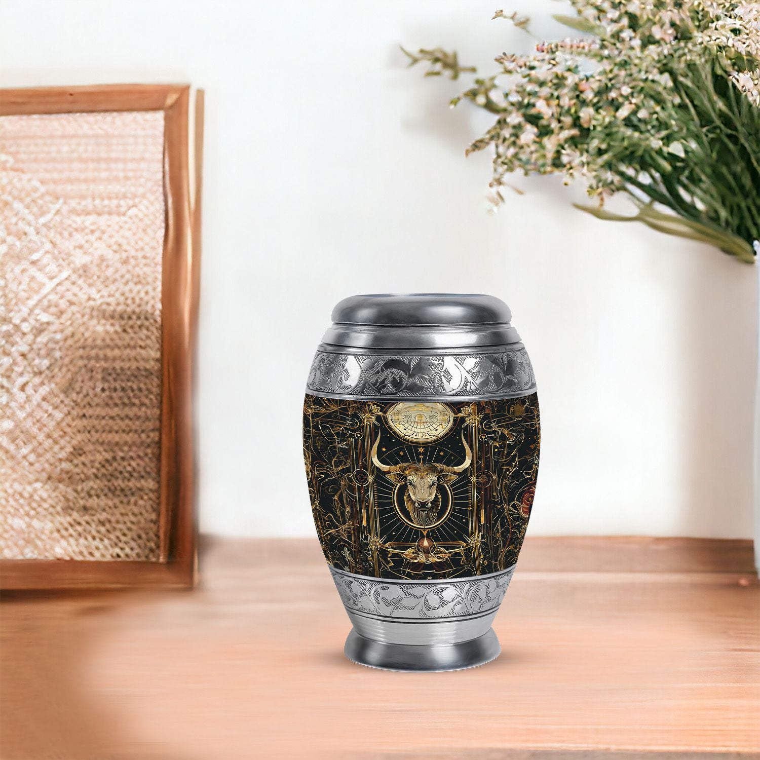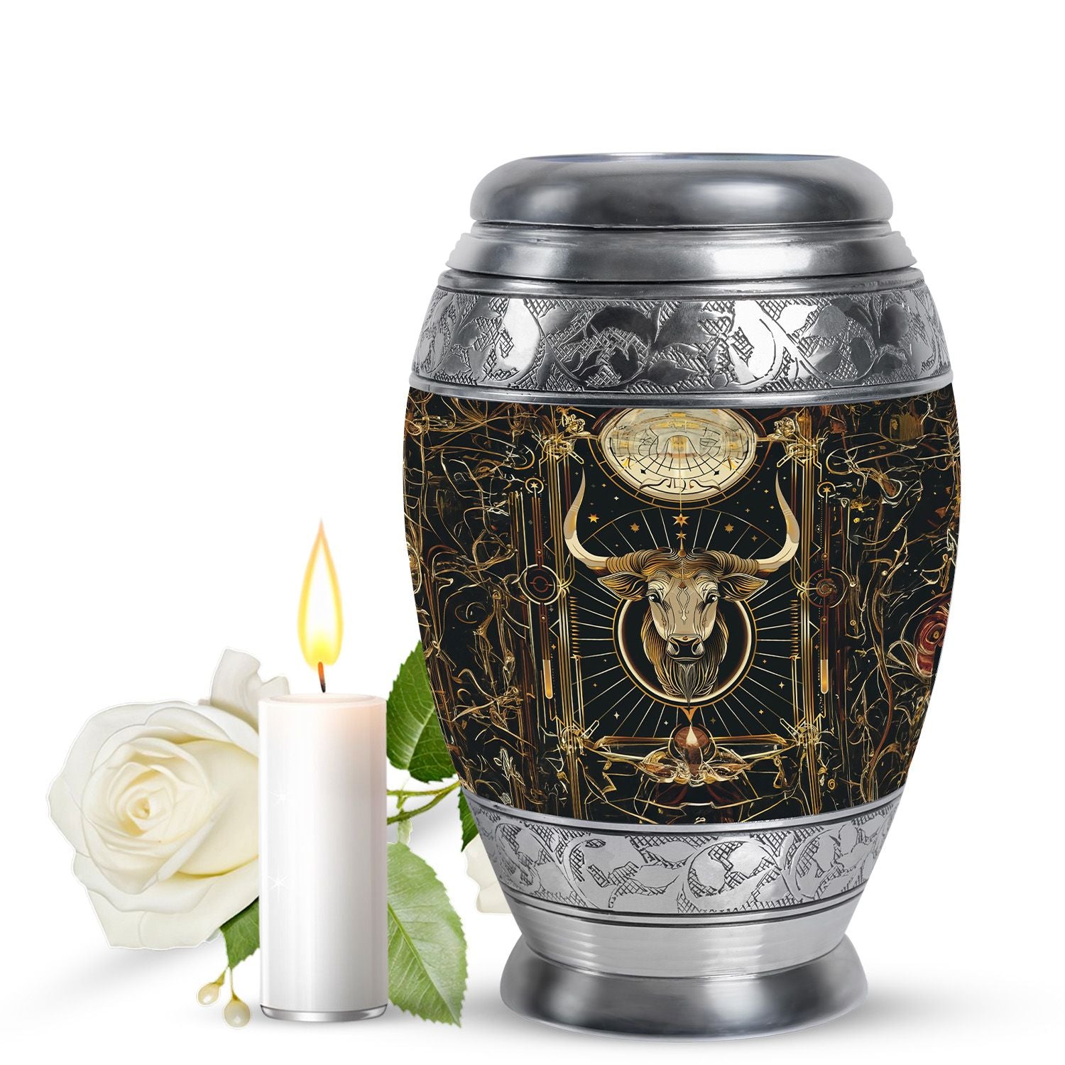 Made from durable aluminium, this cremation urn for women or men features a striking Taurus zodiac design that celebrates individuality while ensuring dignity. The secure screw-top lid preserves ashes safely, making it suitable as burial urns urn for ashes for women, mens urns for human ashes, or as a burial urn men would be honored to rest in. Its versatile design ensures it complements both funeral urns women and funeral urns men with elegance.