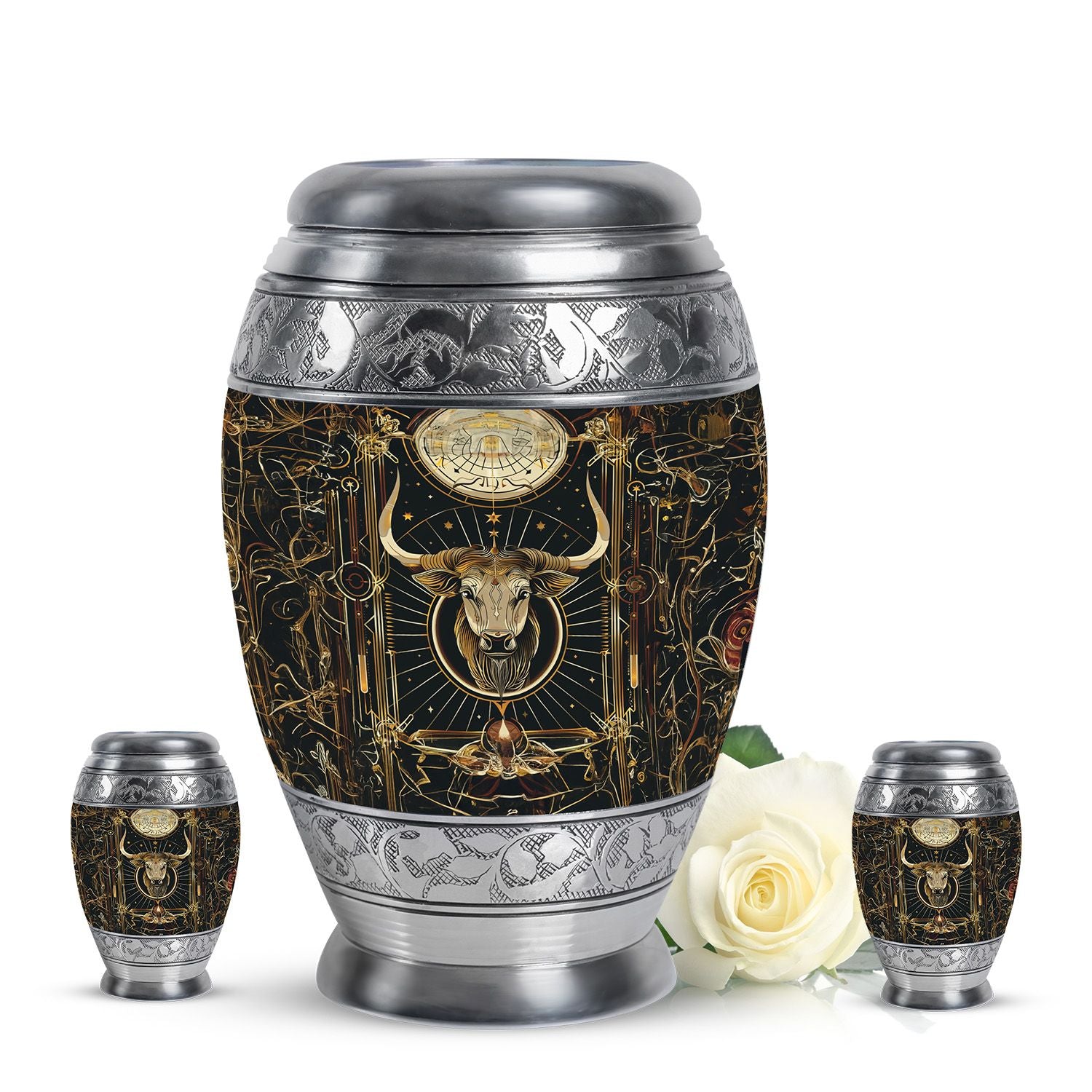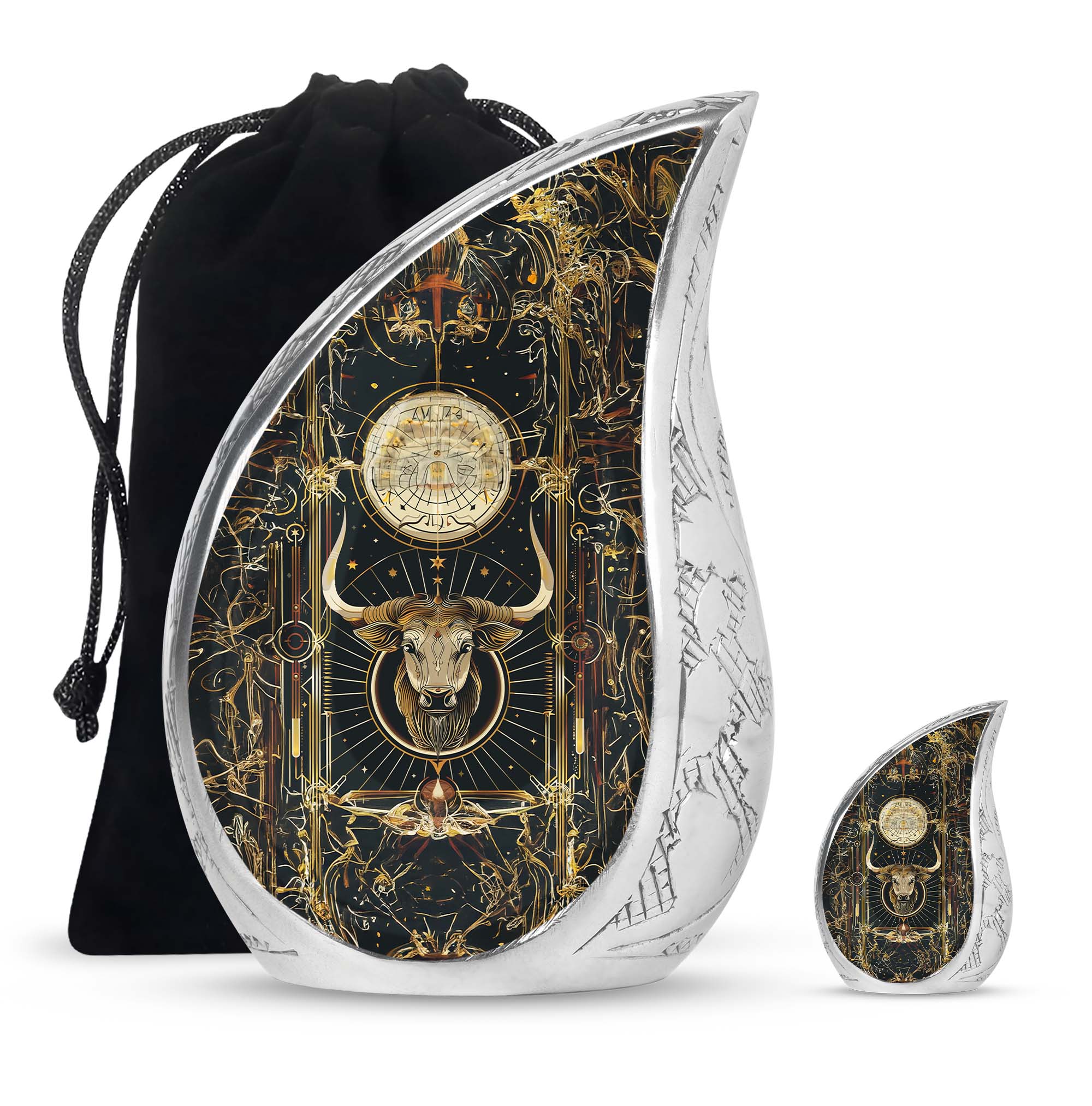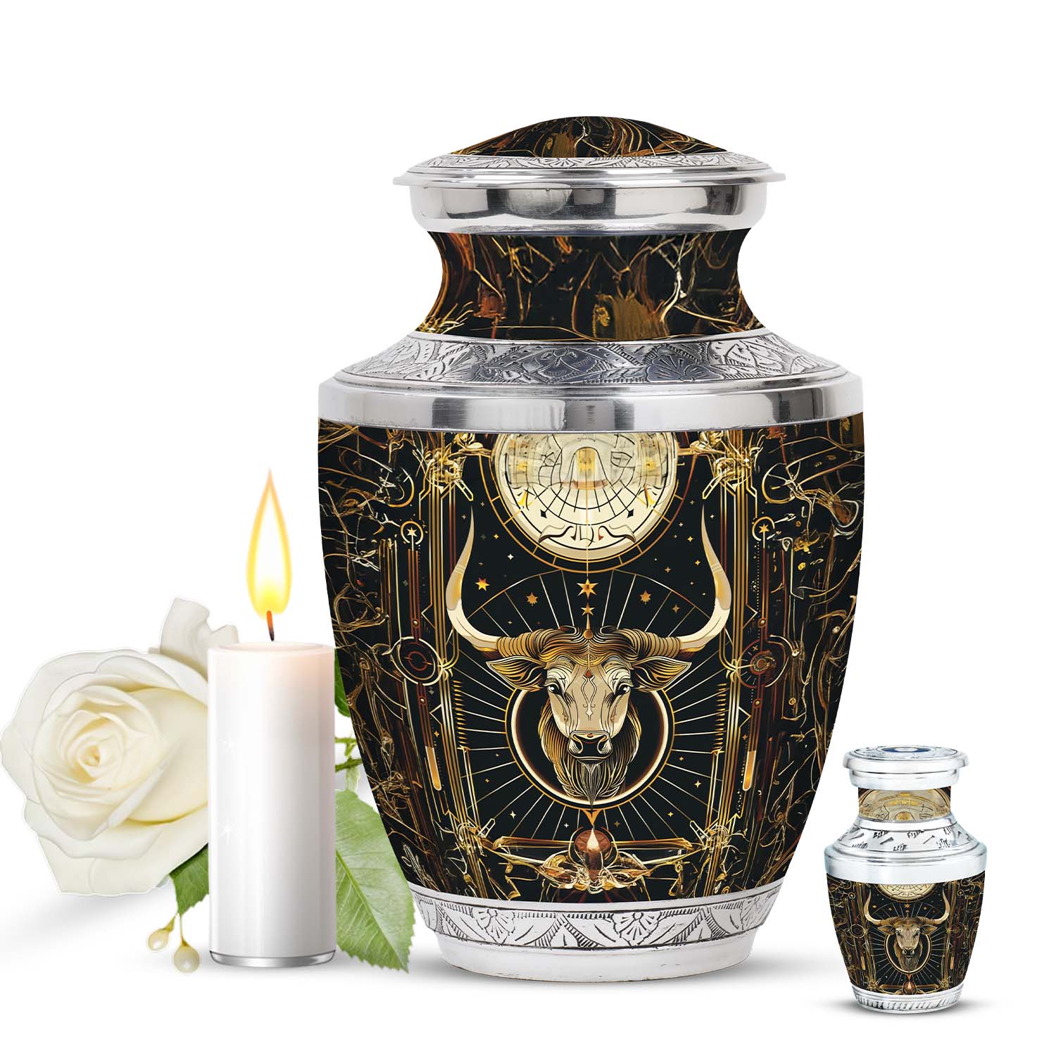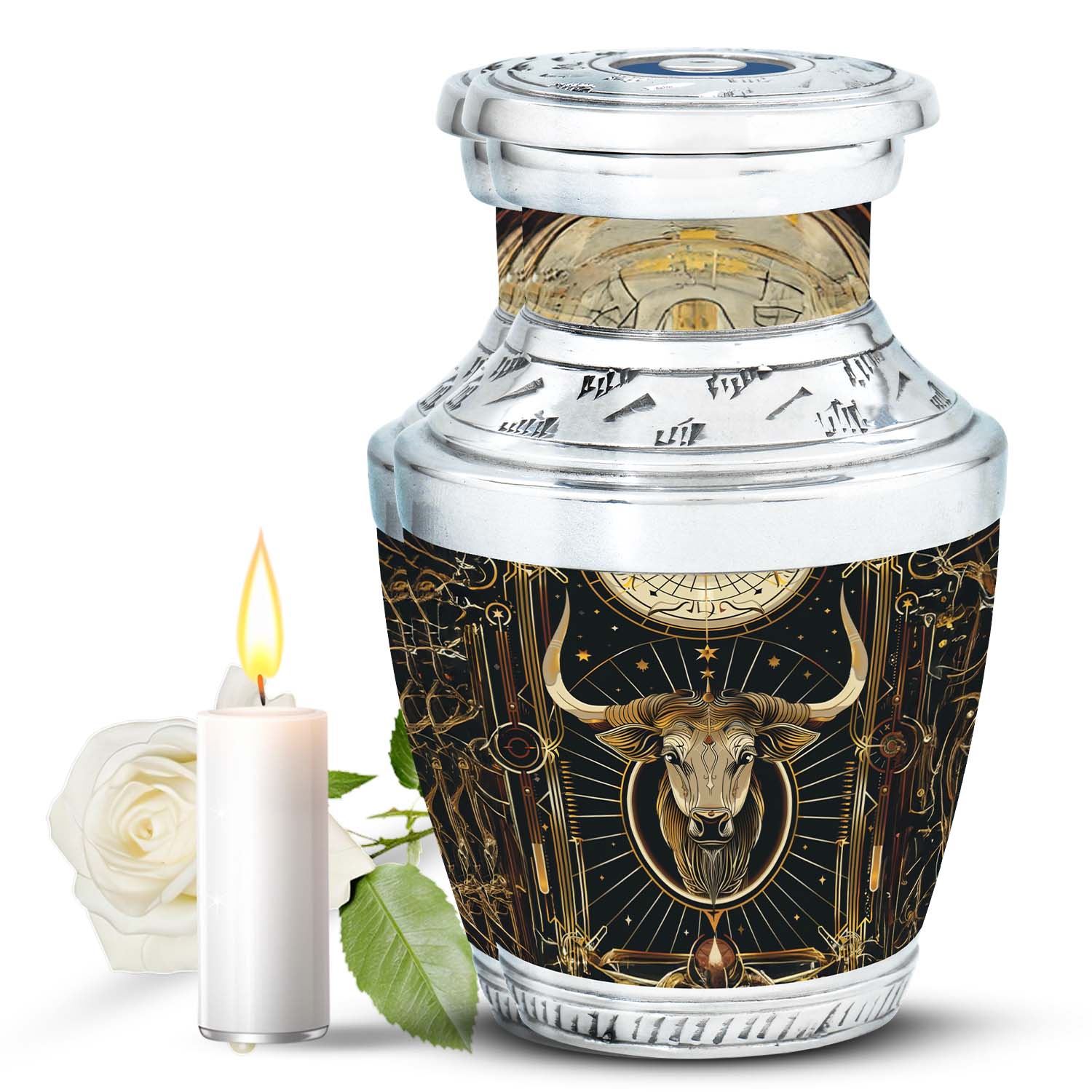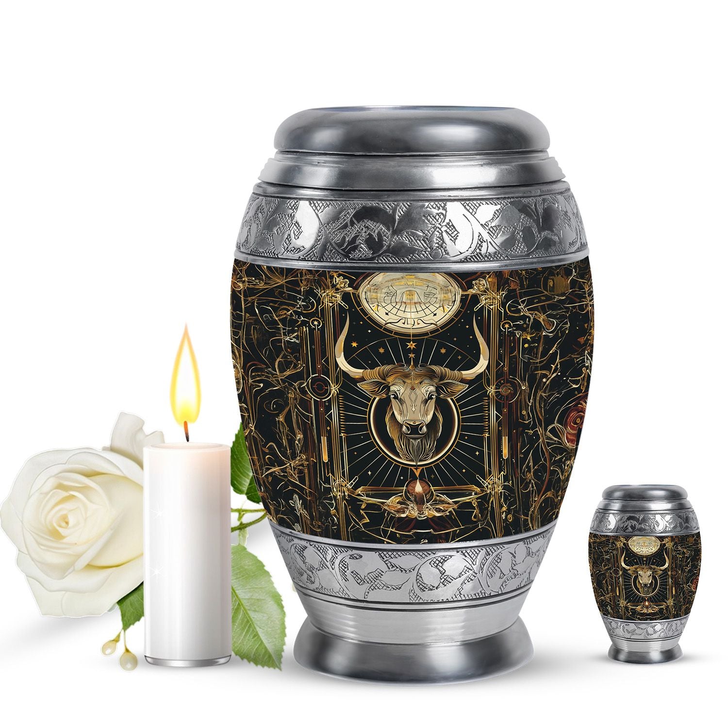 Made from durable aluminium, this cremation urn for women or men features a striking Taurus zodiac design that celebrates individuality while ensuring dignity. The secure screw-top lid preserves ashes safely, making it suitable as burial urns urn for ashes for women, mens urns for human ashes, or as a burial urn men would be honored to rest in. Its versatile design ensures it complements both funeral urns women and funeral urns men with elegance.