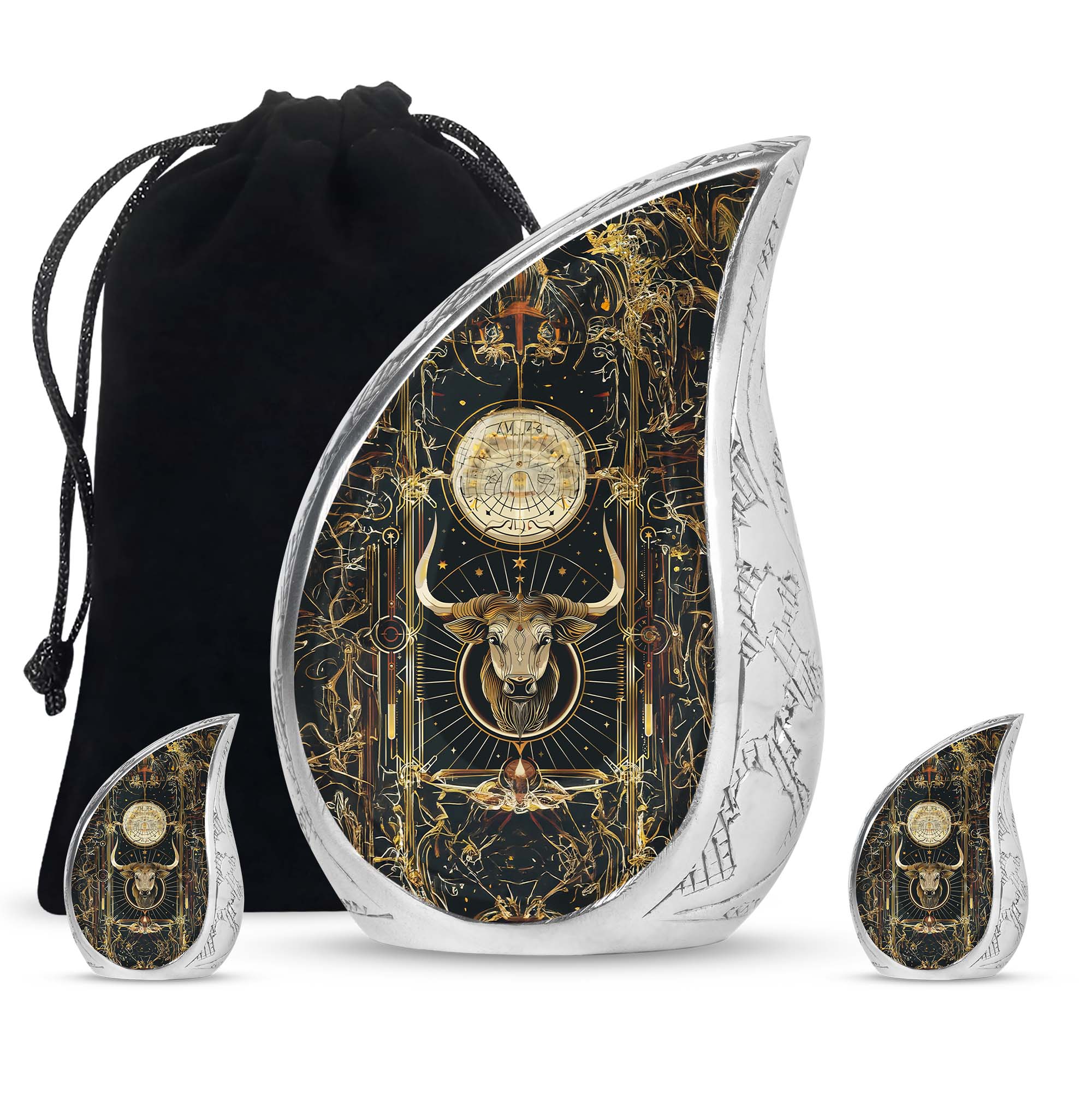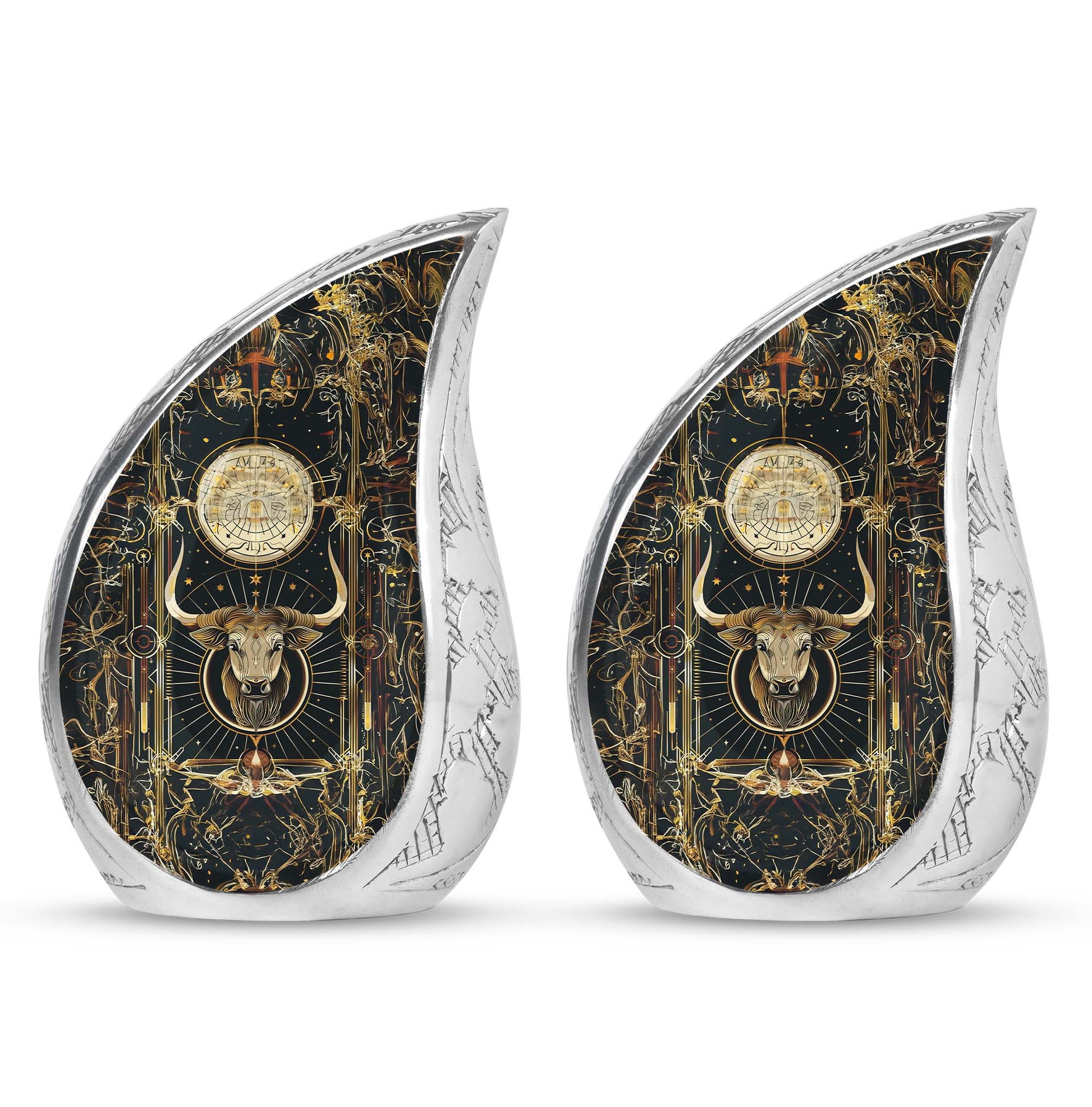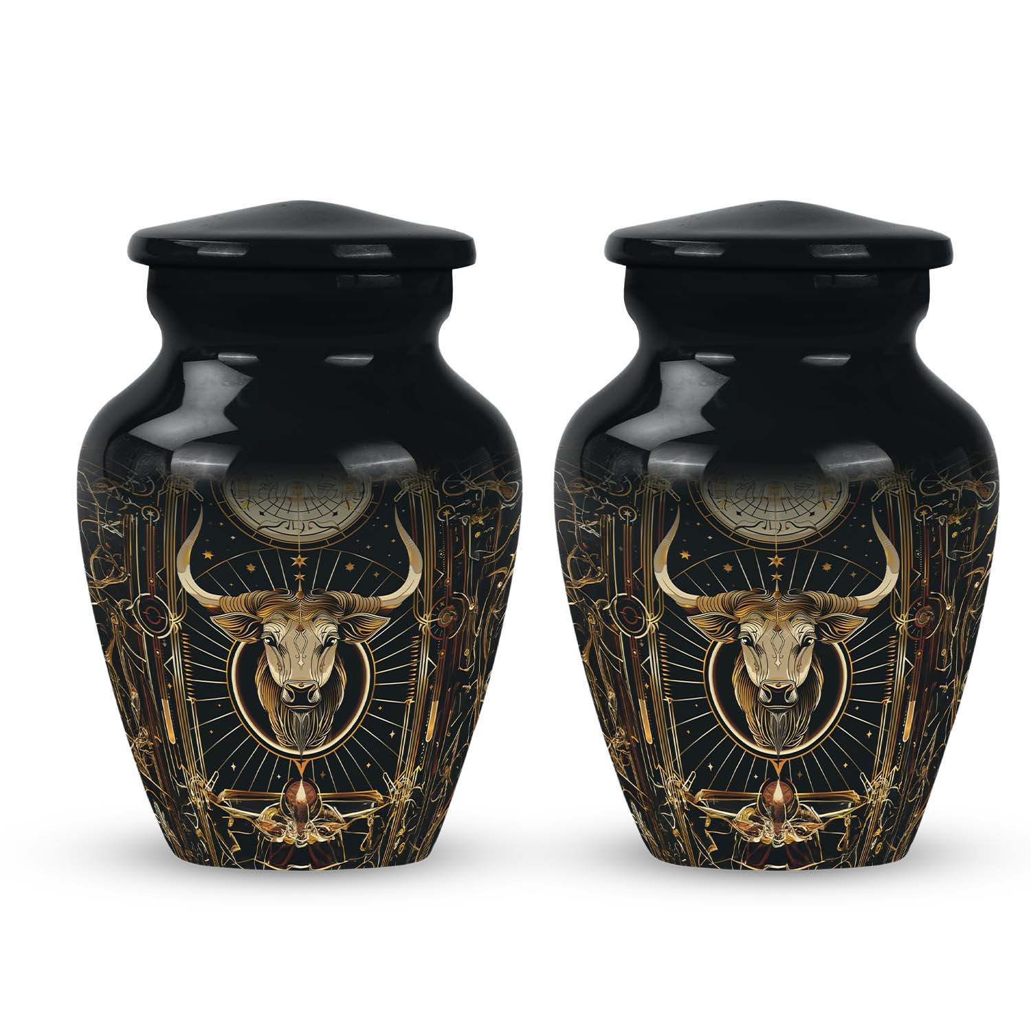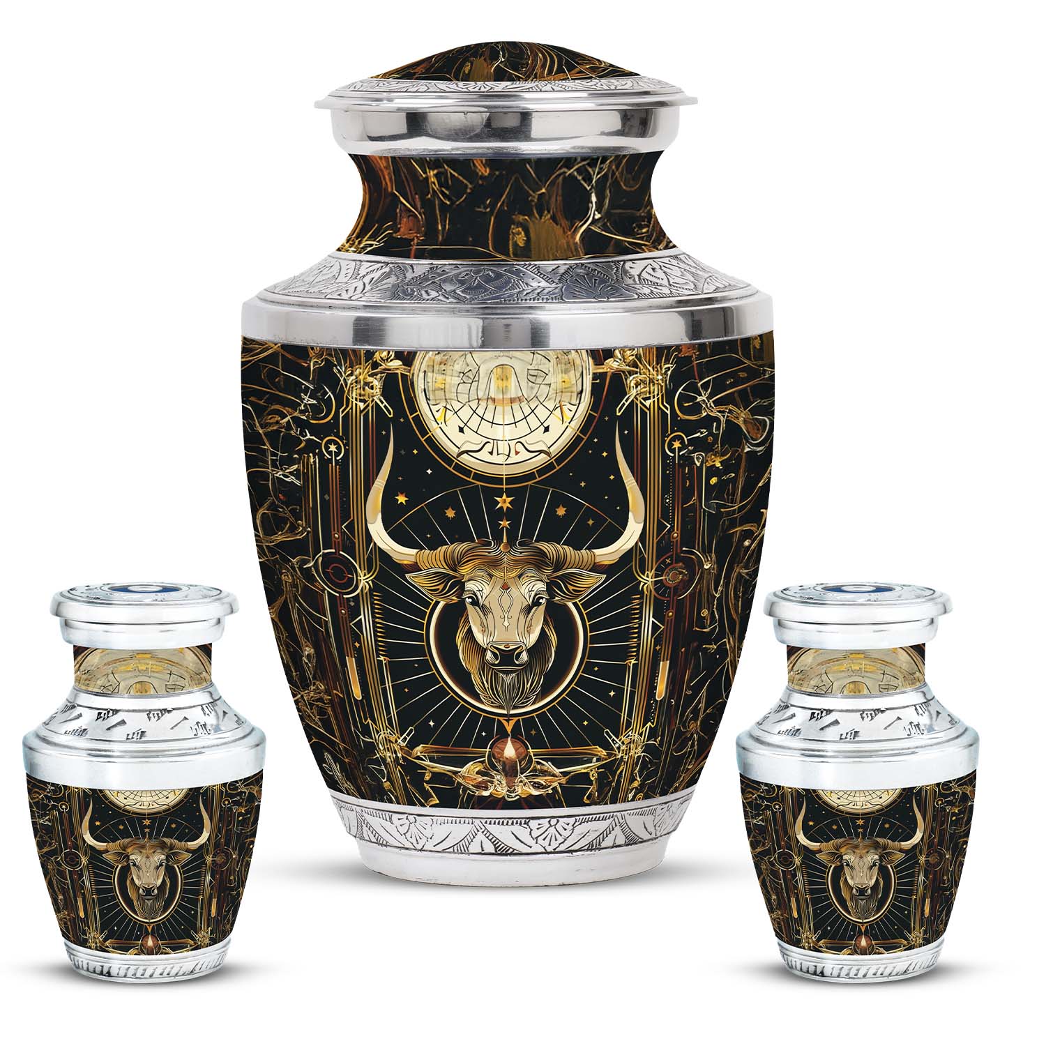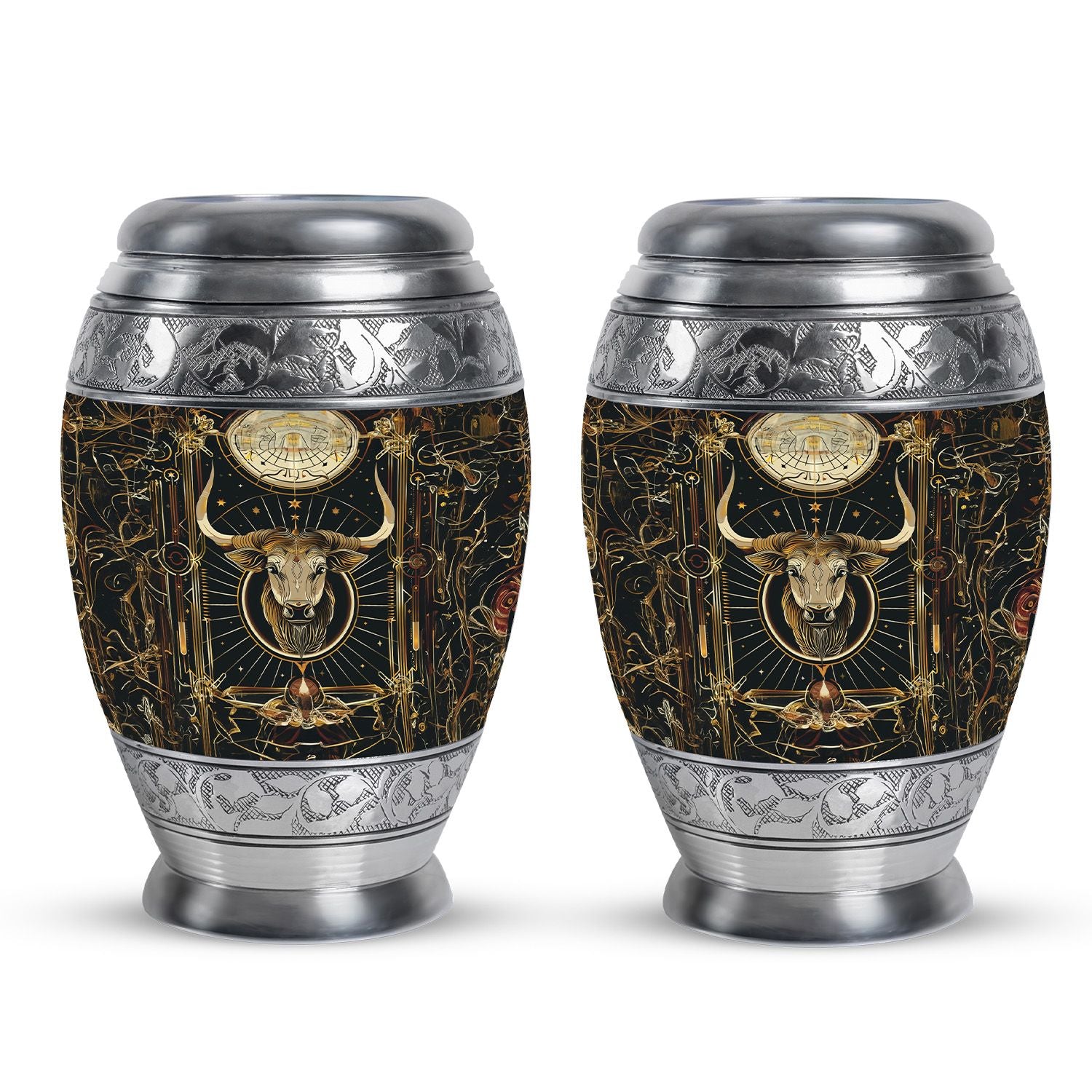 Made from durable aluminium, this cremation urn for women or men features a striking Taurus zodiac design that celebrates individuality while ensuring dignity. The secure screw-top lid preserves ashes safely, making it suitable as burial urns urn for ashes for women, mens urns for human ashes, or as a burial urn men would be honored to rest in. Its versatile design ensures it complements both funeral urns women and funeral urns men with elegance.