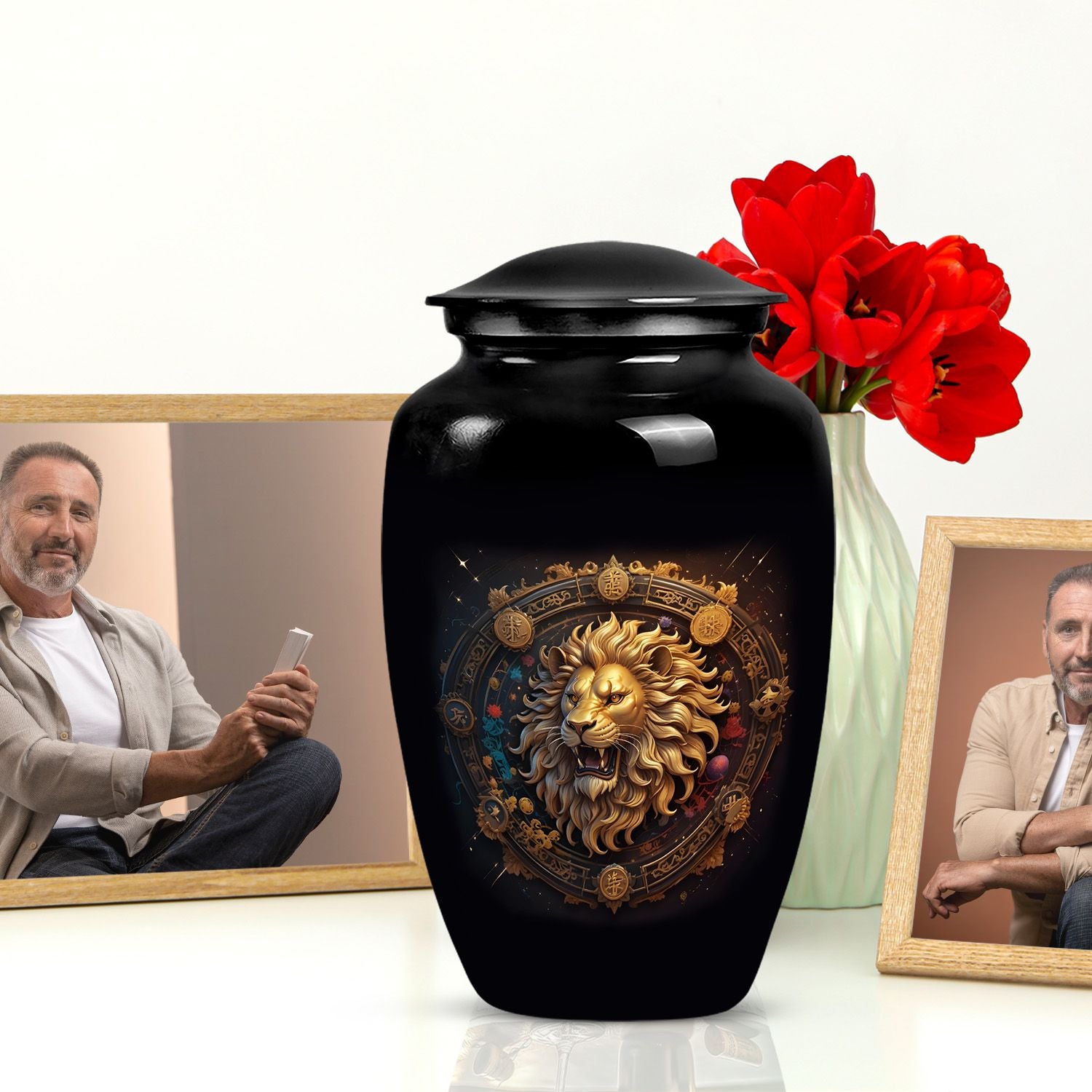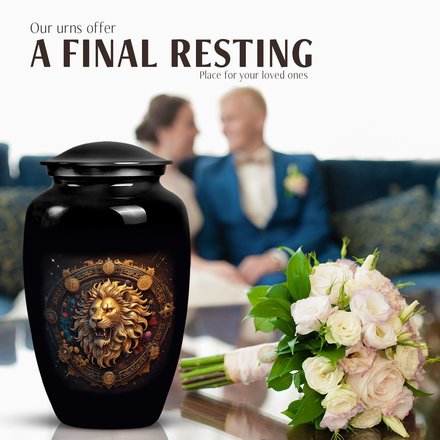 Immerse yourself into the celestial comfort with our Zodiac-themed Aluminium Large Urn. Measuring a full 10 inches tall and weighing a modest 3.3 pounds, this adult burial urn for ashes combines elegance and longevity in a compact package. The urn accommodates up to 200 cubic inches of ashes, ample for an adult, and emanates a charming timeless aura. The distinct Zodiac theme not only adds a unique personality to this cremation urn but also serves as a sublime reminder of the eternal cosmic cycle we all are part of. The urn comes with a plush velvet pouch, ensuring safe containment and easy transportation of your beloved one's ashes. Personalize your urn with engraved names, making it an exclusive memorial for your loved one. Whether you're grieving a loss or preparing for the inevitable, our Zodiac urn offers a beautiful solution for your adult burial and memorial needs.