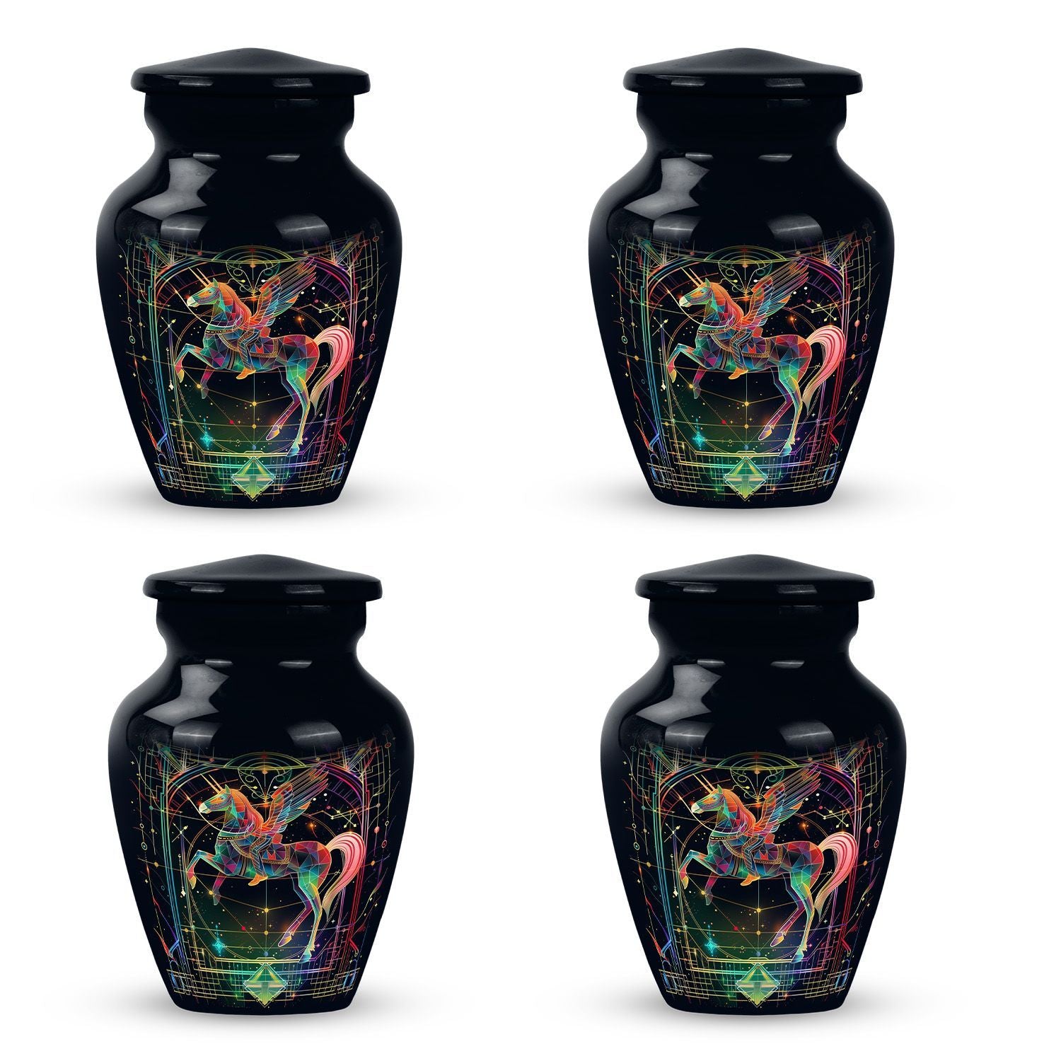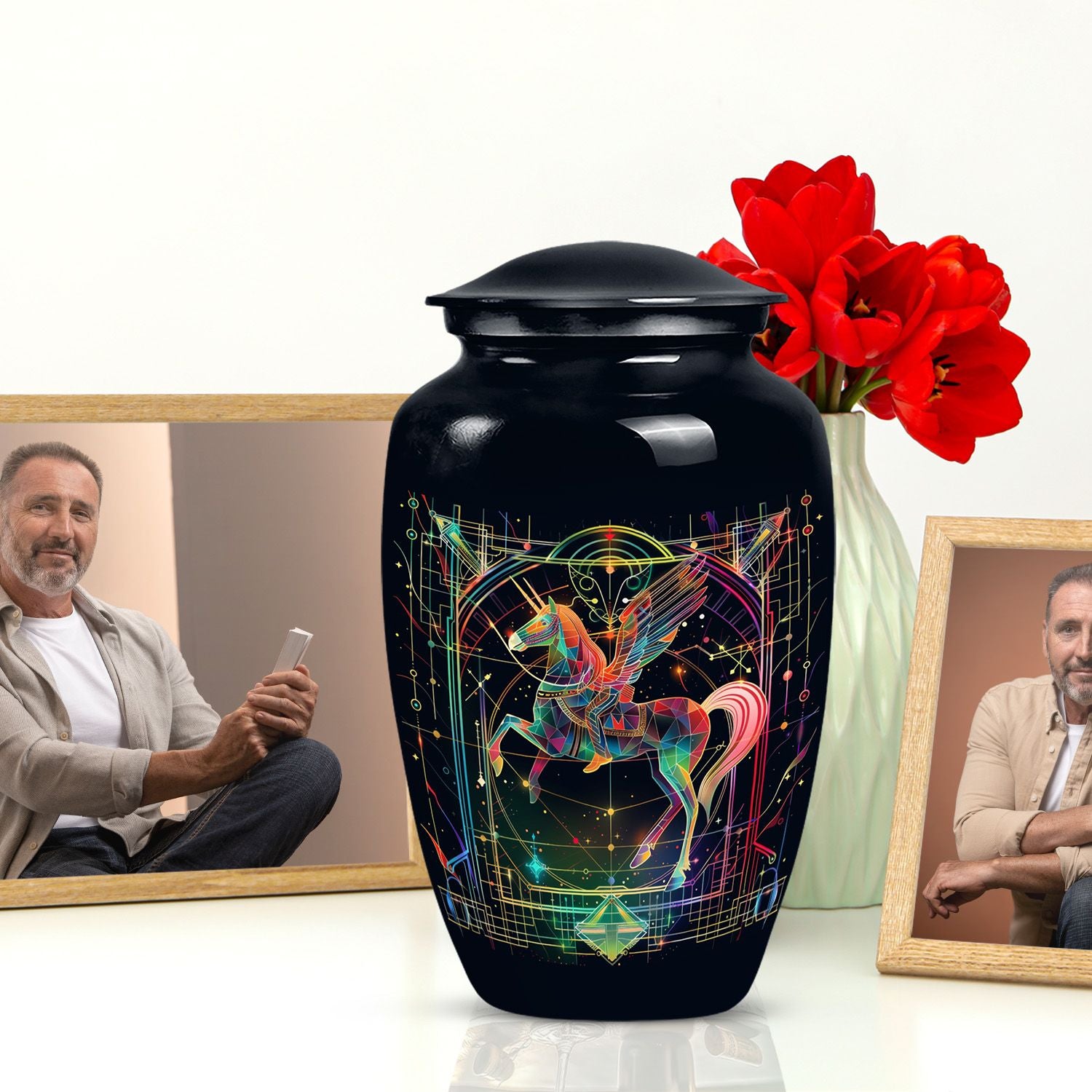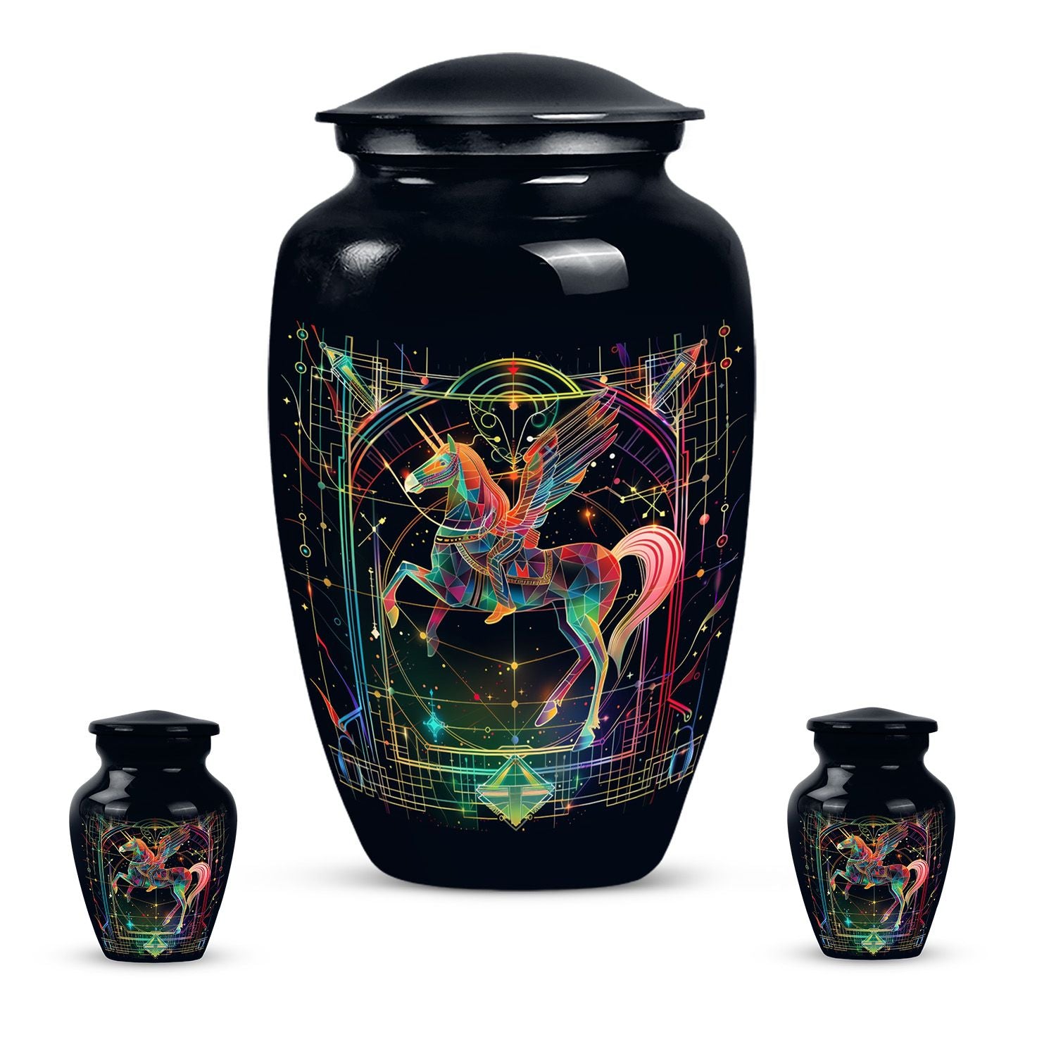 Honor your dearly departed with our unique Zodiac Urn, specifically designed as a final resting place for adult human ashes. Our large, cremation urn is carefully crafted from durable aluminium, ensuring a lasting tribute to your loved one. Each urn measures a significant 10 inches in height and weighs 3.3 pounds, reflecting its sturdy build. It offers an impressive capacity of 200 cubic inches, ample room to safely contain your loved one's remains. With the thoughtful addition of a velvet pouch, the containment of ashes is made subtle and graceful. This abstract themed urn stands out because of its personal touch. Not just an urn, it serves as a keepsake that can be personalized with engraved names. This classic urn is a beautiful way to remember and honor your loved one. Typically used for funeral burial, this urn is also ideal for placement on a shaped shelf in your home as a remembrance. The unique zodiac theme makes this piece a treasured keepsake that transcends the usual funeral burial urns for adult human ashes.