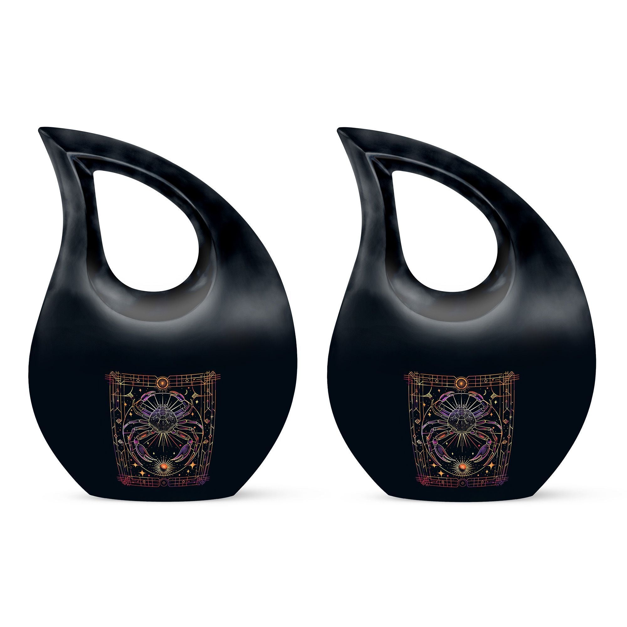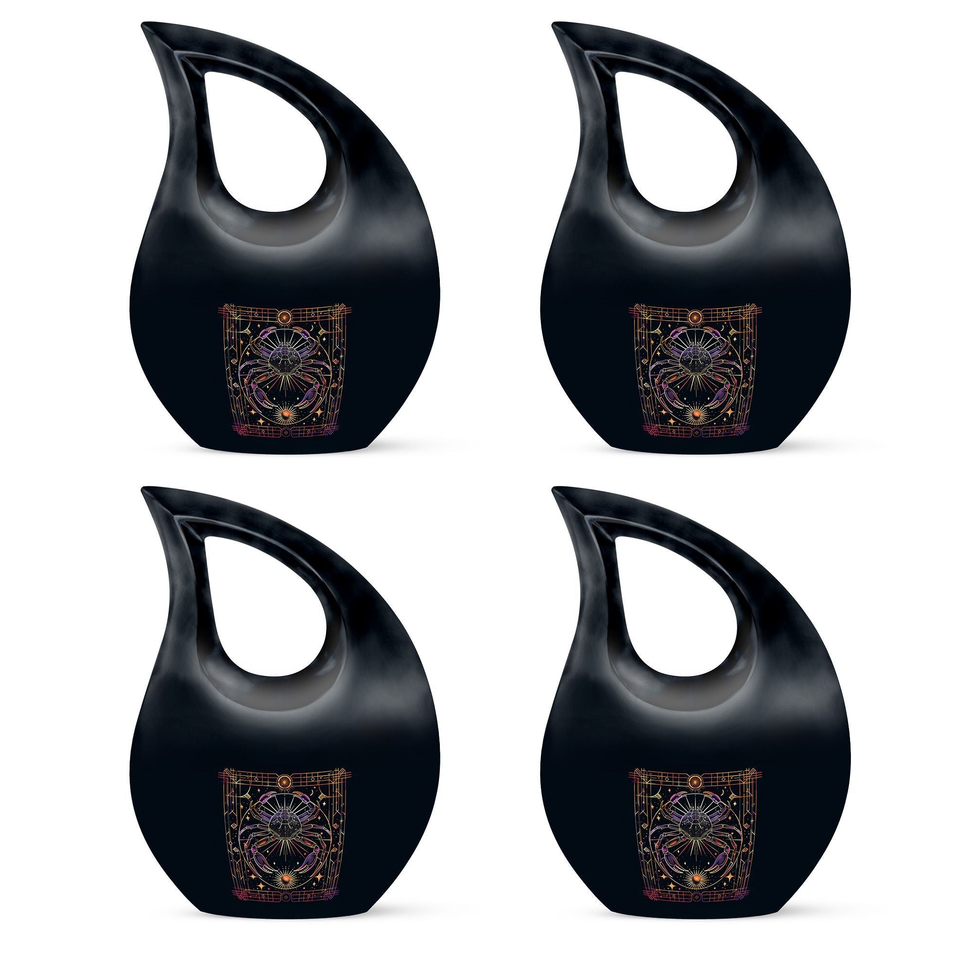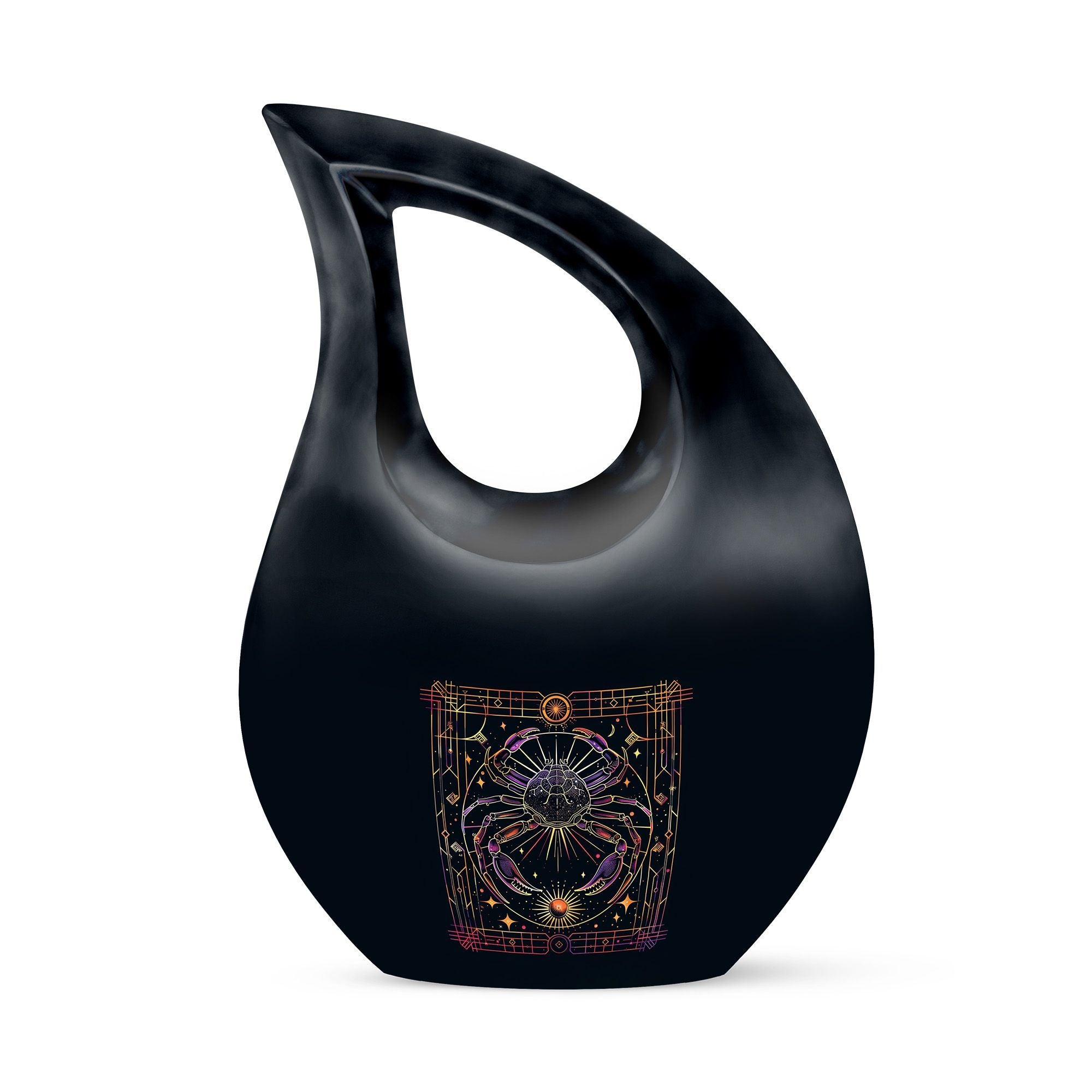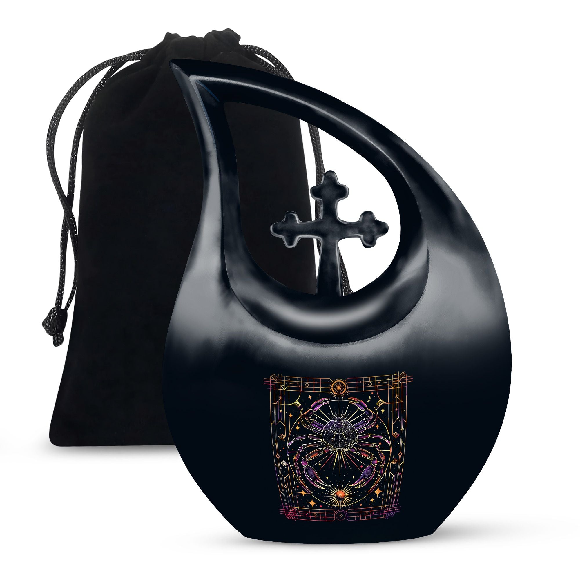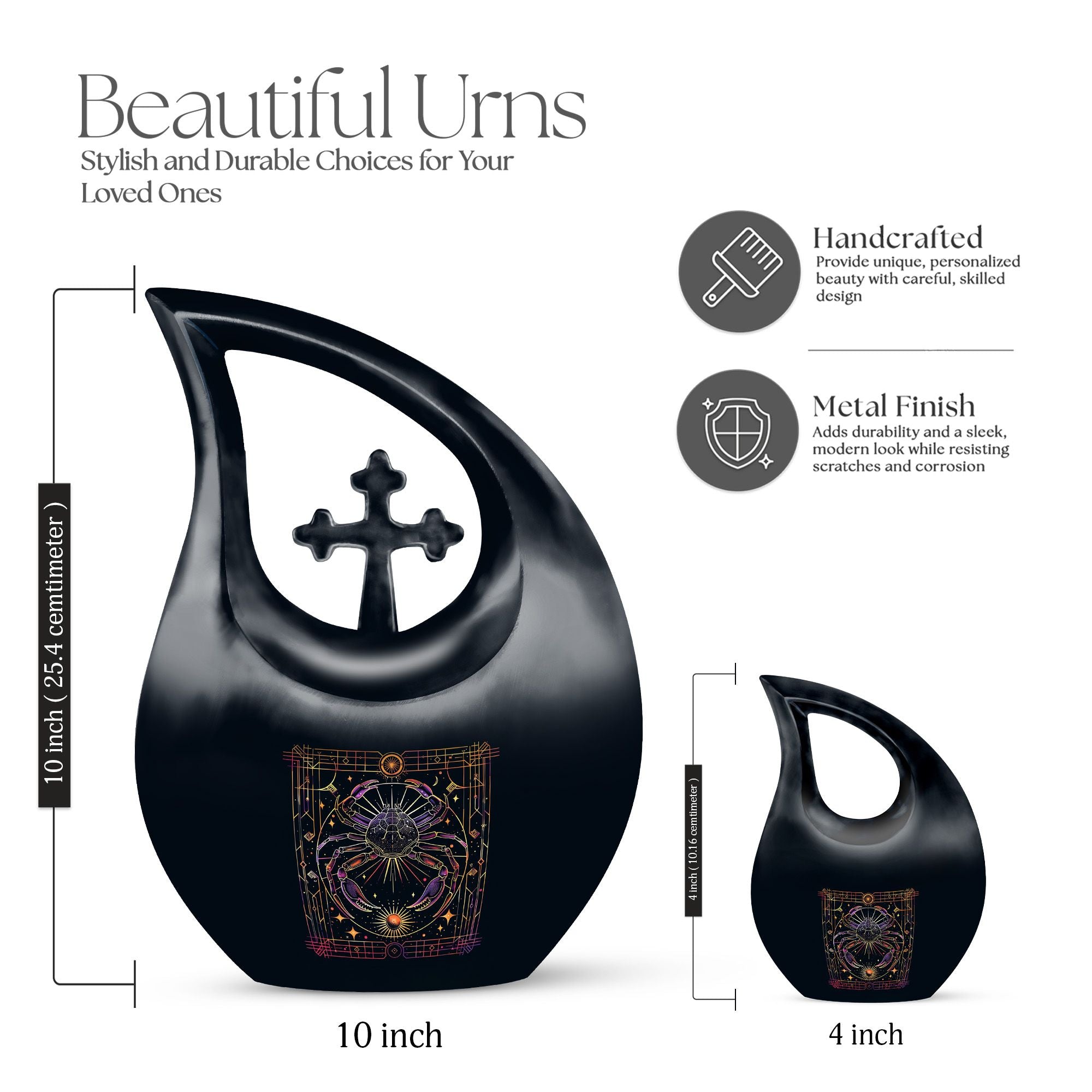 Embrace the eternal cosmos with our Zodiac-themed Large Cremation Urn. At 10 inches tall, this aluminium urn is uniquely designed to honour your loved ones in a celestial way. Our 'Cross Drop' urn design blends spirituality and astronomy into a harmonious tribute. Weighing a sturdy 3.3 pounds, it securely holds up to 200 cubic inches of ashes. The urn comes with a velvet pouch, providing respectful and elegant containment for the remains. The urn offers a personalised touch with an option to engrave names making it an intimate memorial piece. Looking for affordable urns or ashes urns for sale? This zodiac urn meets the need and goes beyond as it brings a cosmic connection to memorial ceremonies. With our medium-sized cremation boxes, you'll find a heartfelt balance between size, design, and purpose.