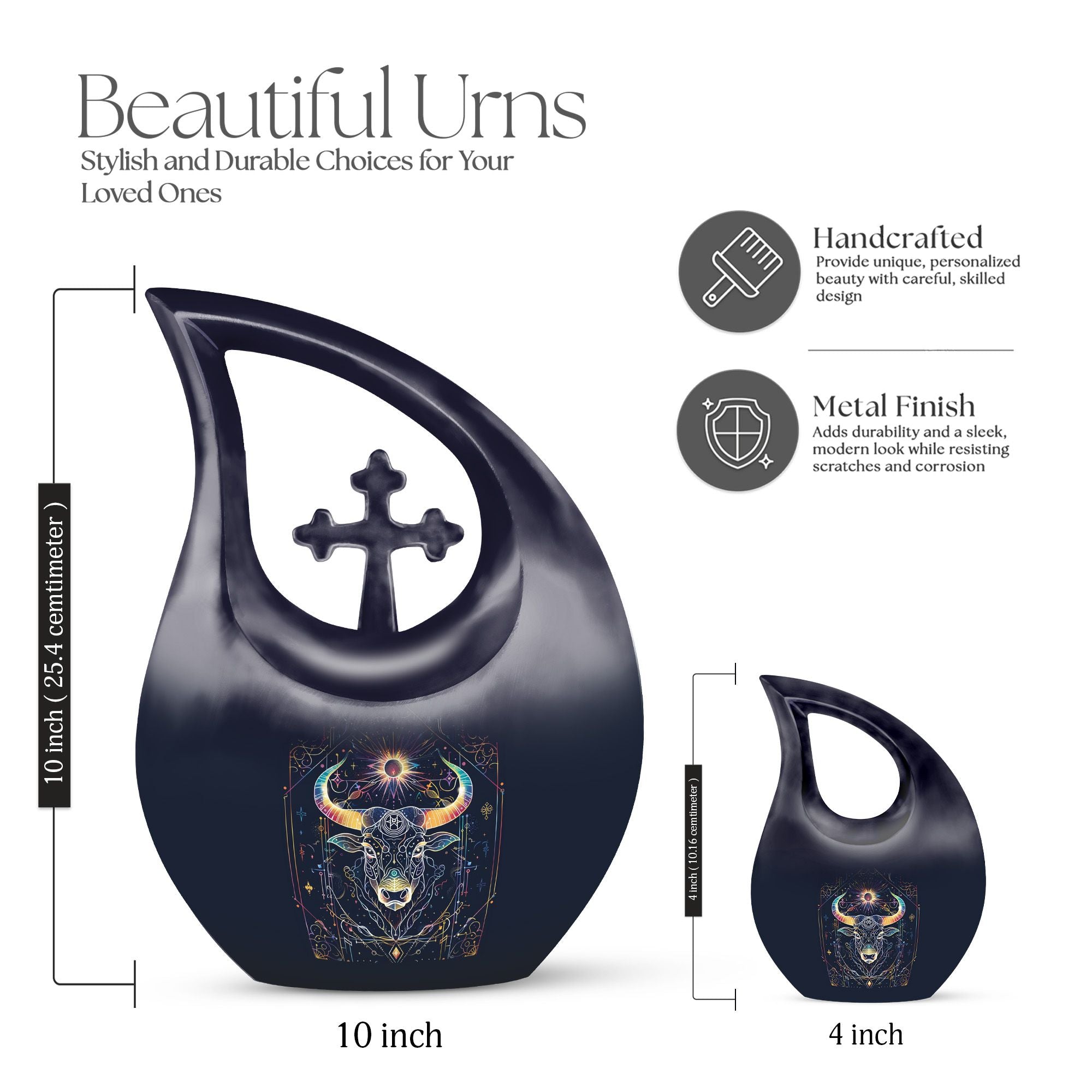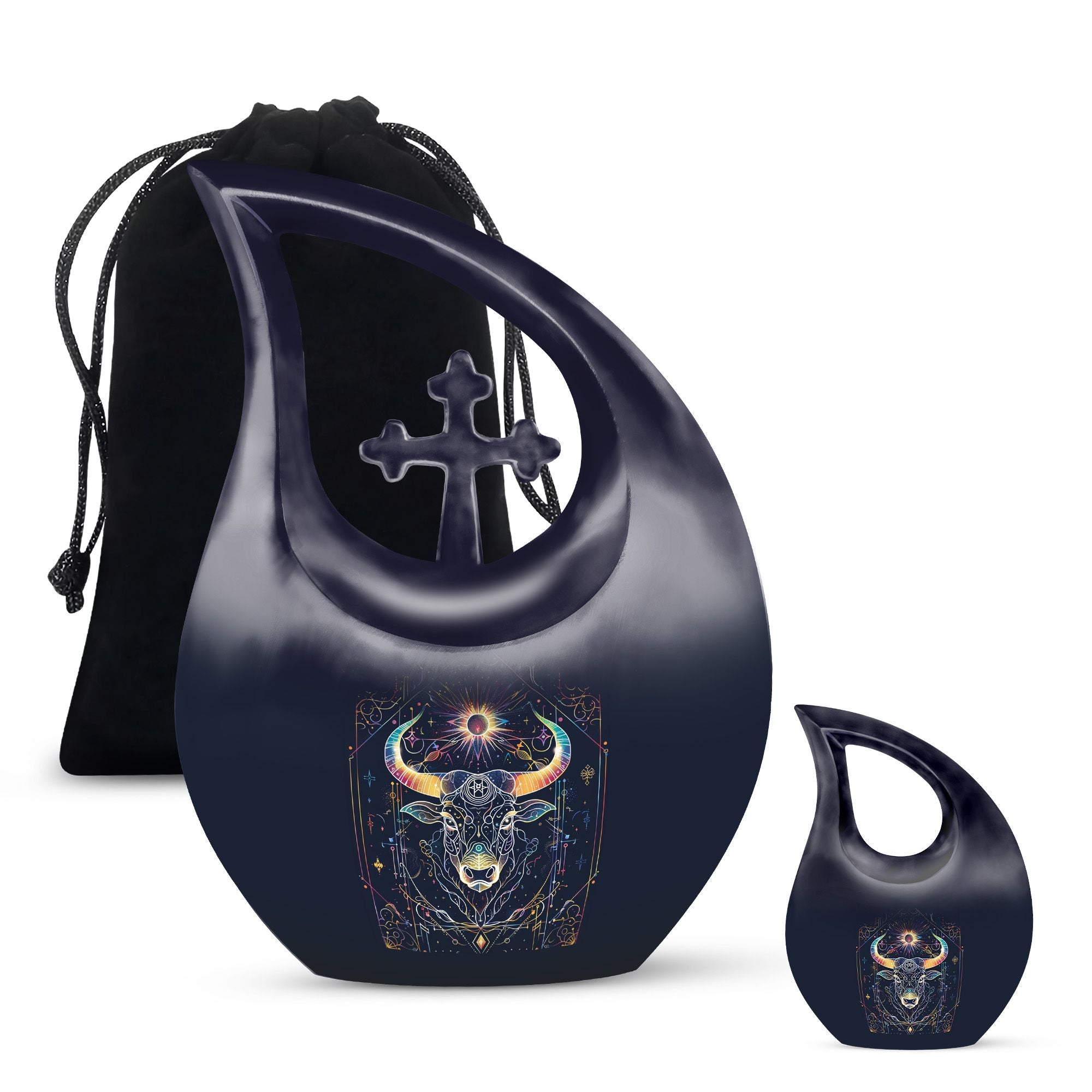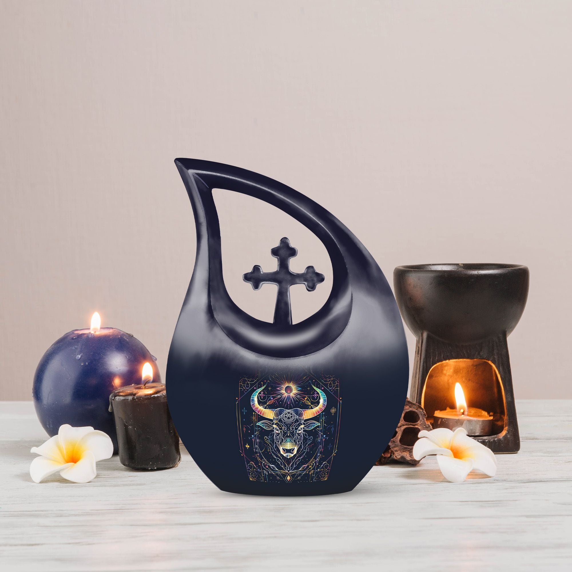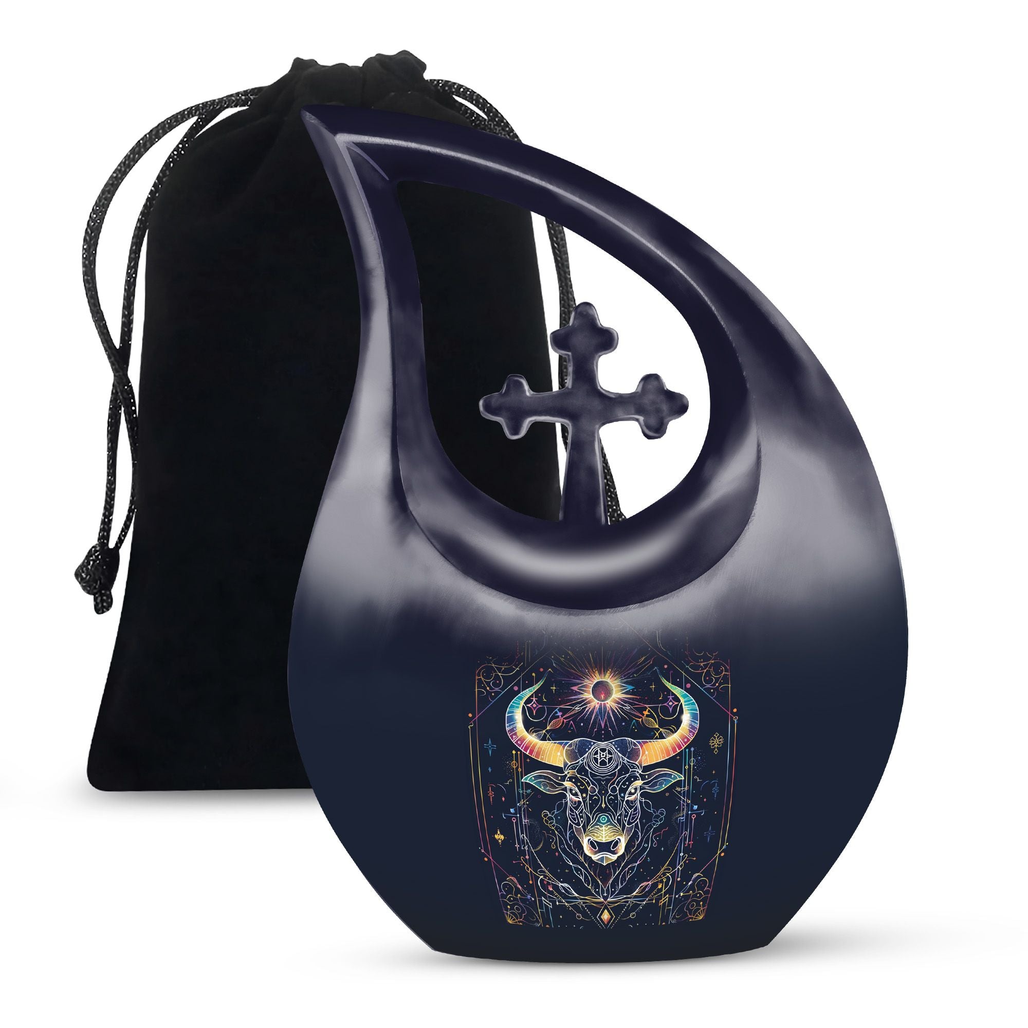 This beautifully crafted Cross Drop Zodiac Urn is a serene and thoughtful choice for memorial ceremony supplies. The large-size urn, standing at 10 inches in height, is made skillfully from high-quality aluminium, weighing in at a substantial 3.3 pounds. Its capacity is considerable, with space for 200 cubic inches of cherished ashes. Embellished with a distinct Cross Drop Zodiac design, this urn pays aesthetic homage to celestial themes, adding a unique layer to the remembrance process. The urn also offers a customization element; engrave names into the aluminium to truly personalize this memorial keepsake. Alongside the urn, a velvet pouch is included, creating a respectful containment for the ashes. Unleashing a blend of elegance and sentiment, this Zodiac Urn stands as a beautiful tribute to loved ones, fitting seamlessly within the realm of small urns and cremation keepsakes.