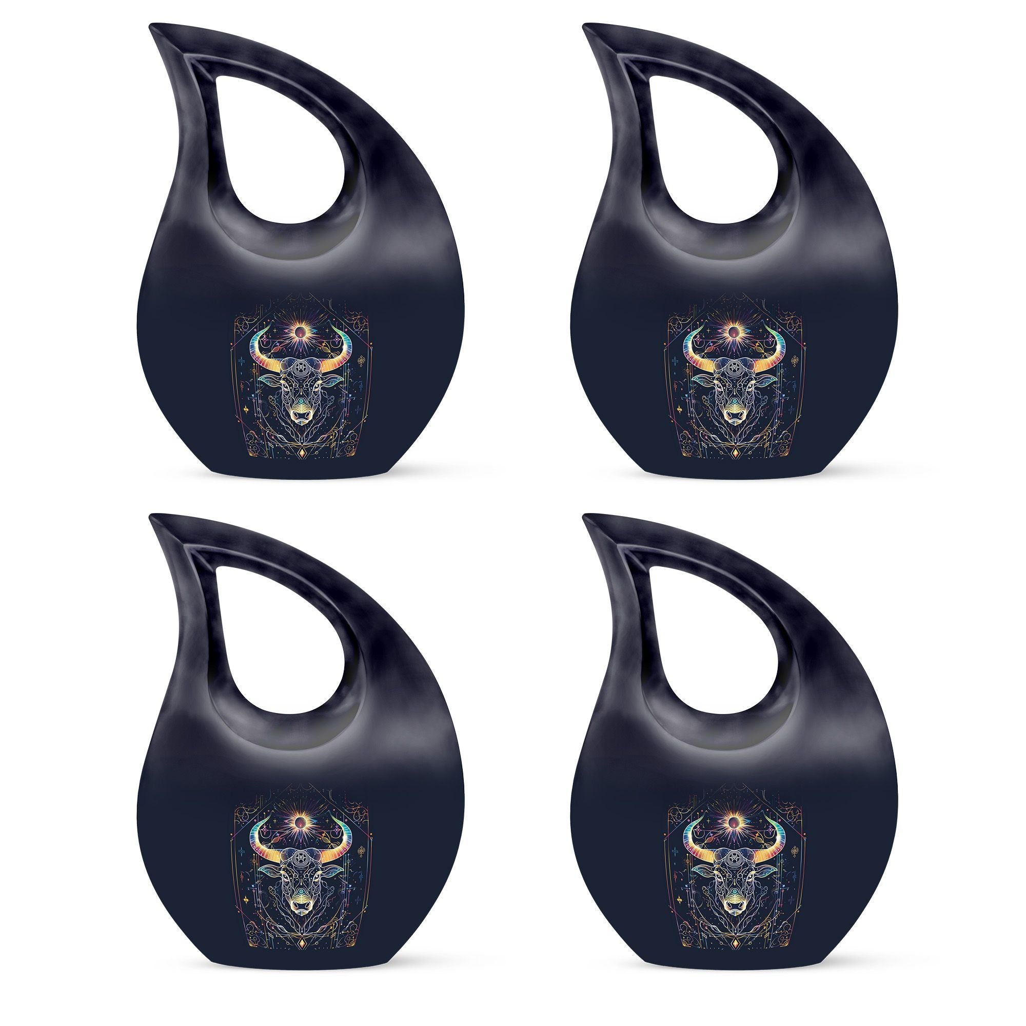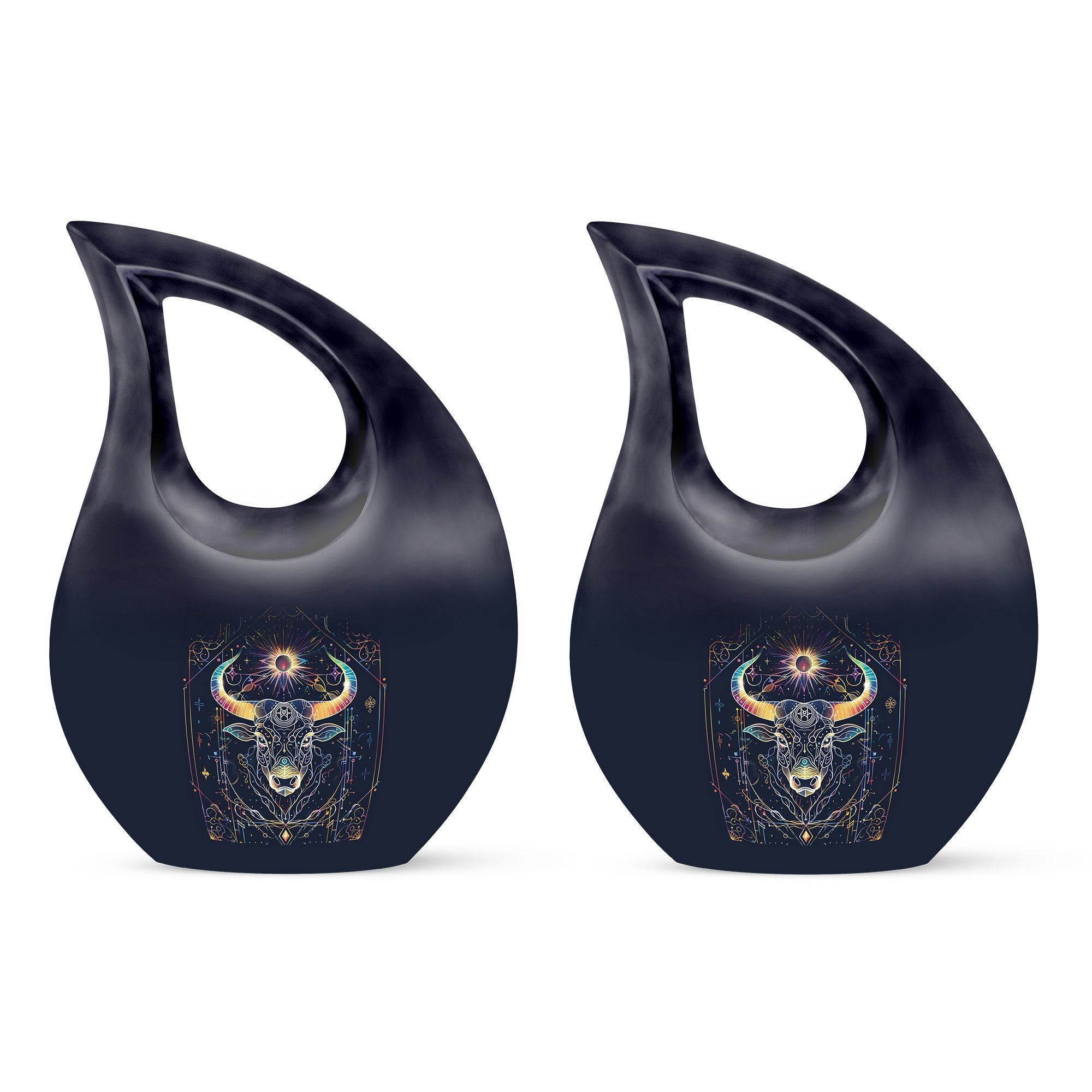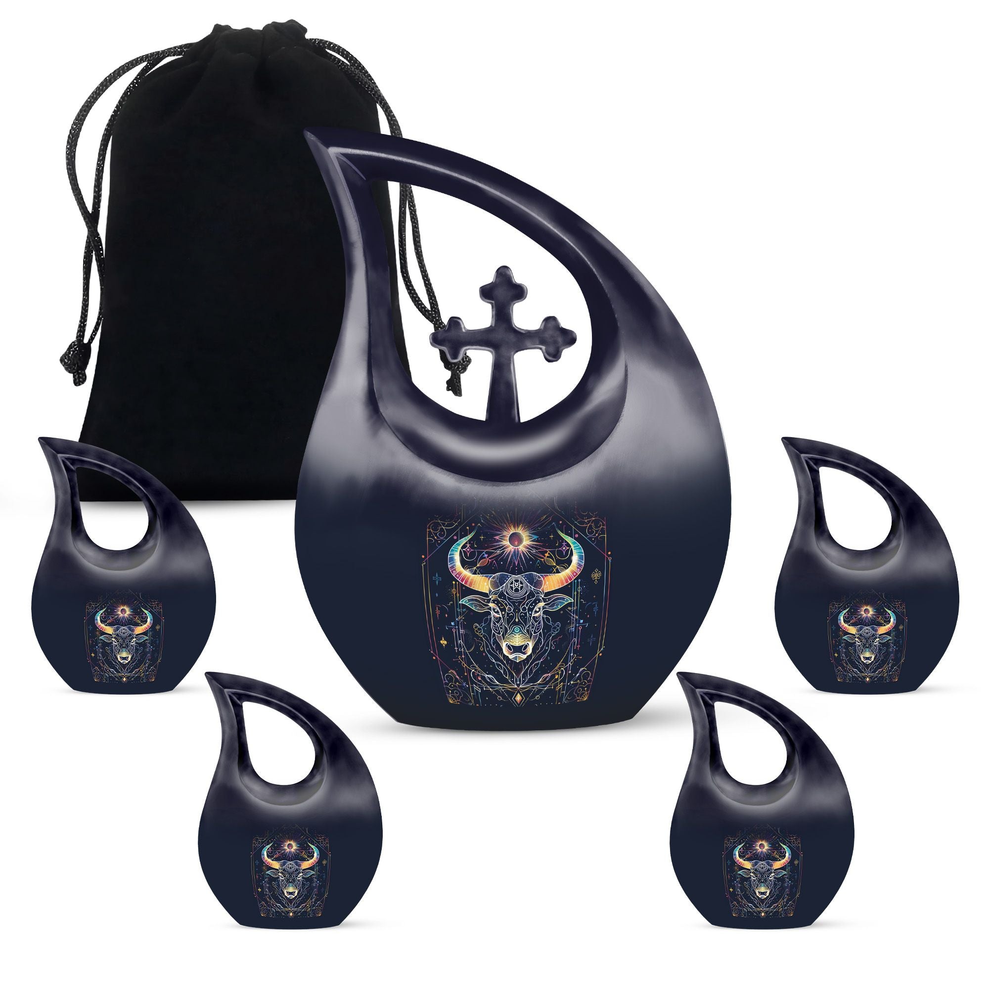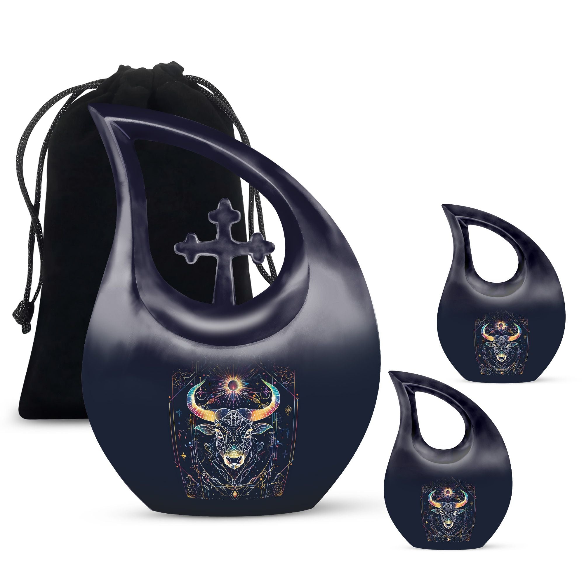 This beautifully crafted Cross Drop Zodiac Urn is a serene and thoughtful choice for memorial ceremony supplies. The large-size urn, standing at 10 inches in height, is made skillfully from high-quality aluminium, weighing in at a substantial 3.3 pounds. Its capacity is considerable, with space for 200 cubic inches of cherished ashes. Embellished with a distinct Cross Drop Zodiac design, this urn pays aesthetic homage to celestial themes, adding a unique layer to the remembrance process. The urn also offers a customization element; engrave names into the aluminium to truly personalize this memorial keepsake. Alongside the urn, a velvet pouch is included, creating a respectful containment for the ashes. Unleashing a blend of elegance and sentiment, this Zodiac Urn stands as a beautiful tribute to loved ones, fitting seamlessly within the realm of small urns and cremation keepsakes.