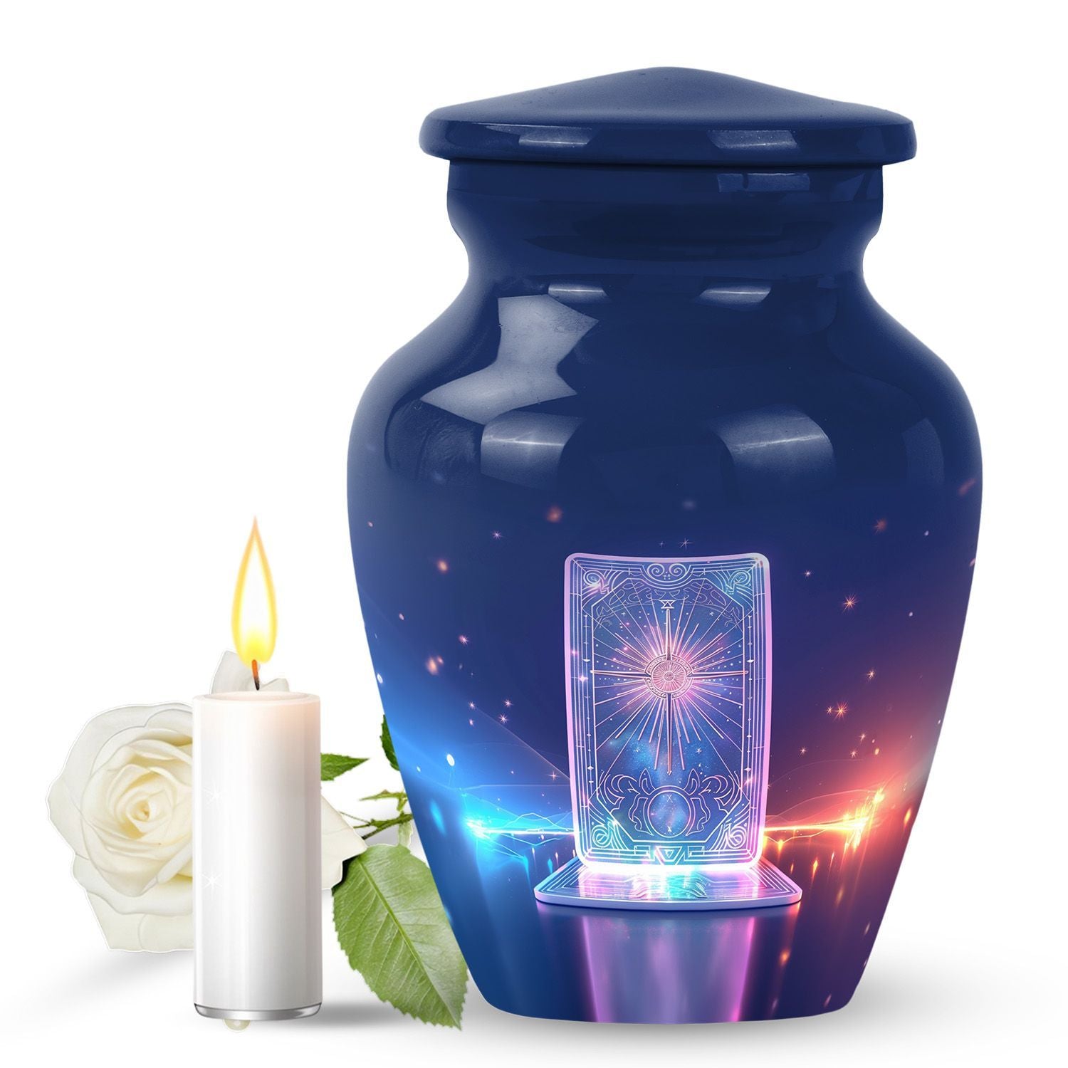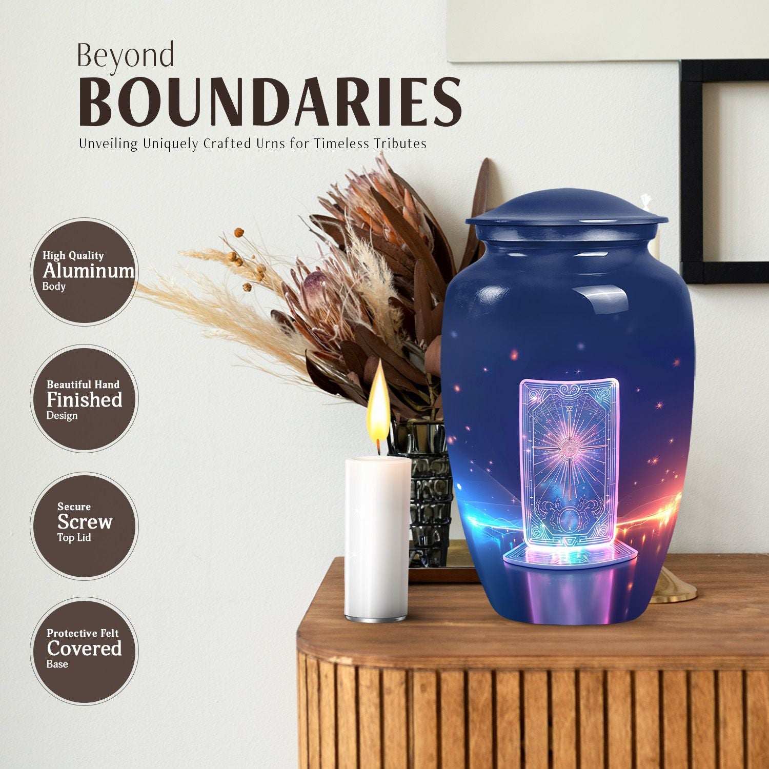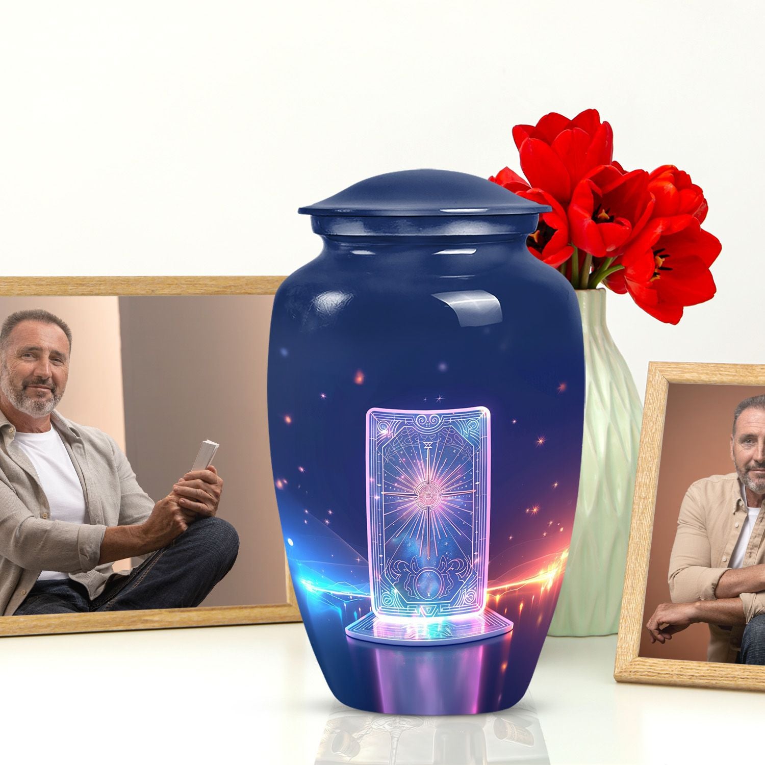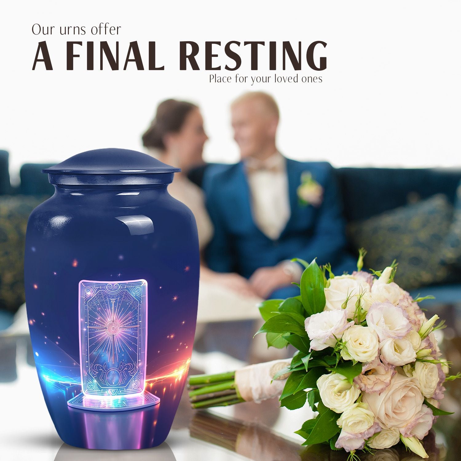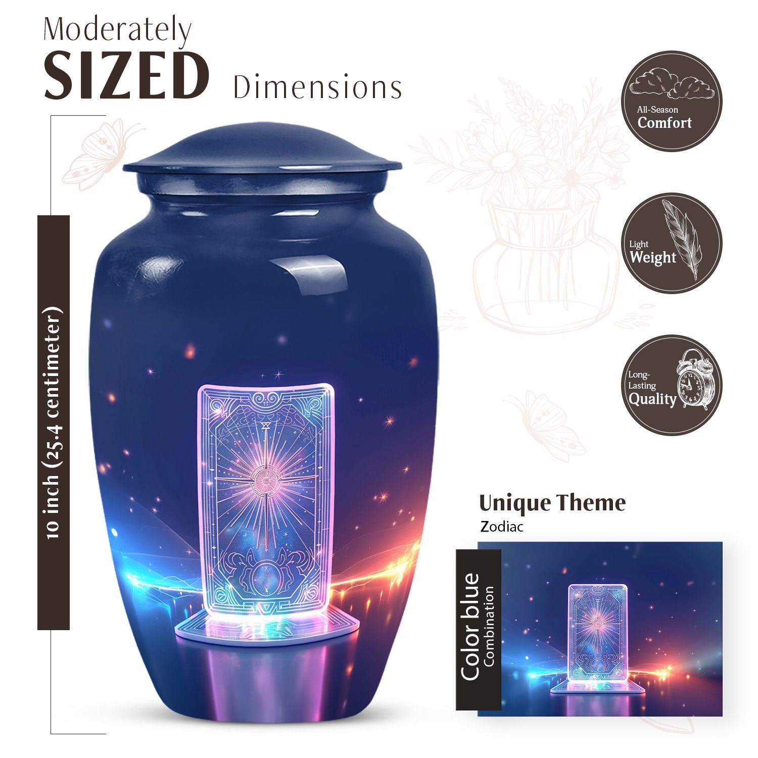 Immerse yourself in paying respects to your departed loved ones substantially by choosing this classic zodiac urn. This funeral urn for human ashes fits the capacity for an adult, which sets itself apart with its 10 inches tall structure, emanating a serene aura. With a weight of 3.3 pounds, this memorial-ceremony supply item's substantial feel achieves the perfect balance of design and functionality. This urn does not just serve as a receptacle for ashes. It represents an abstract theme, bringing a sense of spirituality and peace to your heart. Crafted from premium-quality Aluminium, this large urn assures durability, preserving the essence of your loved ones perpetually. Accompanied by a velvet pouch, it ensures the comfortable containment, handling, and preservation of ashes. Its personalization option allows you to engrave names, making it unique and expressive. Set out to honor your loved ones with this cremation urn, or gift it to someone navigating their grief journey. This product stands out in the category of innovative modern urns for human ashes, appealing to adults and seniors due to its blend of old-world charm and modern design aesthetics.