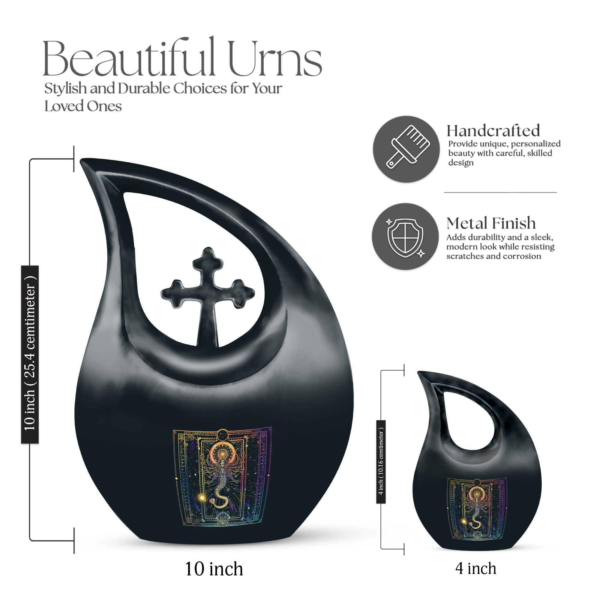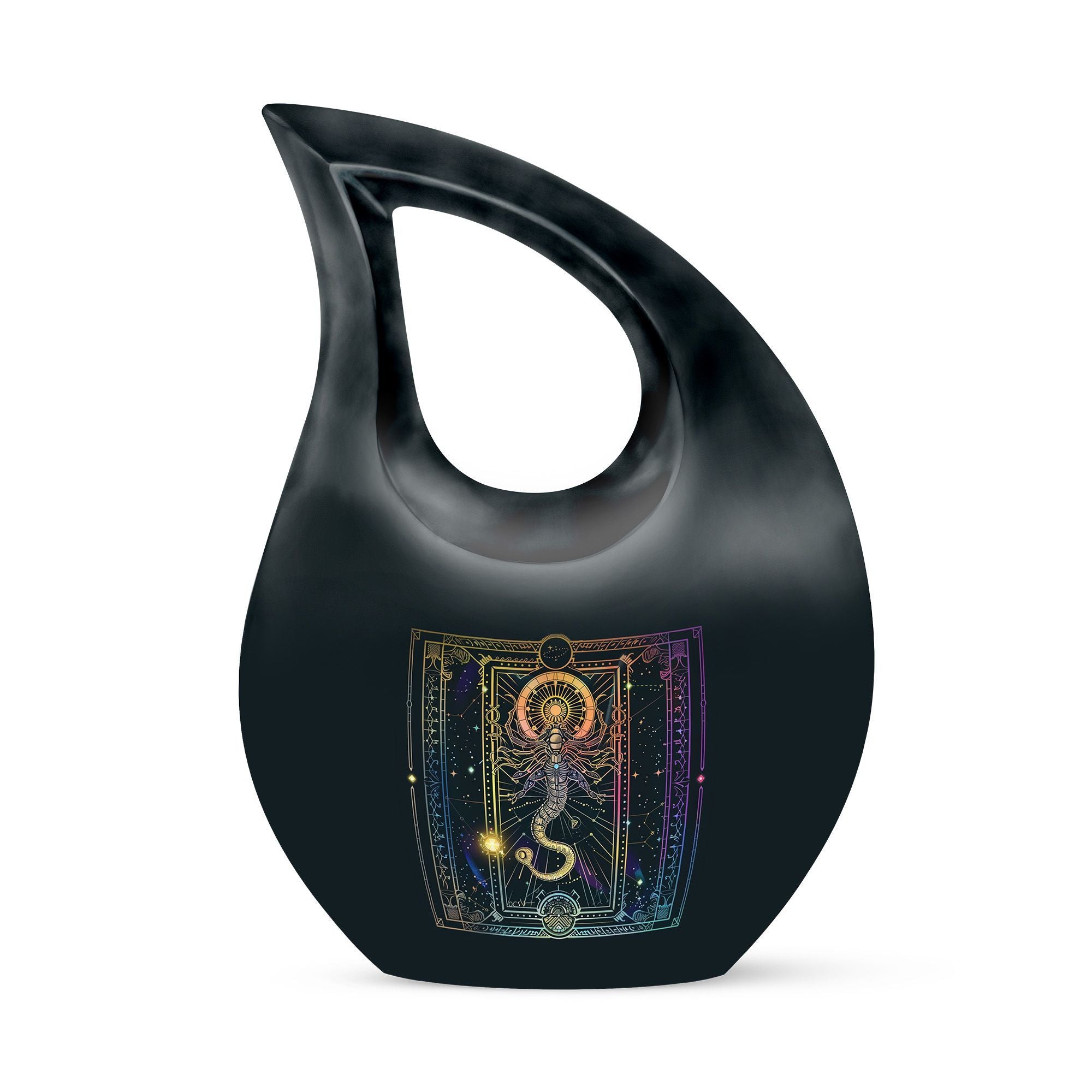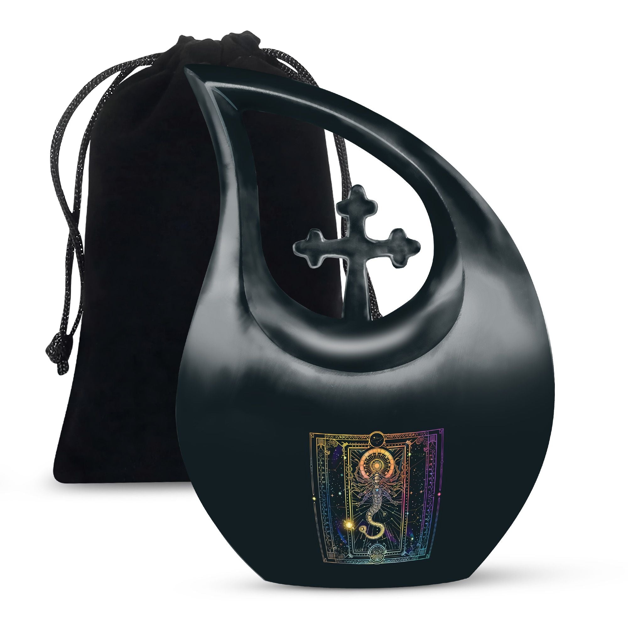 Encapsulate the spirit of your loved one with our Zodiac Urn, a Cross Drop design that pays homage to the stars above. Crafted from premium aluminium, this large Urn stands tall at 10 inches with a capacity that can accommodate up to 200 cubic inches of beloved's remains. Weighing in at 3.3 pounds, this urn is a sturdy and enduring option designed to honor and respect those that have passed. To add a personal touch, names can be engraved onto it, making this an even more intimate Memorial Urn. It comes complete with a velvet pouch, ensuring containment and preservation of ashes is handled with the utmost care. Our modestly-priced burial urn is an excellent choice for those seeking a blend of affordability, customization, and meticulous design. It's more than a Mini Urn; it's a keepsake that symbolizes timelessness, love, and the eternal Zodiac. Please note, Personalize engraved names are an optional add-on.