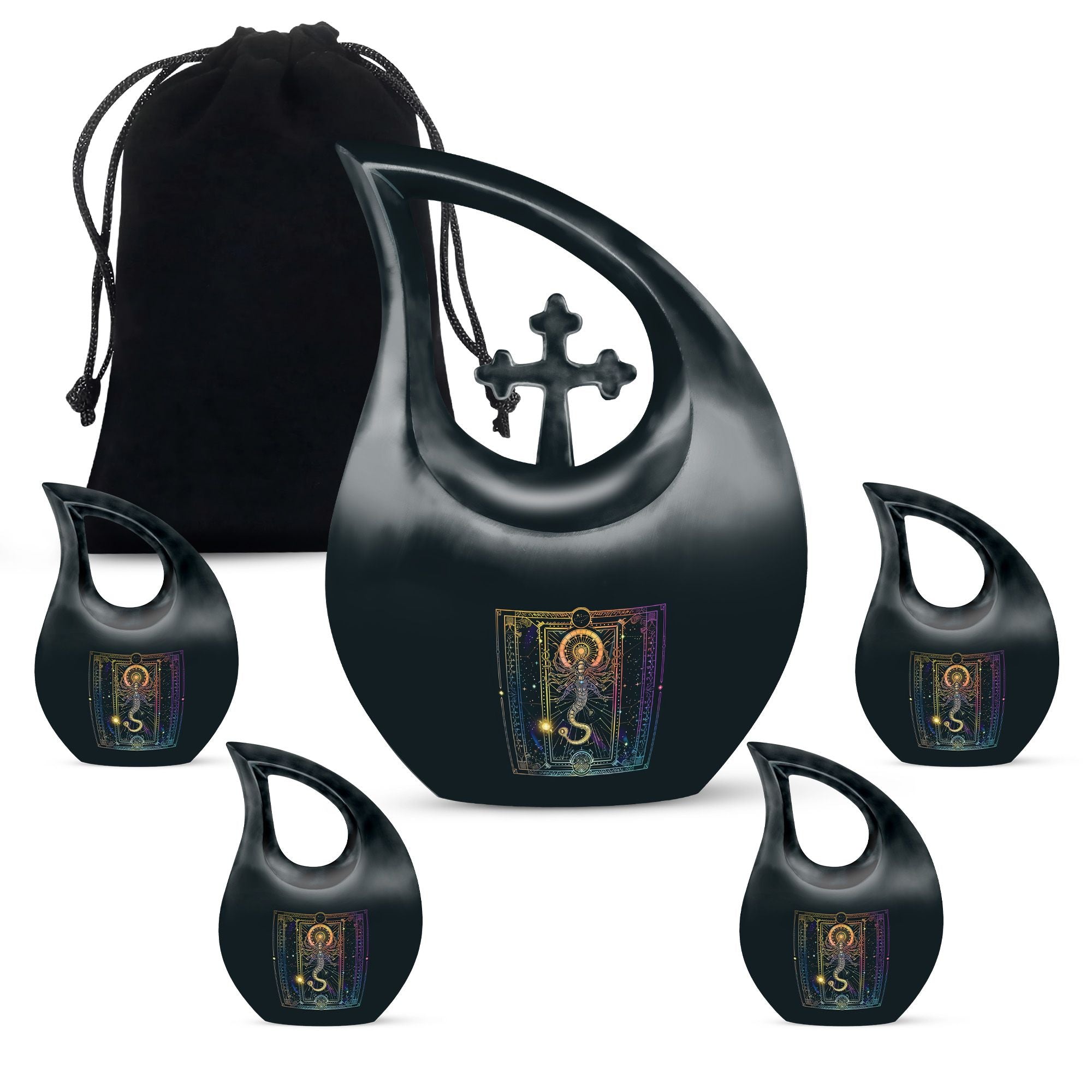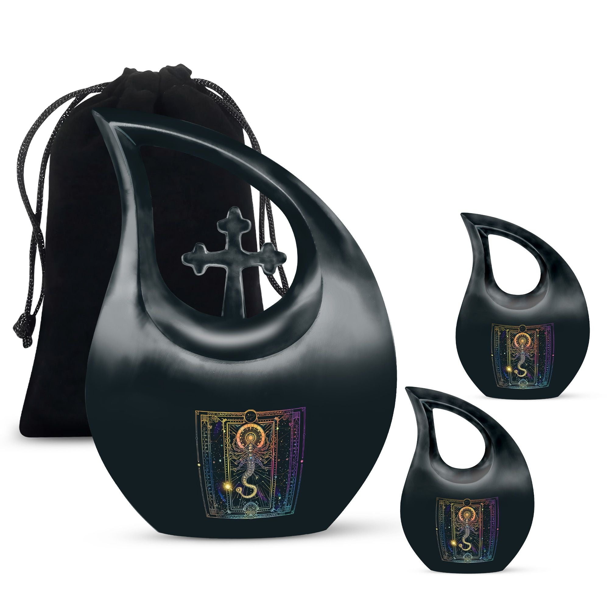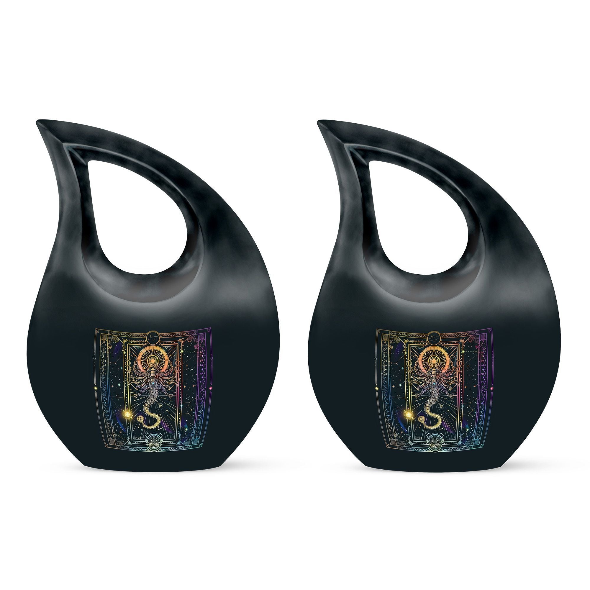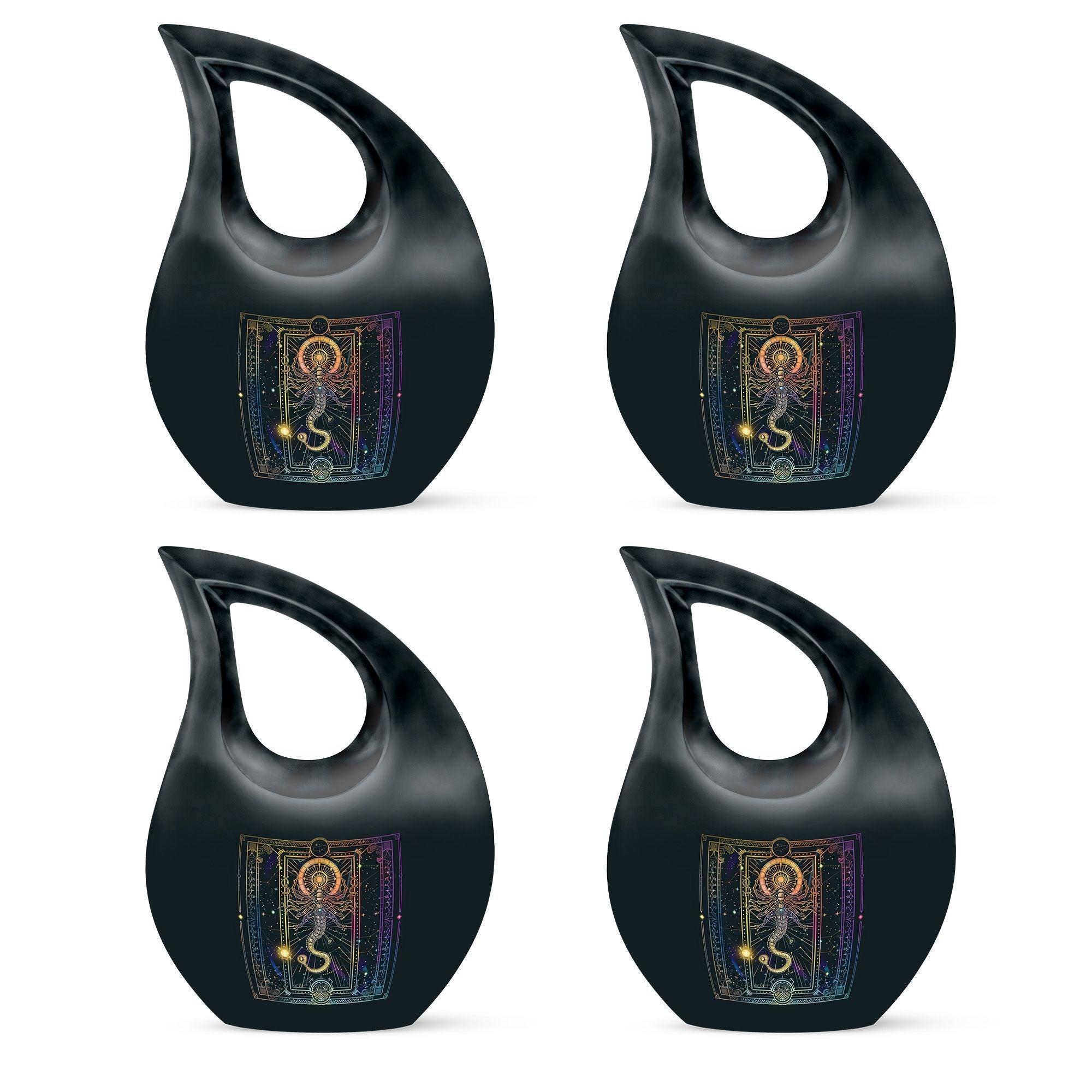 Encapsulate the spirit of your loved one with our Zodiac Urn, a Cross Drop design that pays homage to the stars above. Crafted from premium aluminium, this large Urn stands tall at 10 inches with a capacity that can accommodate up to 200 cubic inches of beloved's remains. Weighing in at 3.3 pounds, this urn is a sturdy and enduring option designed to honor and respect those that have passed. To add a personal touch, names can be engraved onto it, making this an even more intimate Memorial Urn. It comes complete with a velvet pouch, ensuring containment and preservation of ashes is handled with the utmost care. Our modestly-priced burial urn is an excellent choice for those seeking a blend of affordability, customization, and meticulous design. It's more than a Mini Urn; it's a keepsake that symbolizes timelessness, love, and the eternal Zodiac. Please note, Personalize engraved names are an optional add-on.