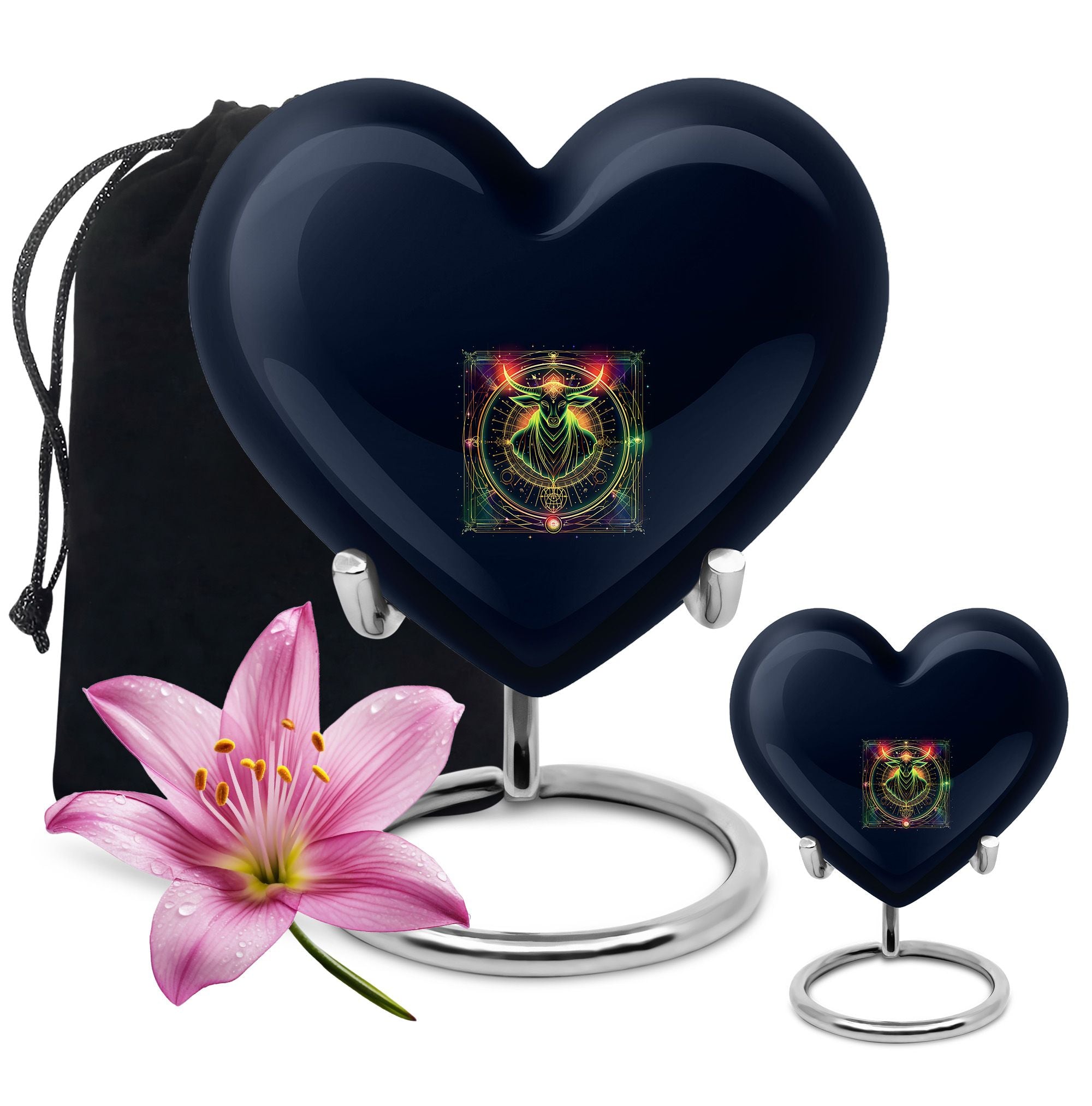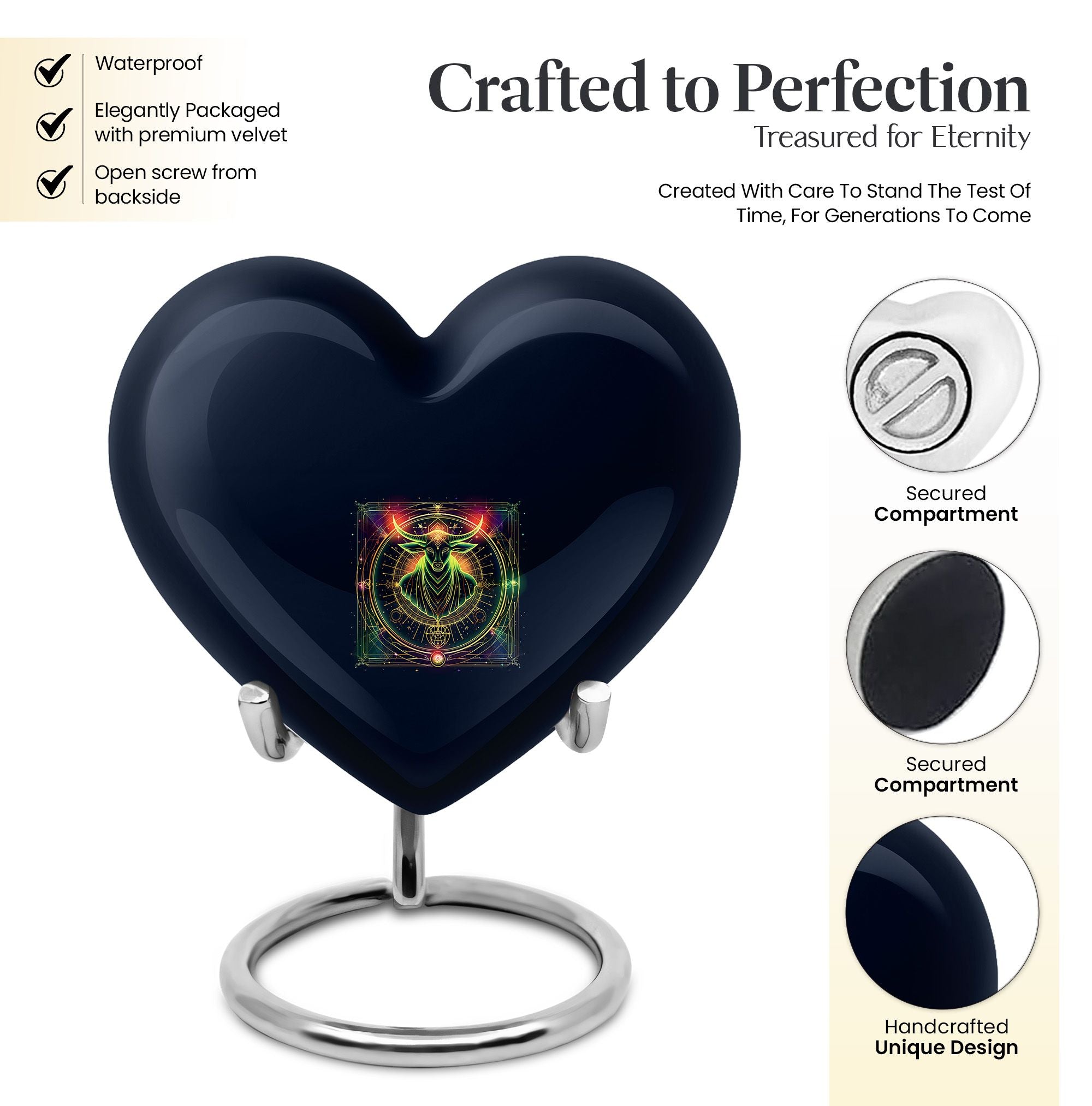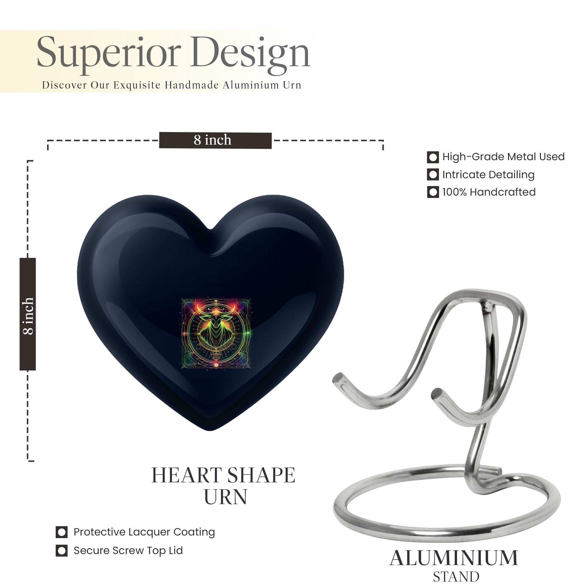Personalize your eternal tribute with our 10-inch Zodiac Urn, embodying the celestial majesty of the cosmos. Crafted meticulously from sublime aluminium, this large urn carries a weight of 3.3 pounds. Created with care and finesse, our funeral urns for burial offer a capacity of 200 cubic inches, catered to hold the treasured remains of your loved one. The urn arrives with a velvet pouch for dignified containment of ashes, further complementing the charm of the urn. We offer the option to customize your urn by having names engraved onto it, adding an extra layer of sentimental homage. With our adult burial cremation urns, your endearing reminiscence would be preserved with the utmost dignity. Ideal for those seeking cremation urn for dad or urn human adult urns, these memorial urns connect with the touching sentiment with their heartfelt design. Please note, this design does not focus on the 'heart' theme. Make your tribute as unique as the stars with our Zodiac Urn.