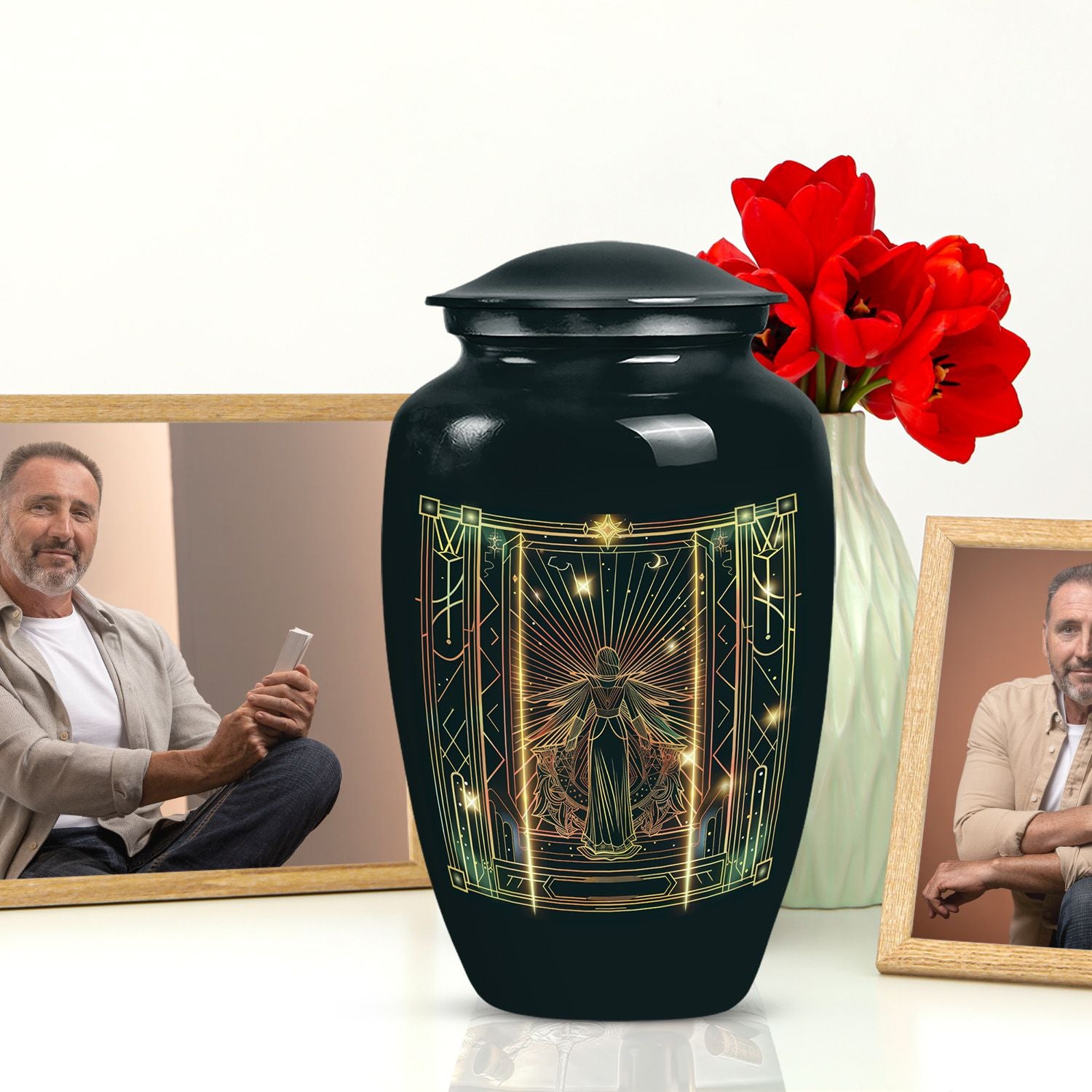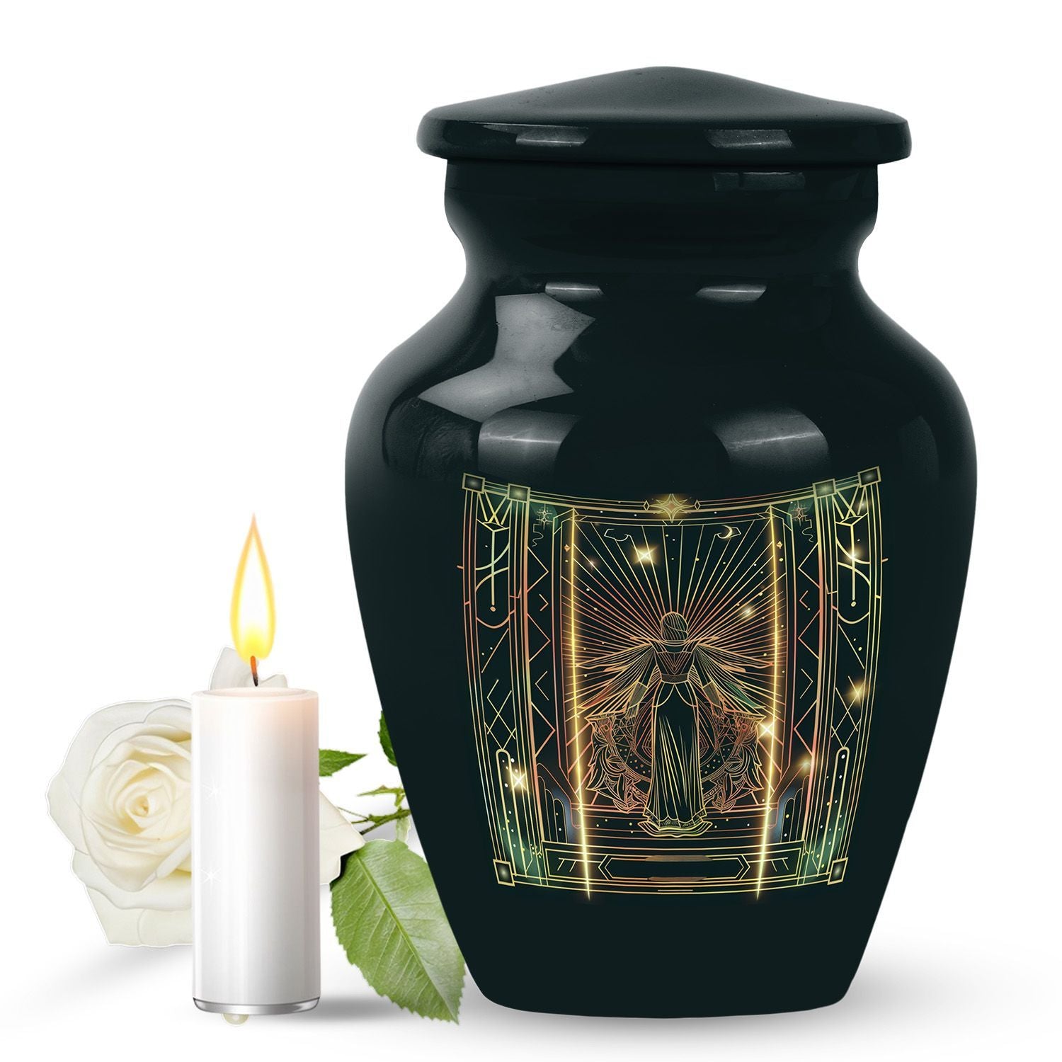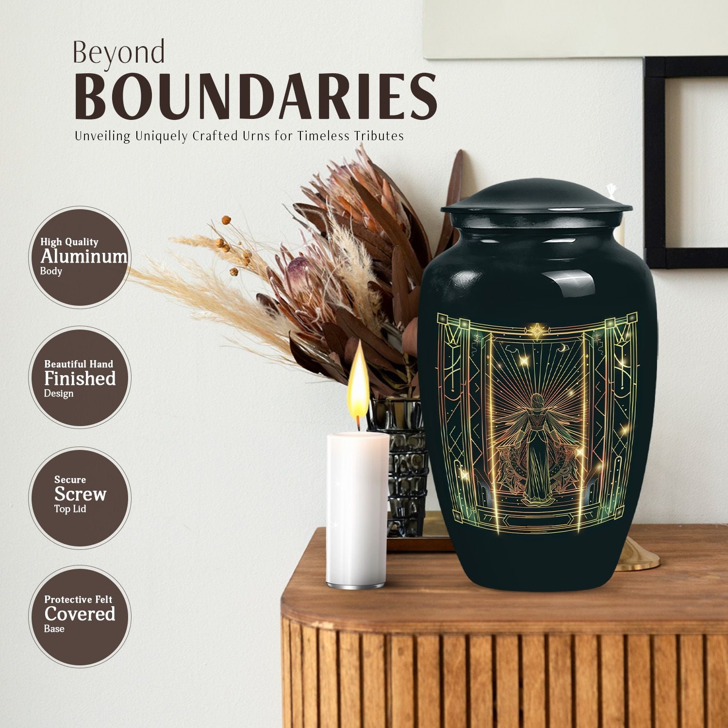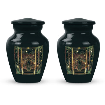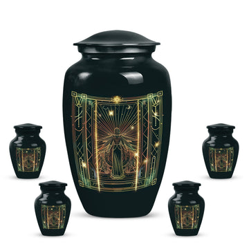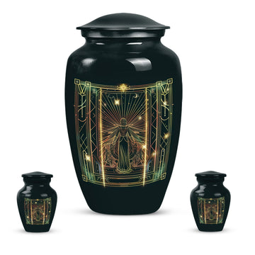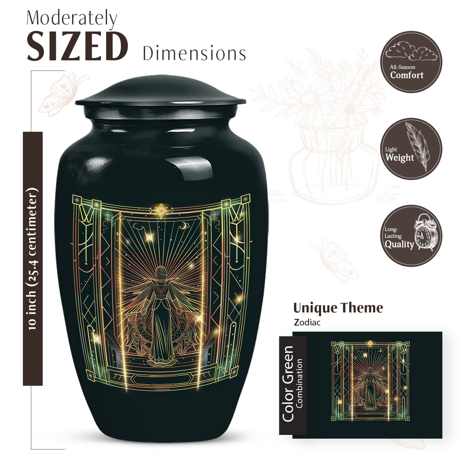 Dignified and timeless, this 10-inch large zodiac urn, designed in an abstract theme, evokes an air of serenity and reverence that is fitting for your loved one. Crafted from durable aluminium, this cremation urn for adults weighs 3.3 pounds and has an impressive capacity of 200 cubic inches, comfortably accommodating human ashes. This adult urn is accompanied by a velvet pouch, ensuring containment of ashes in the most respectful manner possible. We understand the importance of personal touches during such sensitive times, so we offer the ability to personalize this unique urn with engraved names. The classic design is not just visually soothing, but also resonates with the gravity of the moment, making it a perfect choice for memorial urns. Uniquely designed and carefully crafted, it stands as a respectful tribute to your beloved ones. Please note that this urn is suitable for adult ashes and is appropriate for burial ceremonies as well.