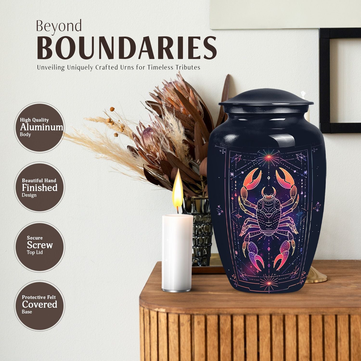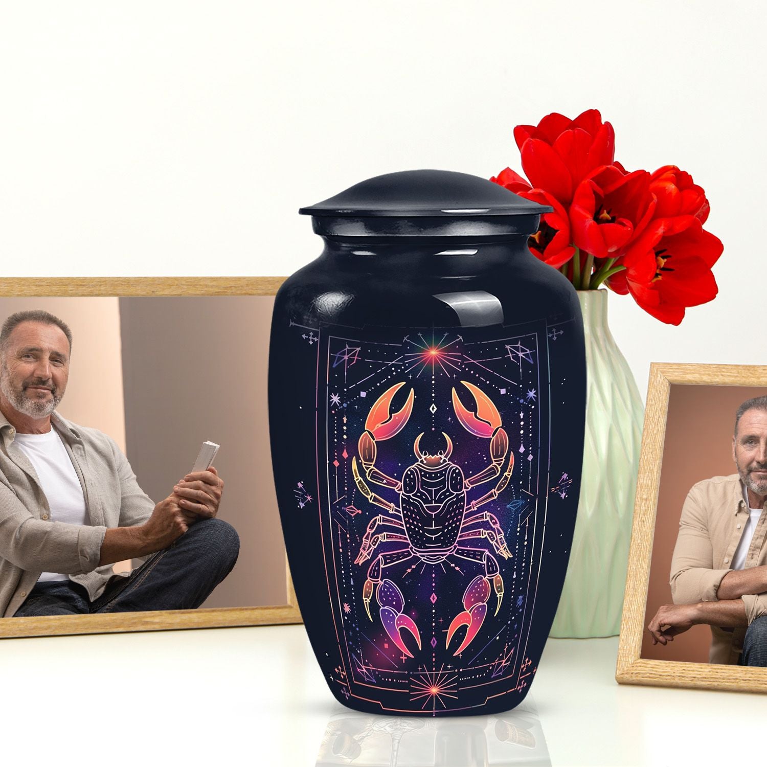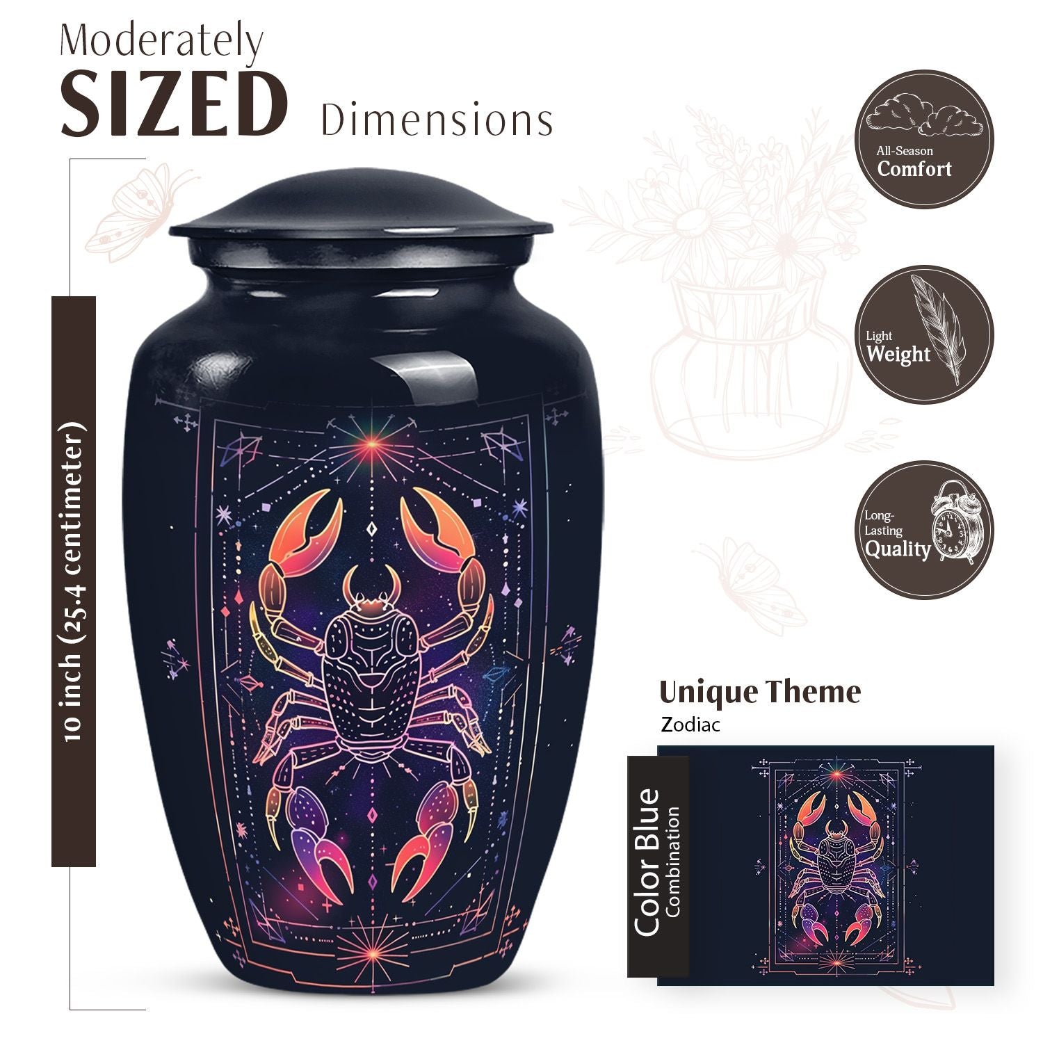 Poise and precision characterize this classically crafted 10-inch Abstract-themed Large Urn, an outstanding choice for commemorating a loved one. This 'Zodiac Urn,' a perfect epitome of memorable cremation urns for men, is intricately constructed from high-quality Aluminium. It measures a substantial 10 inches in height and weighs 3.3 pounds. Aptly suitable for a distinctive place in your heart and home, it has a capacity that can house up to 200 cubic inches of cremation ashes. The urn elegantly embodies an 'Abstract' theme, reflecting resonating qualities of unique originality. This comprehensive package also includes a velvet pouch, elegantly designed to secure the cherished remains. As a memorable tribute, you have the option to personalize the urn with engraved names, providing a sense of closeness and connection. Whether it's for 'burial urns for cremation ashes mother,' 'urn ash funeral urn,' or 'shaped urn box,' this product signifies a noble rememberance. Searching for 'funeral cremation urns' will guide you right to this adored symbol of memorial.