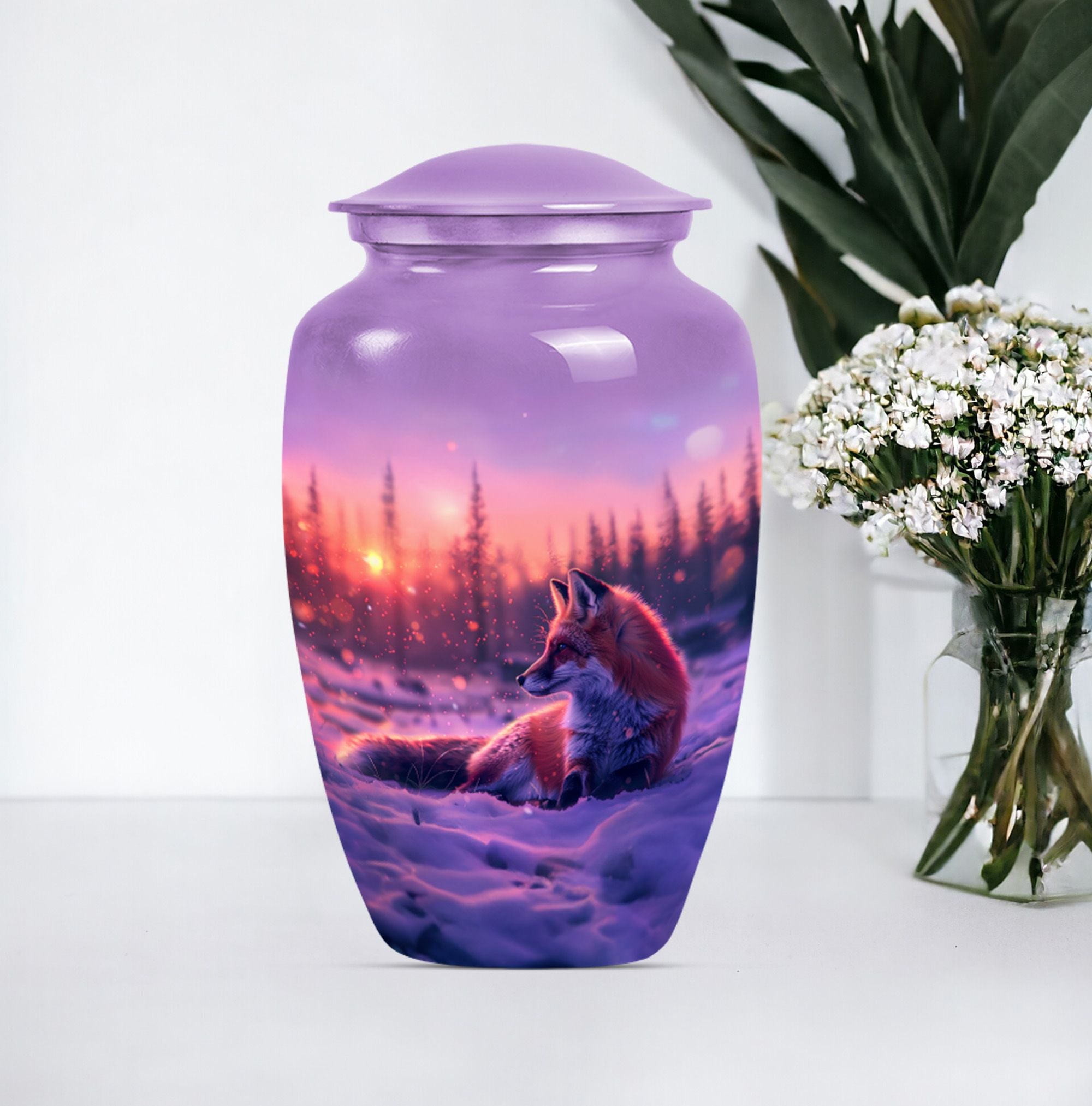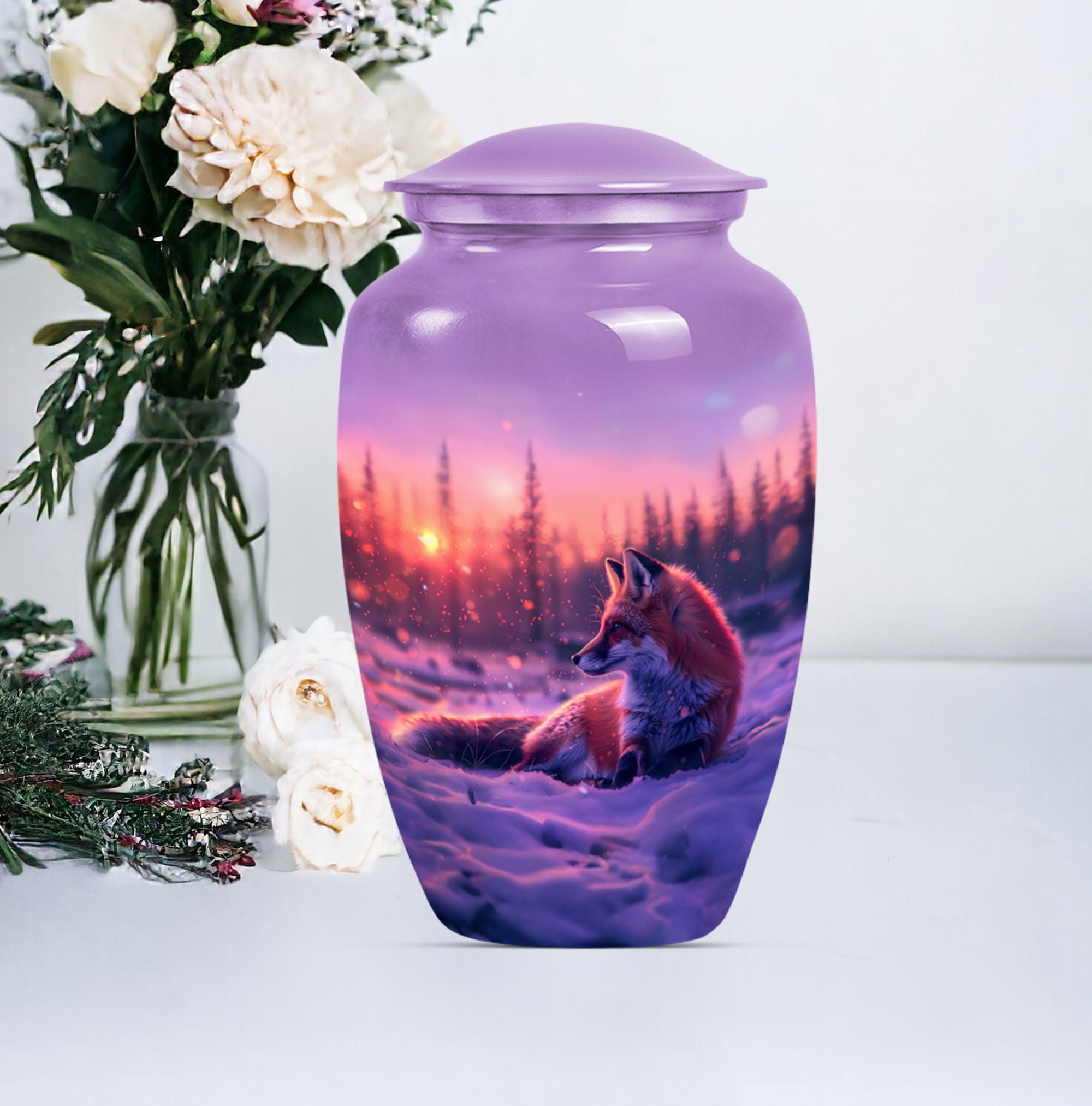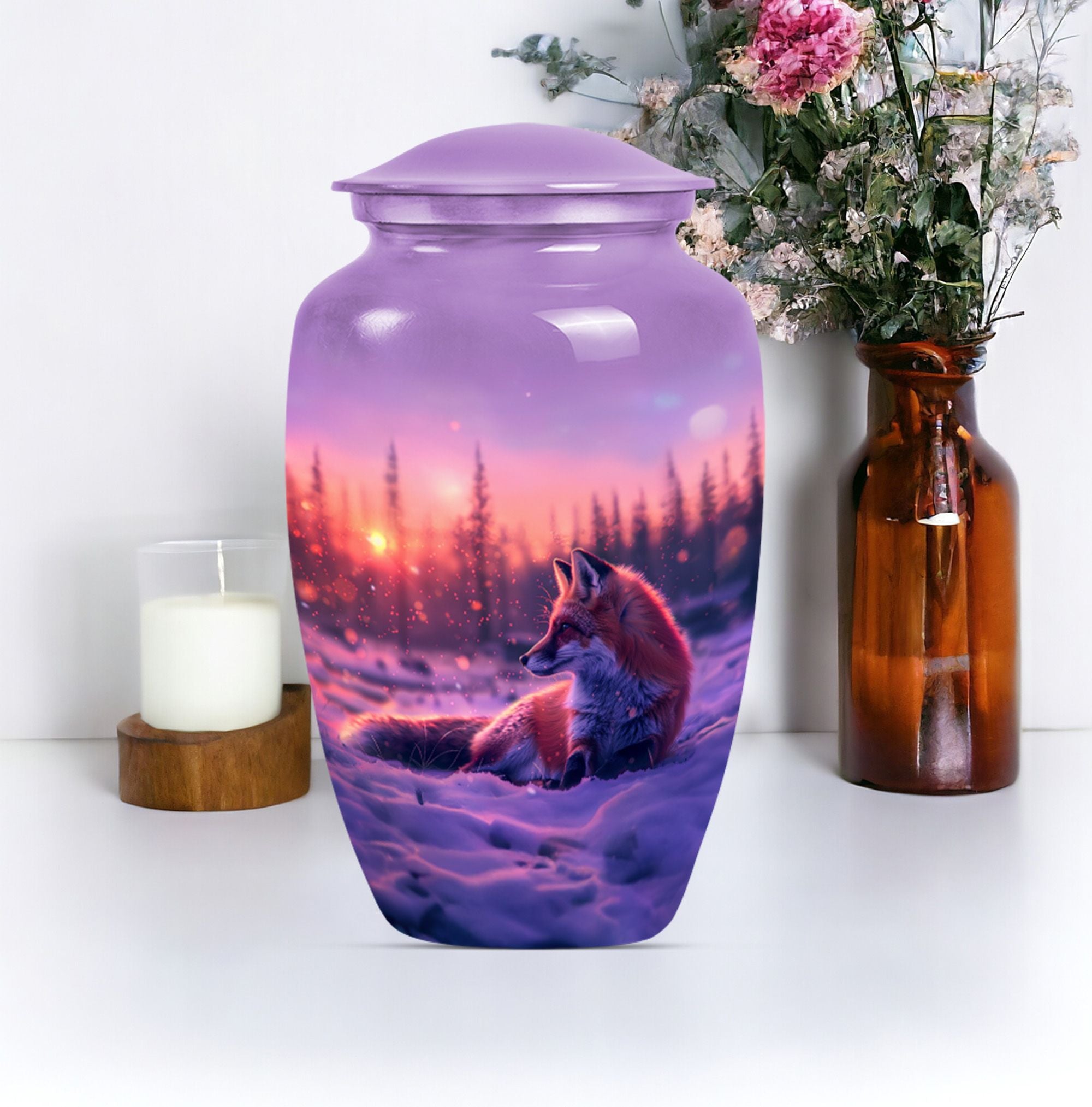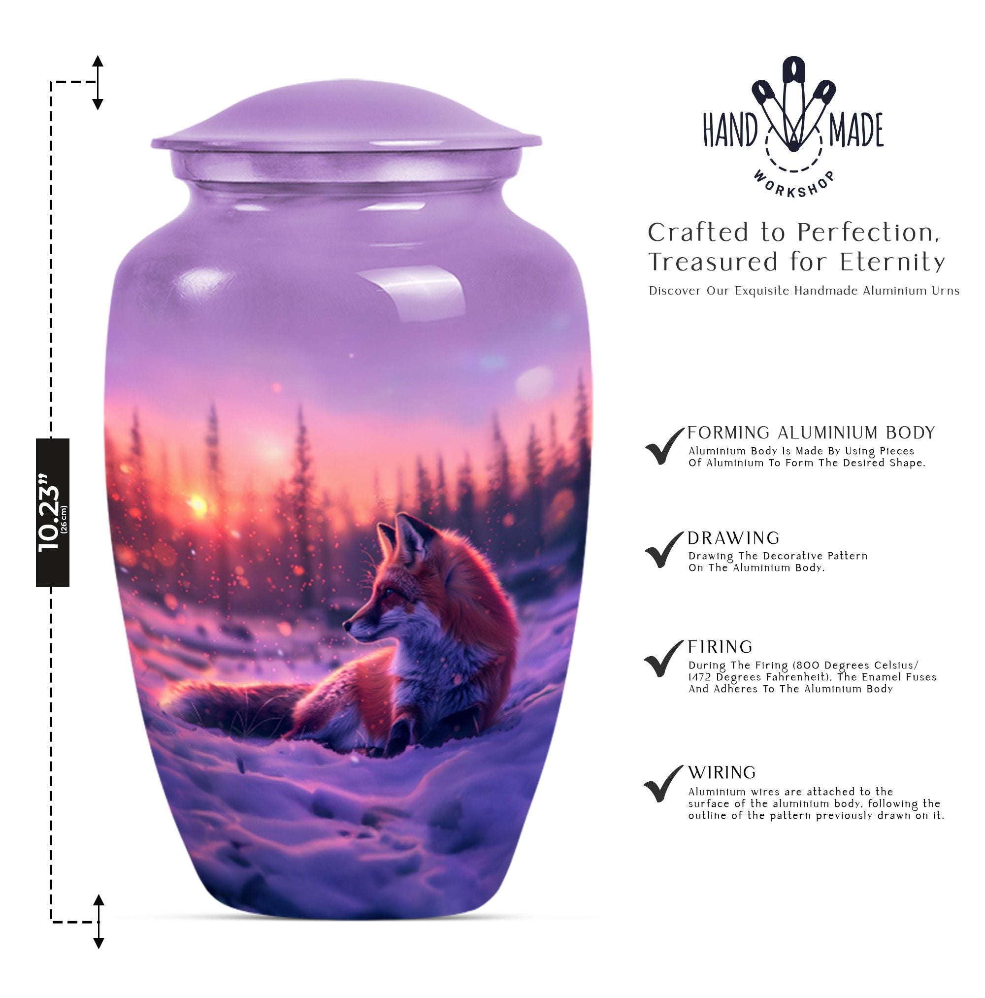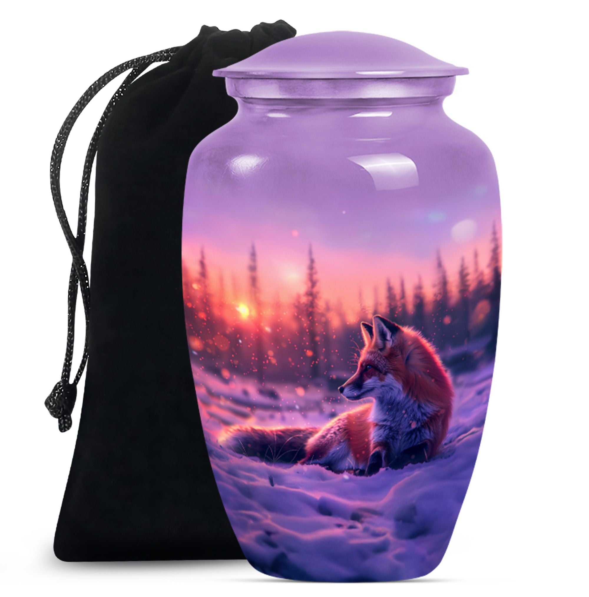 Embrace the significant symbolism of the butterfly with this beautifully designed, 10-inch fox Urn. Holding an impressive 200 cubic inches, this large urn serves as the perfect resting place for the dearly departed, ensuring their memory endures in the hearts of their loved ones. Crafted with precision using high-quality Aluminium, this cremation urn for human ashes weighs a sturdy 3.3 pounds and prides in its durability and longevity. We encourage you to make this urn uniquely special through our customization service; personalize with engraved names. Its gorgeous design is enhanced by a velvet pouch included in the package, providing further elegance and an additional layer of containment and protection for the ashes. As a prominent choice in memorial urns, our urn serves as a loving tribute blending both strength and tenderness, resonating perfectly with the target audience looking for funeral urns for women, funeral urns ashes, metal, and cremation urns for men. The presence of our fox Urn in your home will serve as a constant reminder of treasured memories and unwavering bonds.