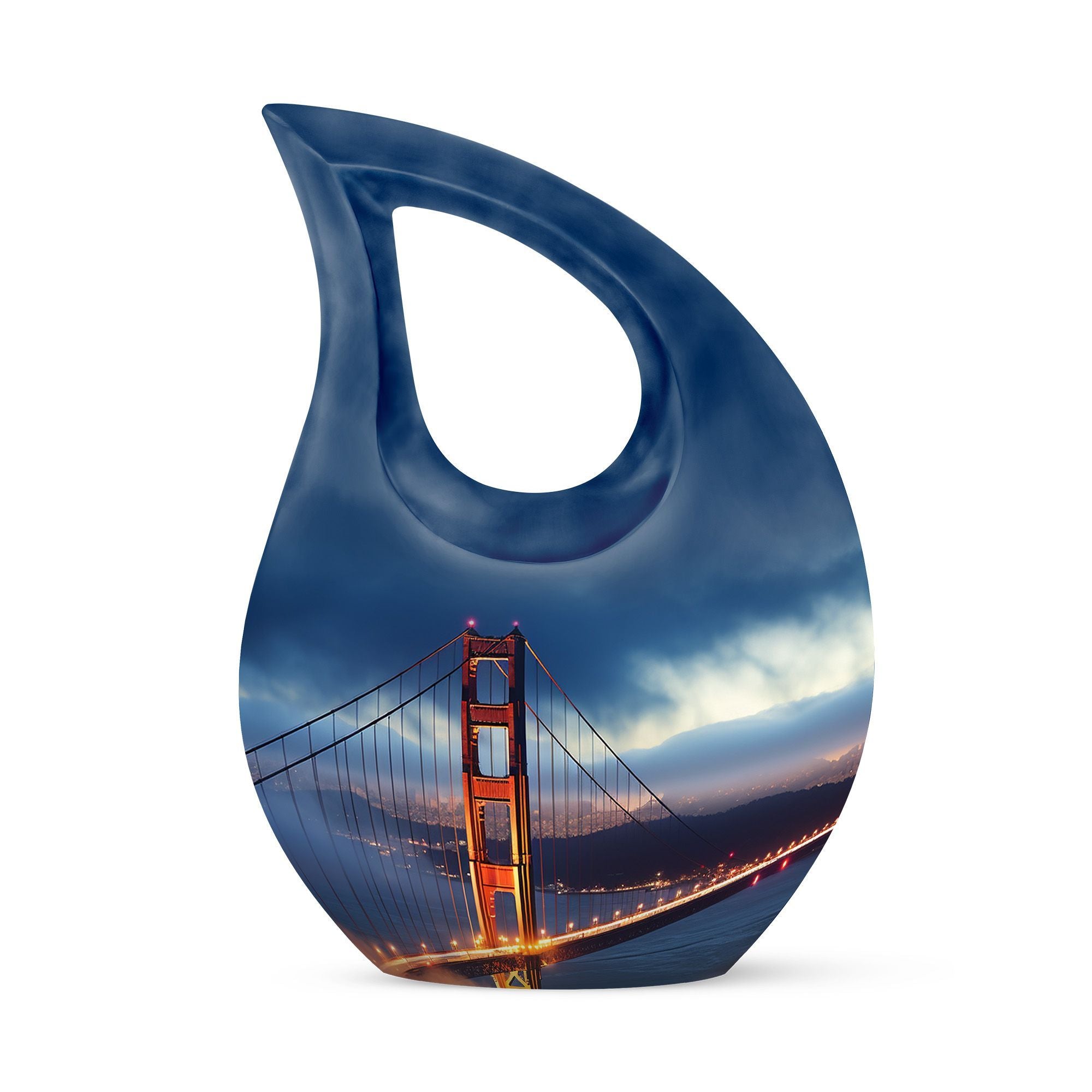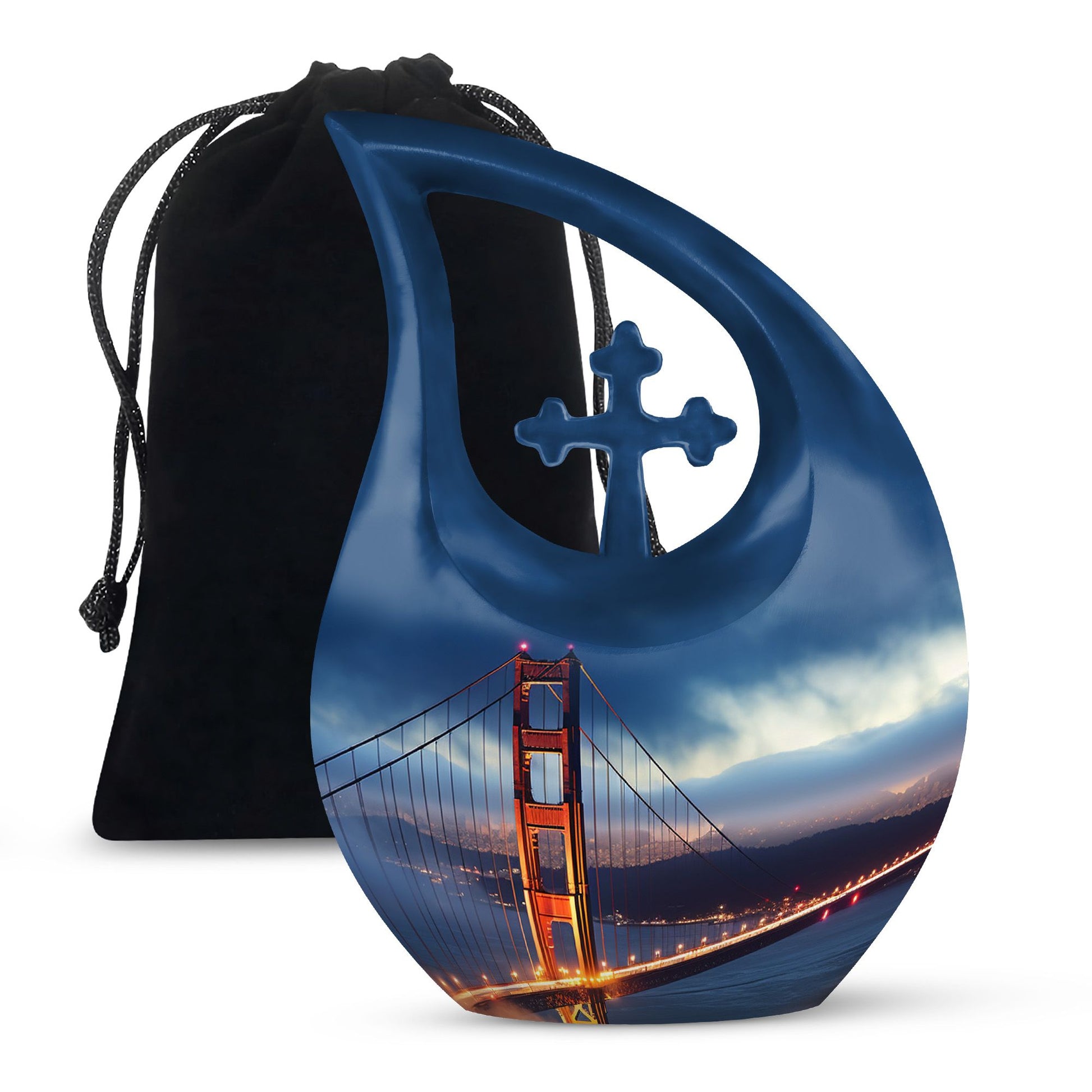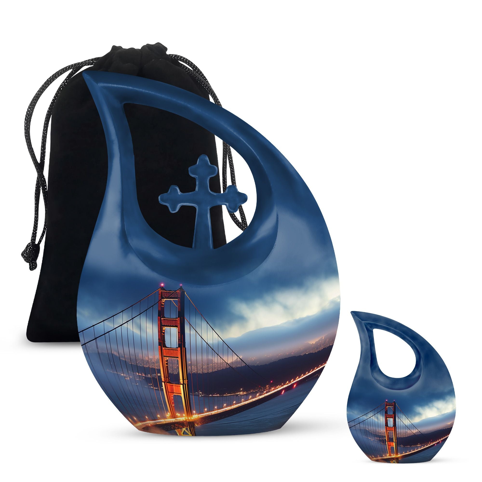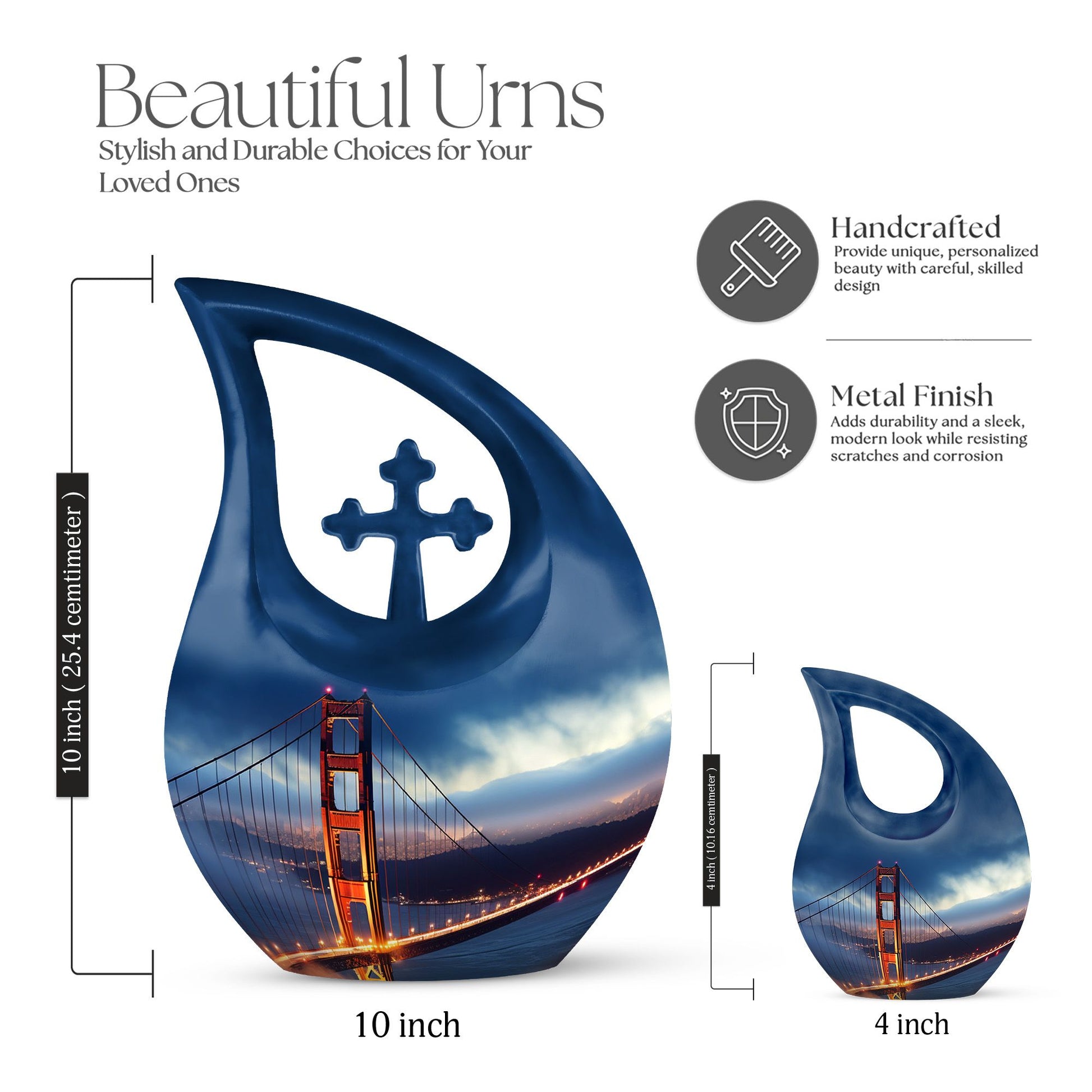 Experience the sacred connection between love and lasting memories with our Golden Gate Bridge Urn. This 10-inch sized personalized urn, crafted exquisitely with aluminium, has an impressive capacity of holding up to 200 cubic inches of ashes. This unique product, which weighs around 3.3 pounds, exhibits a 'Cross Drop' motif, a theme carefully chosen to resonate with the iconic Golden Gate Bridge. The customization feature allows you to personalize these large urns with engraved names, infusing a touch of intense emotion, making them also an ideal pick for personalized urns for human ashes or pet urns for ashes. Each meticulously crafted urn also comes with a velvet pouch, providing a safe and elegant containment for the precious remains. When you're considering memorial urns, let this distinguished product embody your cherished memories. Uncommonly original and dignified, our tailor-made urns have been carefully designed to serve as a worthy tribute for your loved ones.