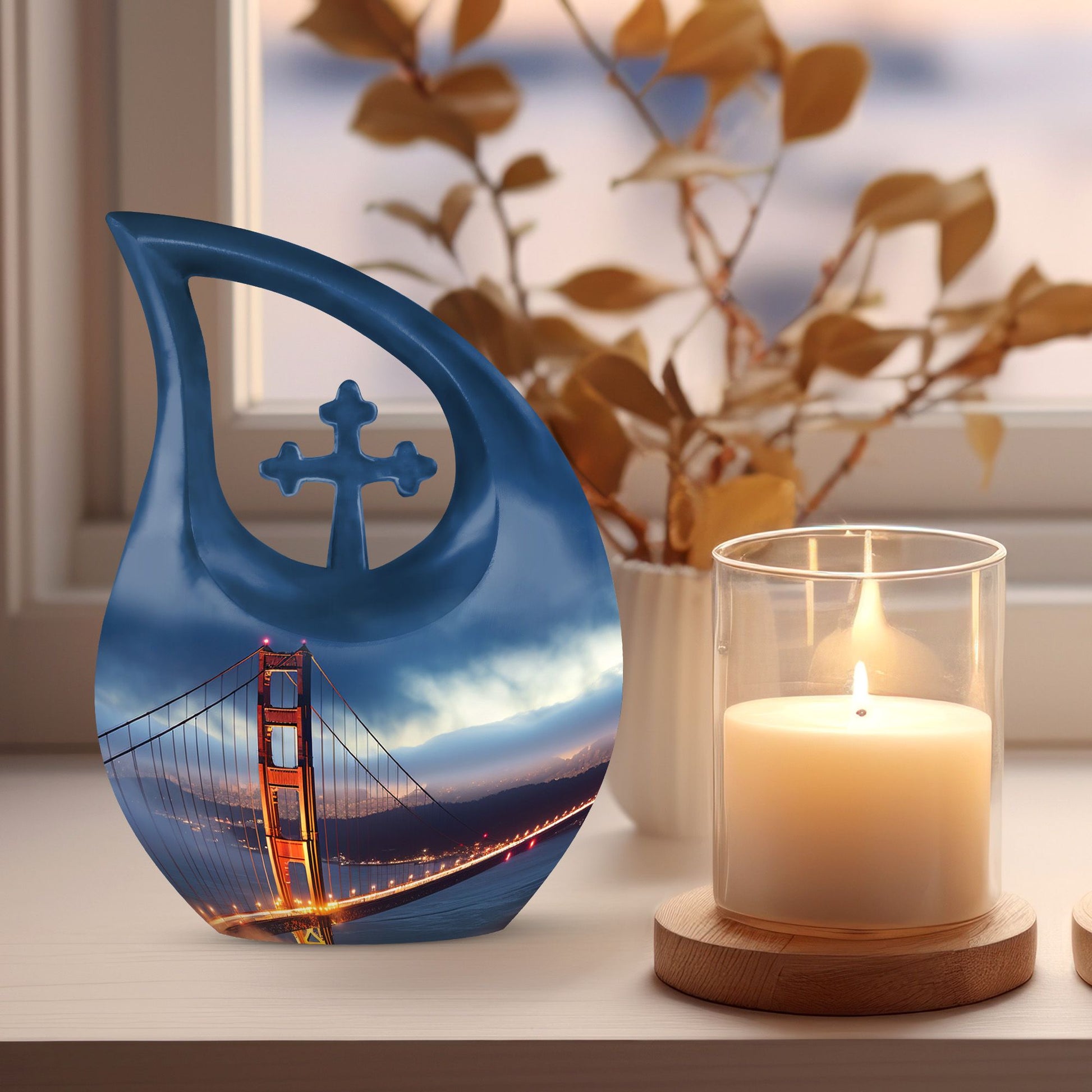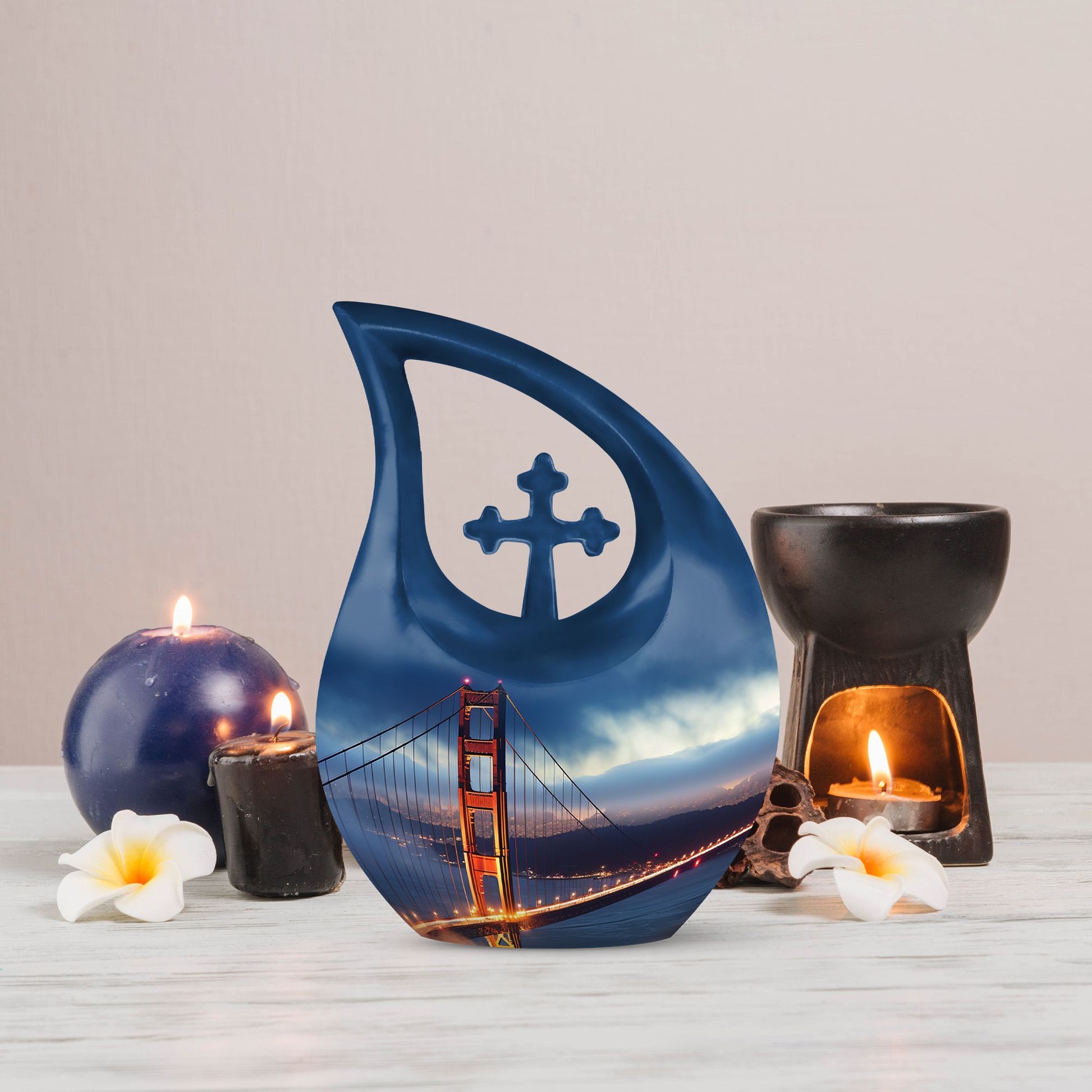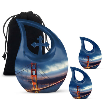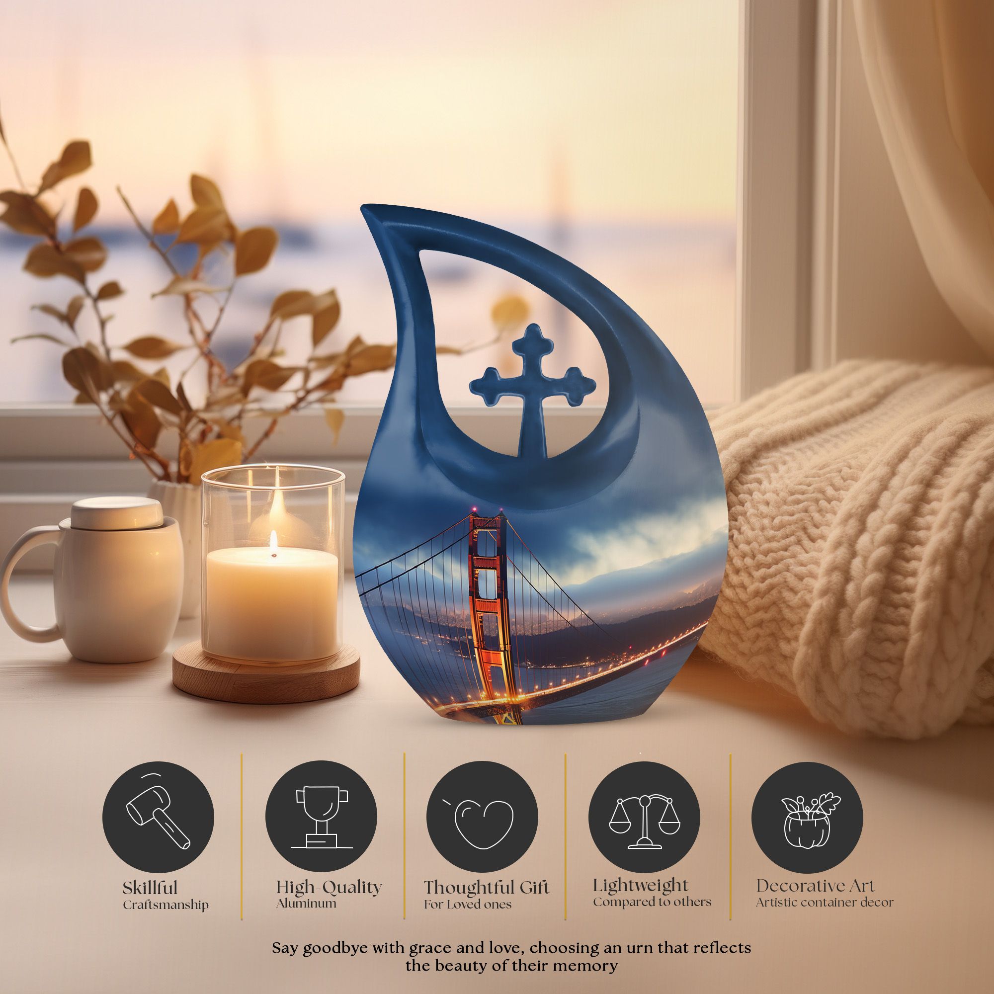 Experience the sacred connection between love and lasting memories with our Golden Gate Bridge Urn. This 10-inch sized personalized urn, crafted exquisitely with aluminium, has an impressive capacity of holding up to 200 cubic inches of ashes. This unique product, which weighs around 3.3 pounds, exhibits a 'Cross Drop' motif, a theme carefully chosen to resonate with the iconic Golden Gate Bridge. The customization feature allows you to personalize these large urns with engraved names, infusing a touch of intense emotion, making them also an ideal pick for personalized urns for human ashes or pet urns for ashes. Each meticulously crafted urn also comes with a velvet pouch, providing a safe and elegant containment for the precious remains. When you're considering memorial urns, let this distinguished product embody your cherished memories. Uncommonly original and dignified, our tailor-made urns have been carefully designed to serve as a worthy tribute for your loved ones.